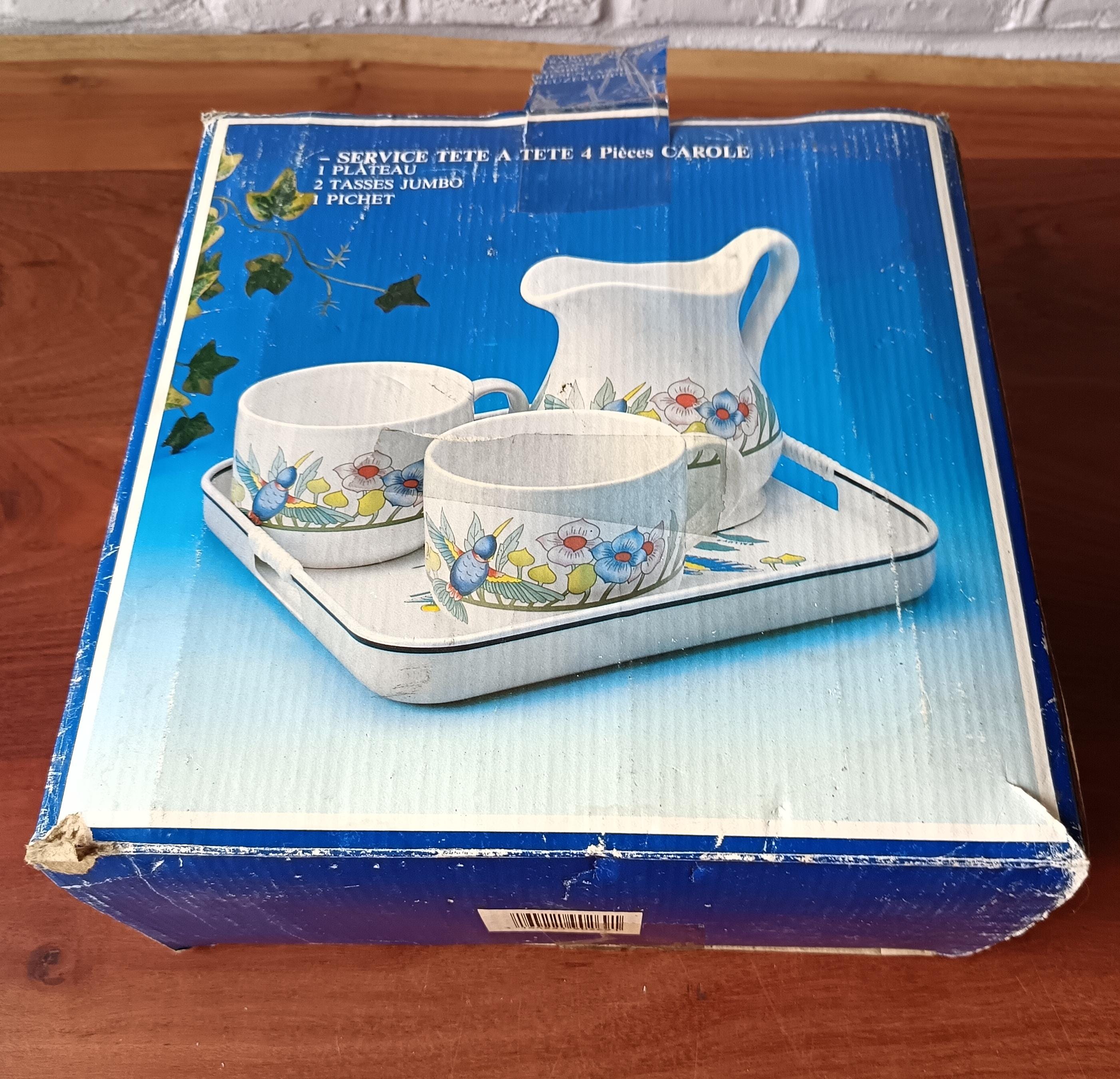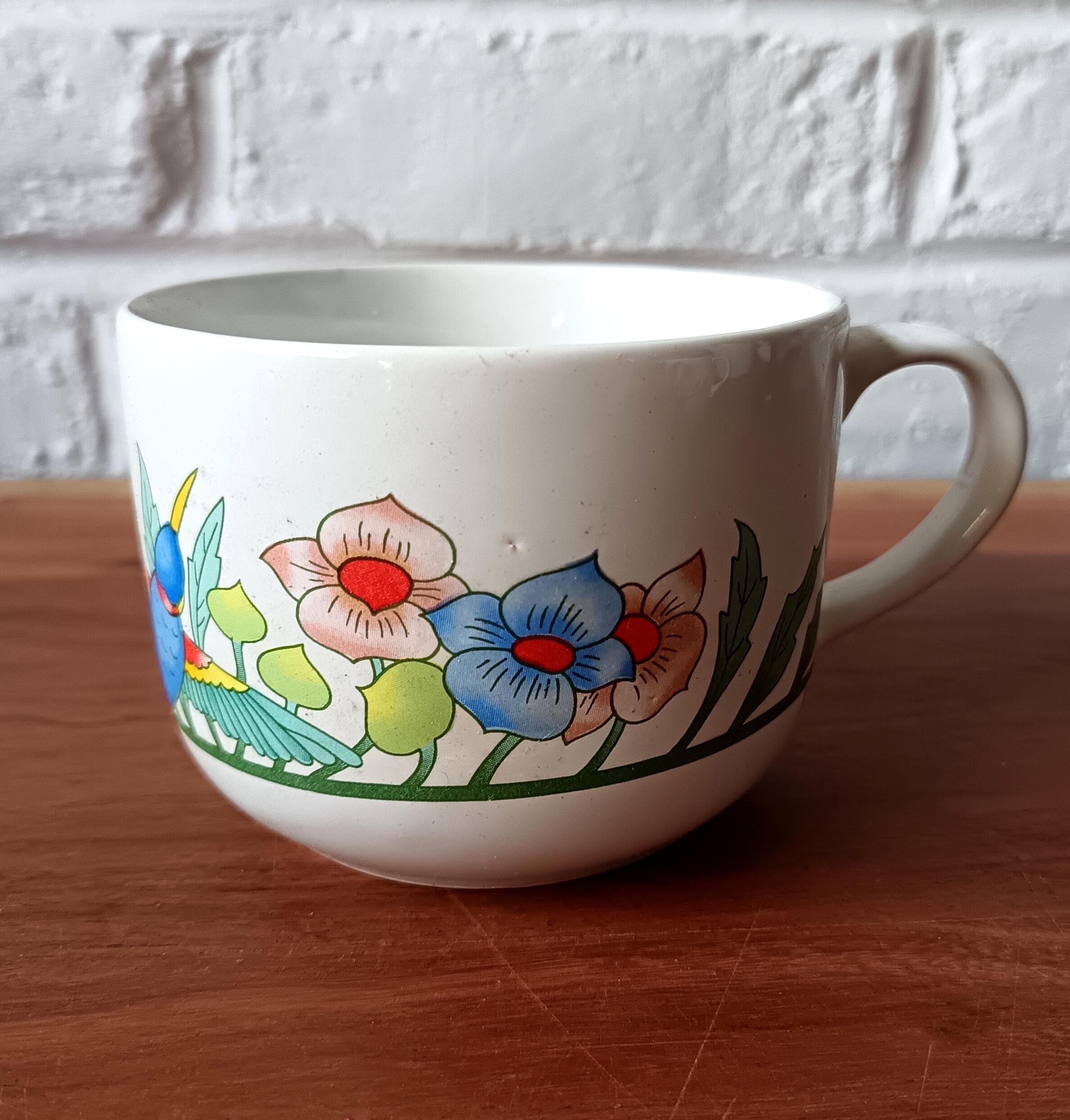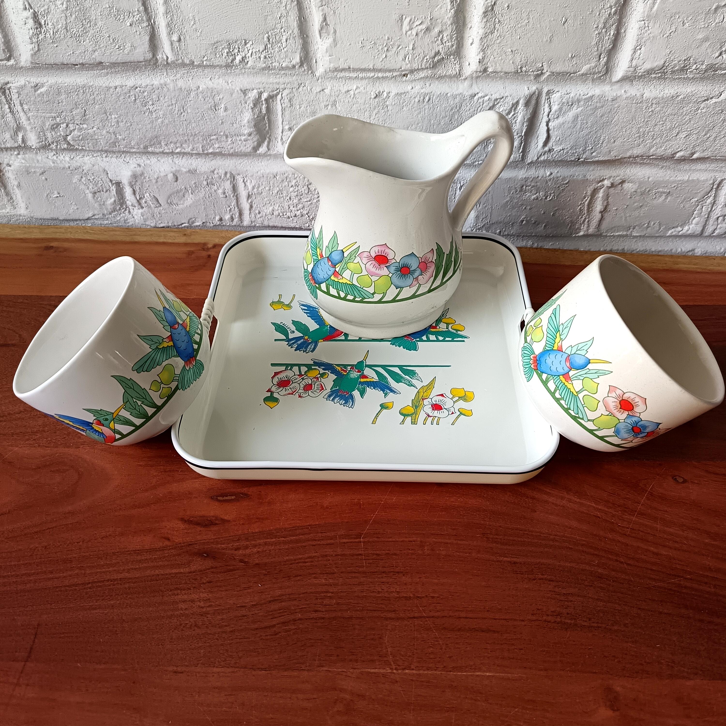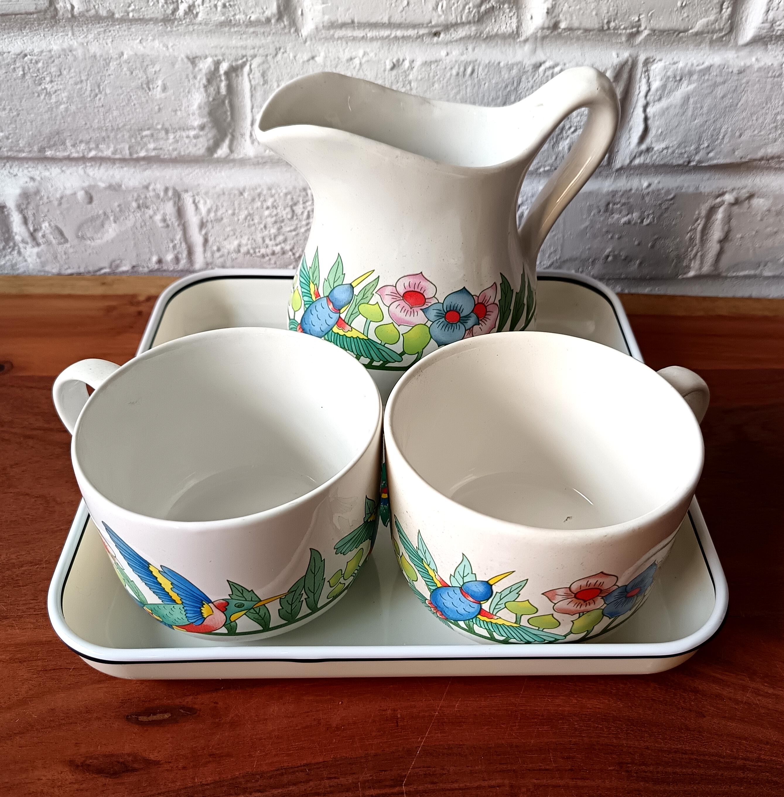 A very pretty vintage breakfast set consisting of two large cups, a small jug, and a tray. The whole set is decorated with colorful bird and flower motifs.