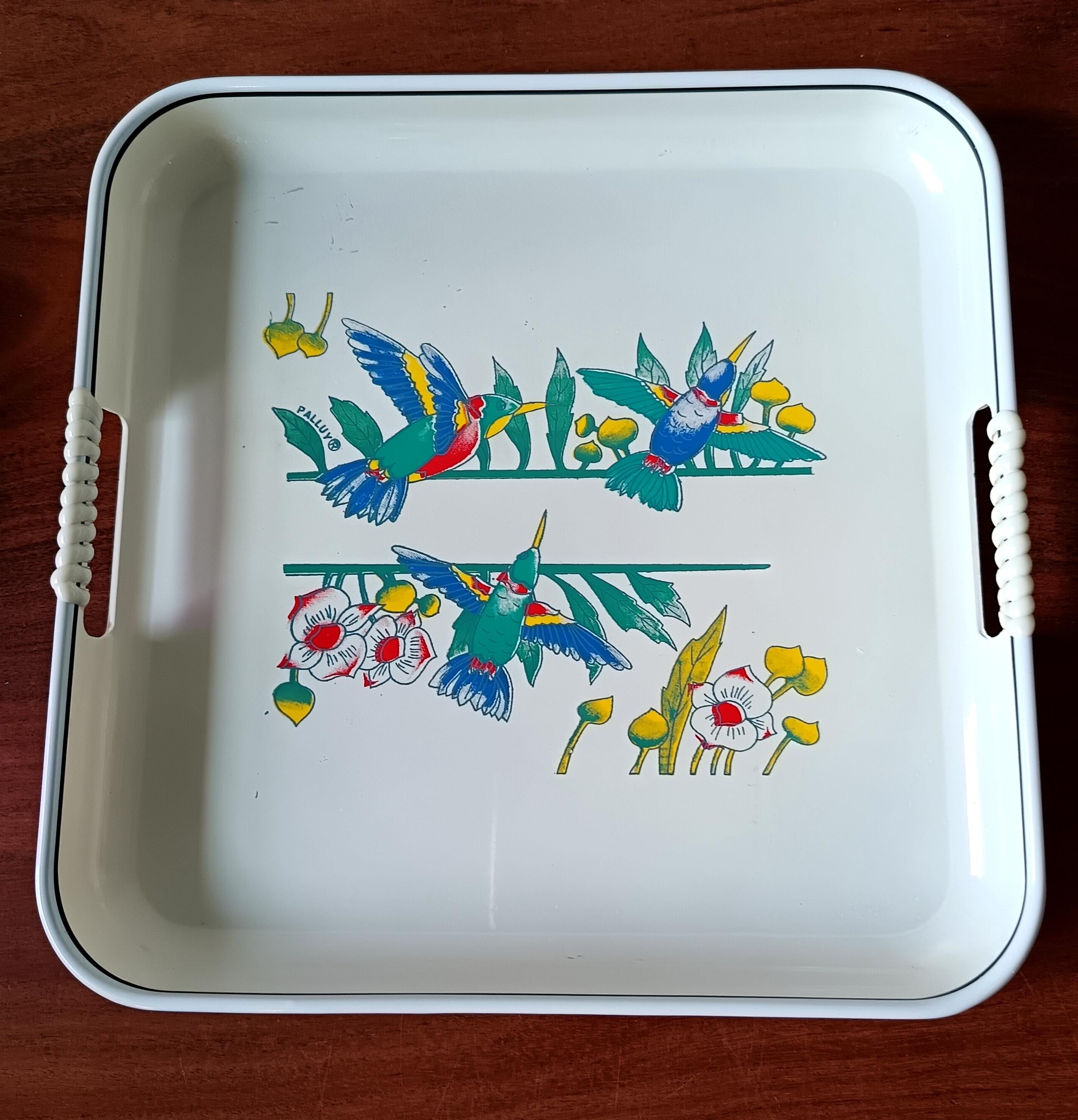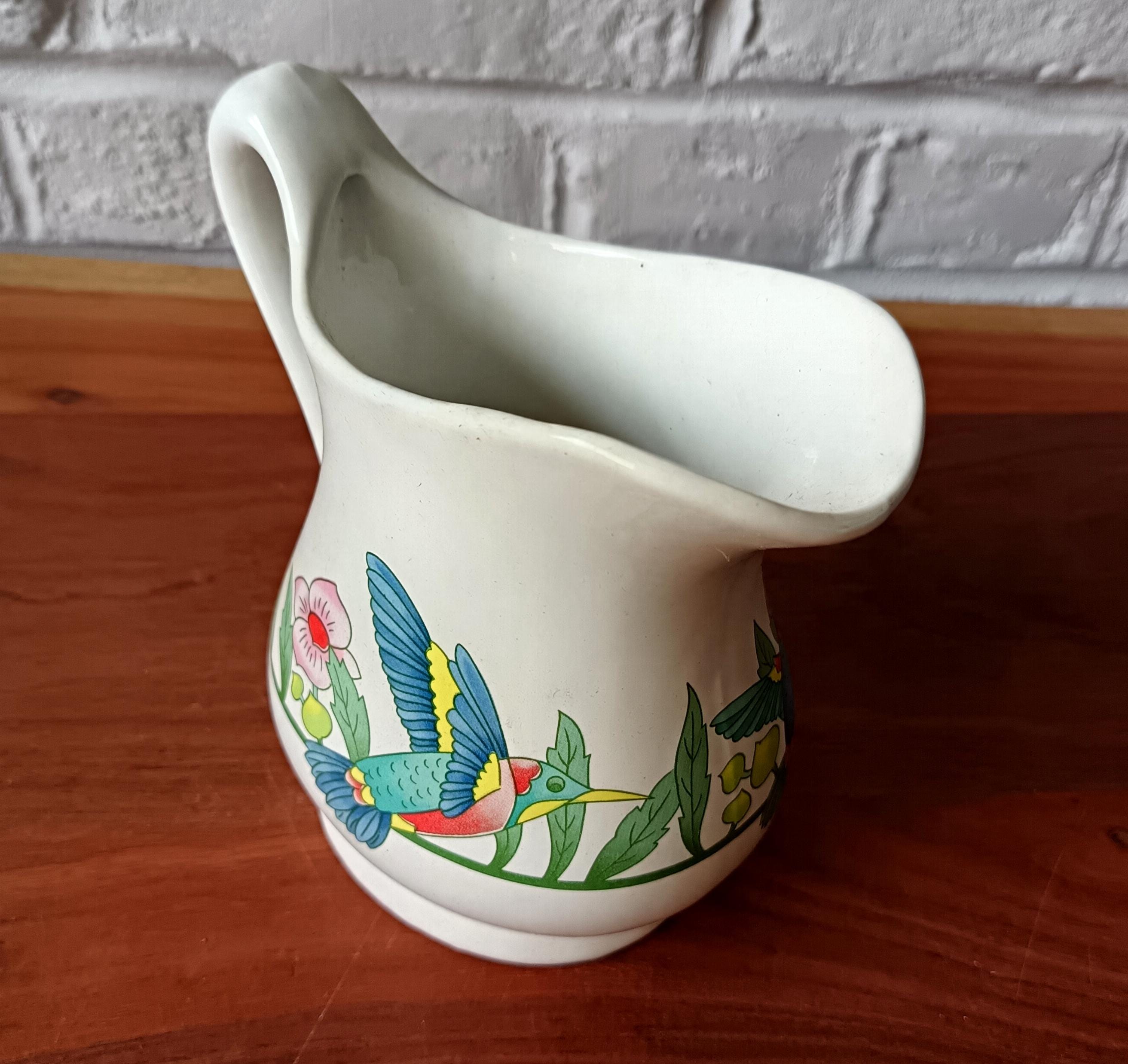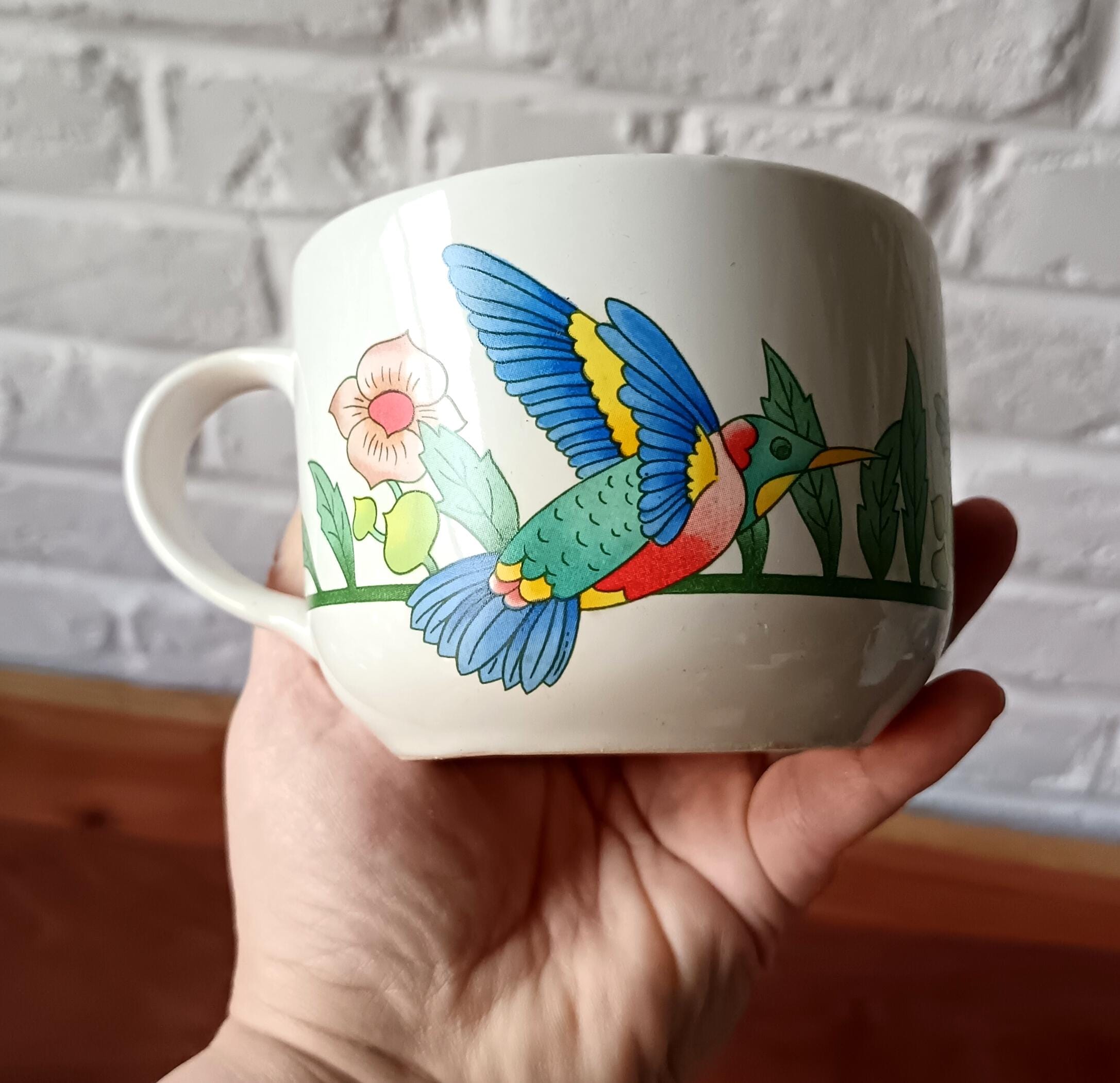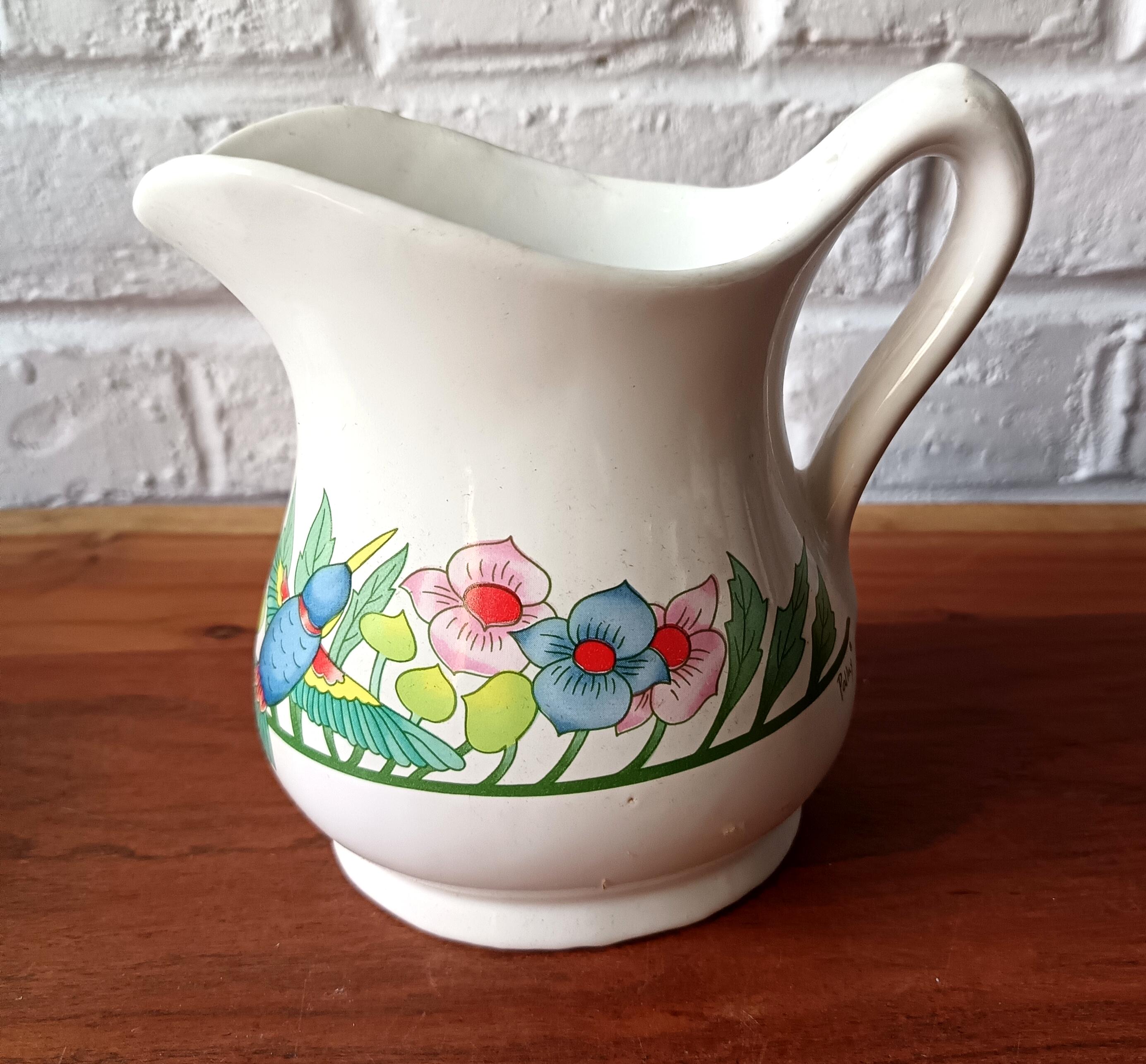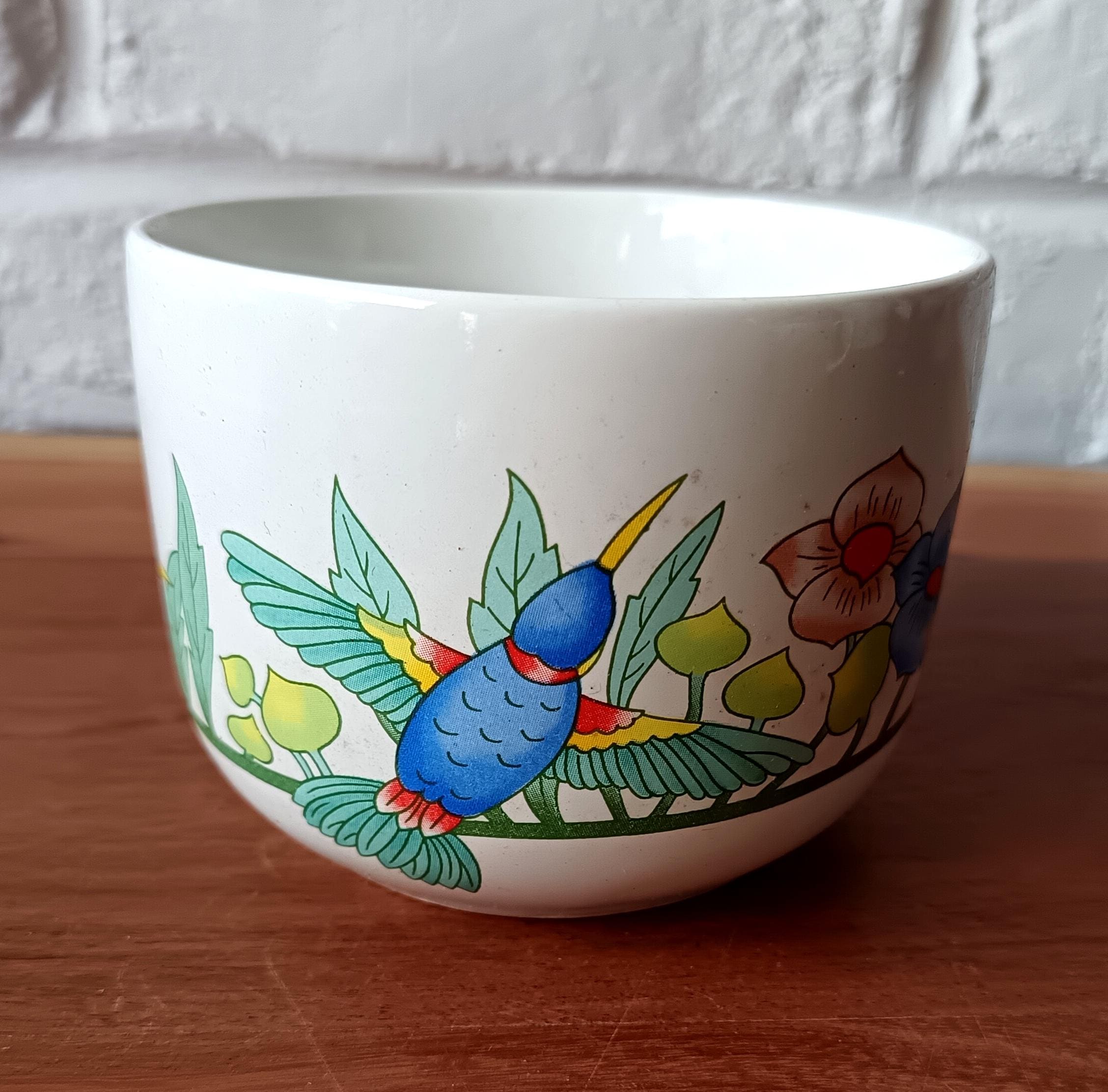 A very pretty vintage breakfast set consisting of two large cups, a small jug, and a tray. The whole set is decorated with colorful bird and flower motifs.
