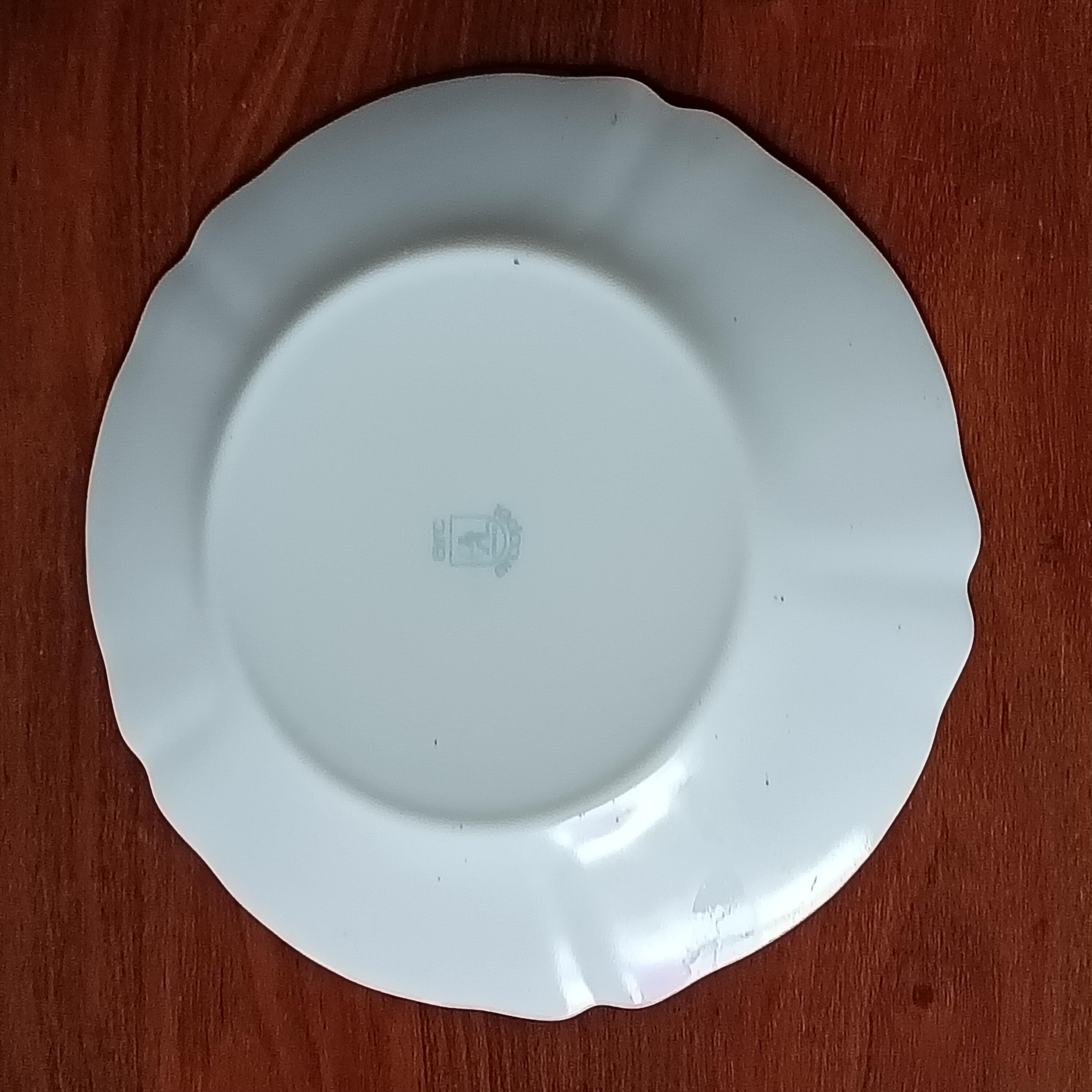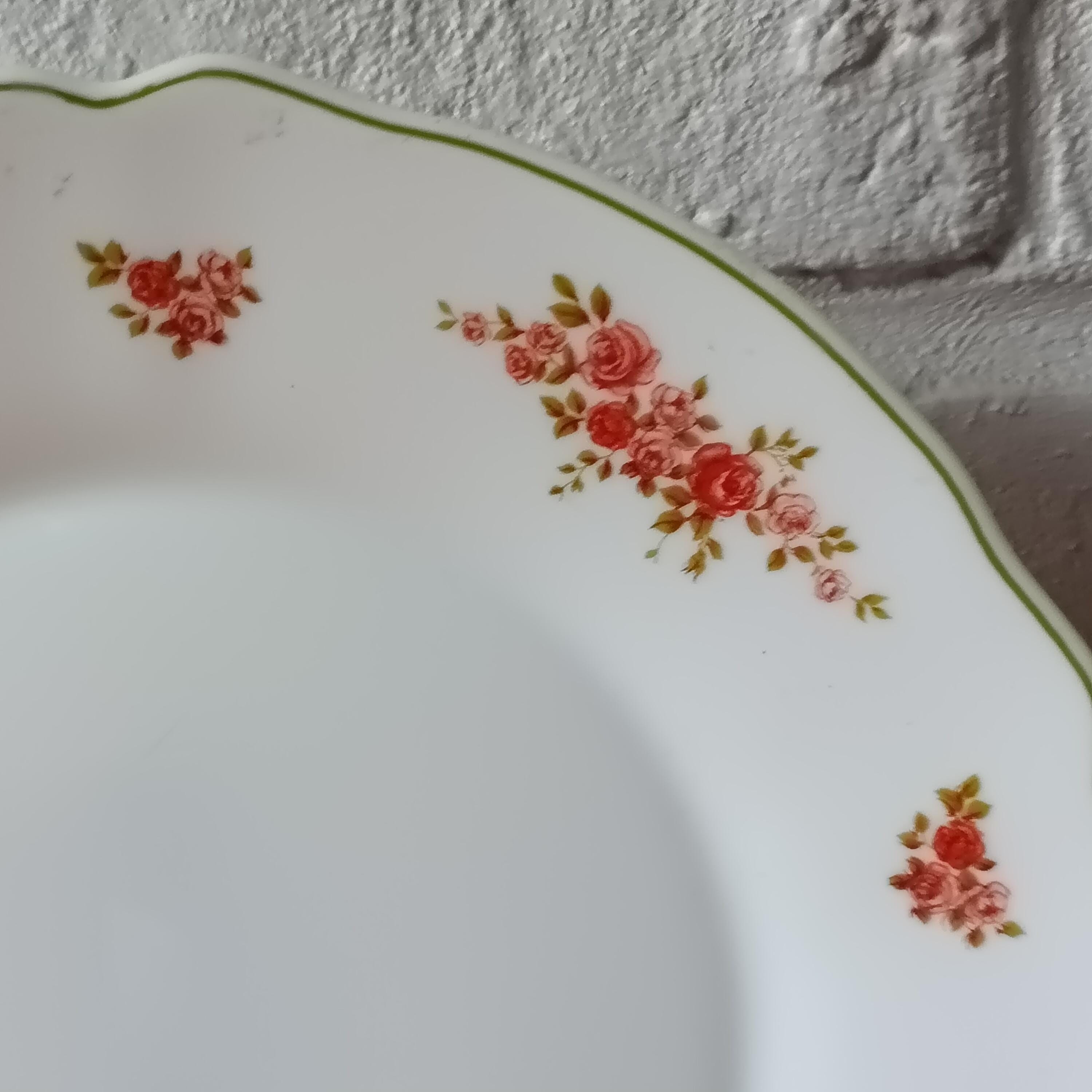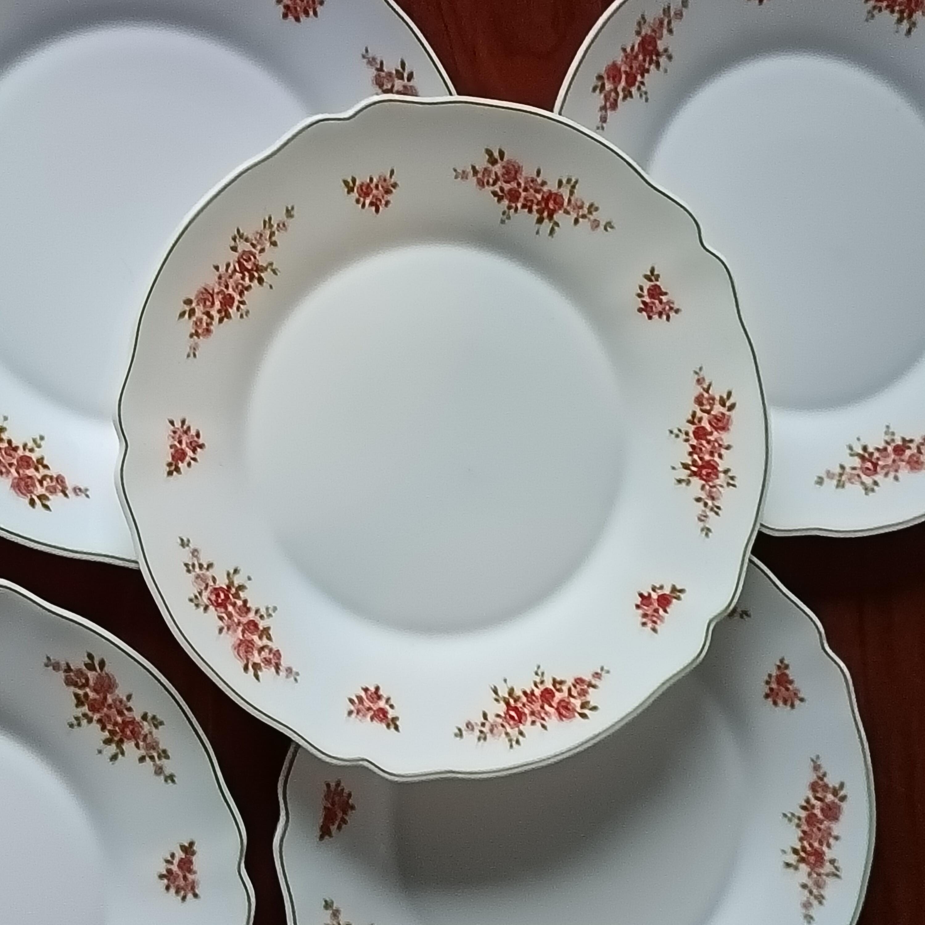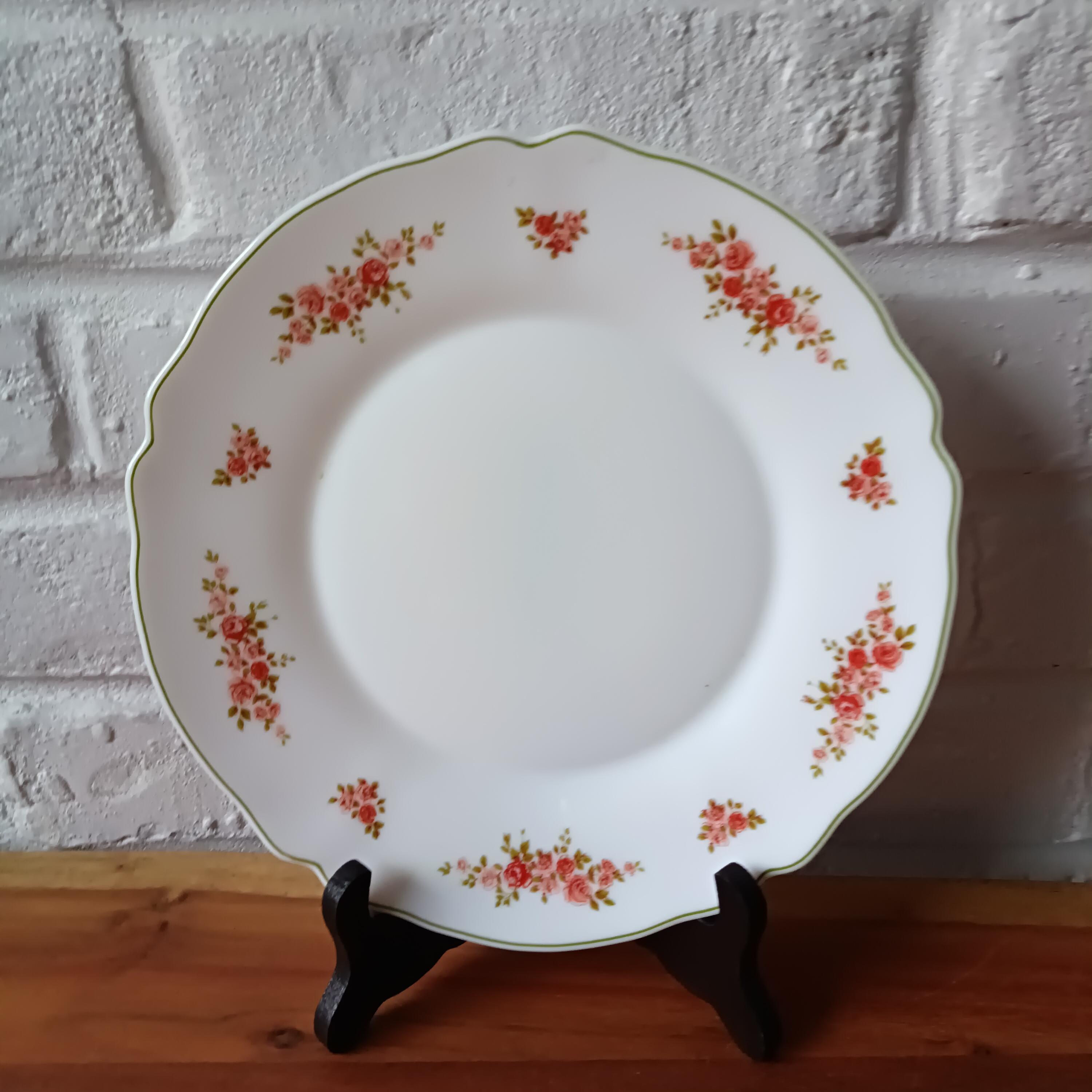 8 French opaline Arcopal dinner plates with Ronsard motif