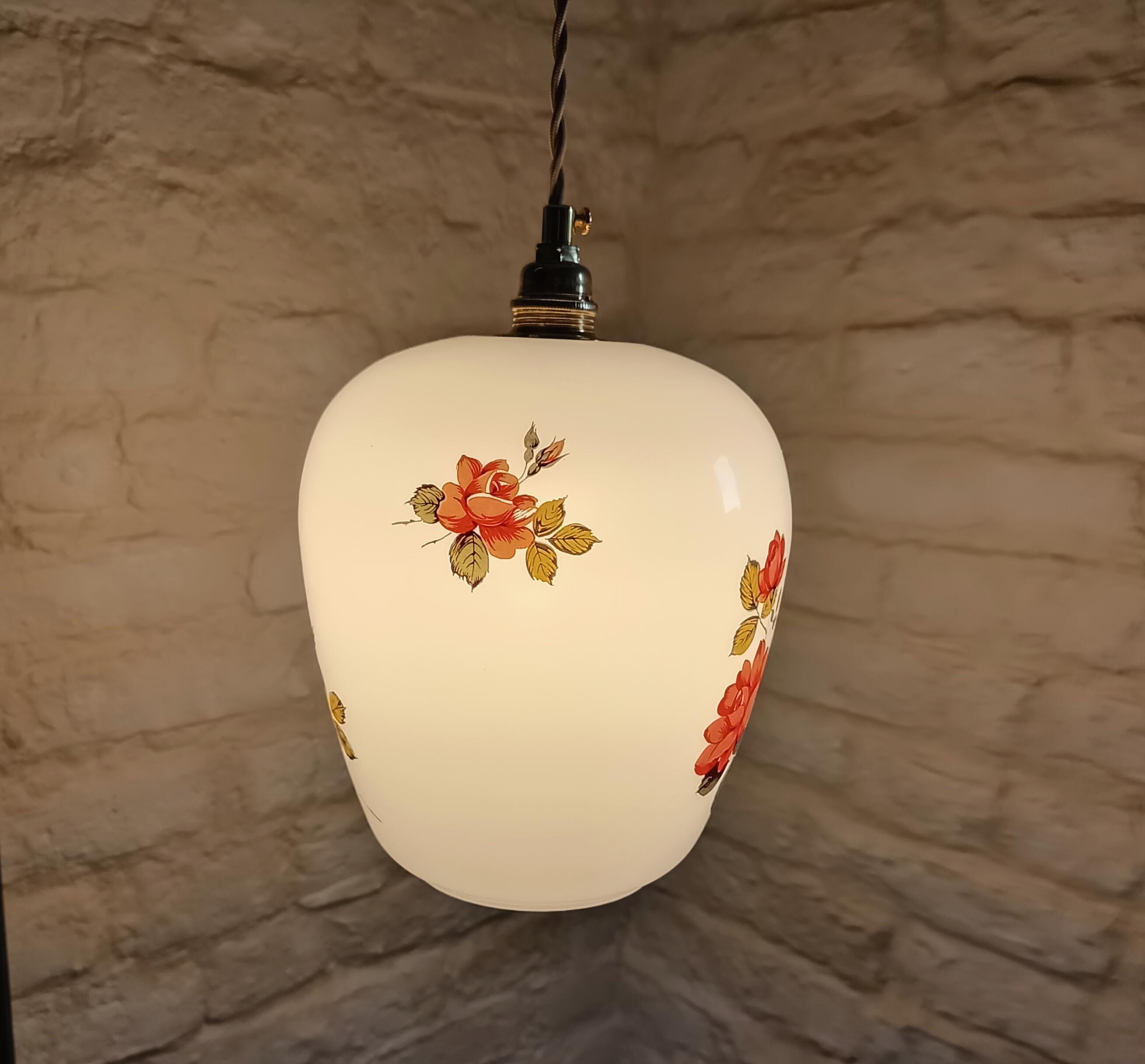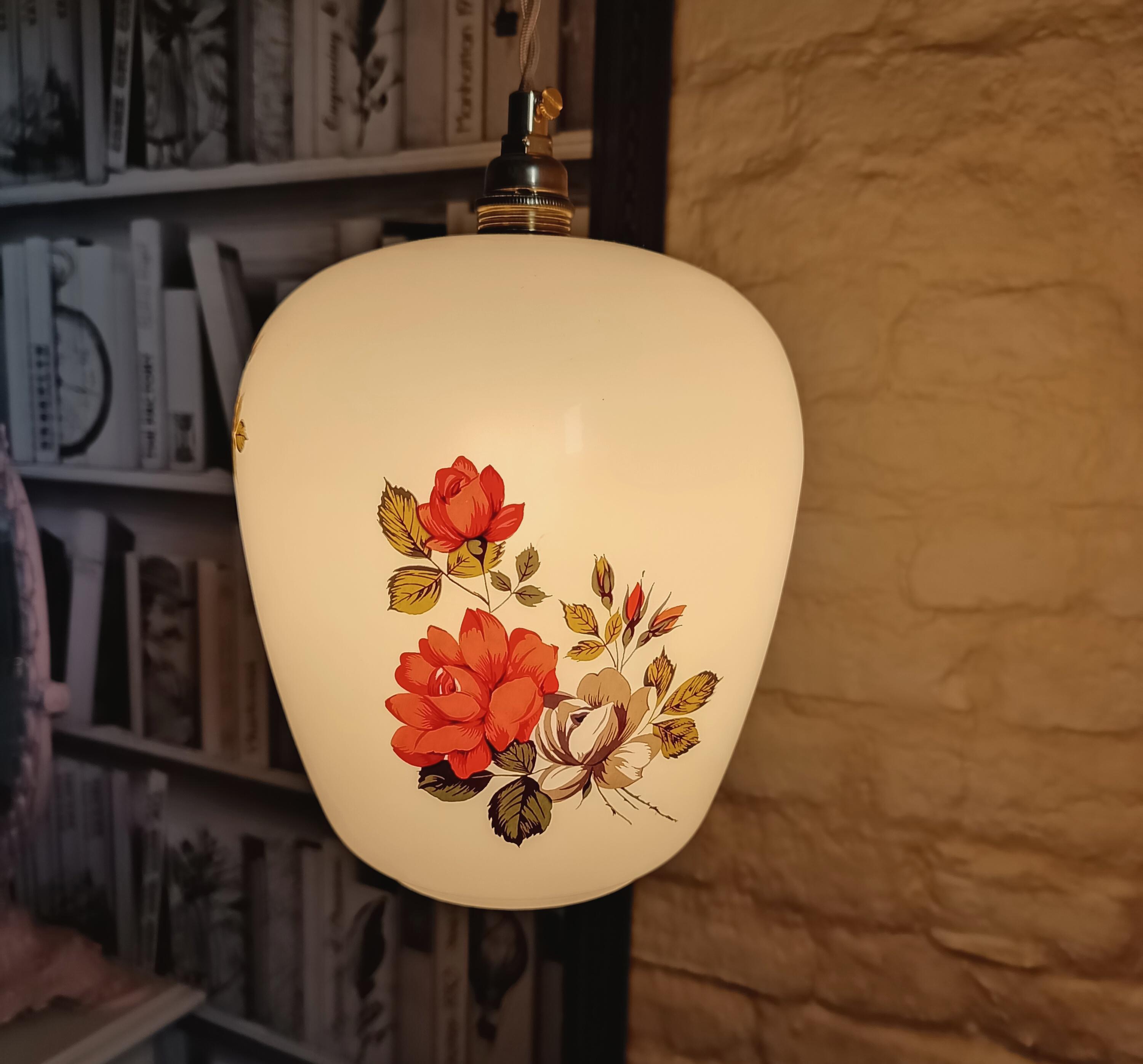Vintage opaline glass pendant light with a pretty design and floral motifs, around the perimeter 4 floral bouquets 2 large and 2 small.