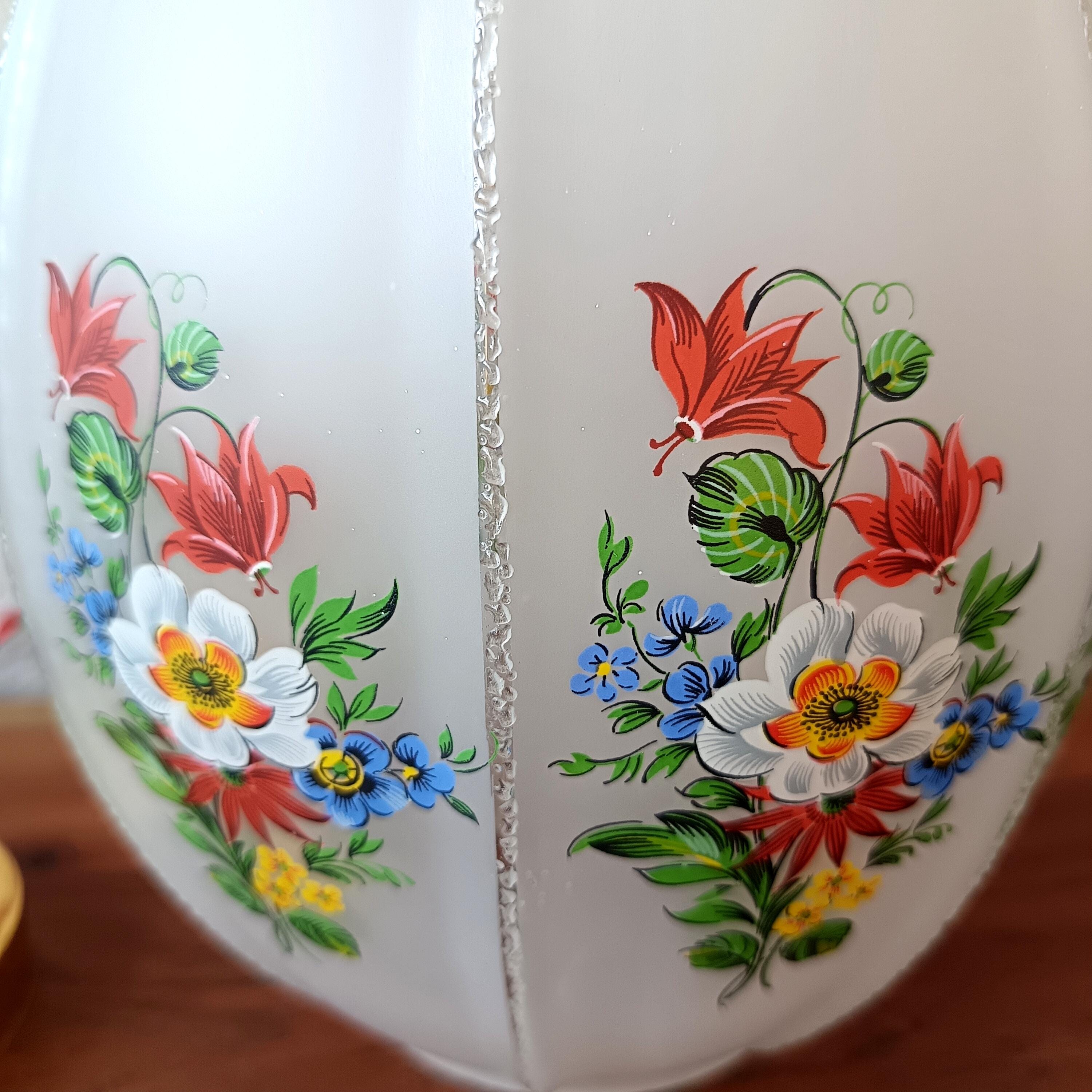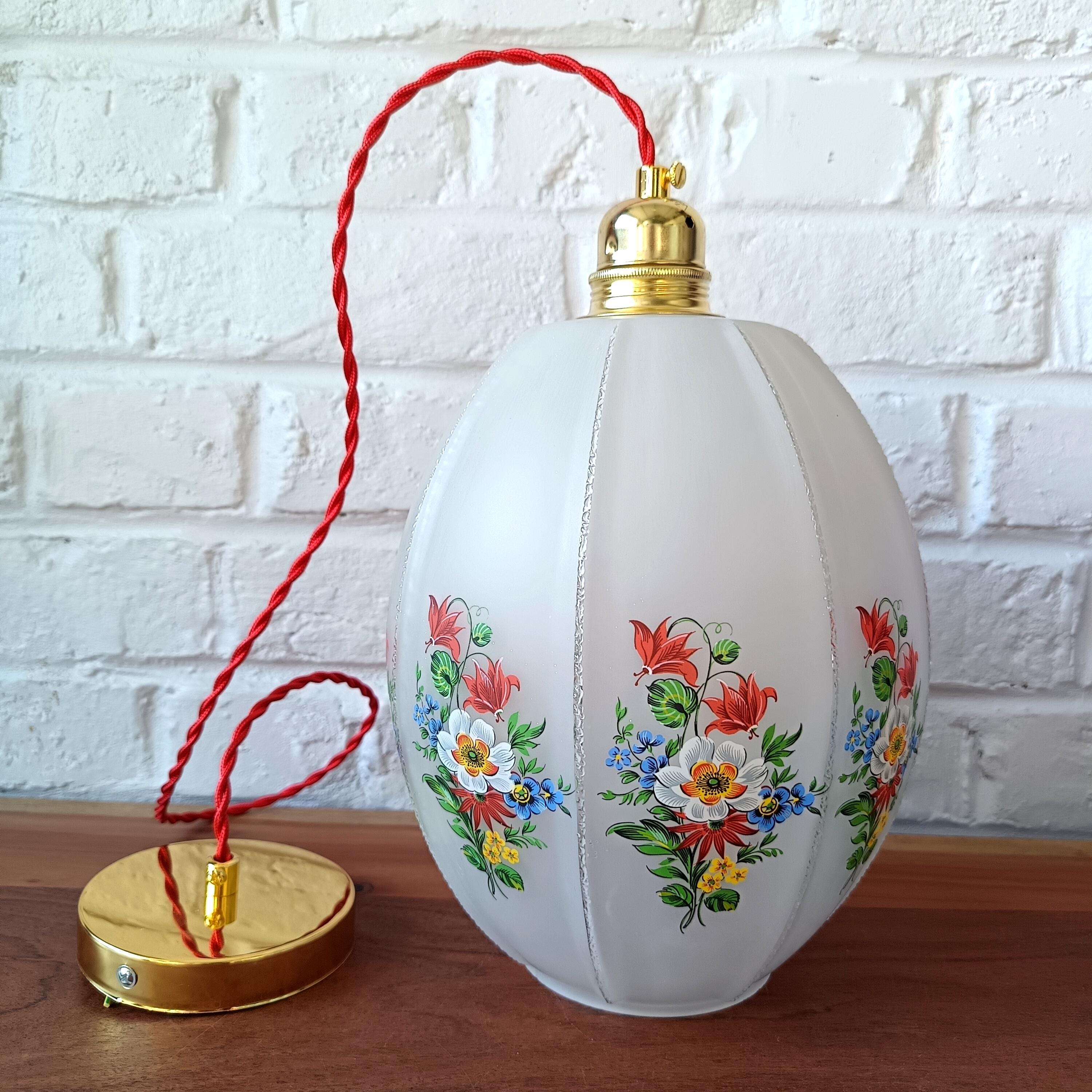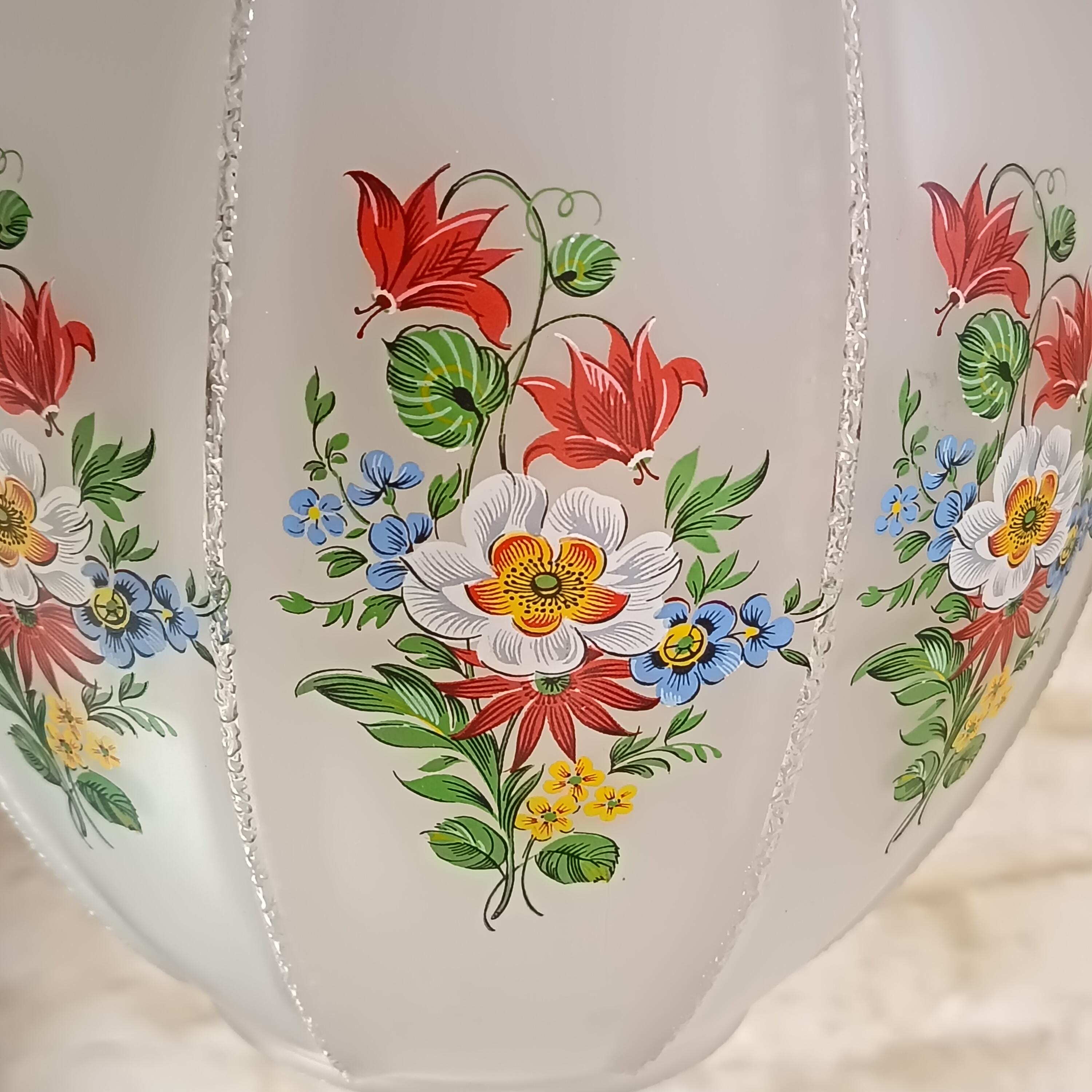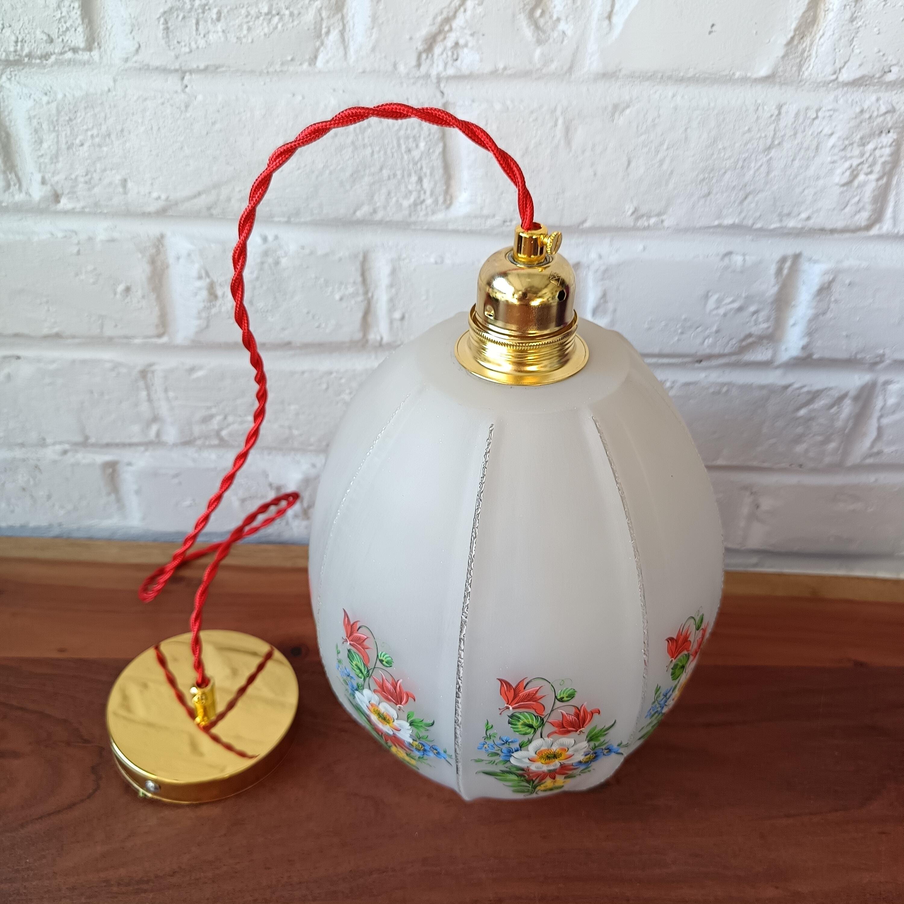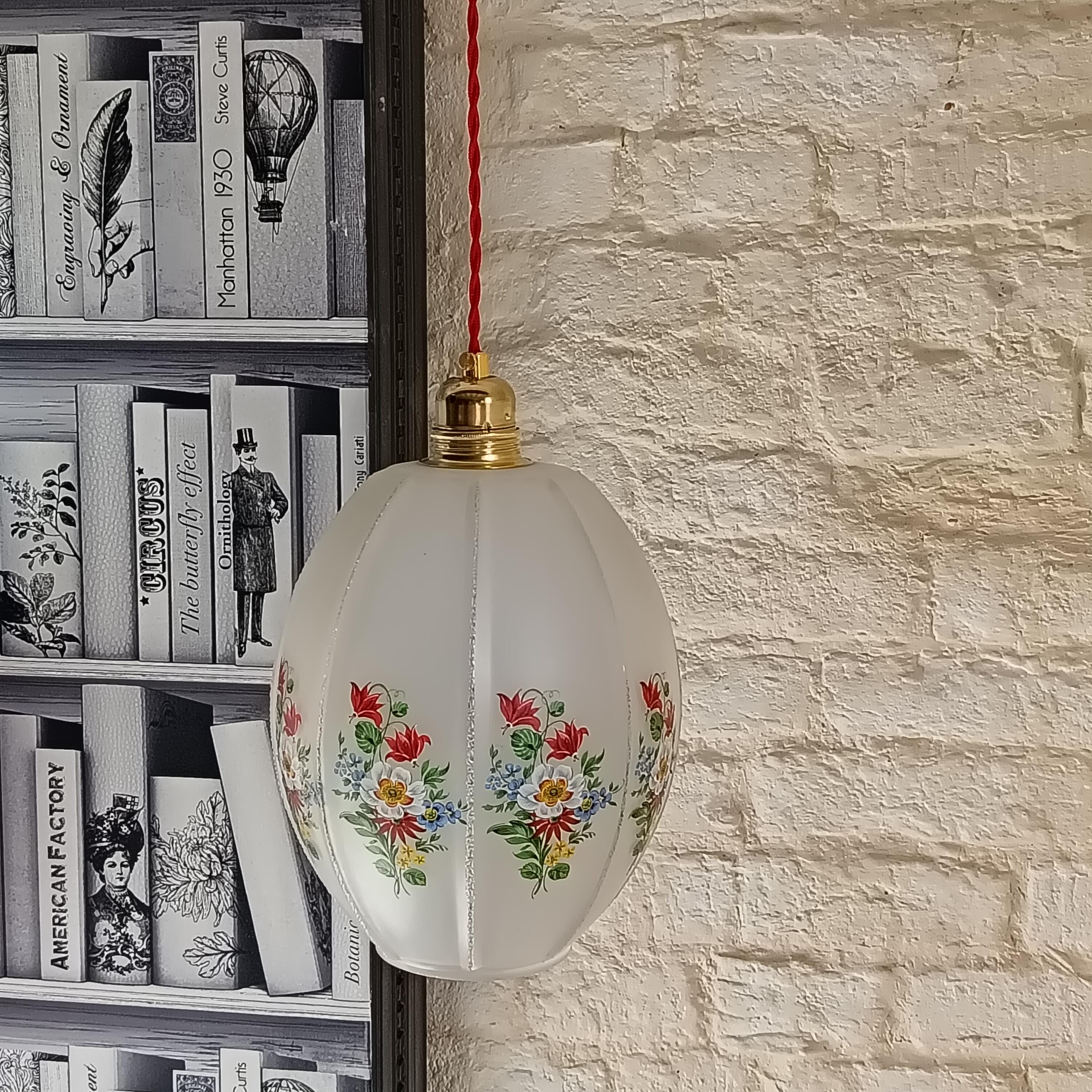 Suspension vintage en verre dépoli orné de motifs floraux, de forme ovoïde, elle date des années 60,