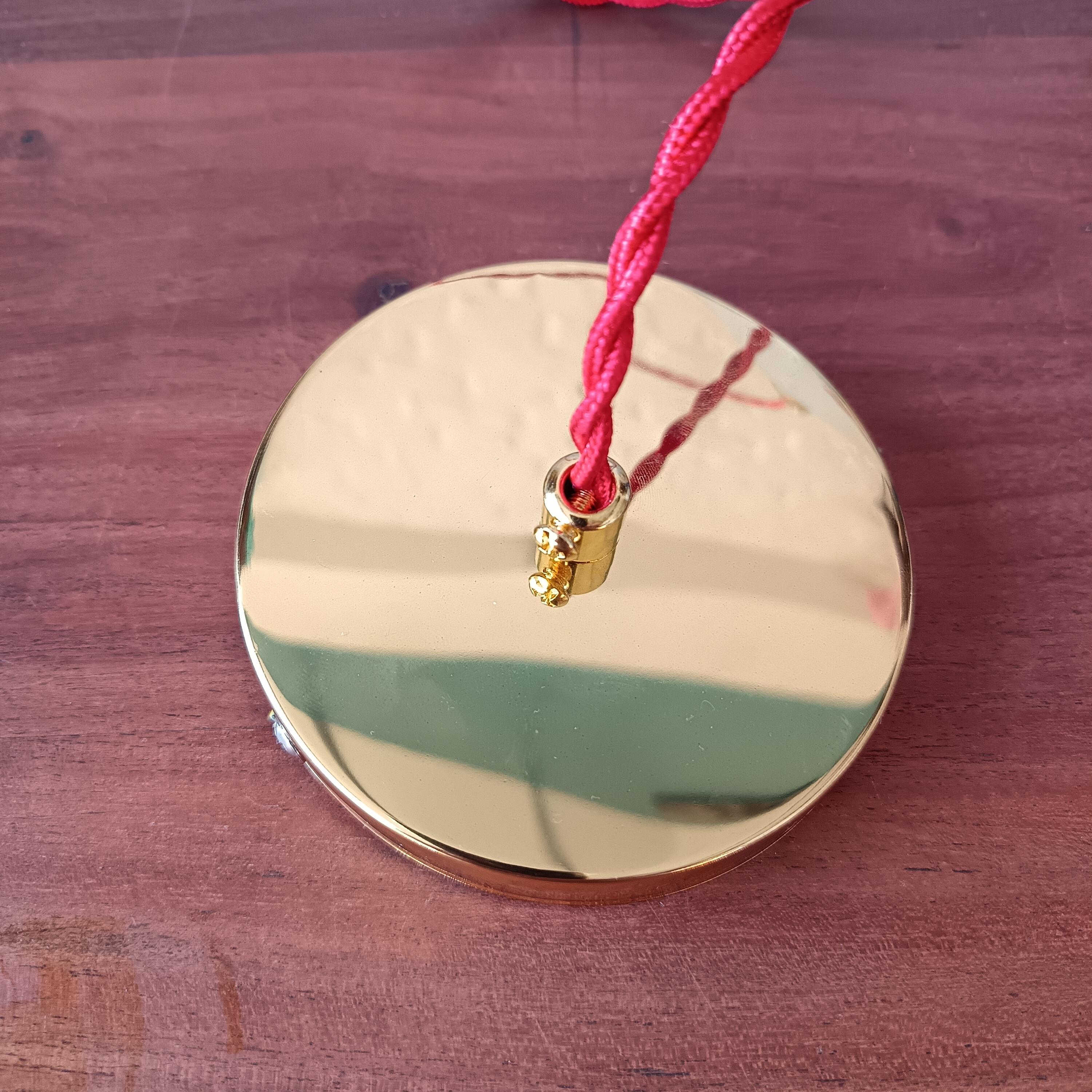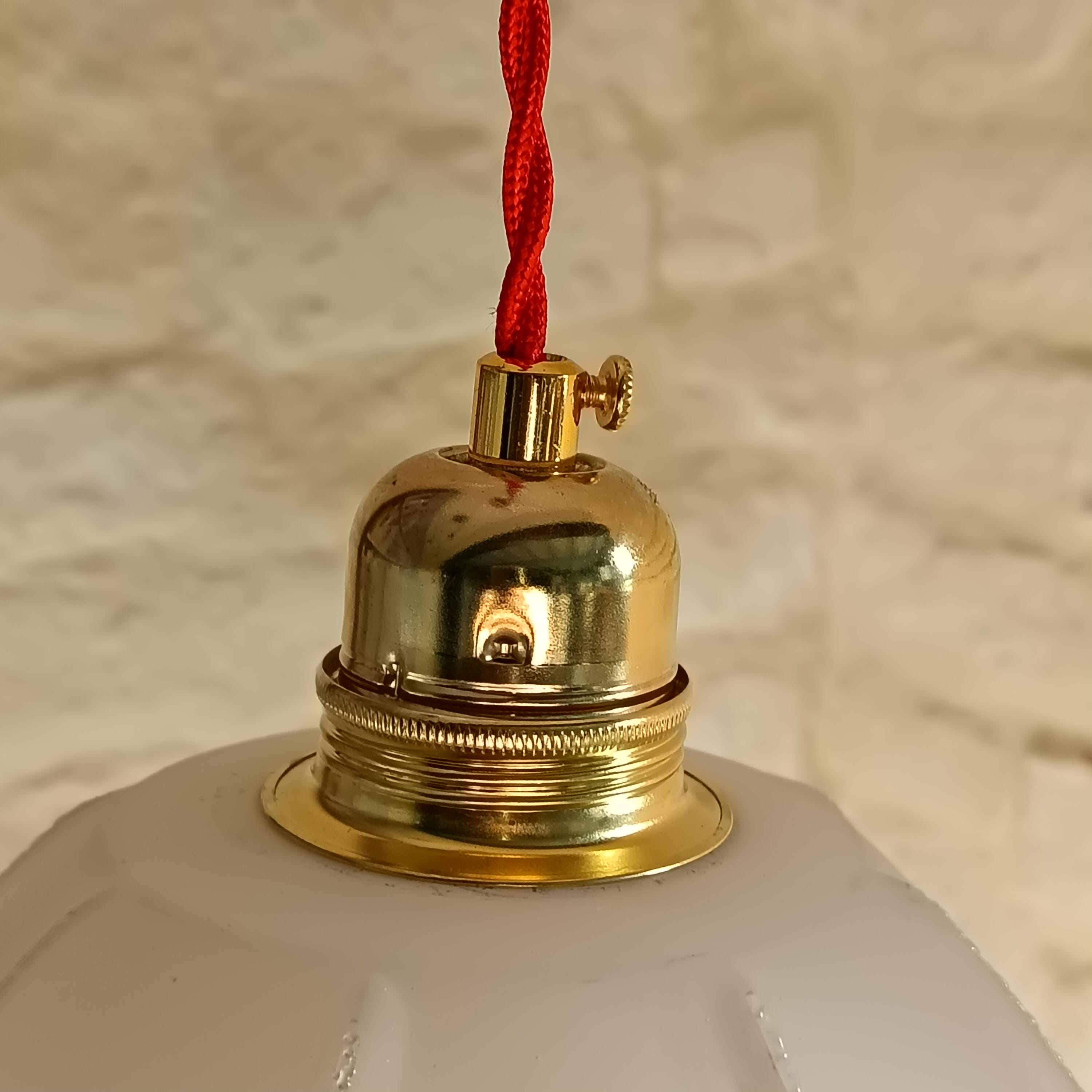 elle est électrifiée à neuf avec un fil torsadé gainé textile couleur rouge, La rosace de plafond est en métal doré ainsi que la douille (nécessite une ampoule à vis e27 non fournie).