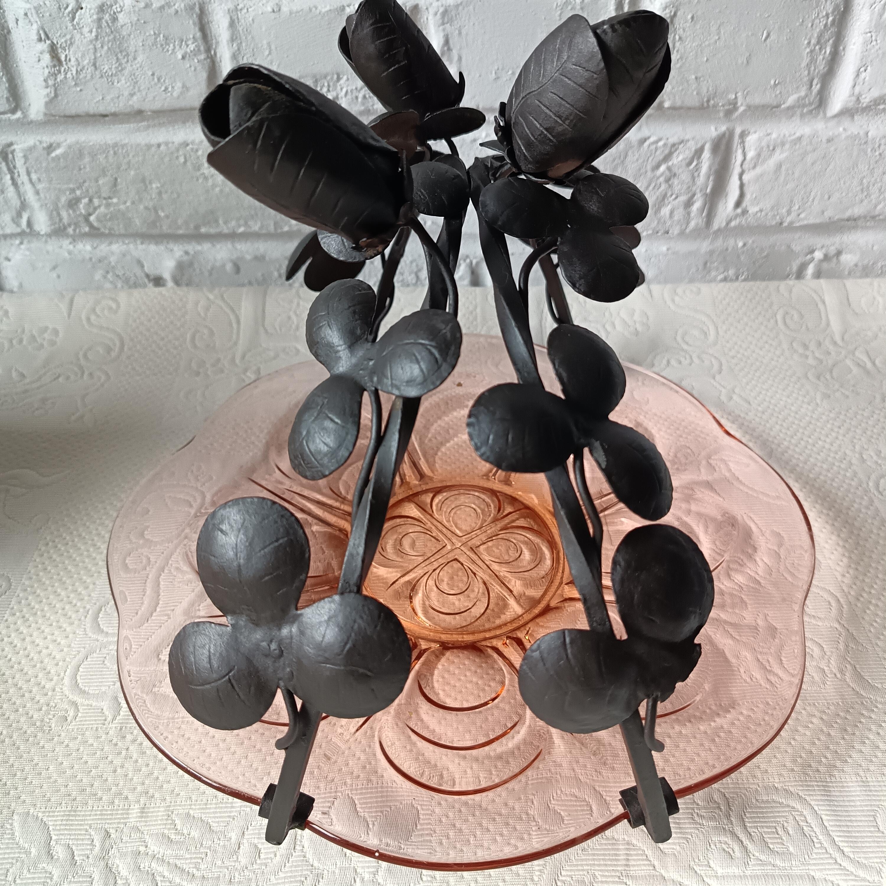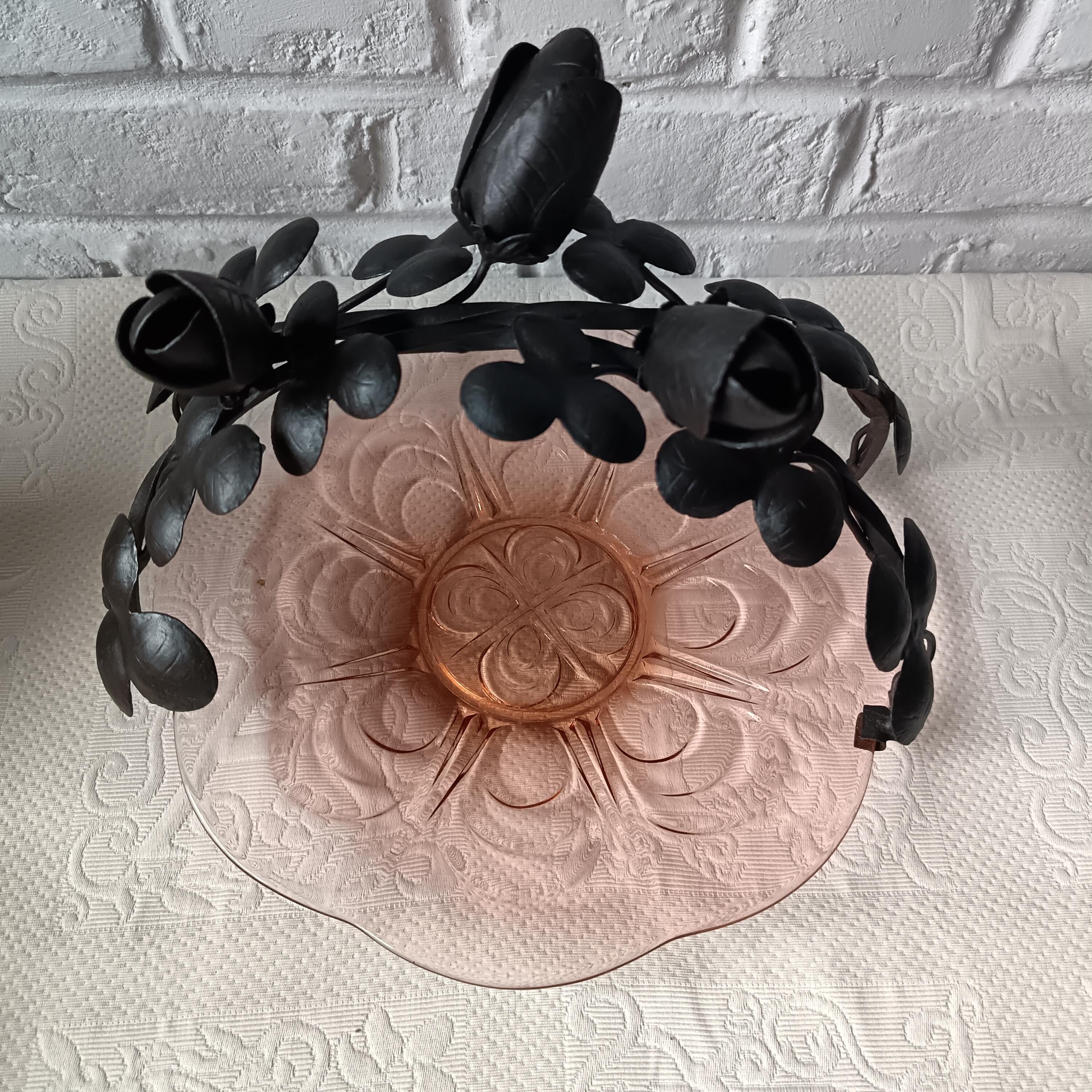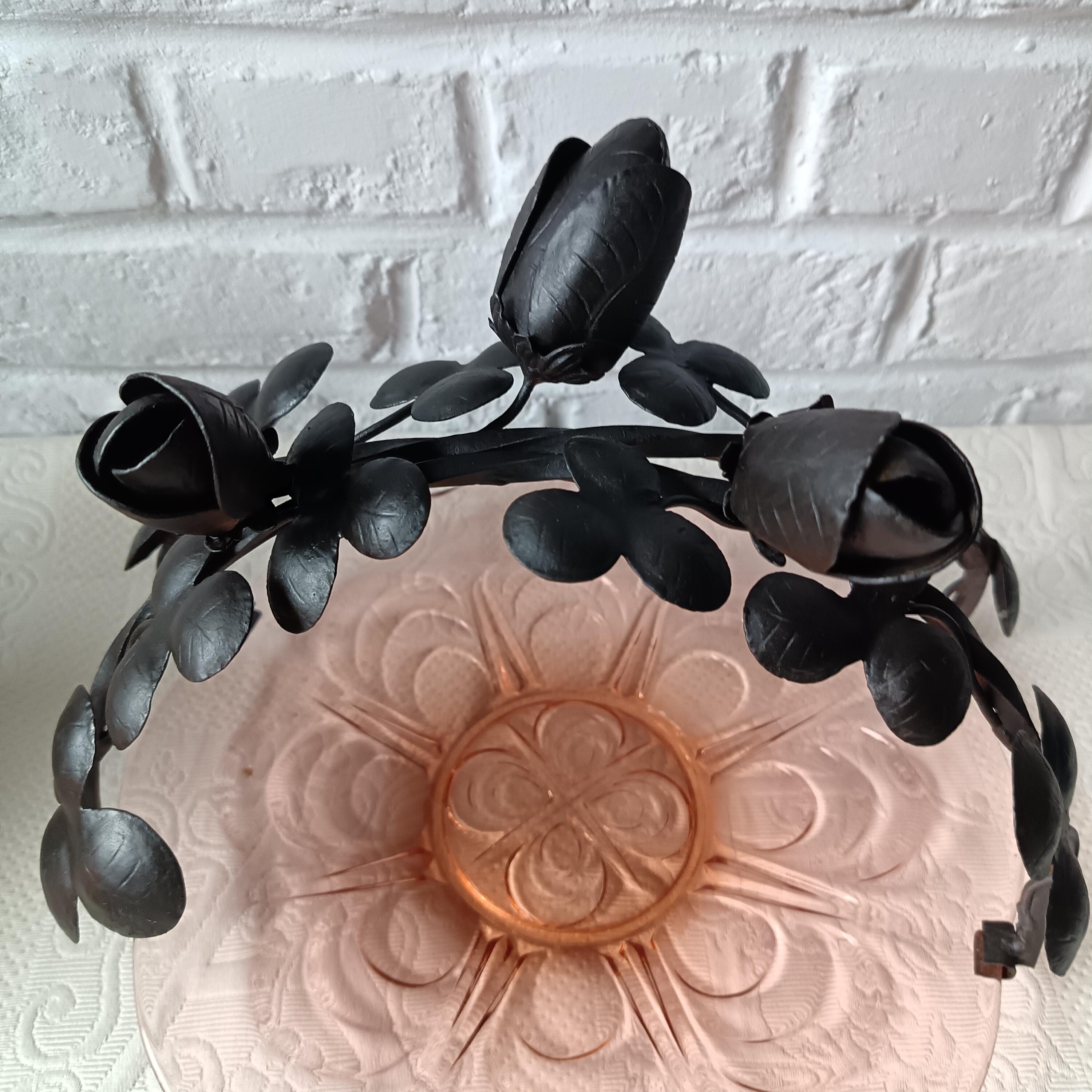Magnificent round pressed pink glass dish, art deco style, topped with a matte black wrought iron decoration.