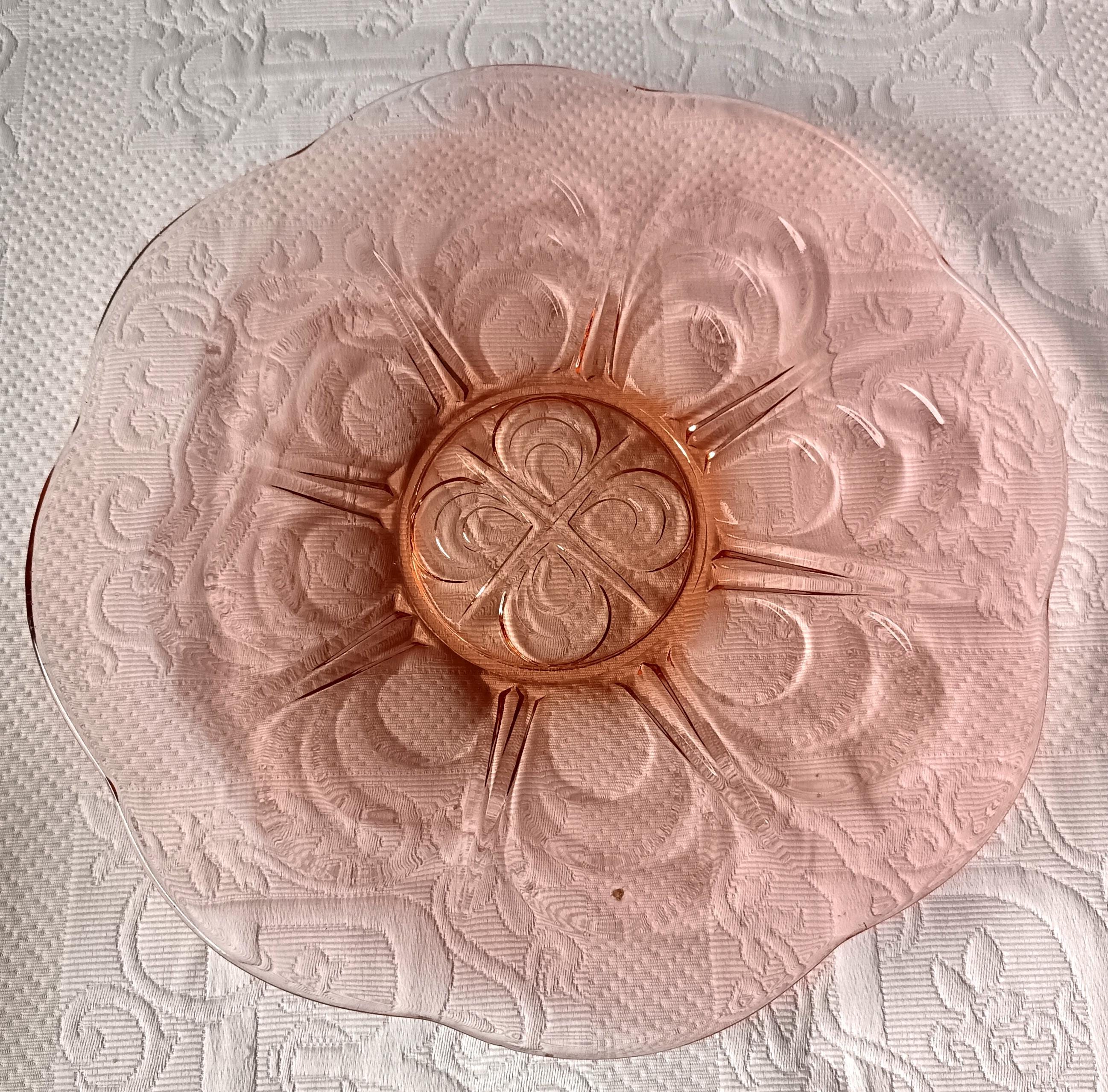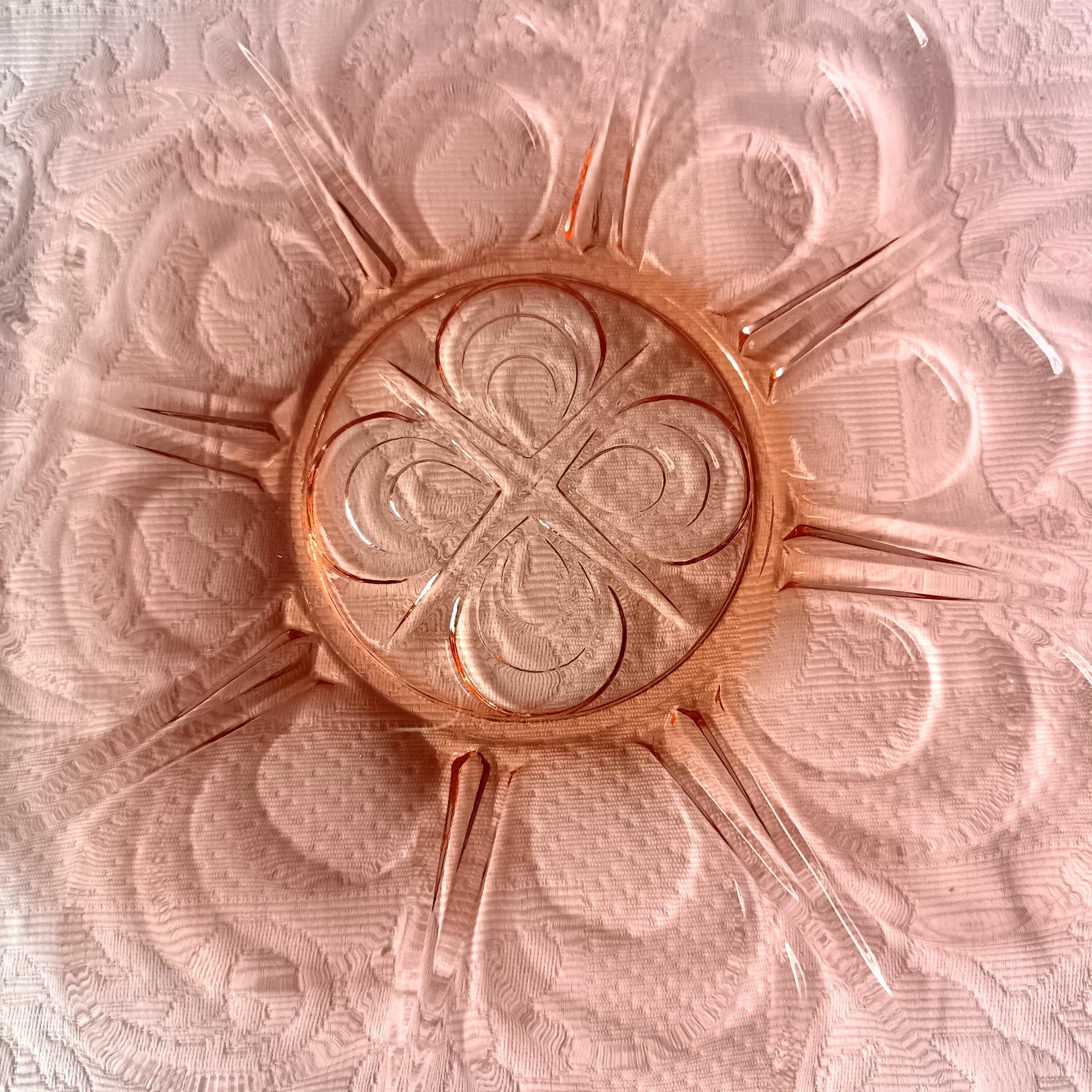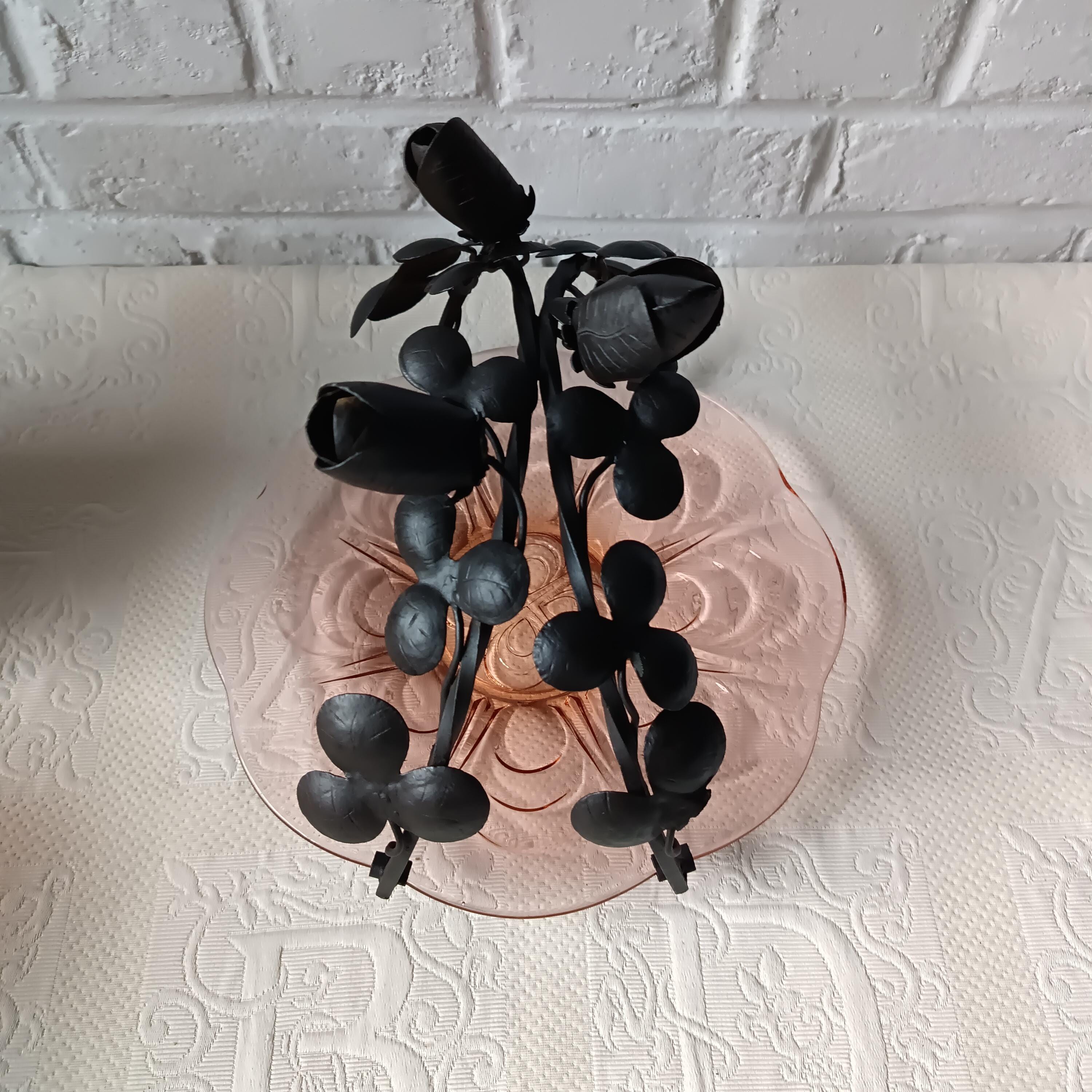 Magnificent round pressed pink glass dish, art deco style, topped with a matte black wrought iron decoration.