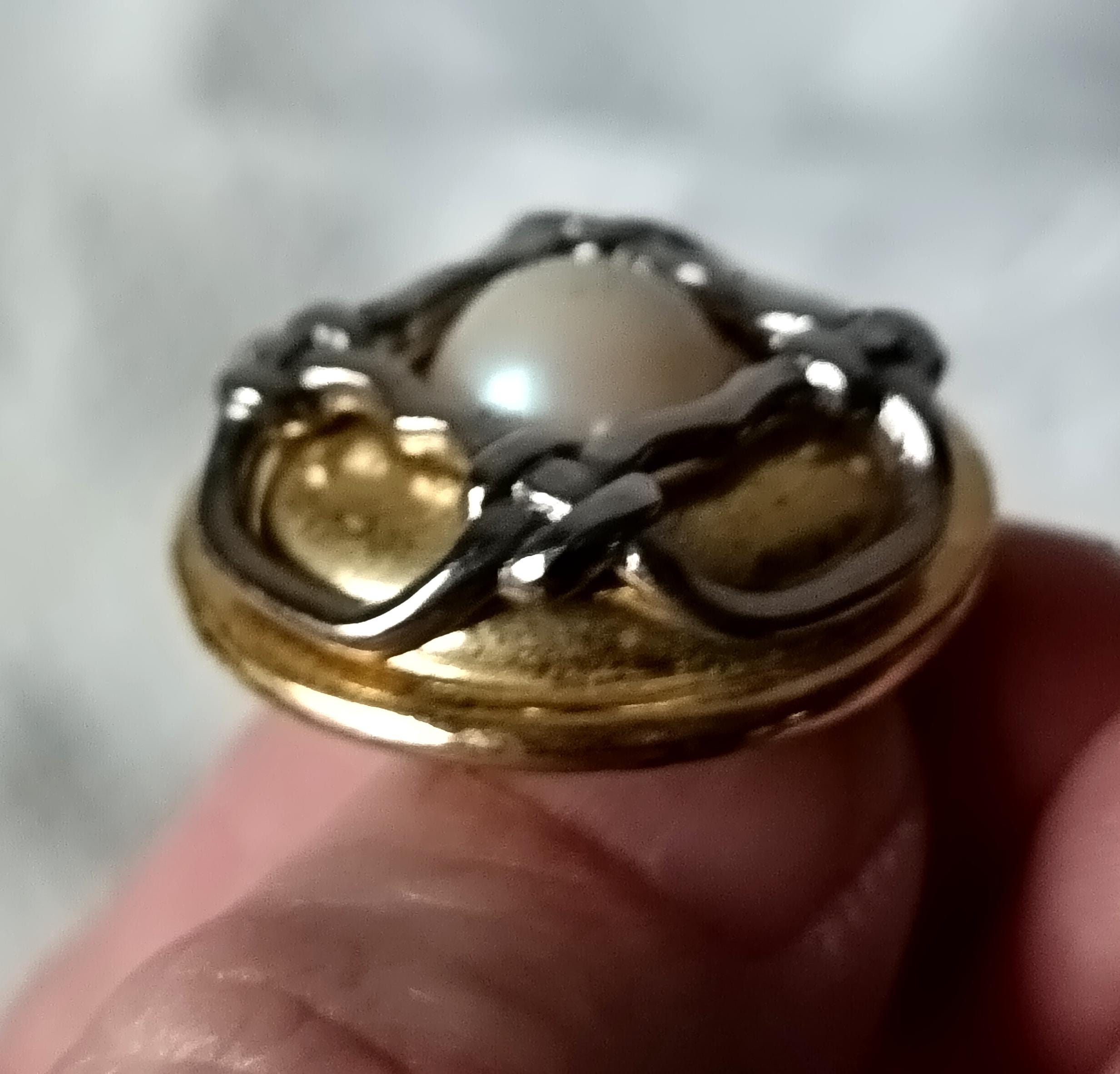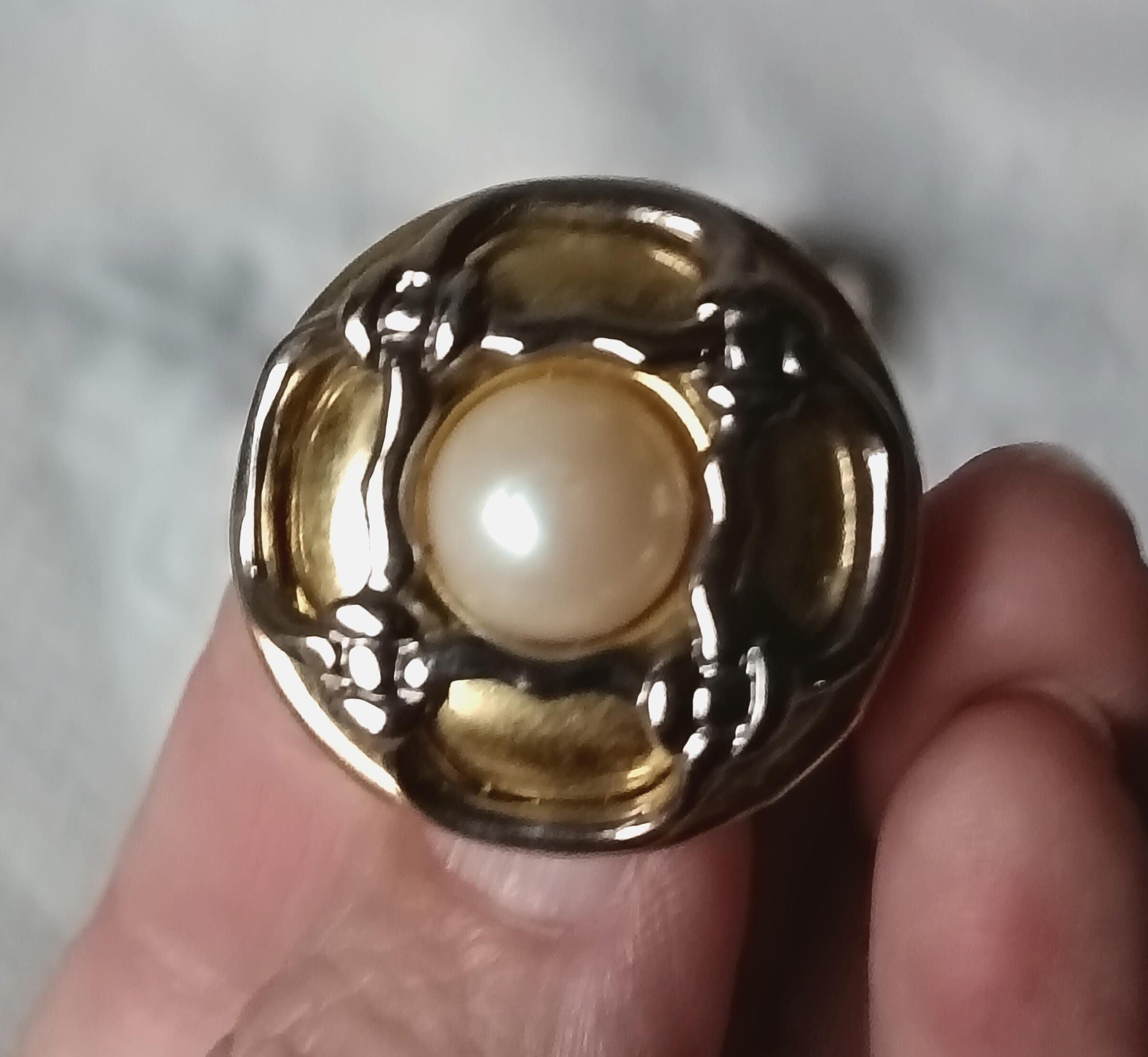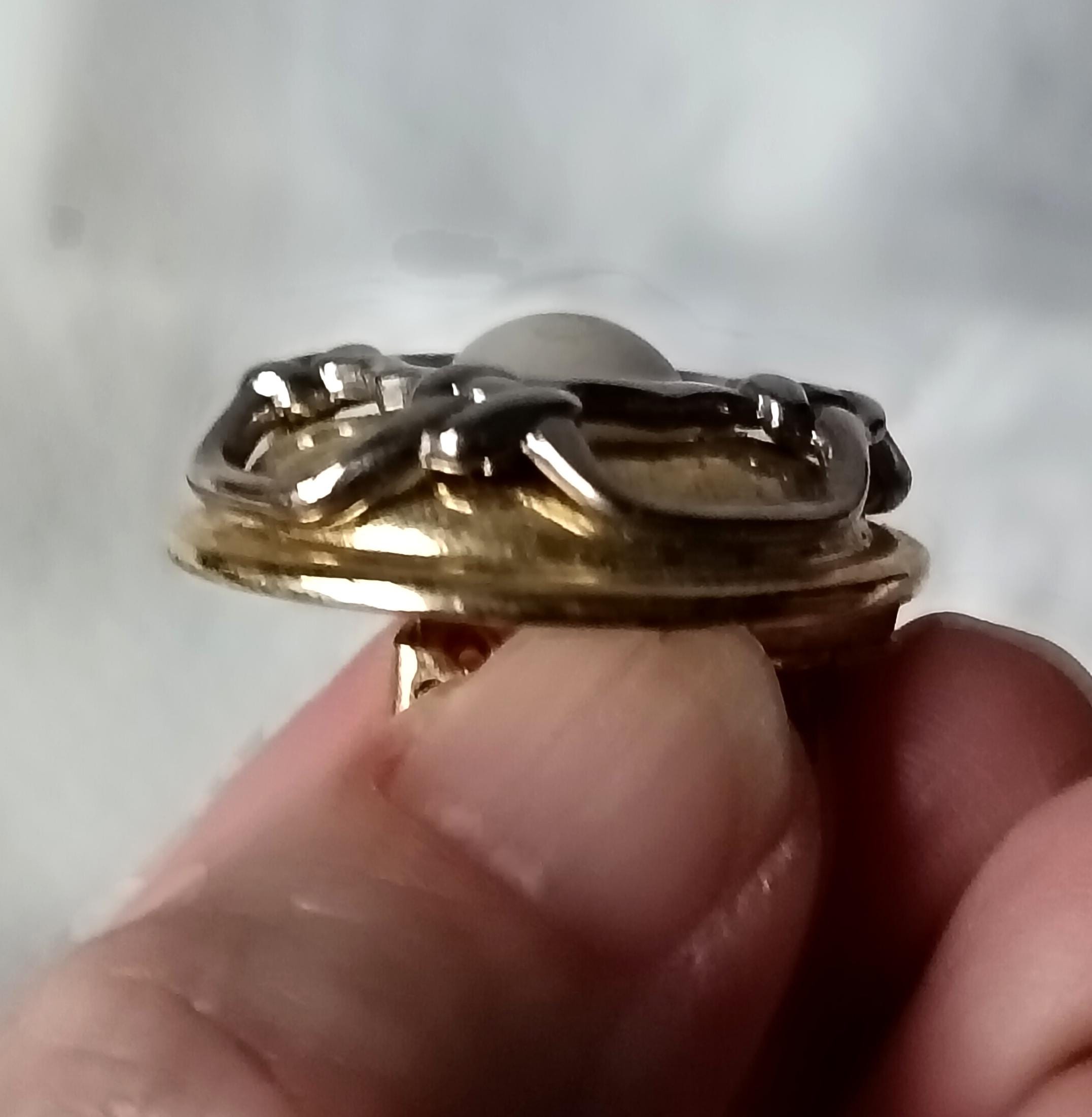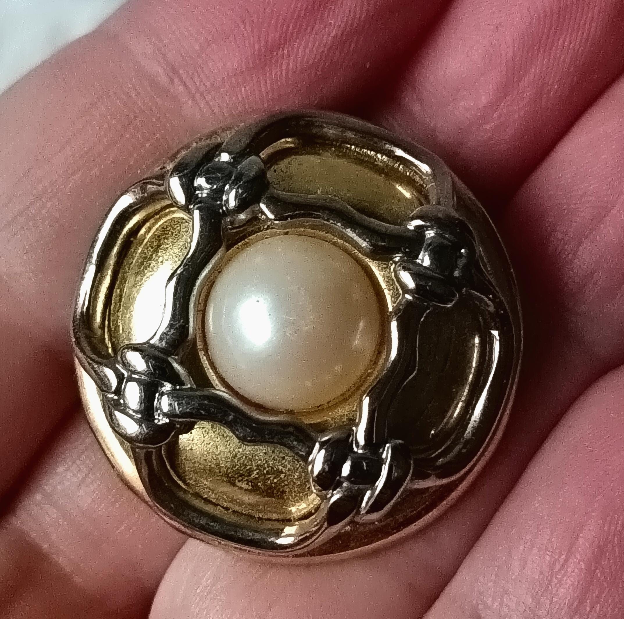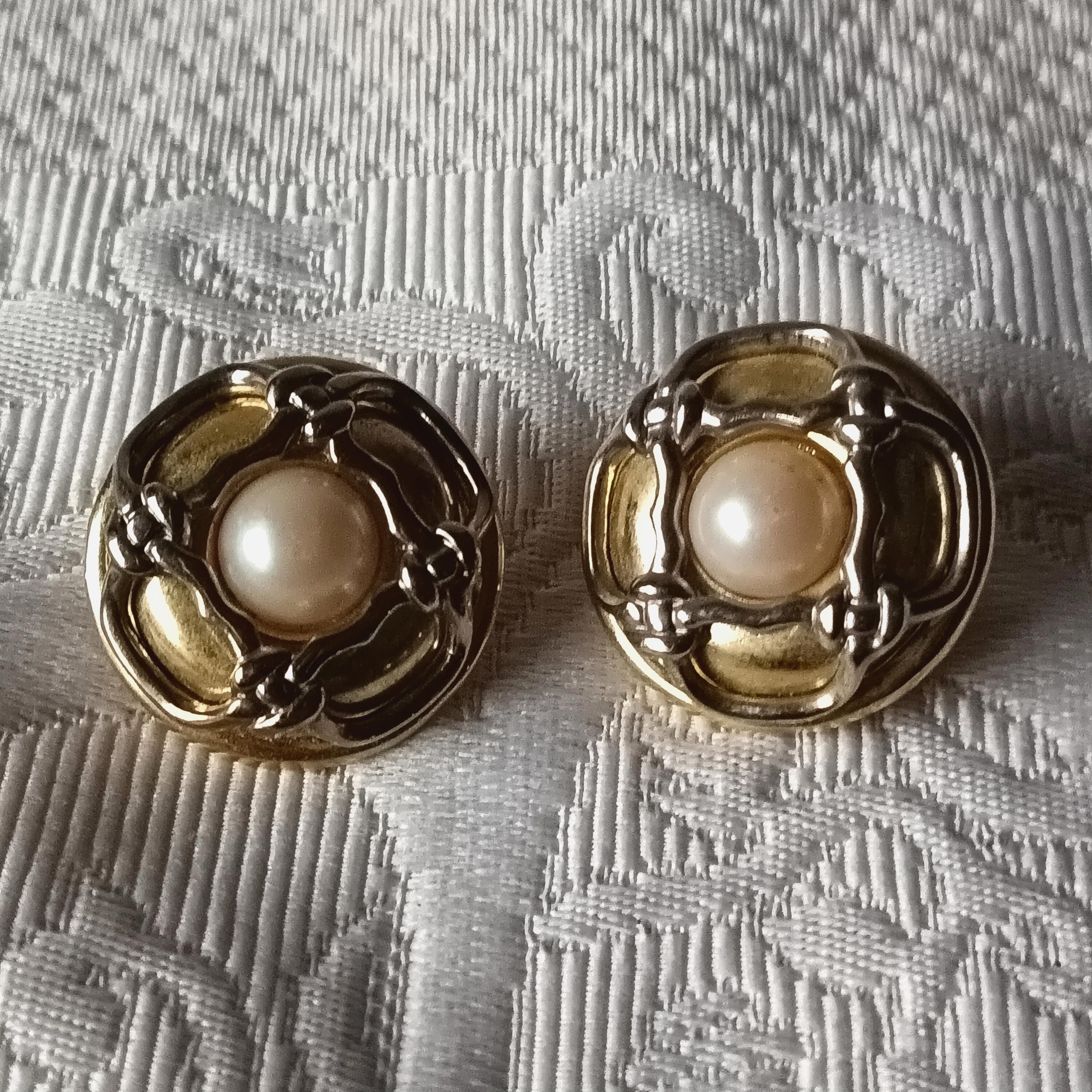 They are round in shape and adorned with a small cream-colored cabochon in the center.