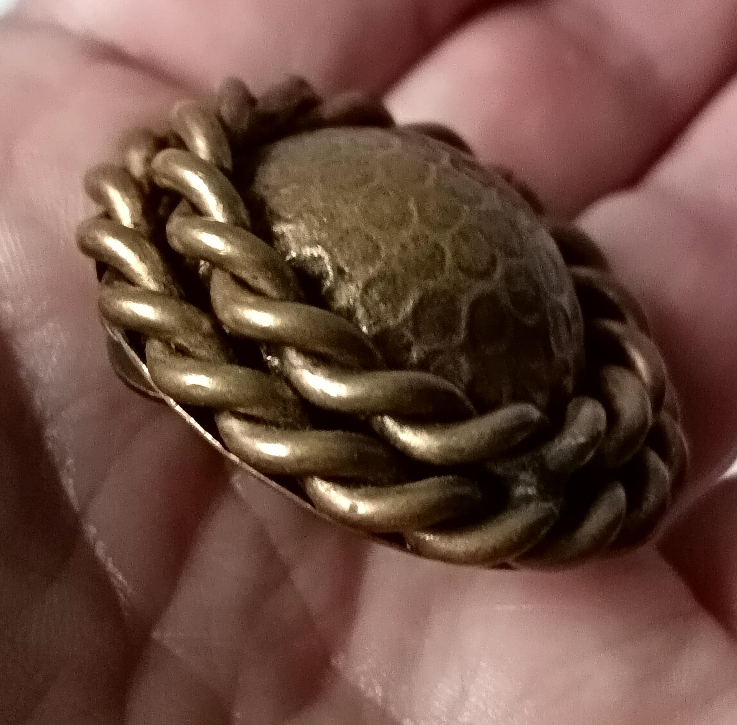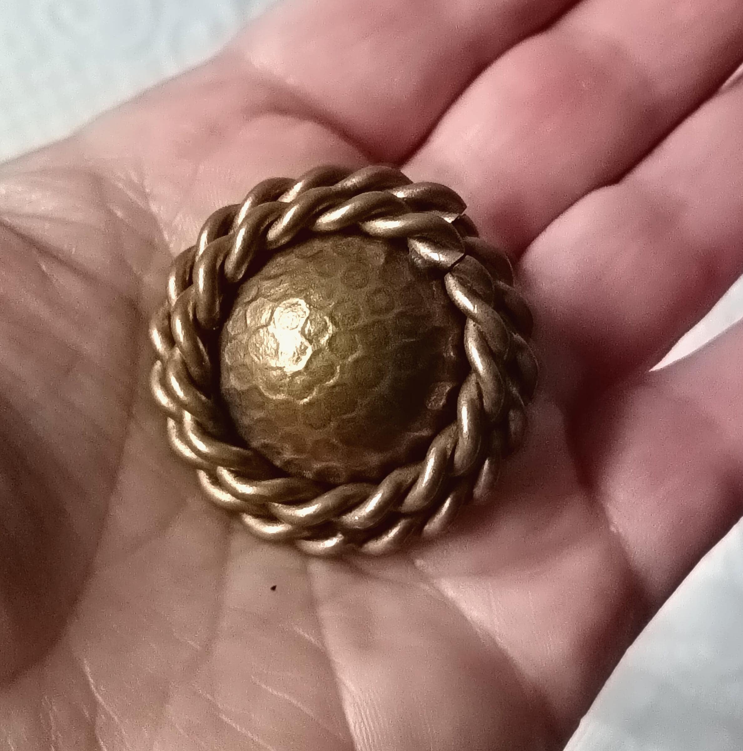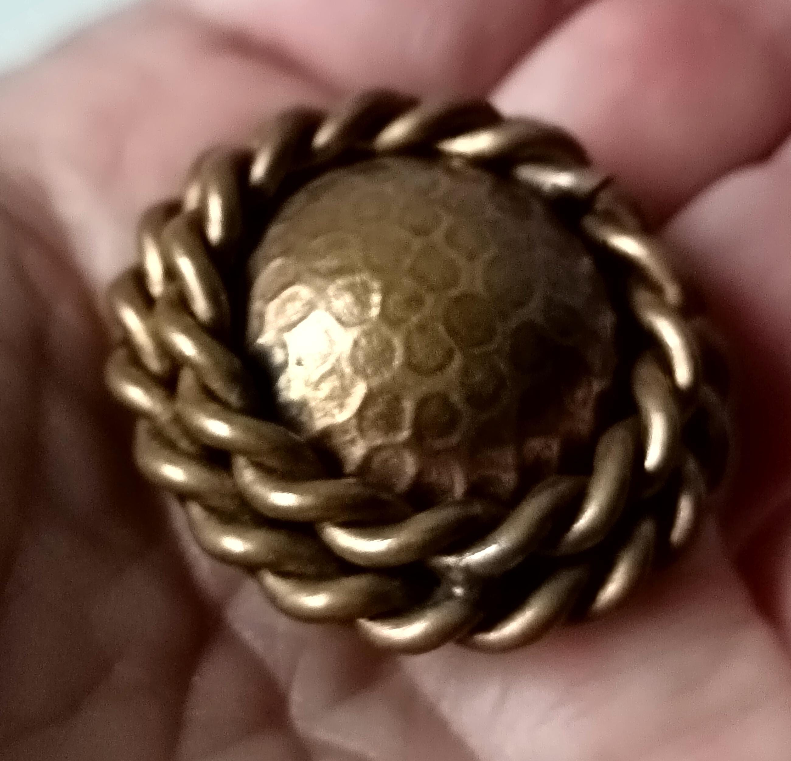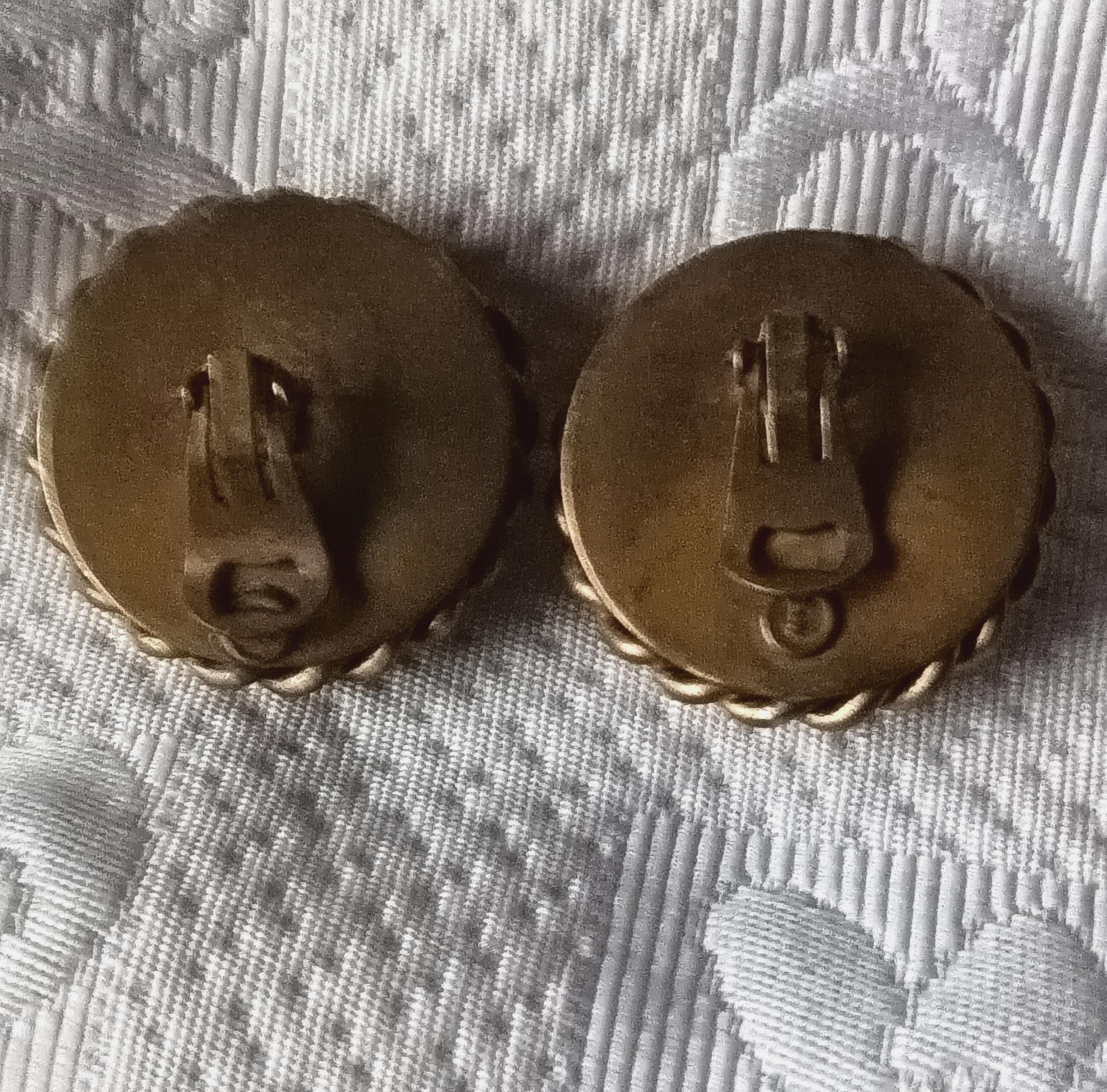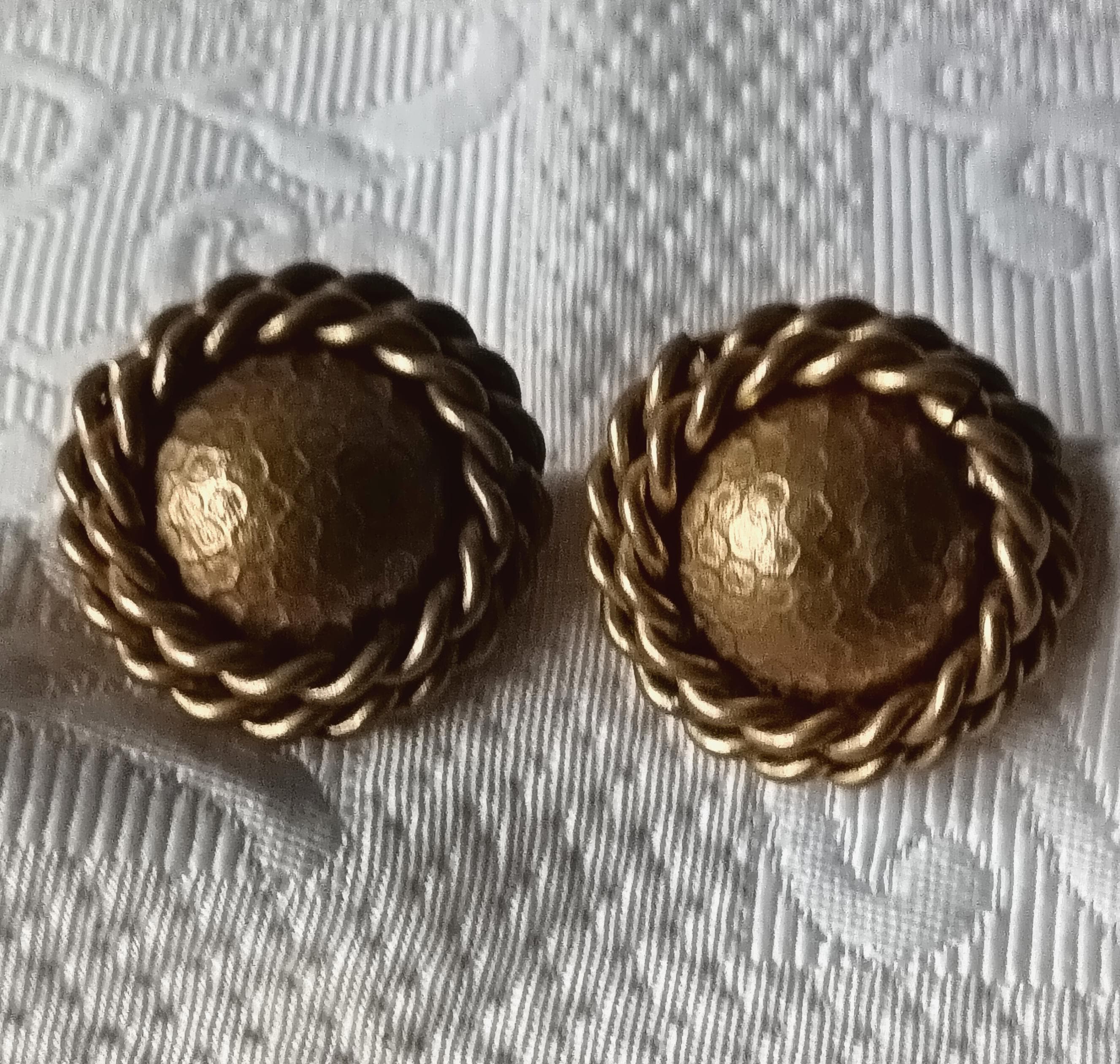 They are made of dark copper metal, round and domed in shape with 2 twisted patterns around the edge.