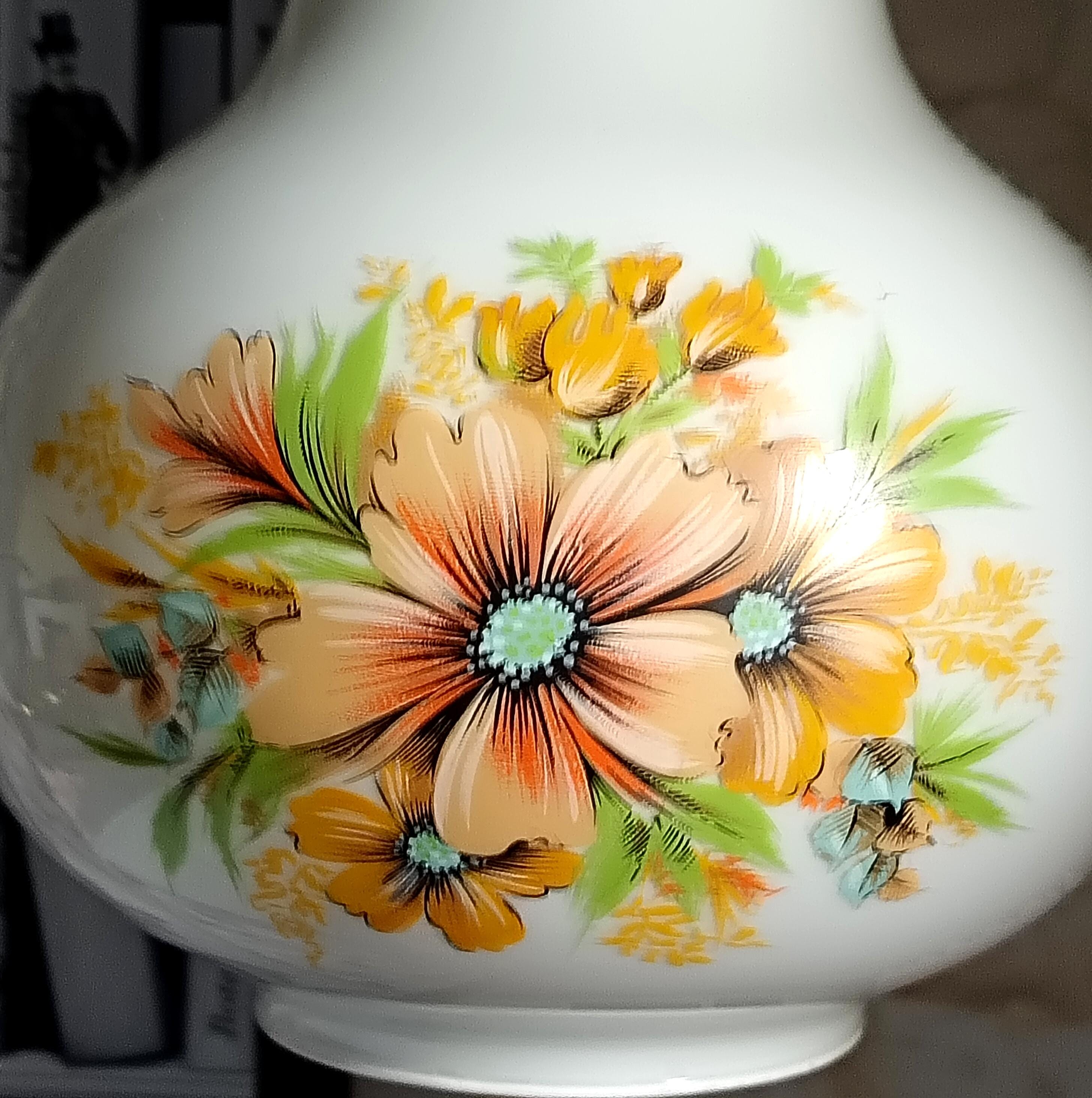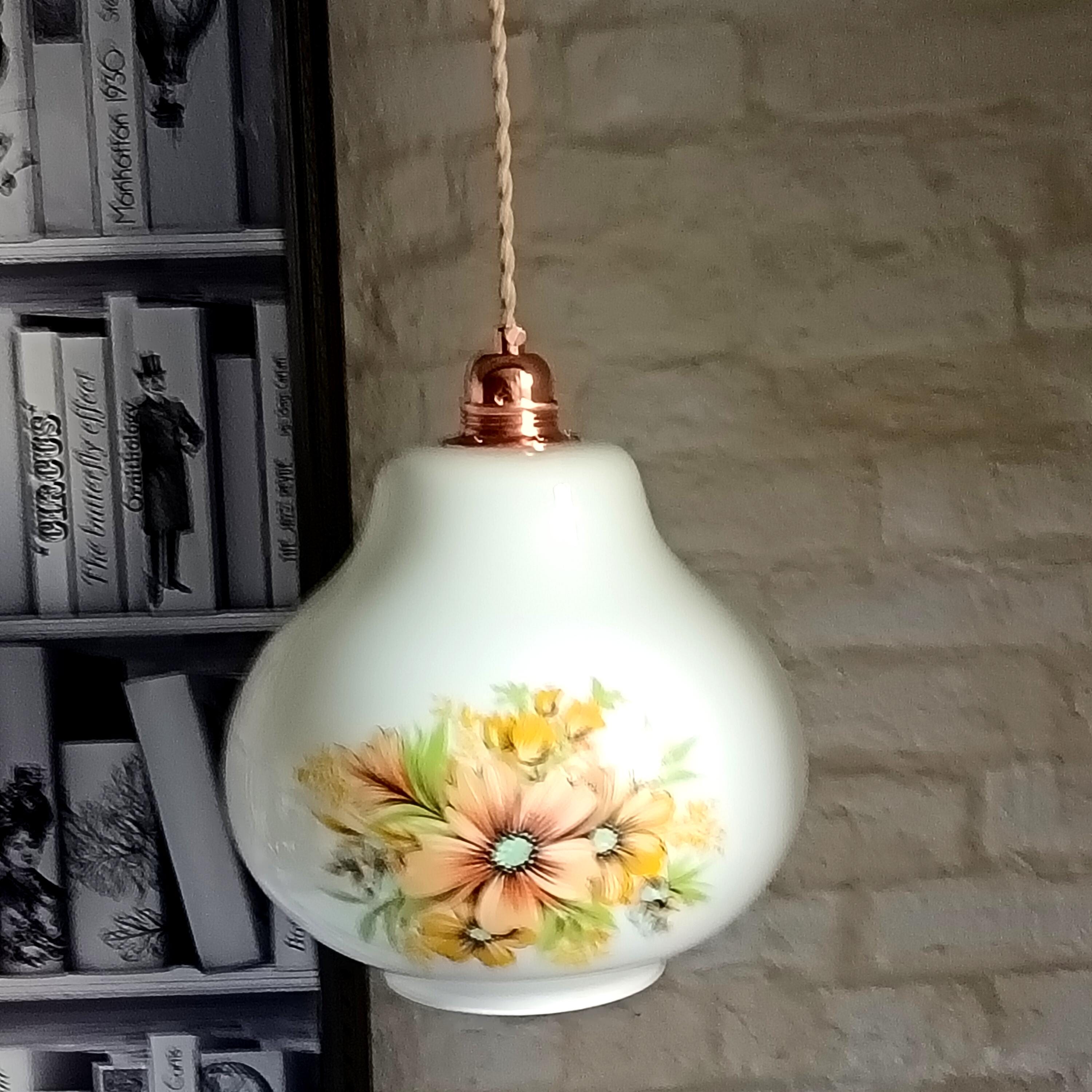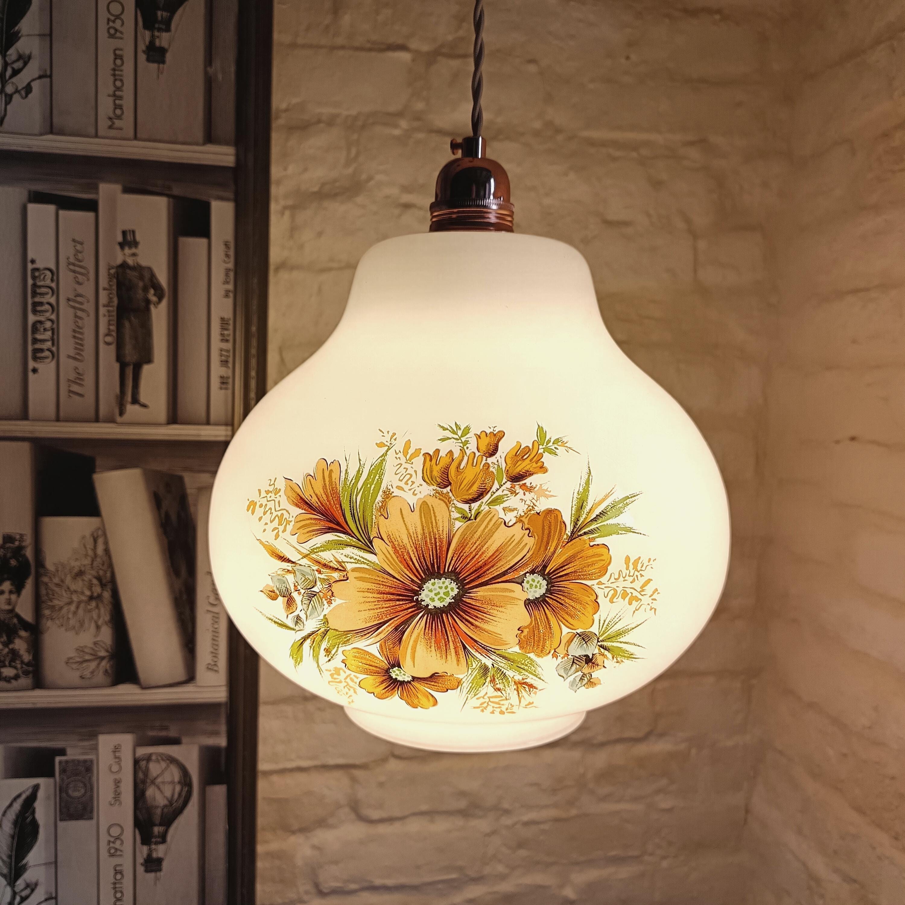 High-quality opaline glass pendant light, pear-shaped with a large floral motif on the front in peach and orange tones, it dates from the 1970s.