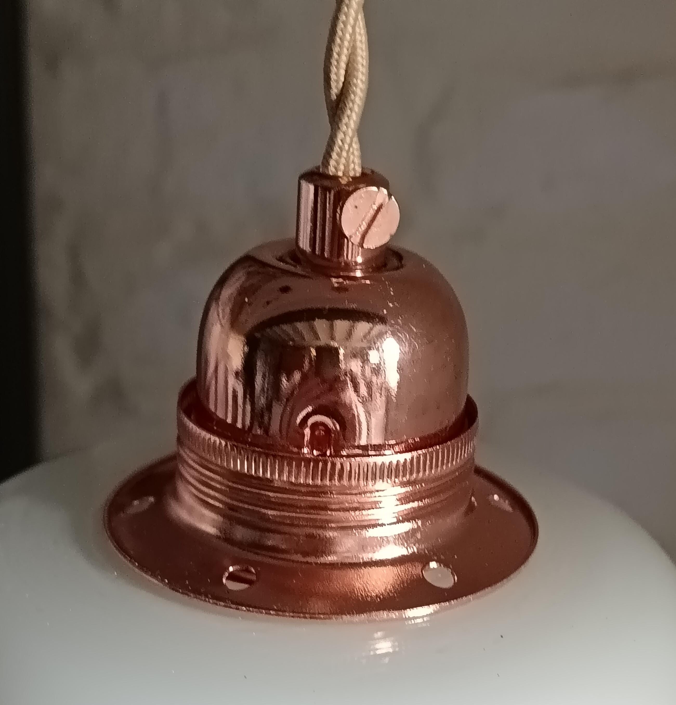 It is newly electrified with a linen-colored textile-covered twisted wire. The ceiling rose is made of rose gold metal, as is the socket (requires an e27 screw-in bulb, not supplied).