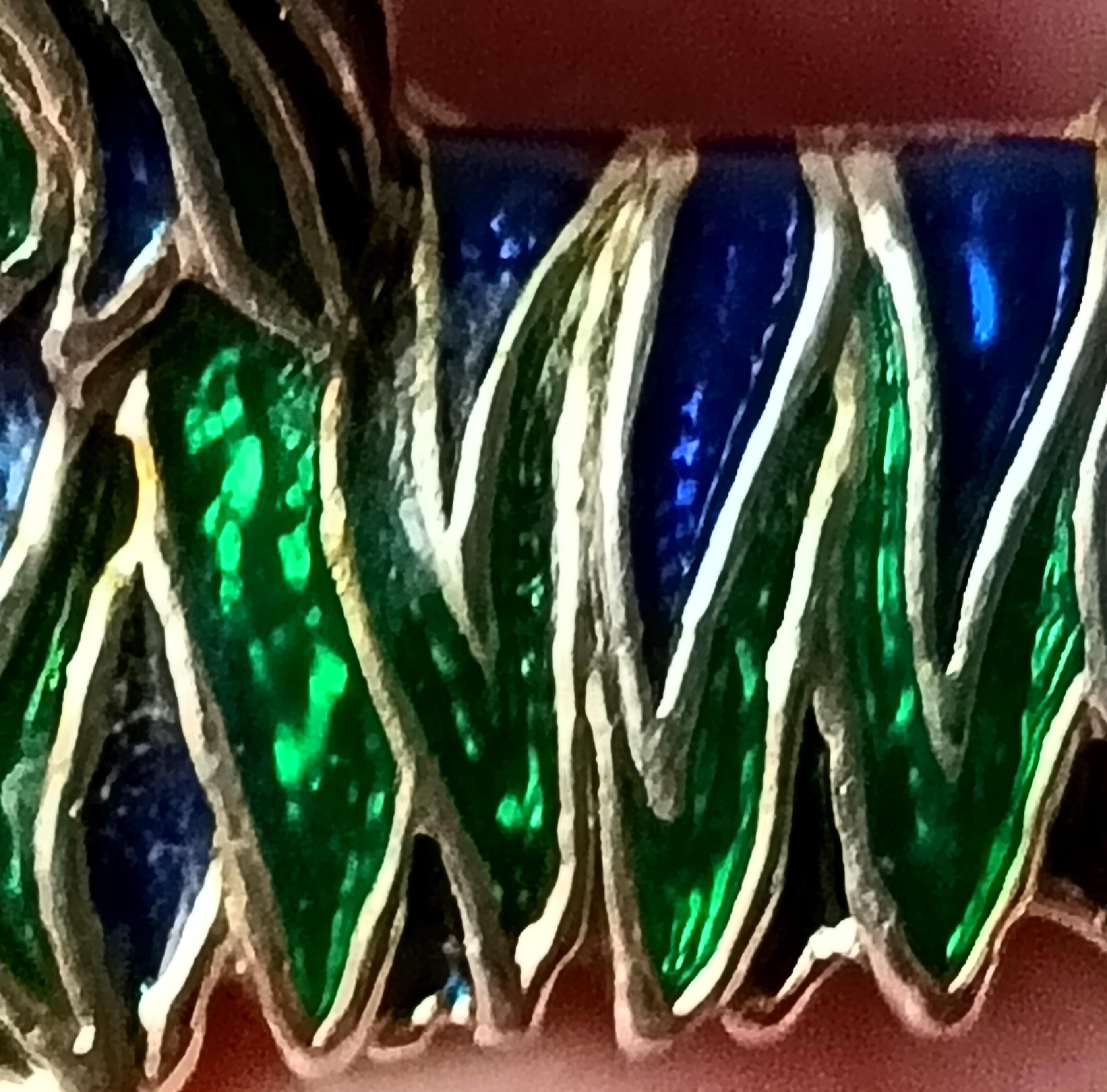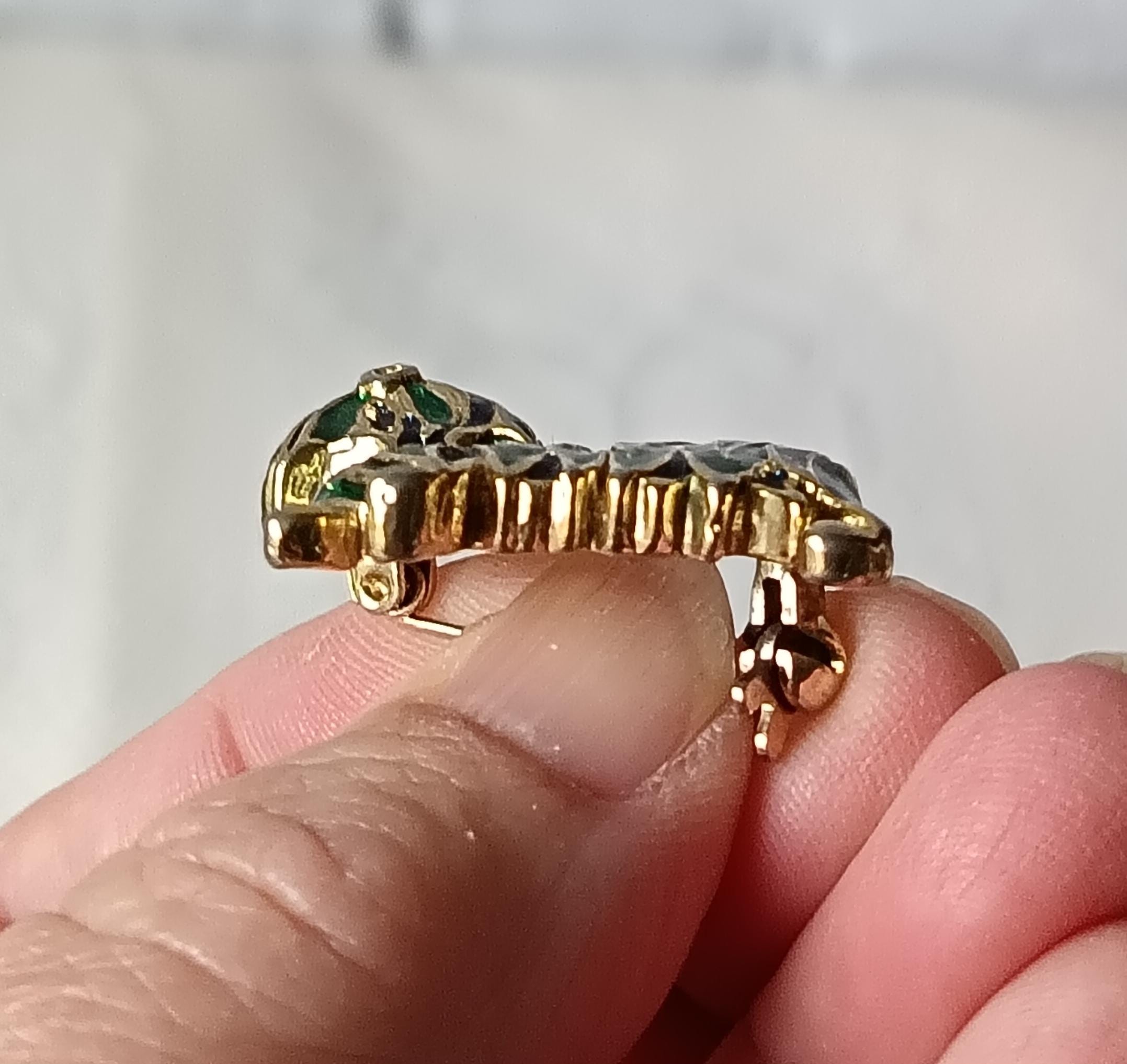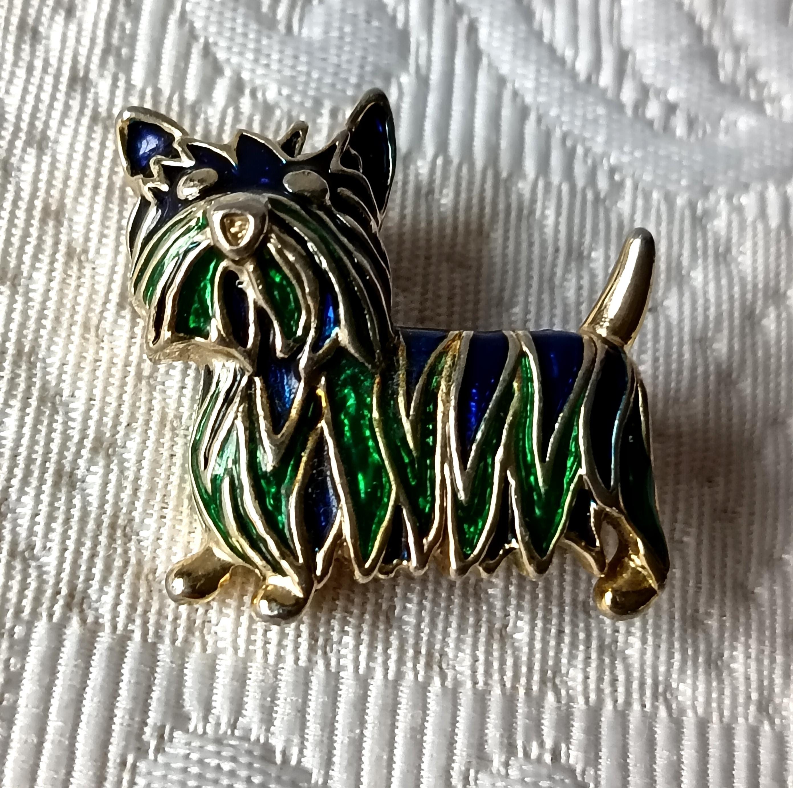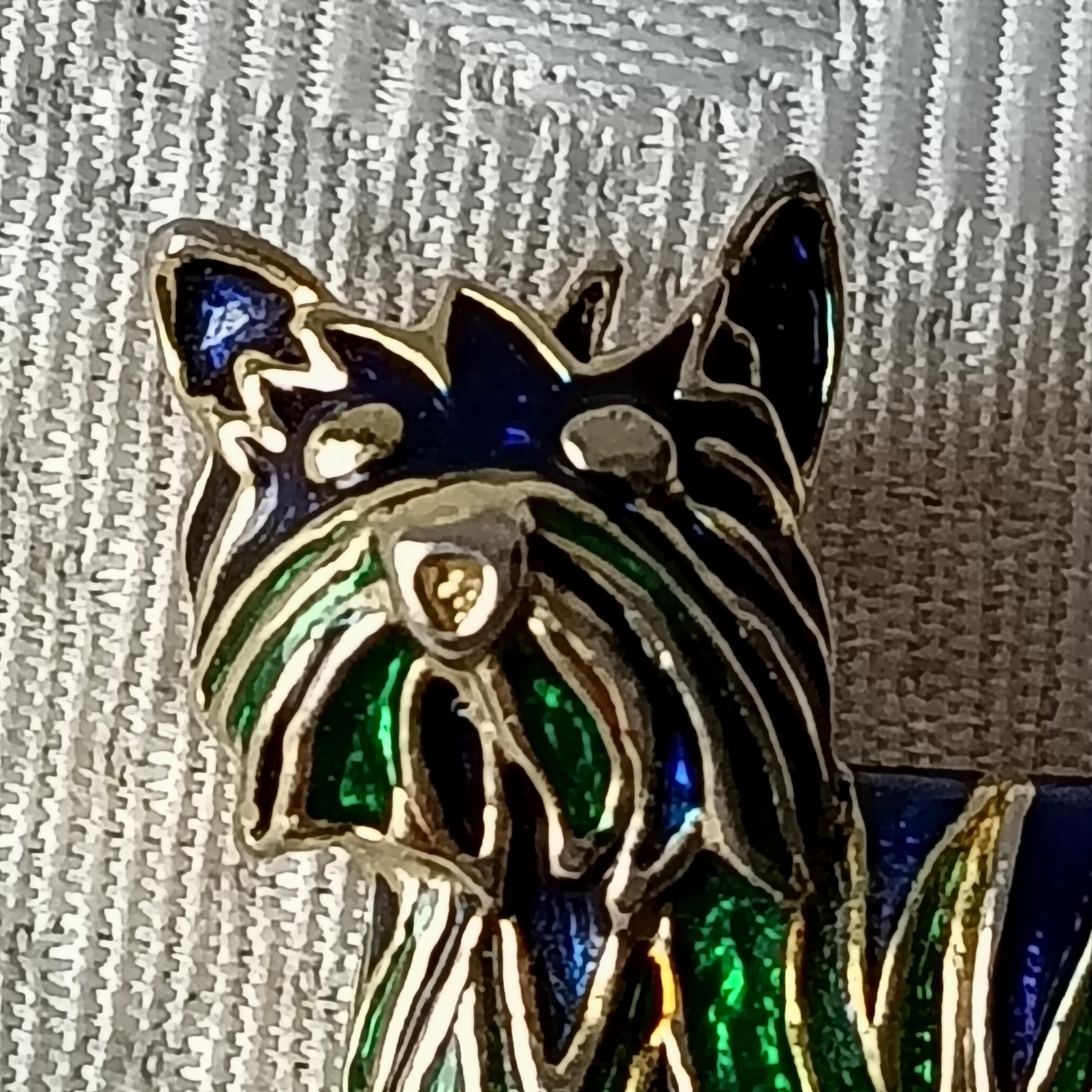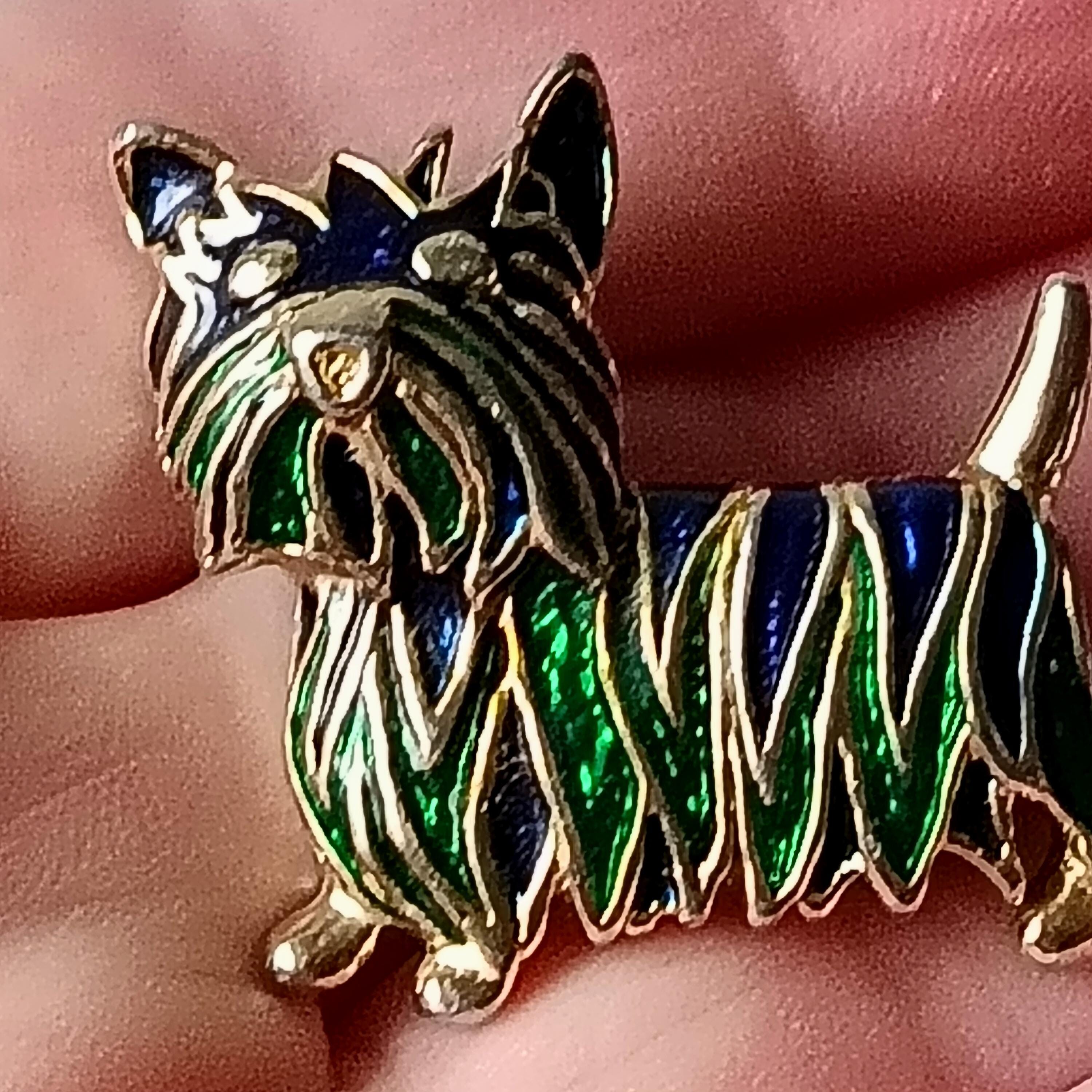 It is made of gold-plated metal, the little Westie-style dog has its fur made of green and blue resin.