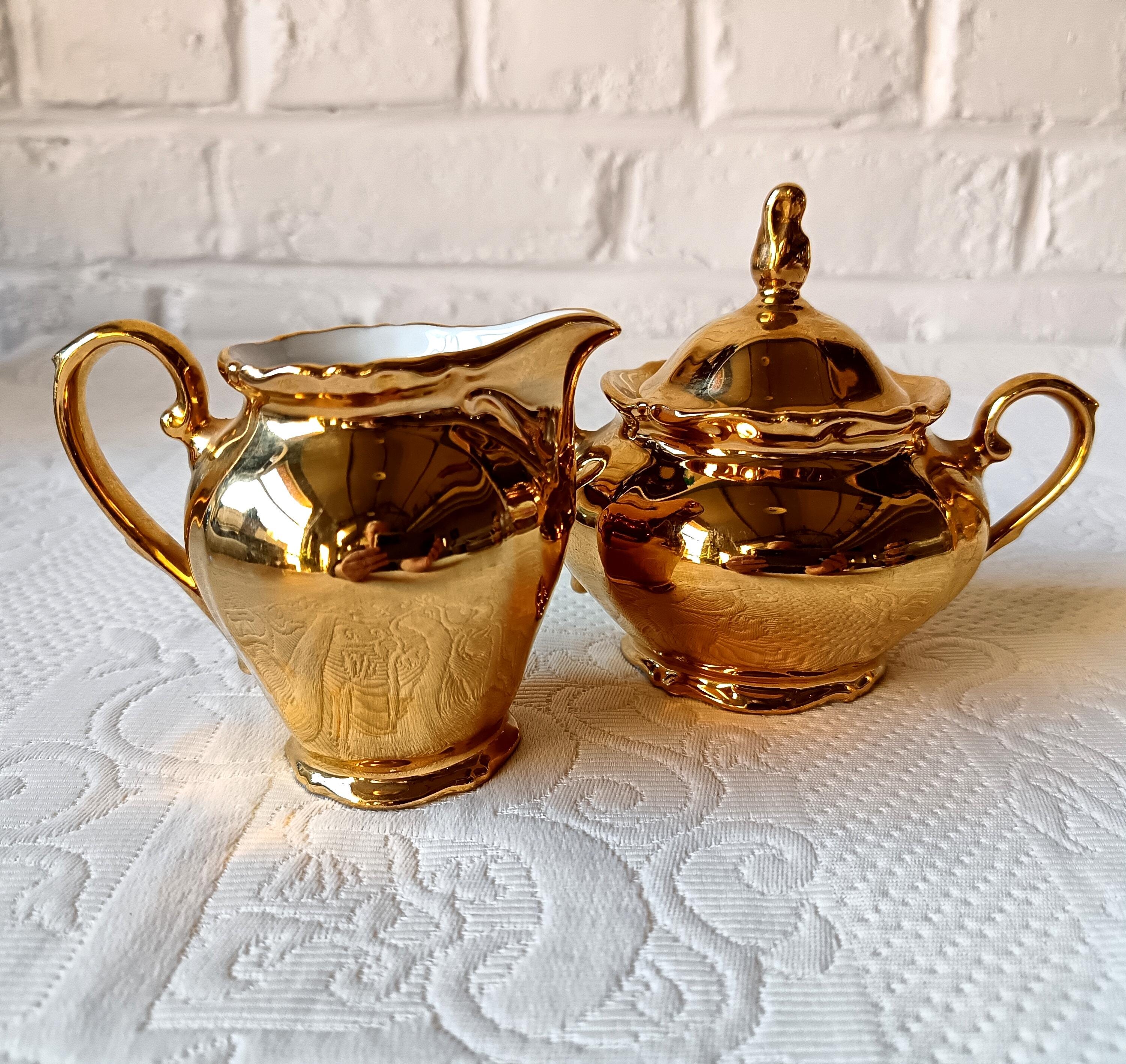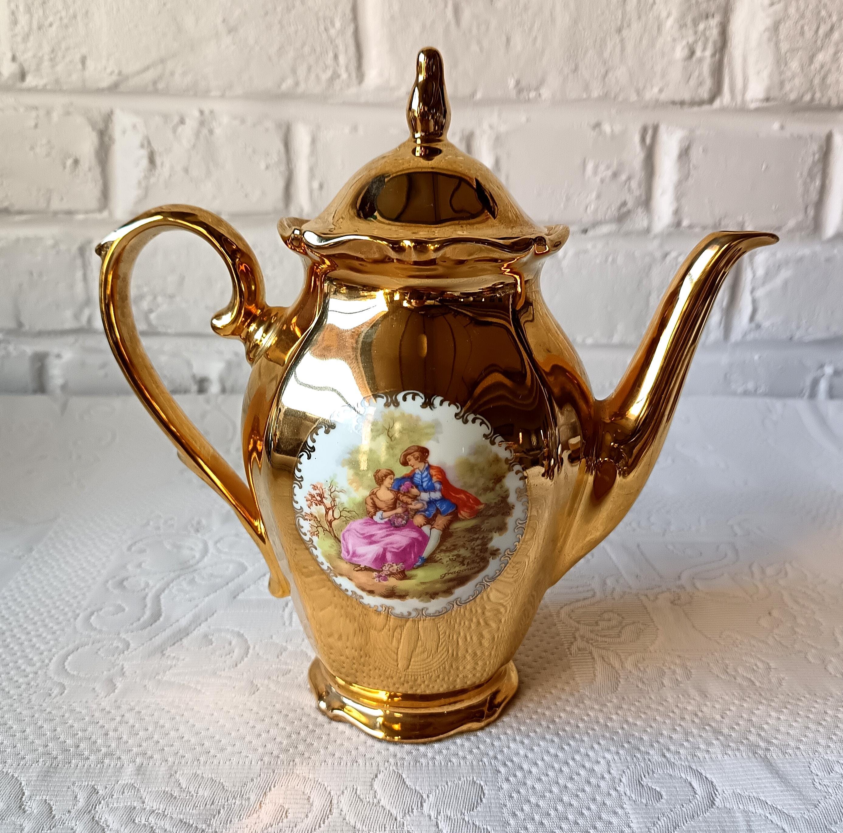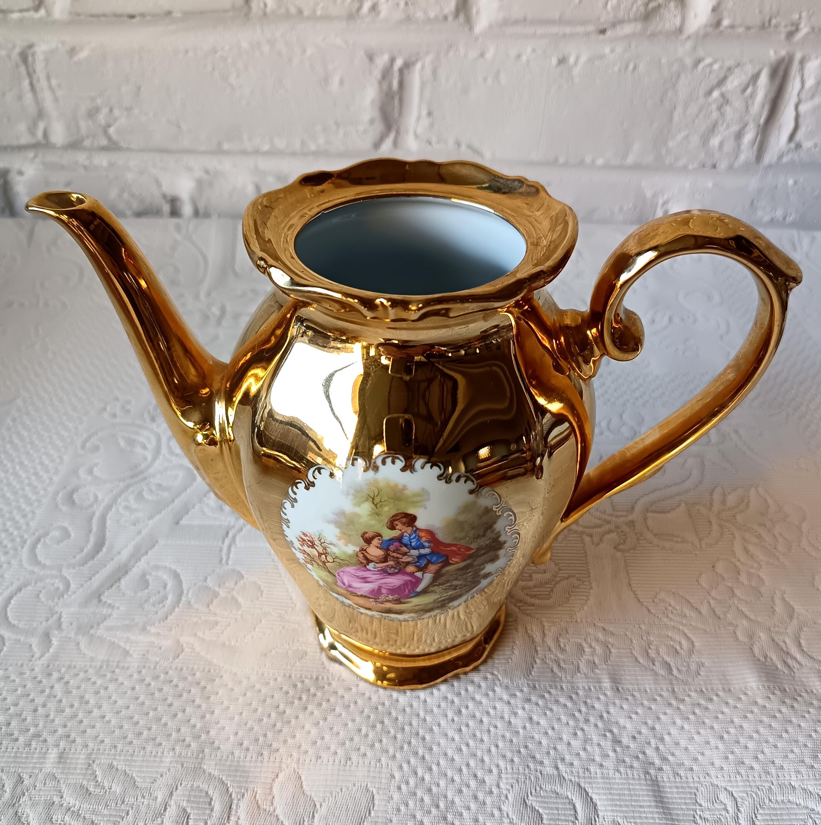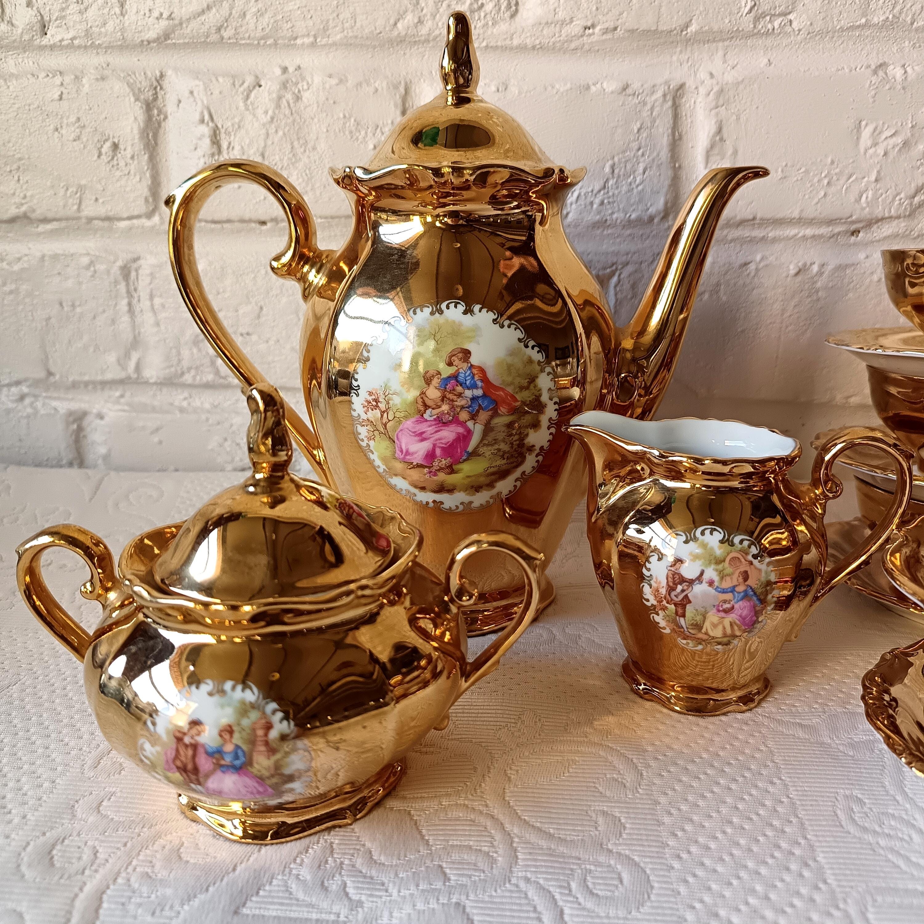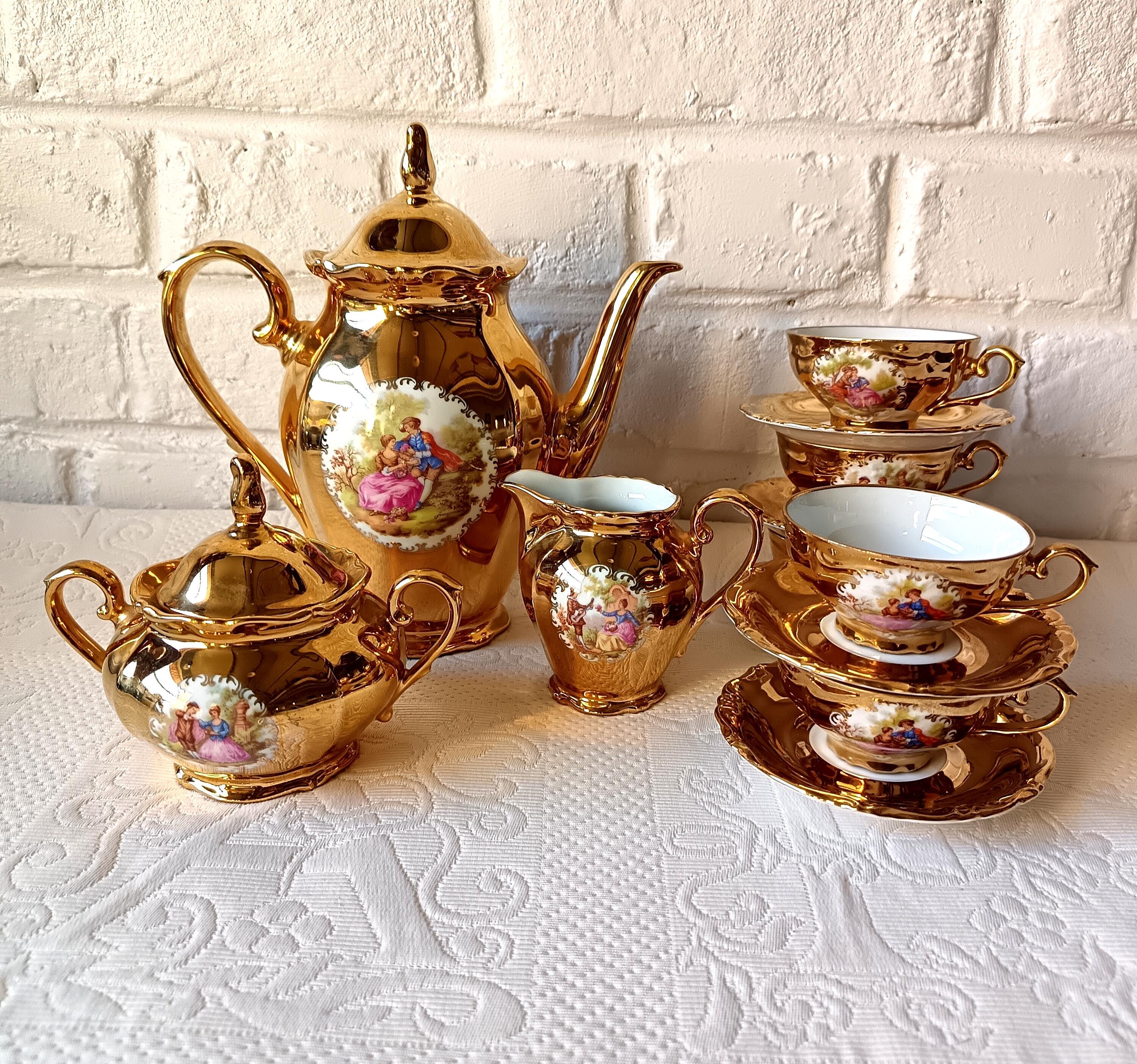 Magnificent coffee set consisting of a creamer, a sugar bowl, a coffee pot, 5 cups and saucers, fine German porcelain, gilded.
