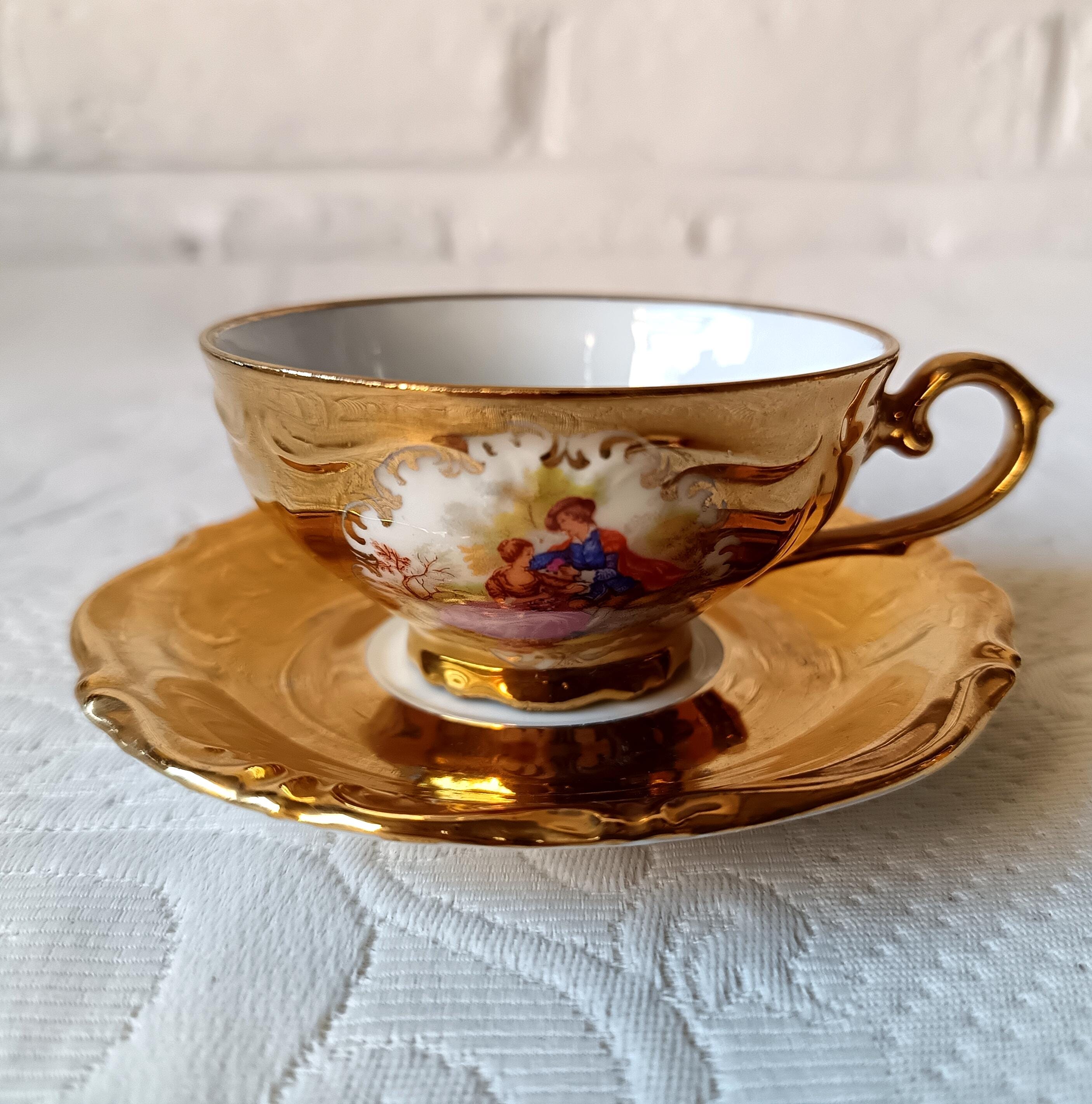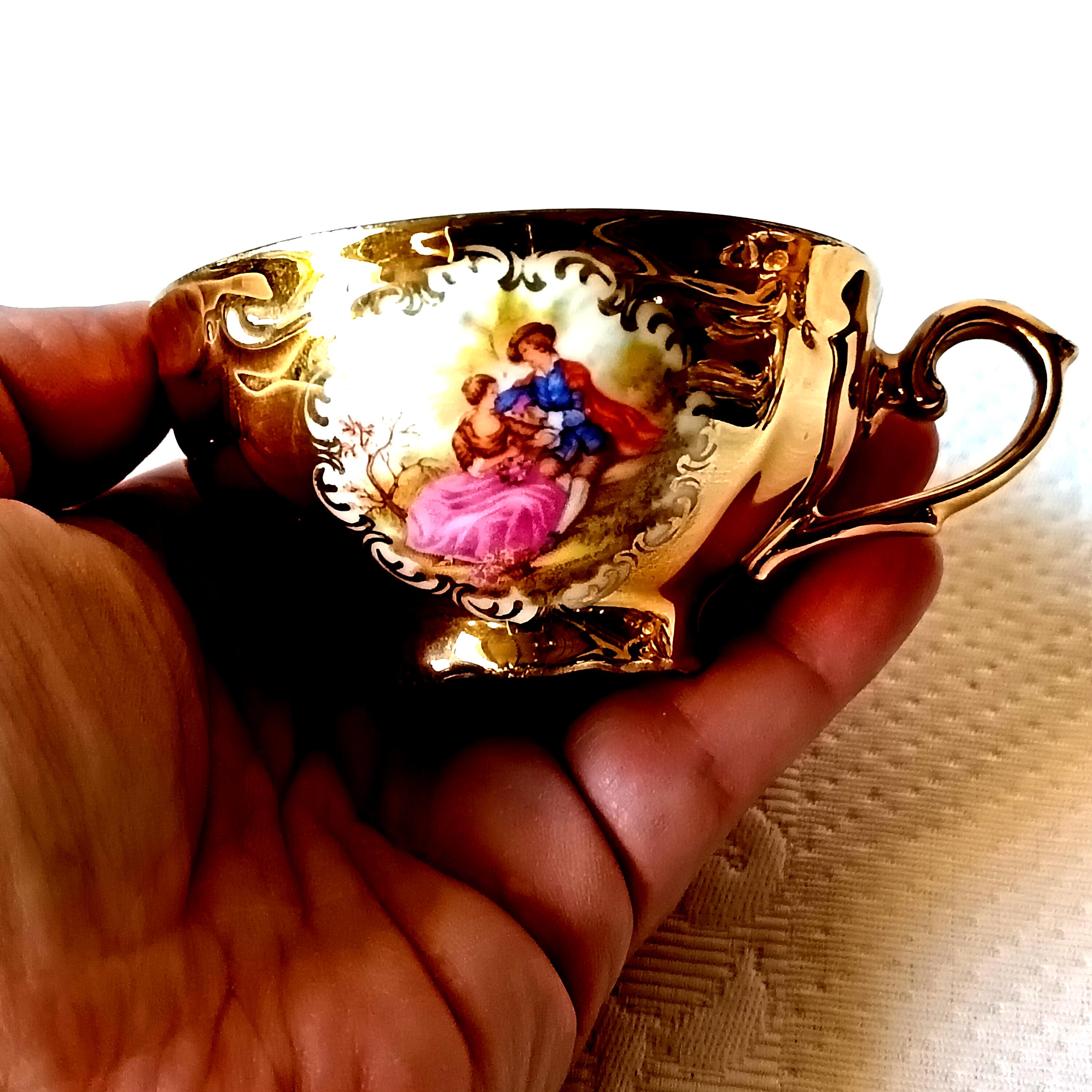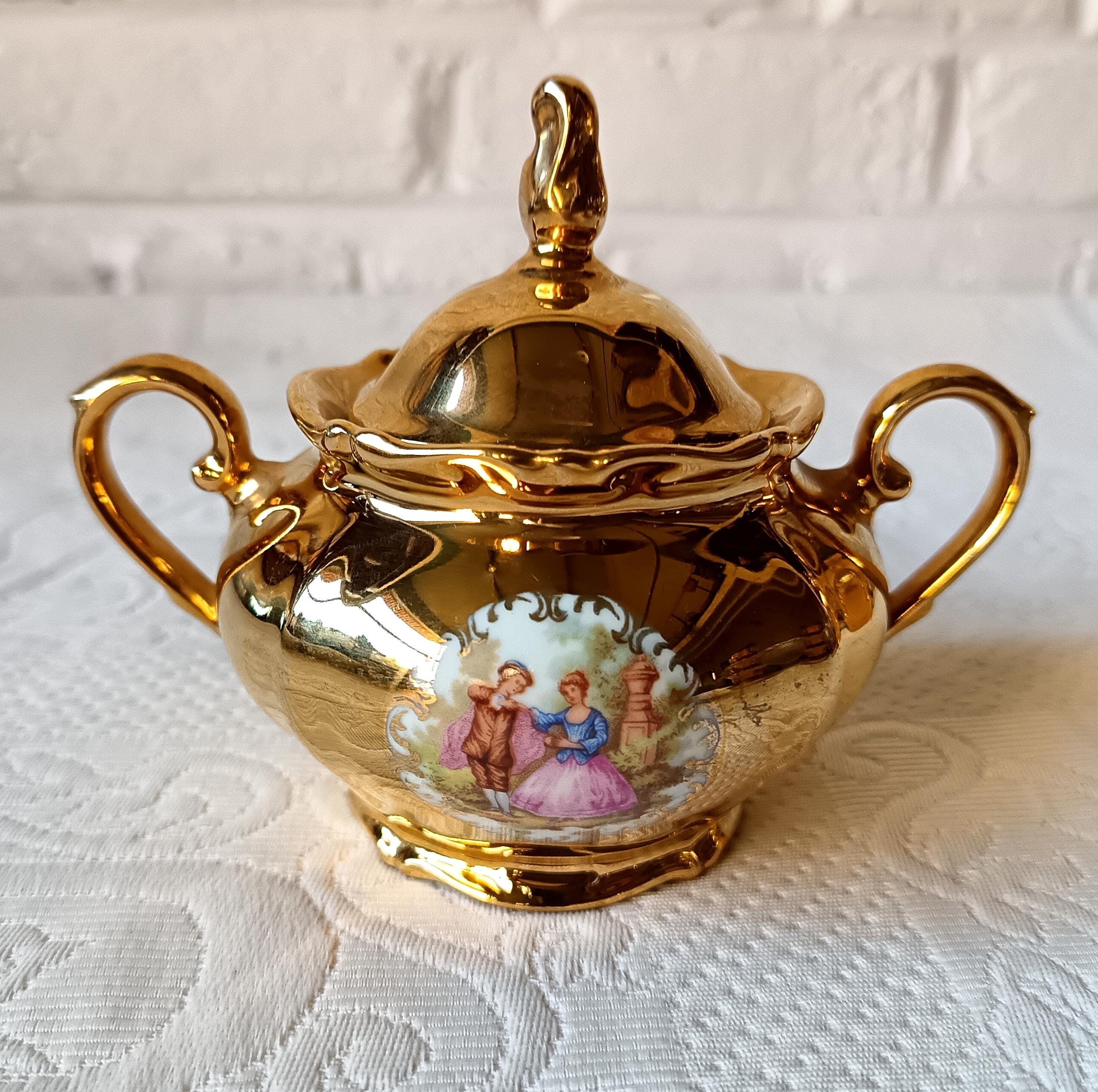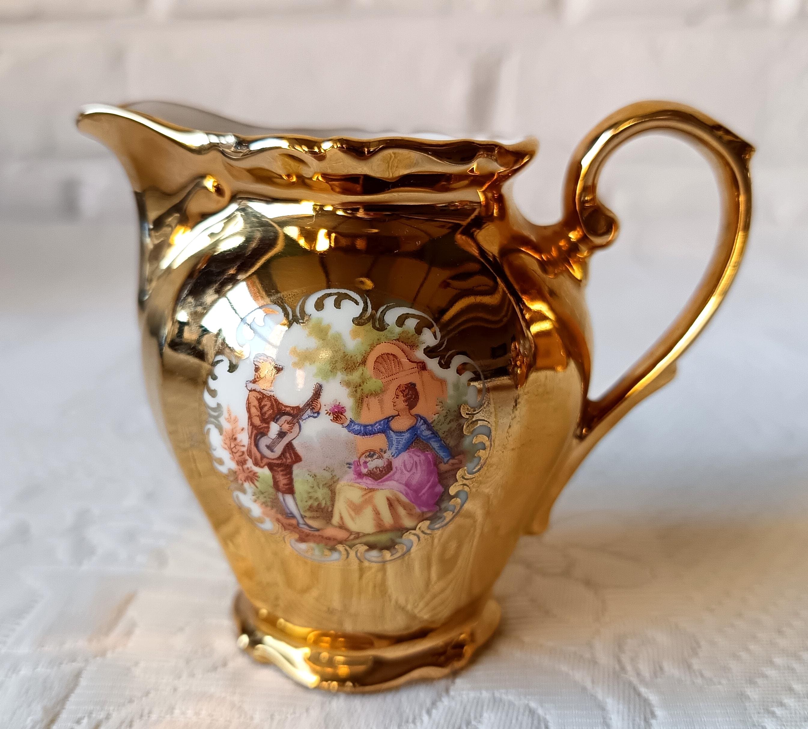 All the pieces are gilded, with decorations on the front of ancient gallant scenes, 3 different scenes.