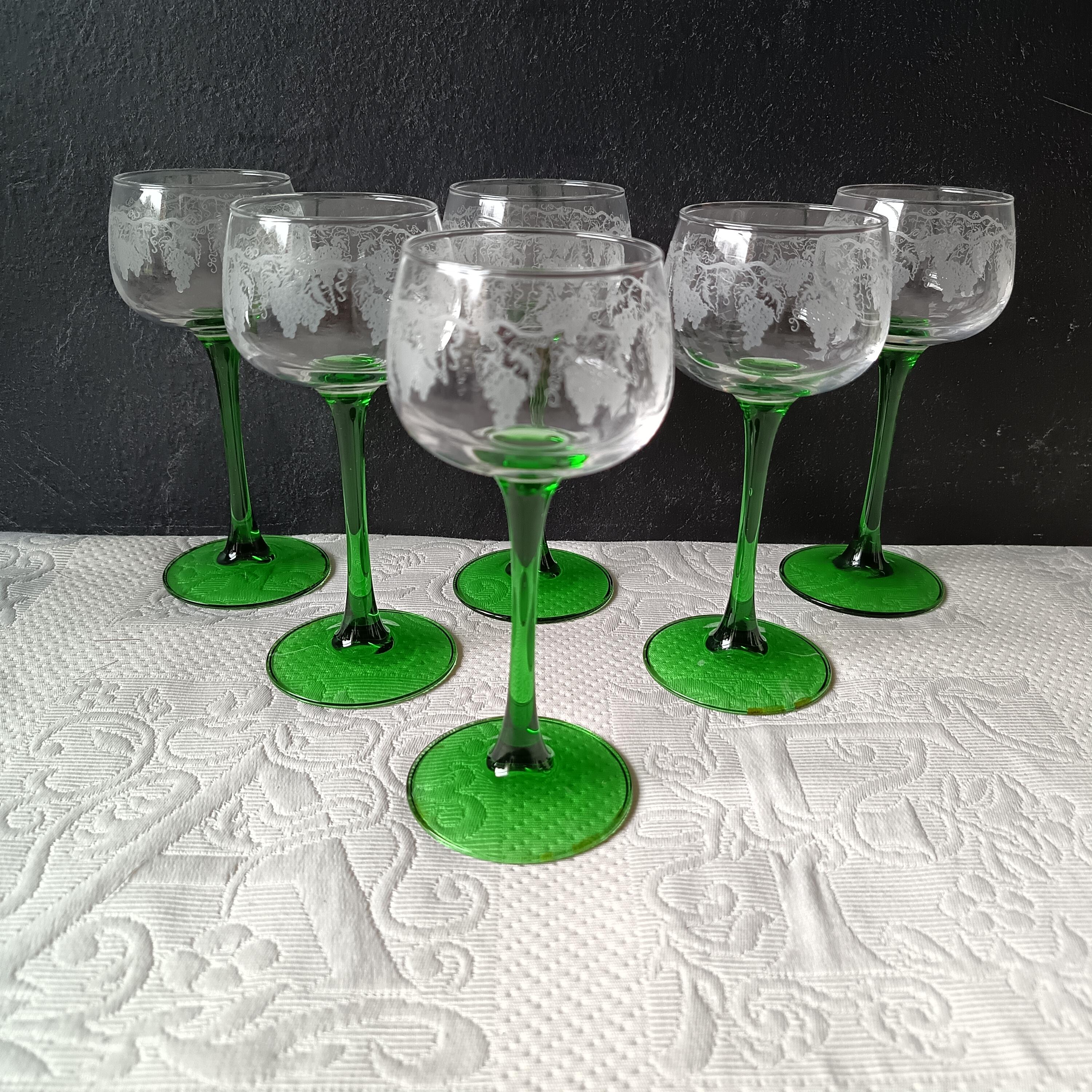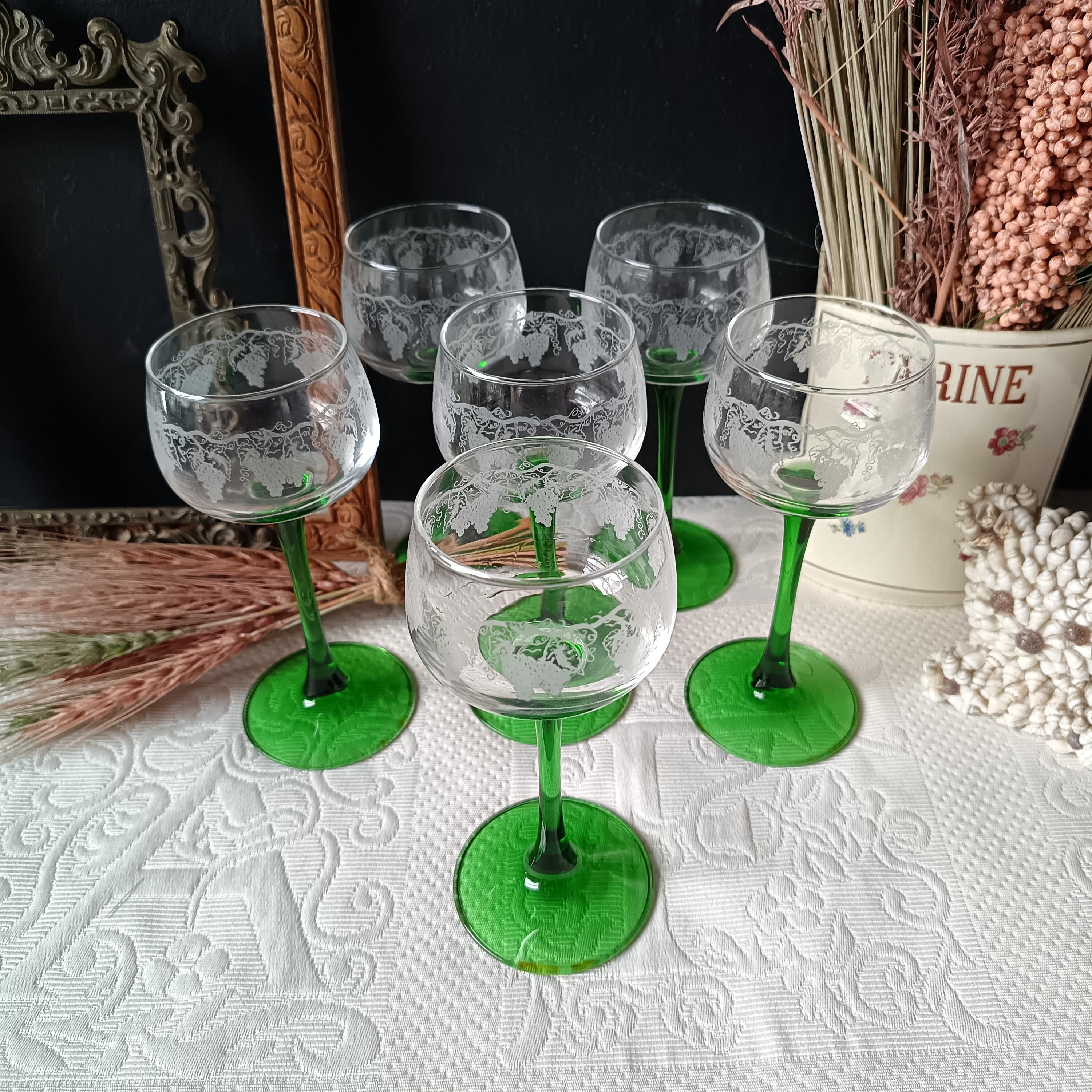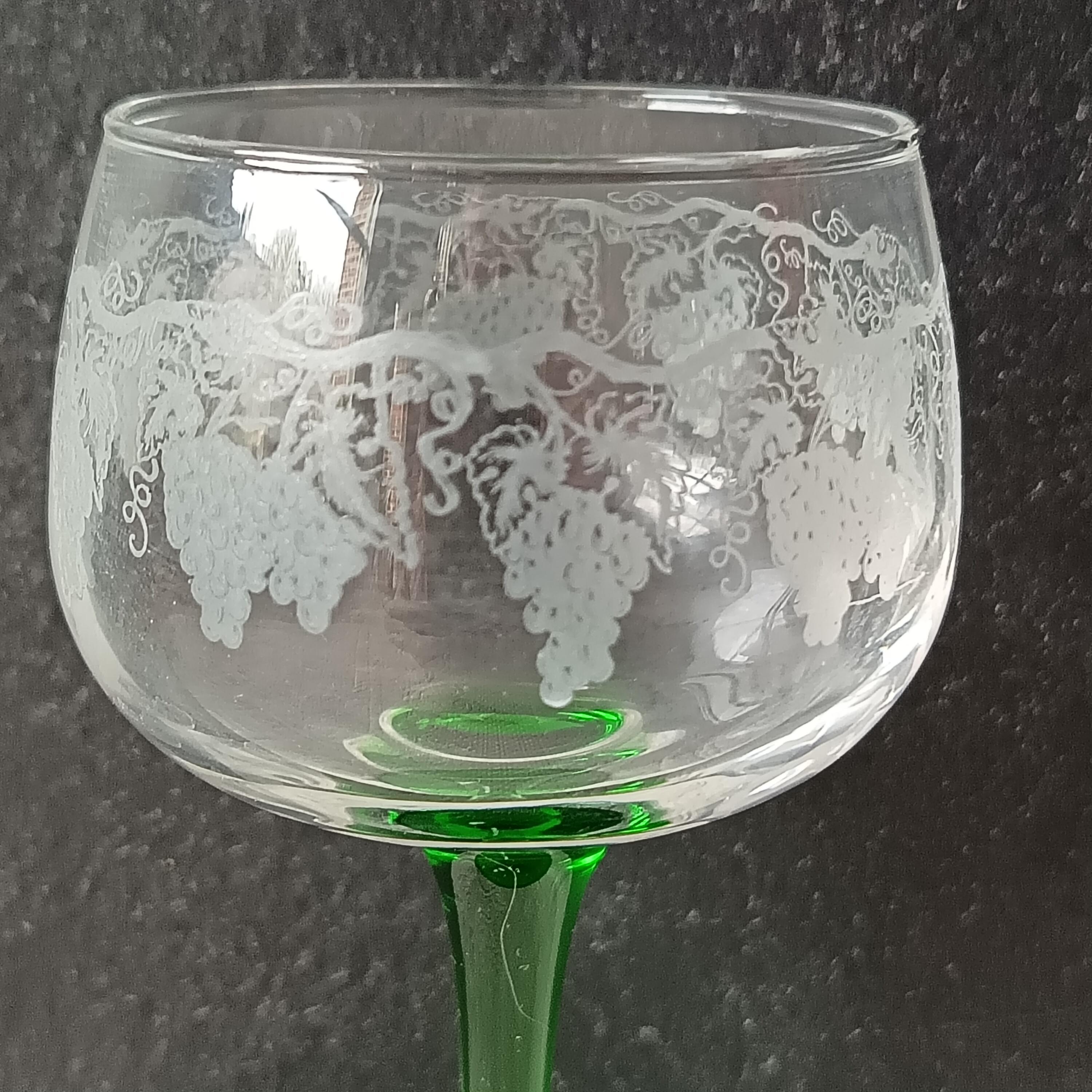 6 pretty stemmed glasses in a beautiful emerald green with a frieze engraved on the chalice.