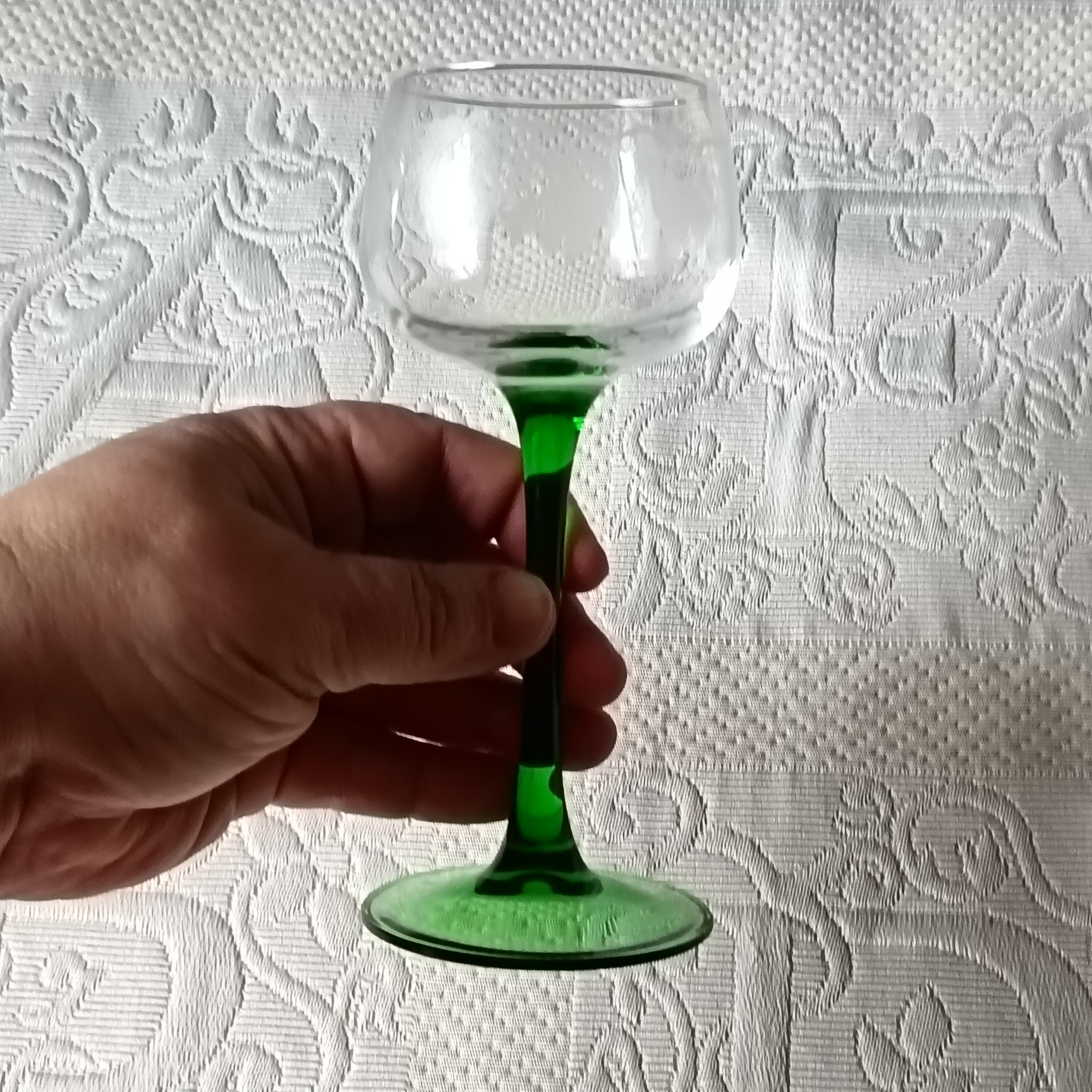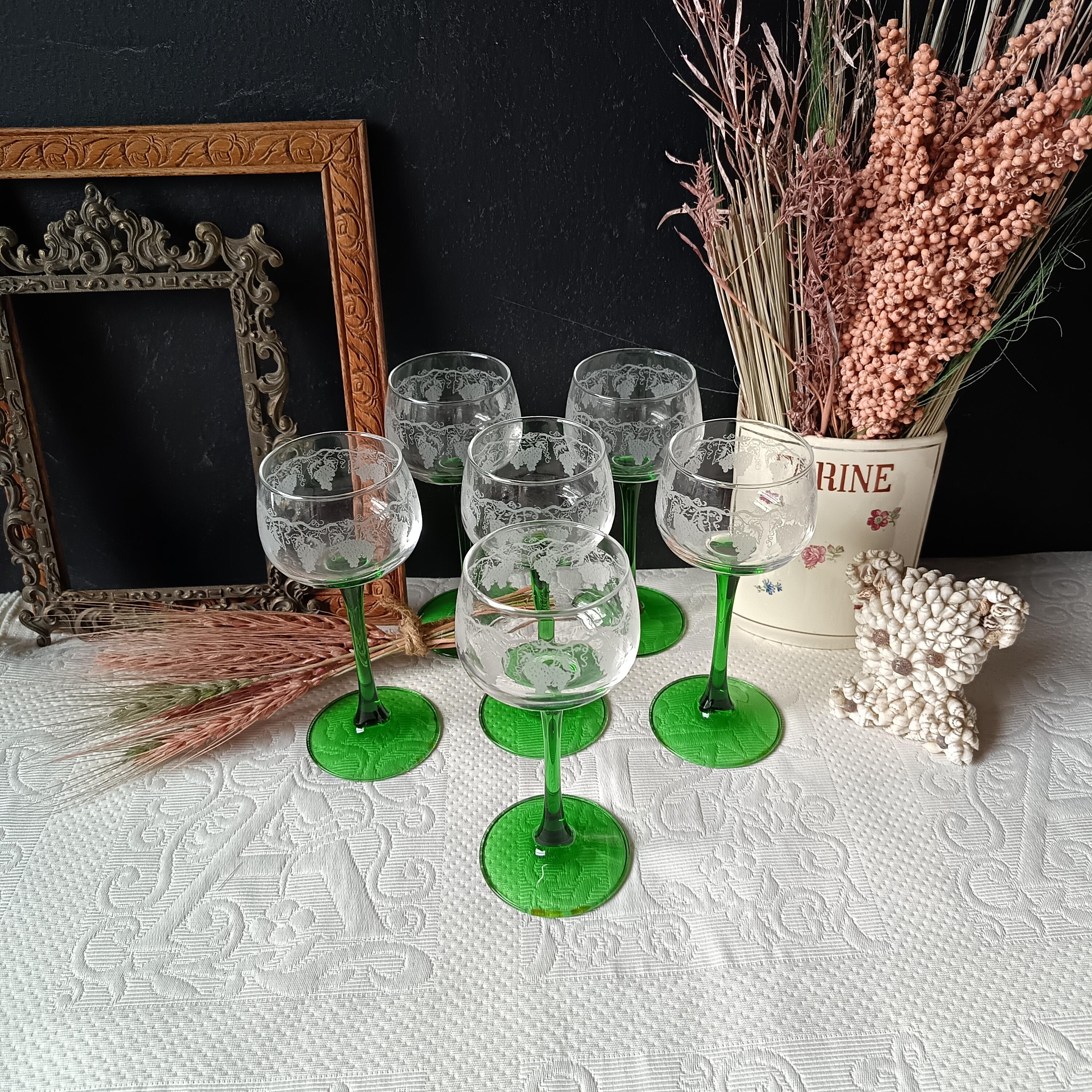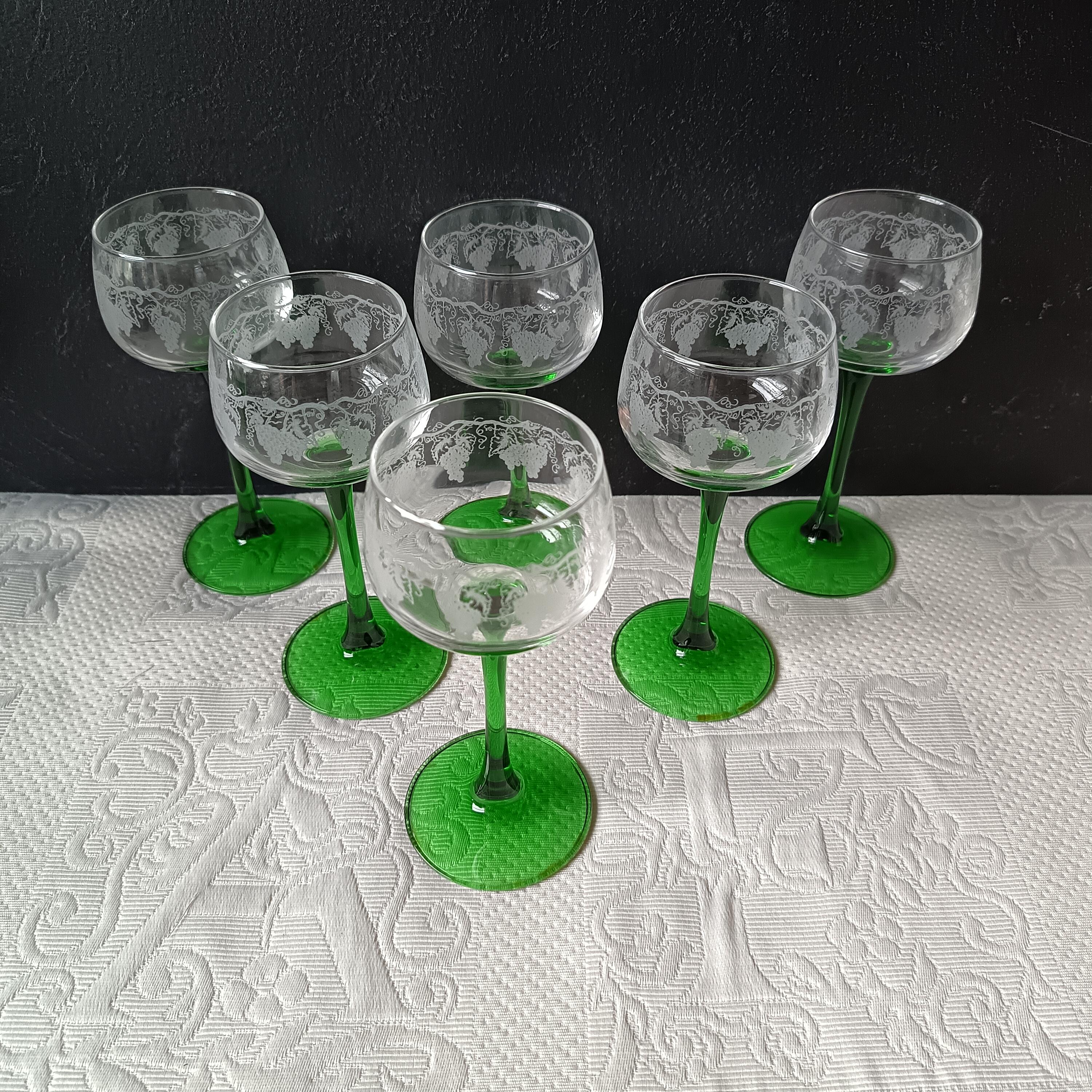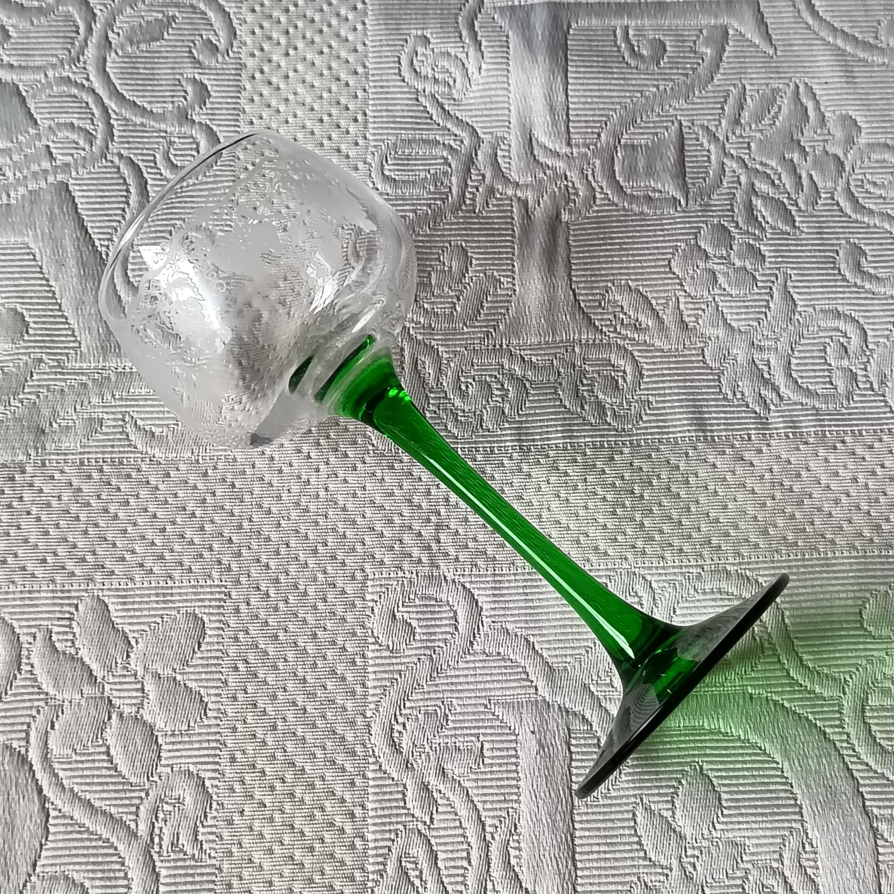 6 pretty stemmed glasses in a beautiful emerald green with a frieze engraved on the chalice.