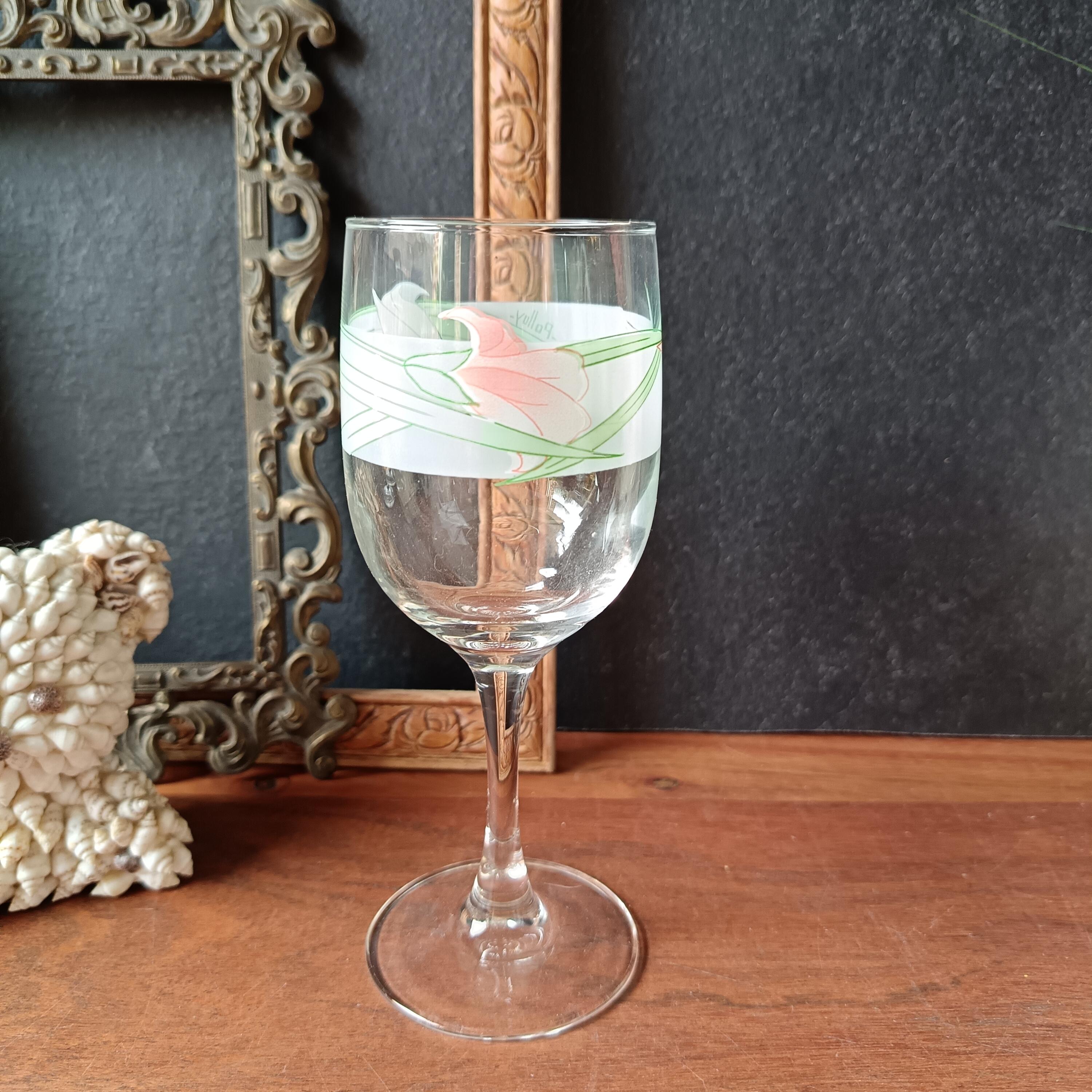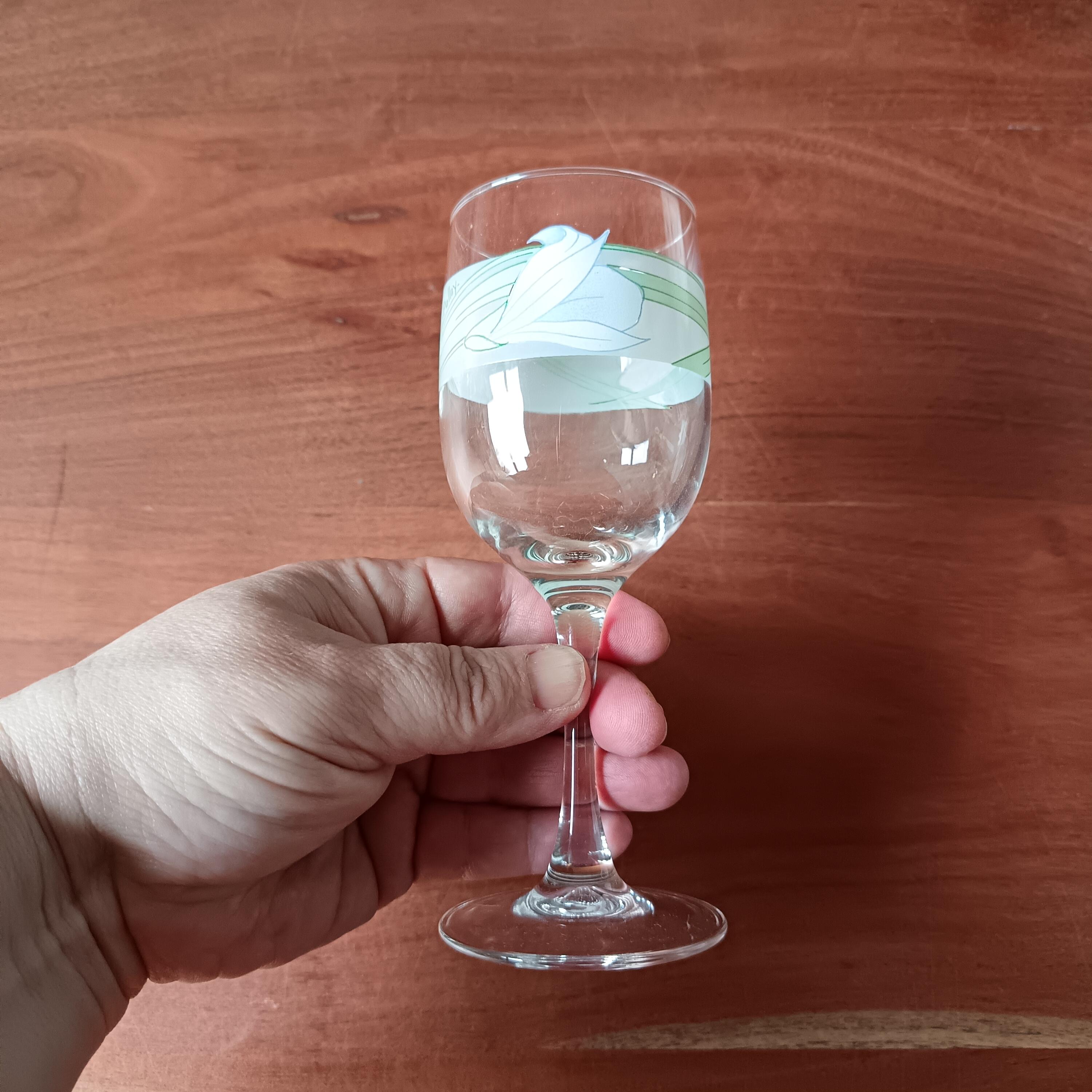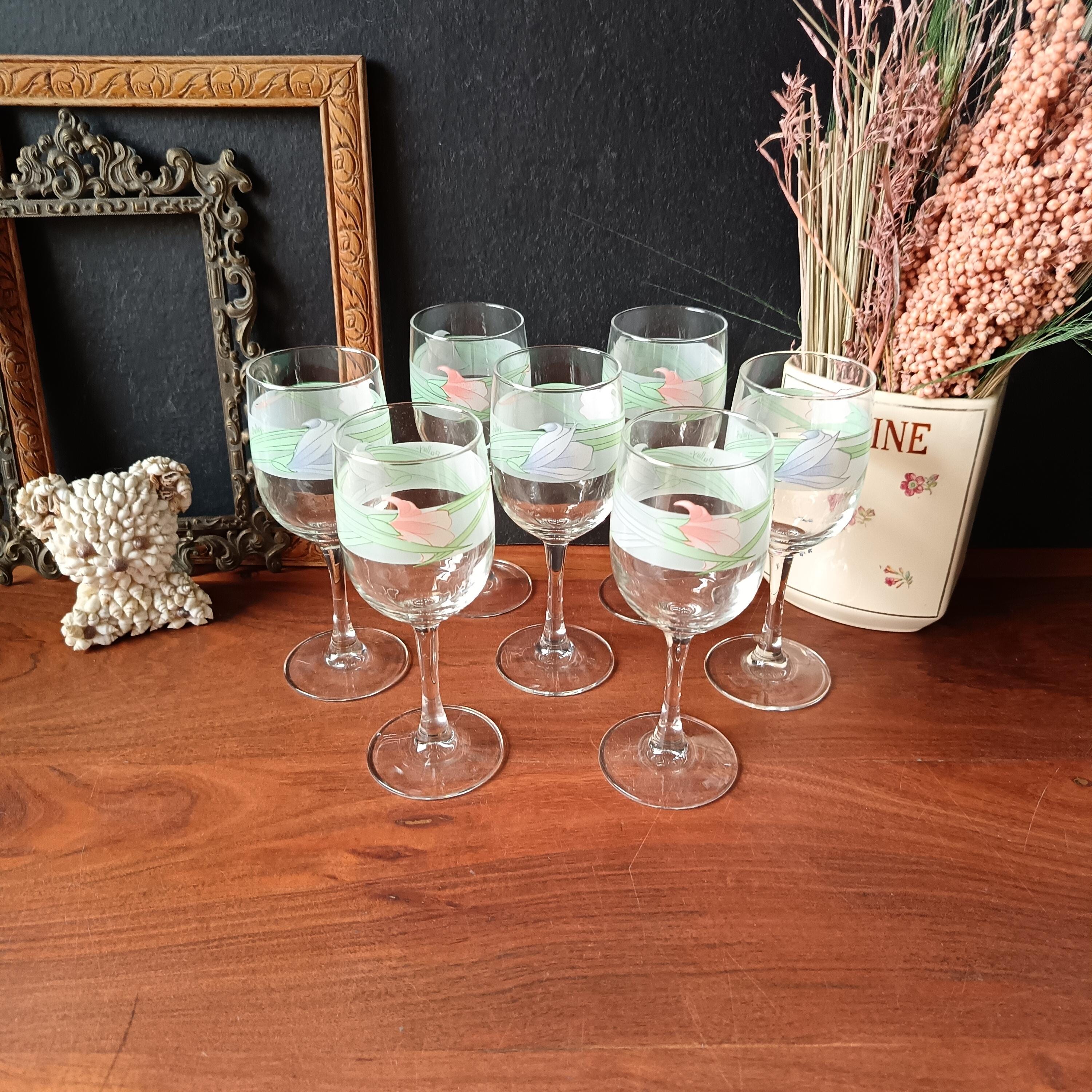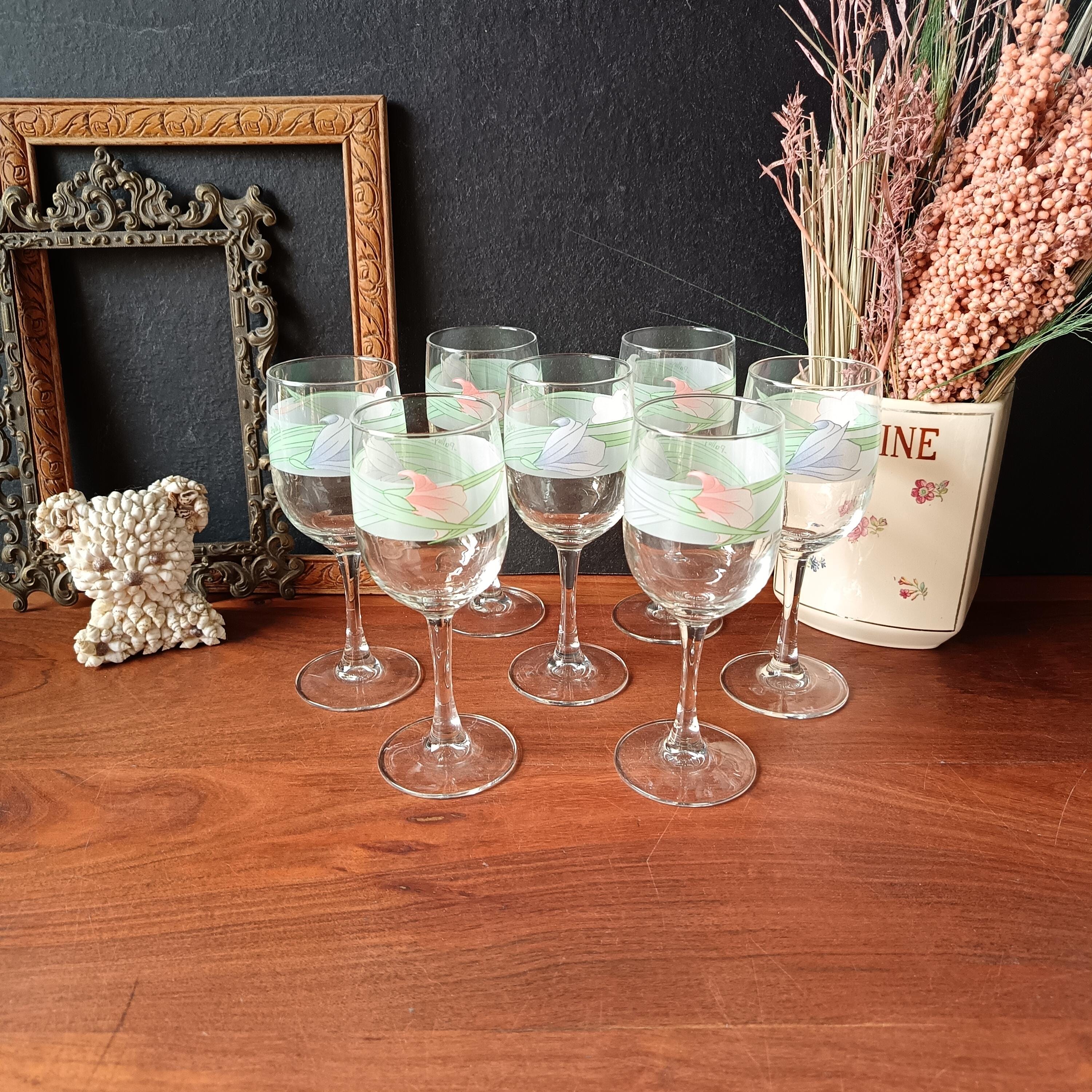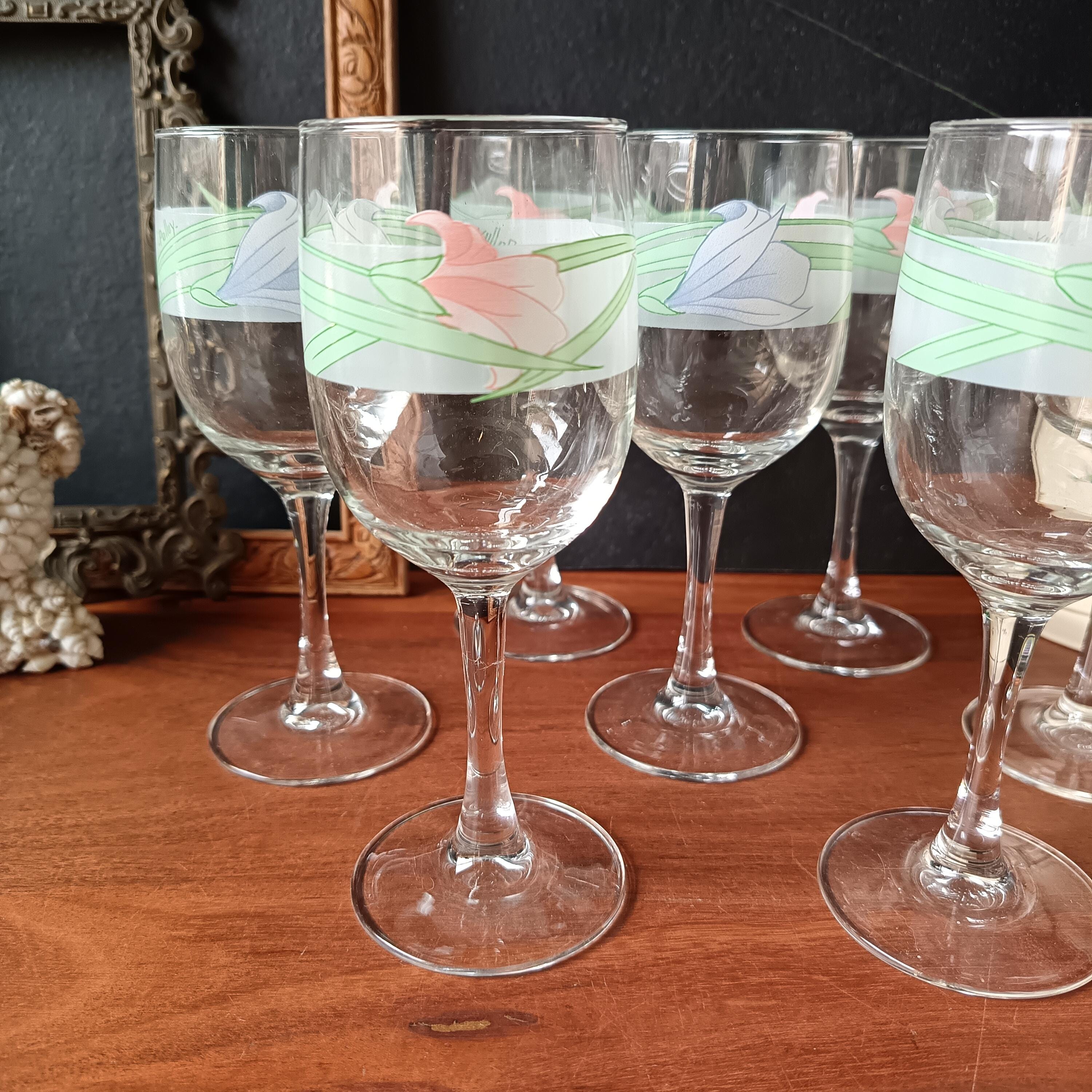 A beautiful set of 7 stemmed glasses with a lovely floral pattern. They are charming with their soft floral colors.