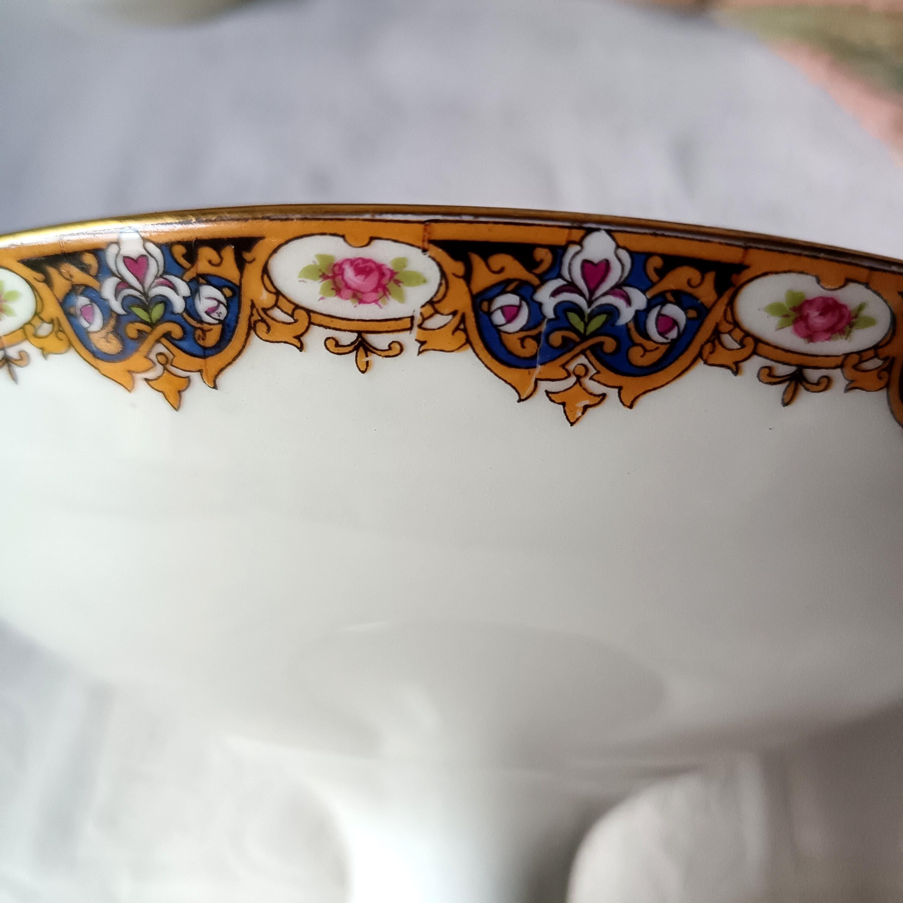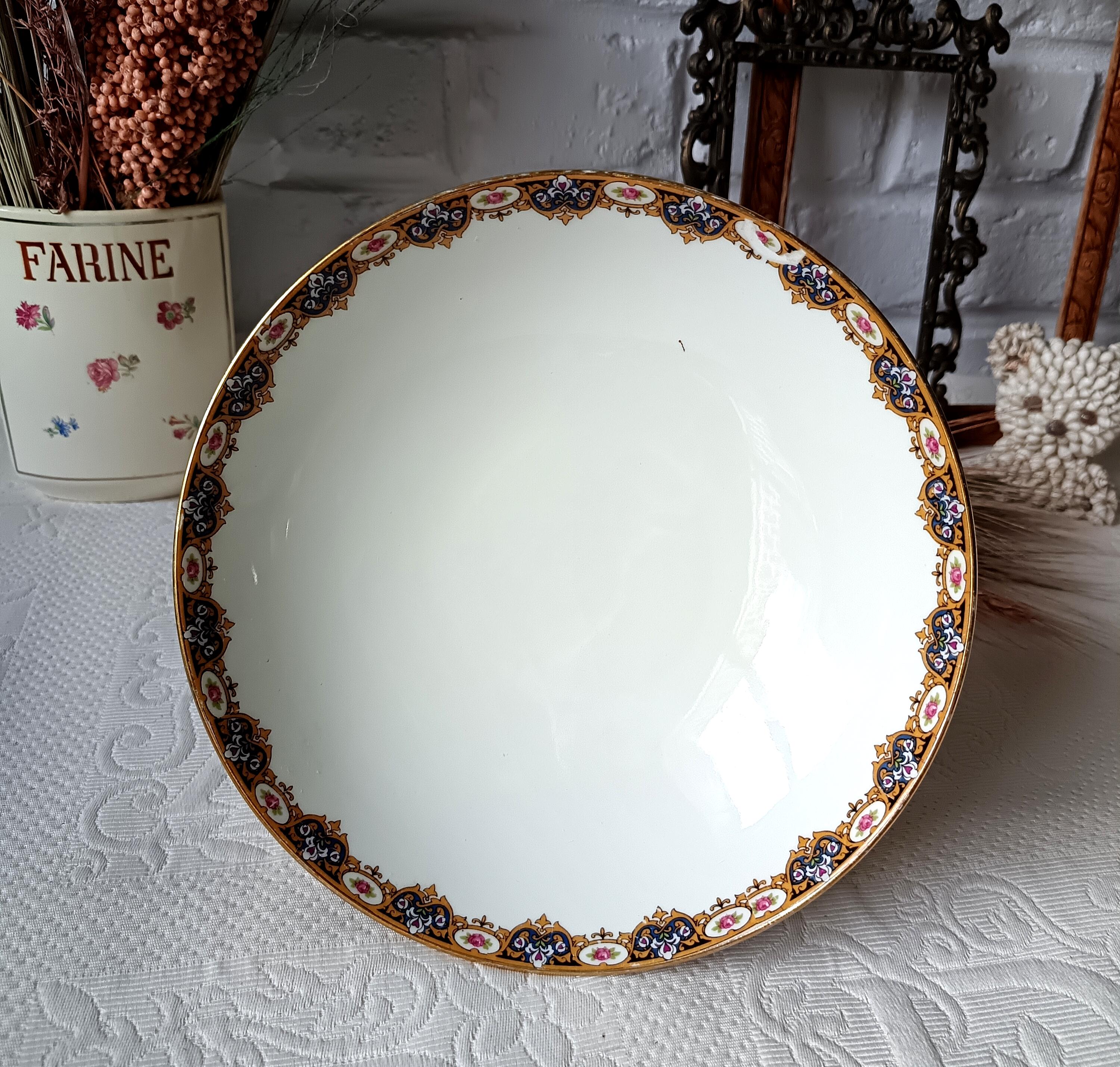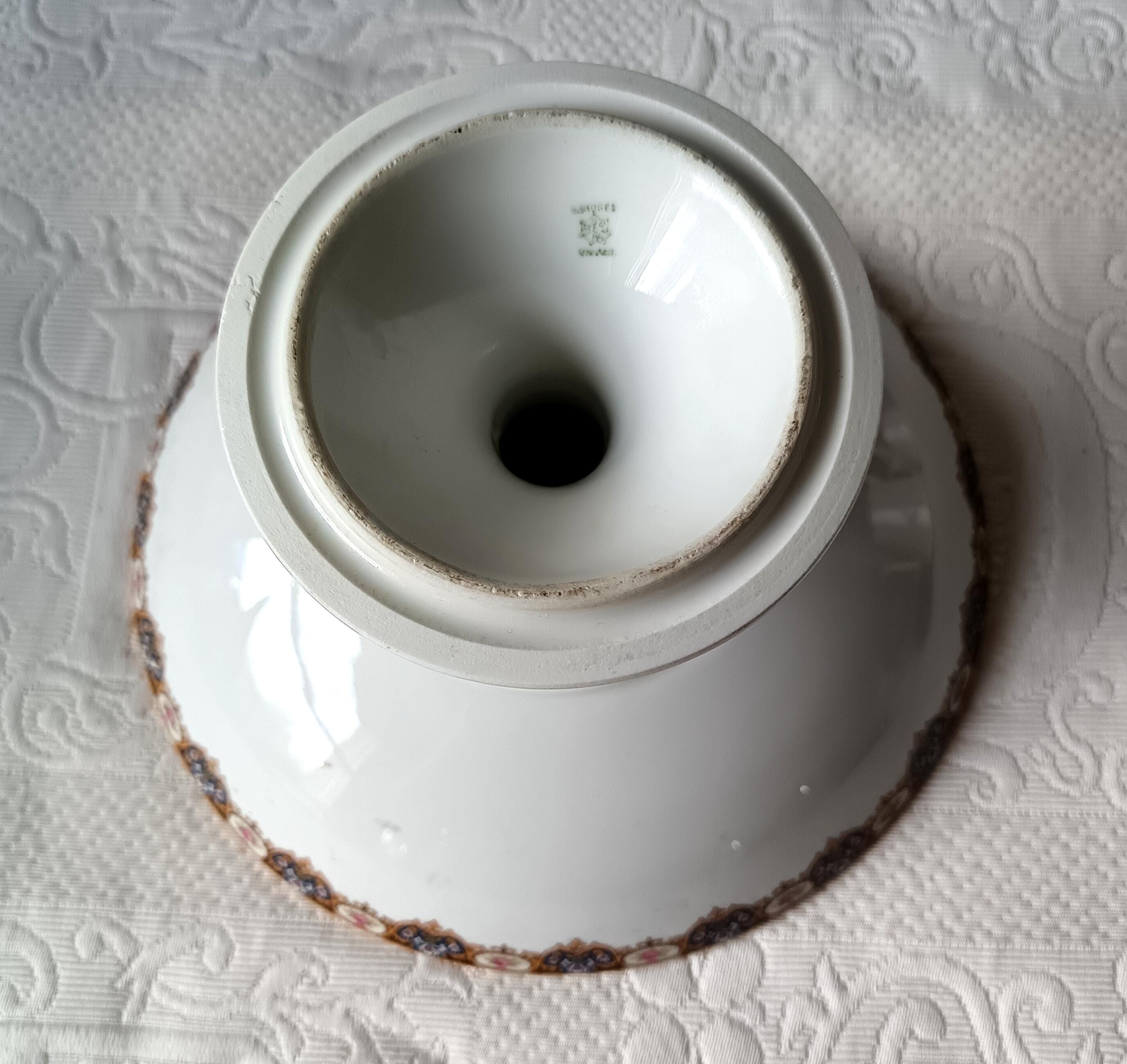 Beautiful porcelain bowl with a pattern on the rim in shades of blue, mustard and pink.