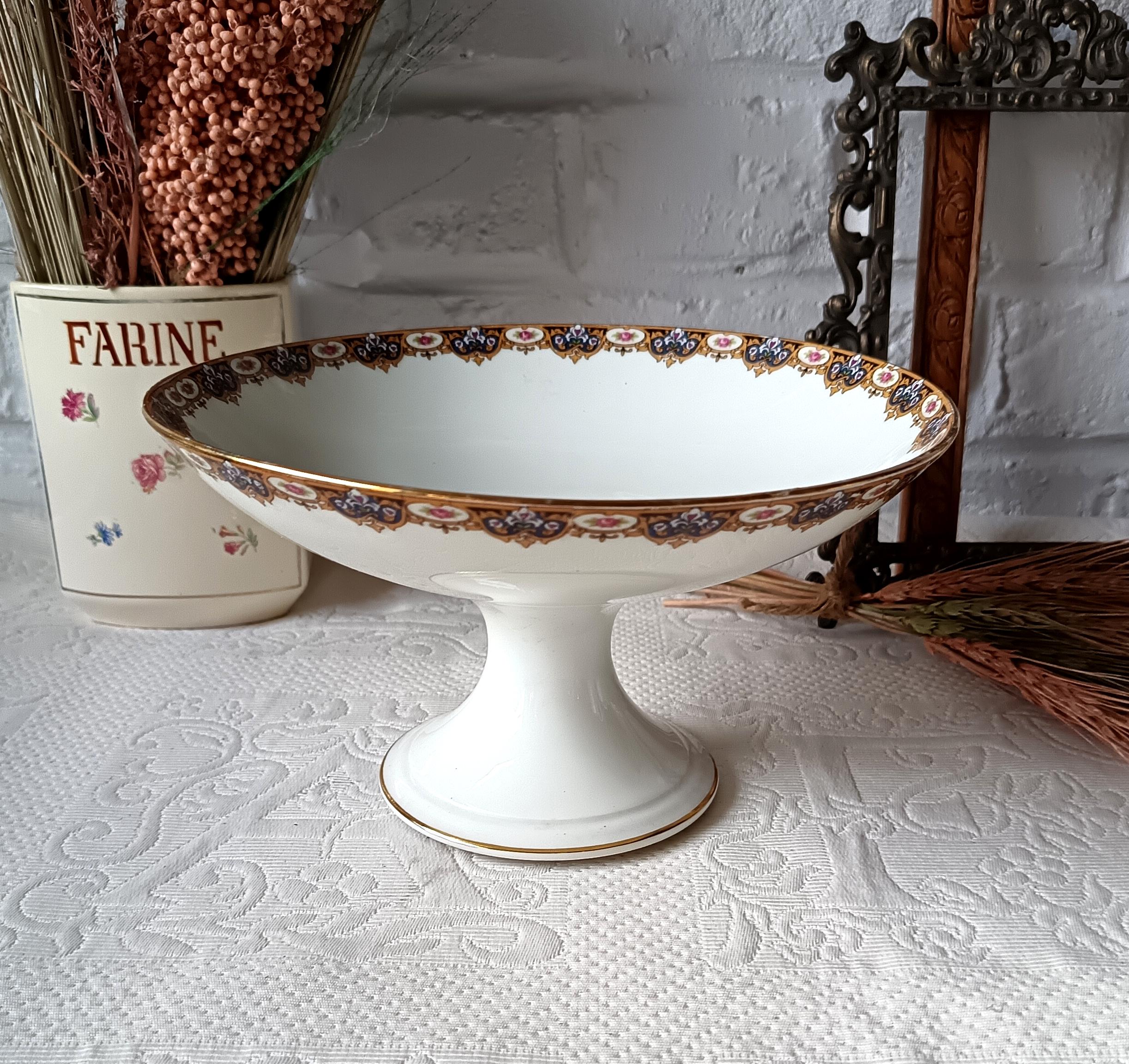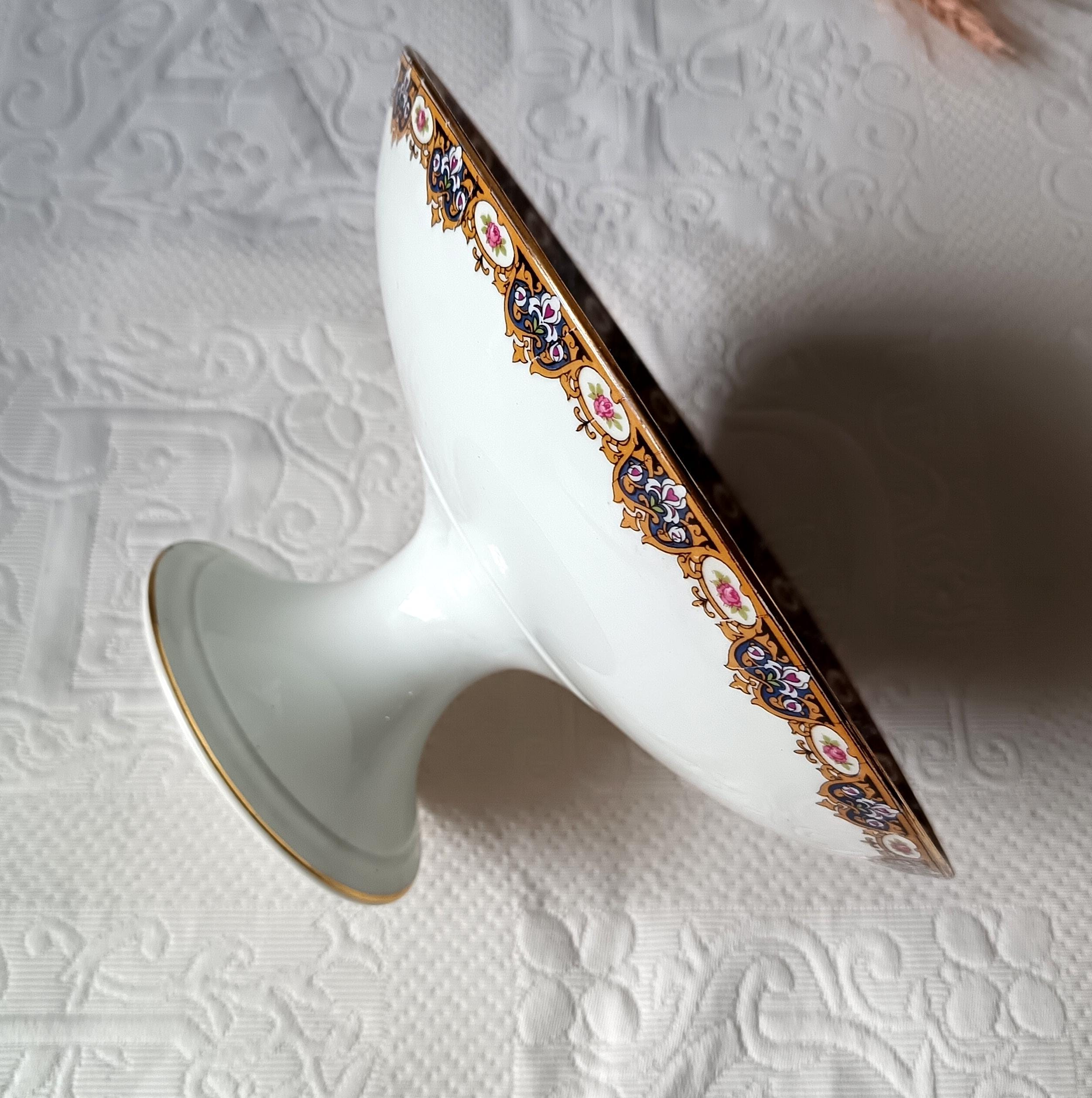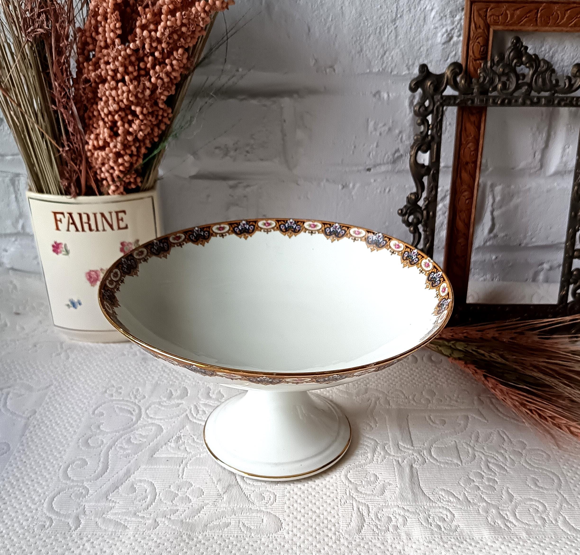 Beautiful porcelain bowl with a pattern on the rim in shades of blue, mustard and pink.