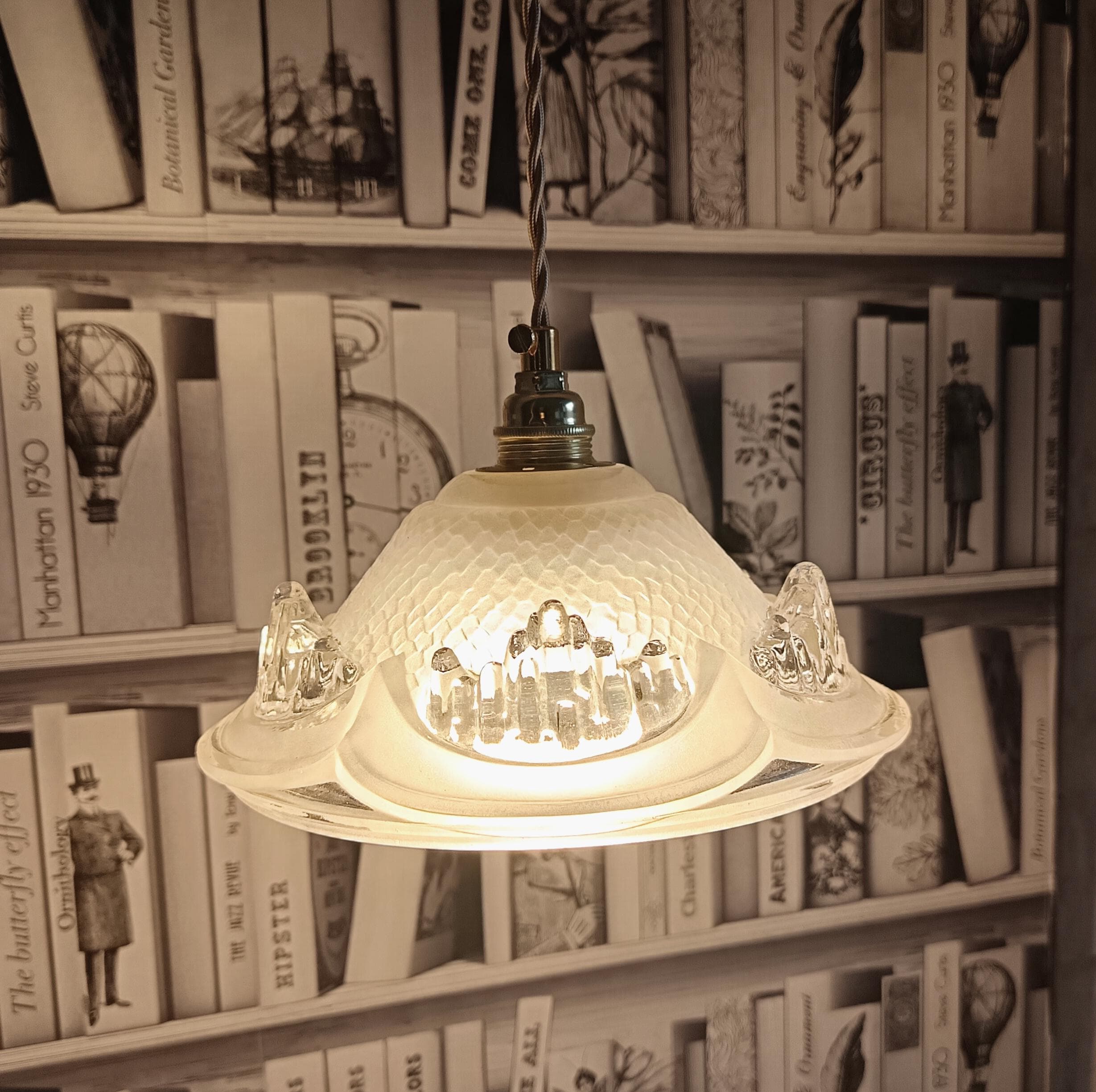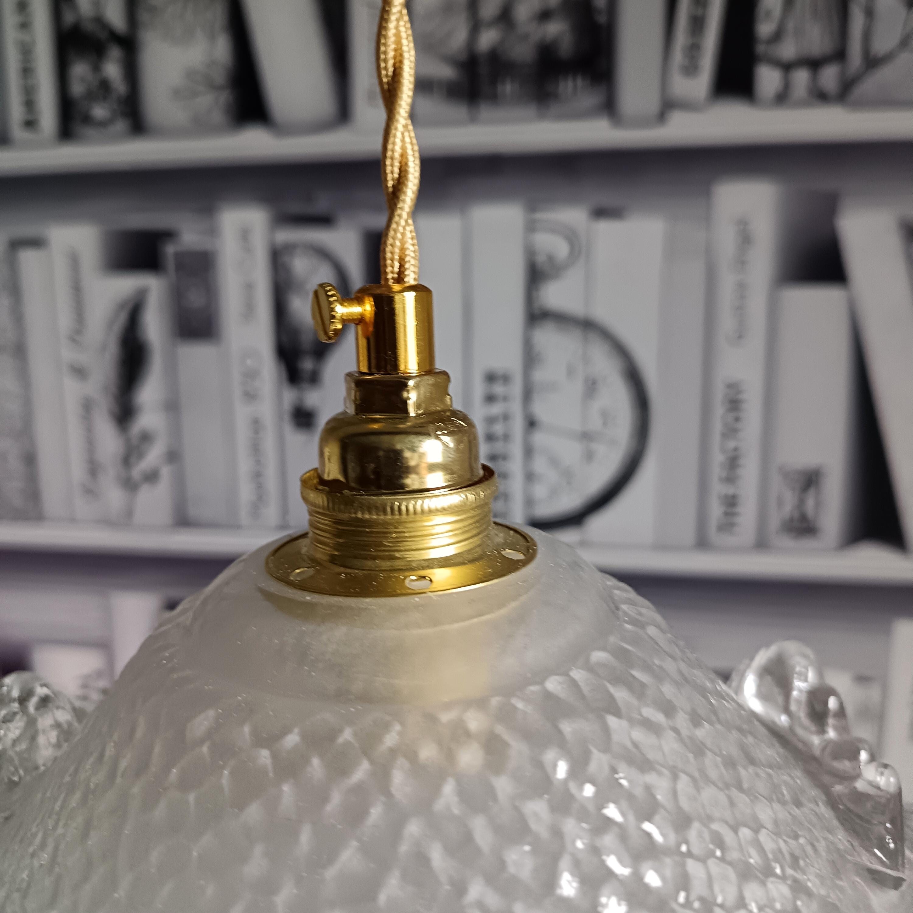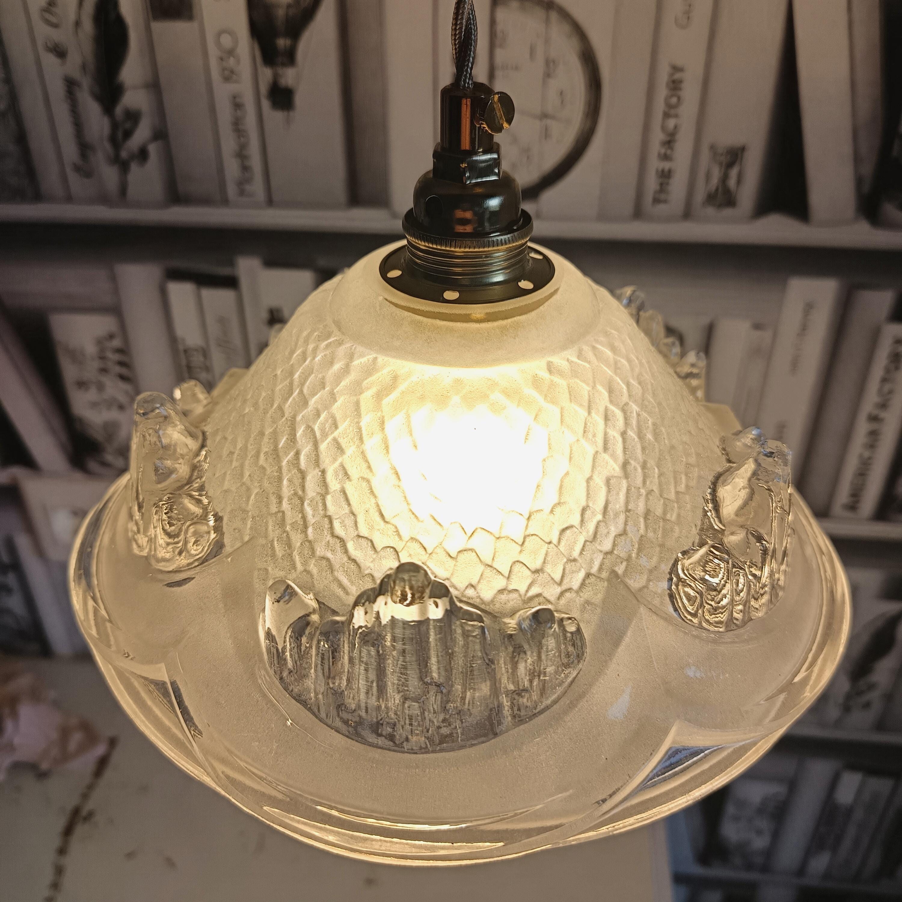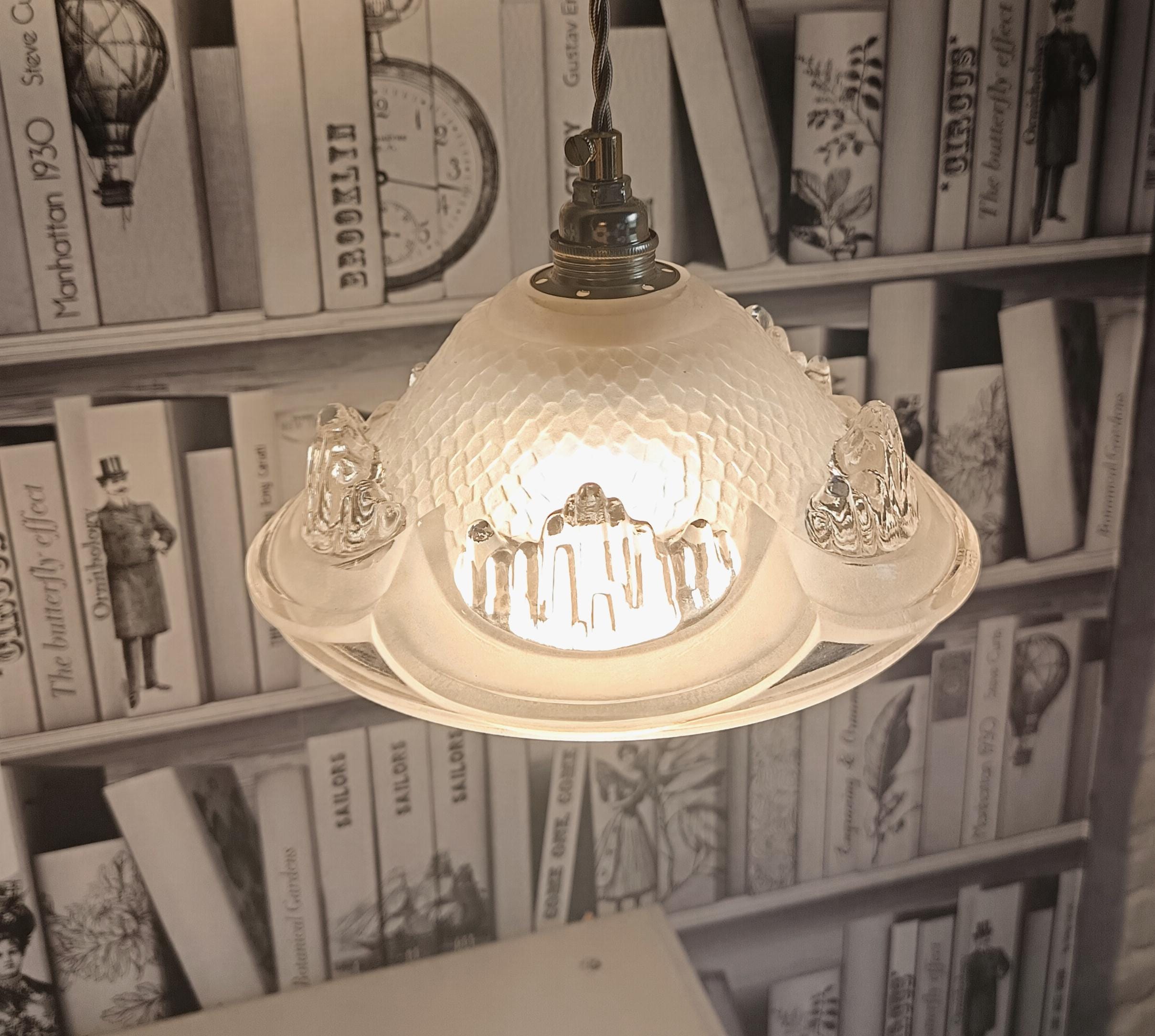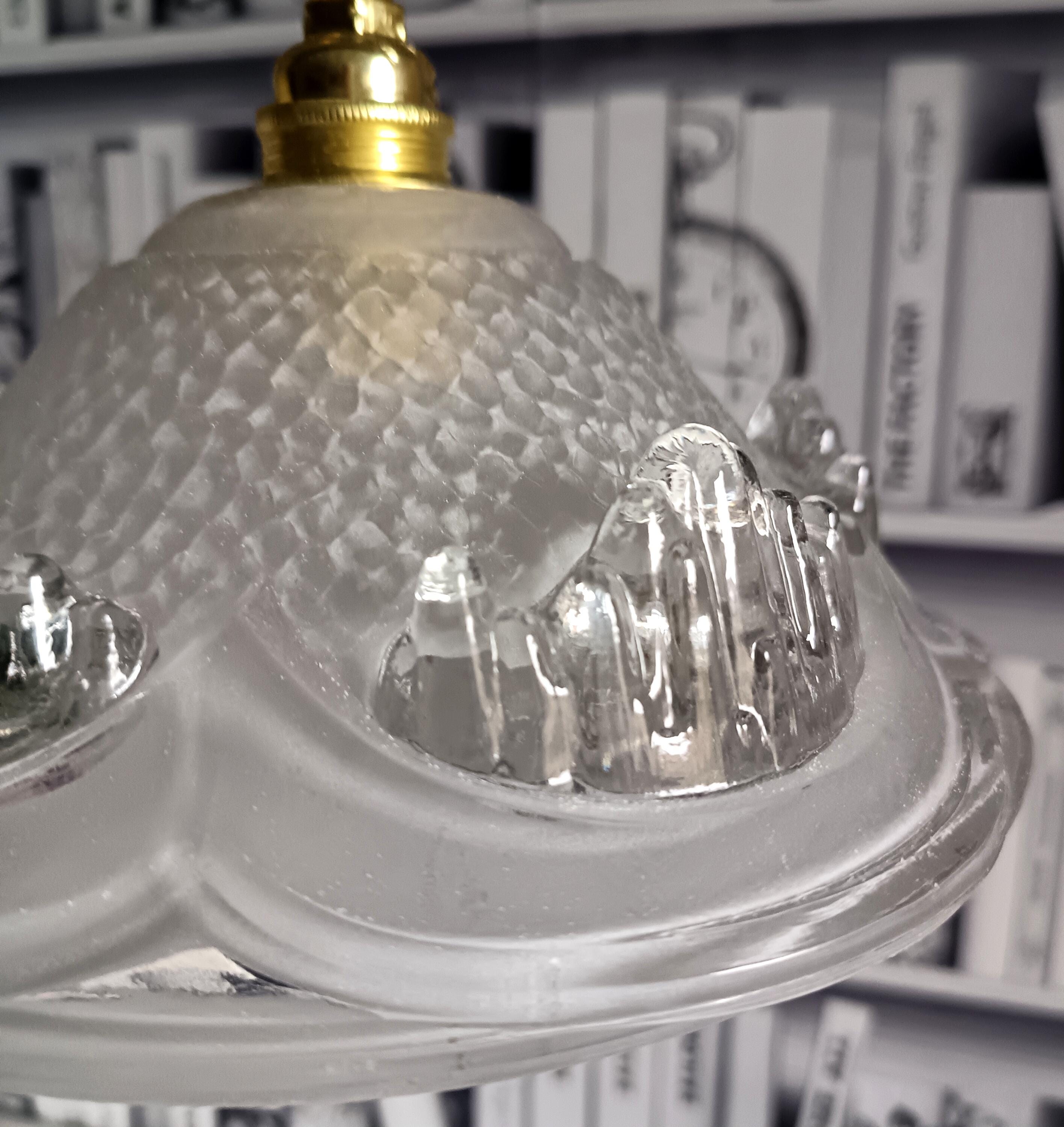 Charming lighting, the light highlights its relief patterns from the 1930s. (length from the top of the suspension to the ceiling rose 79 cm).