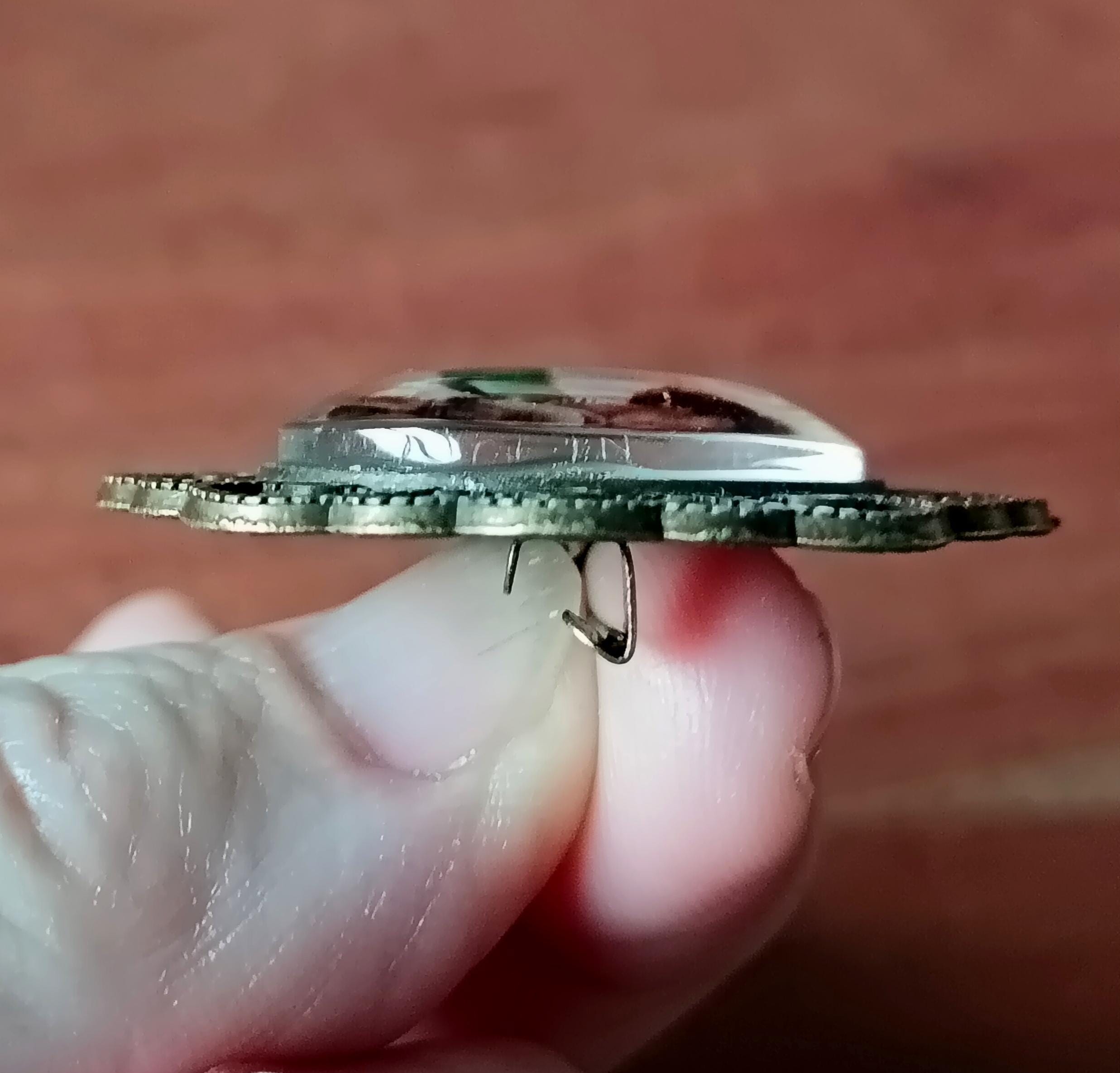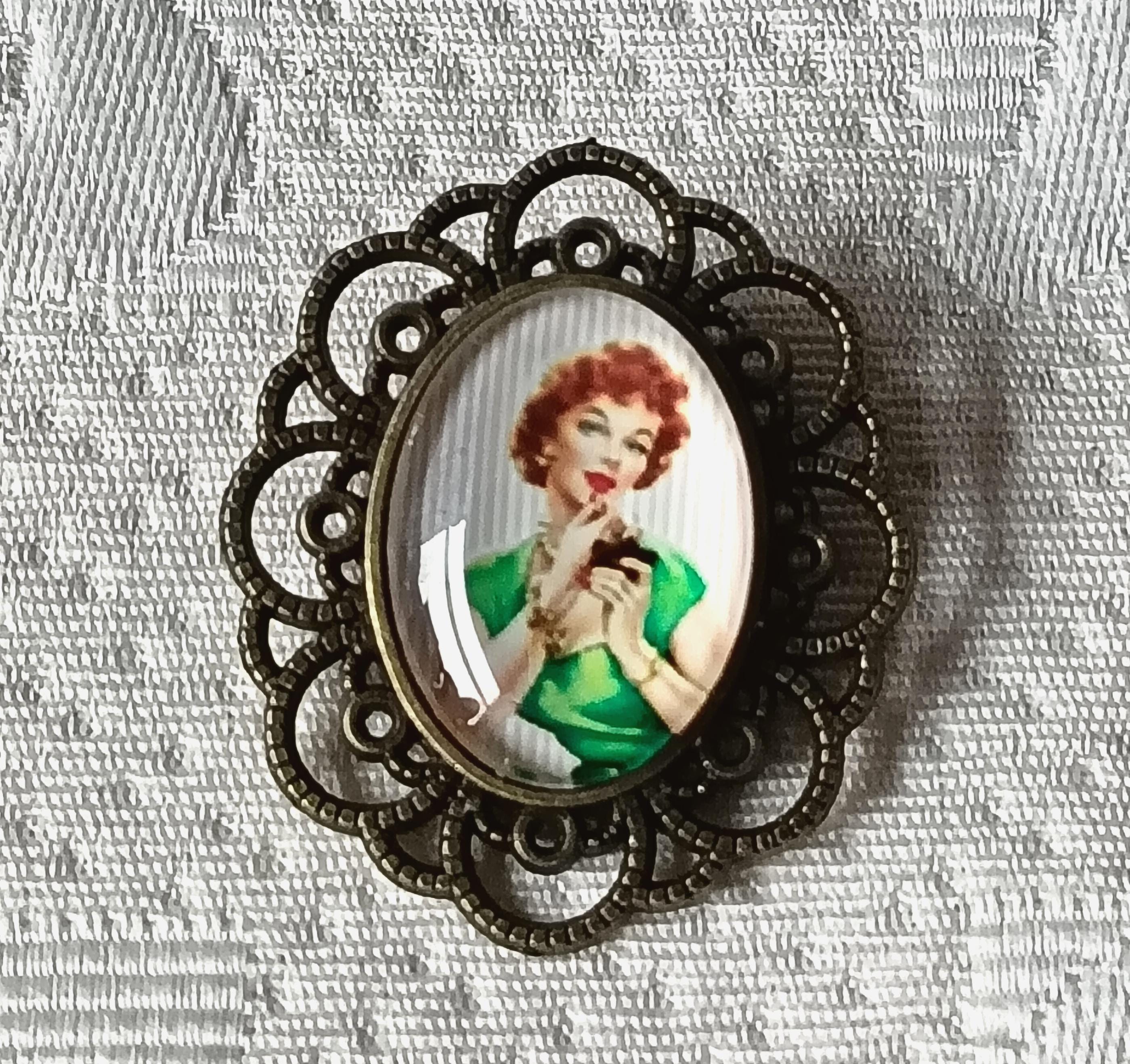Bronze-colored metal brooch, with a pretty oval cabochon in the center.