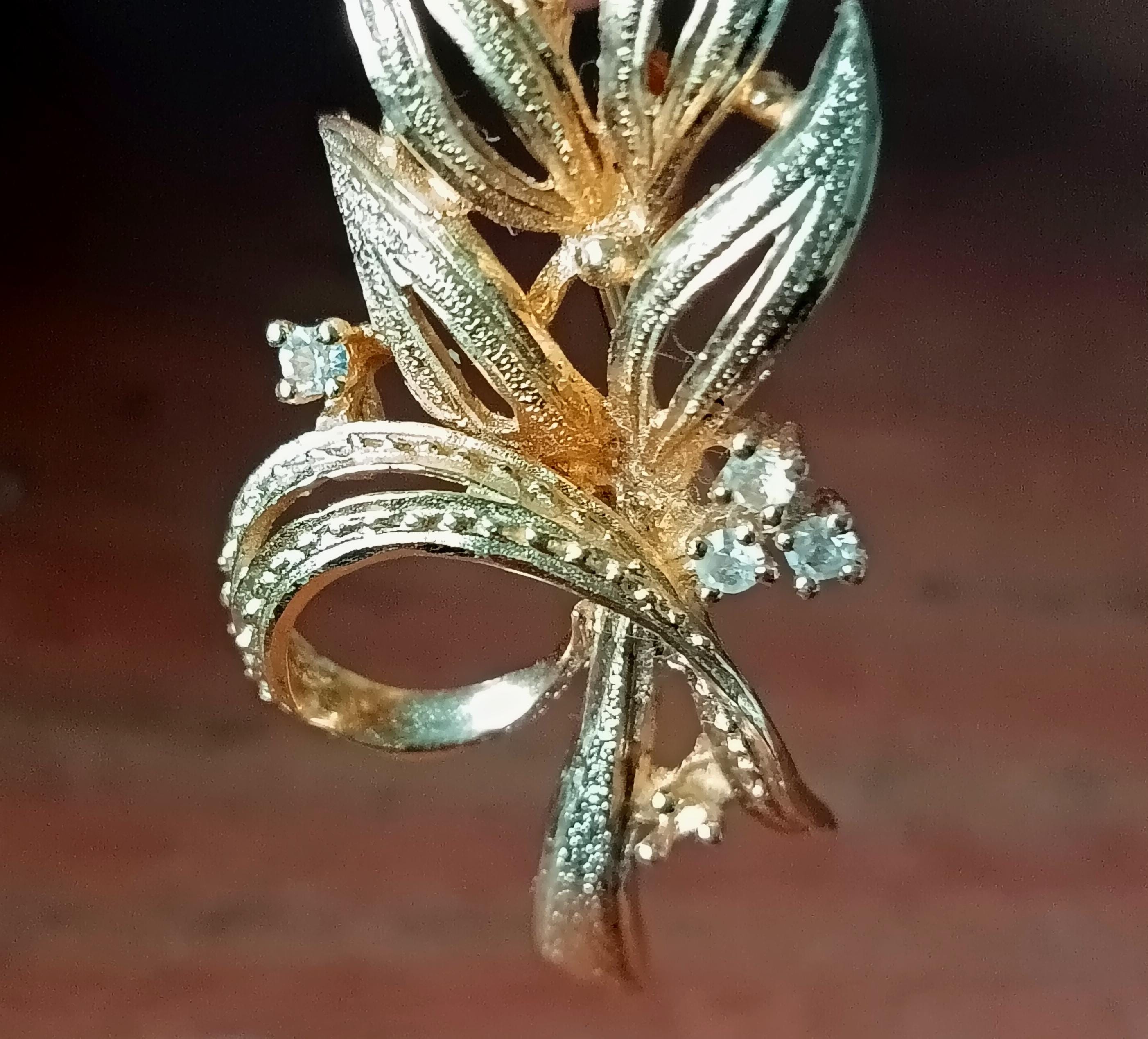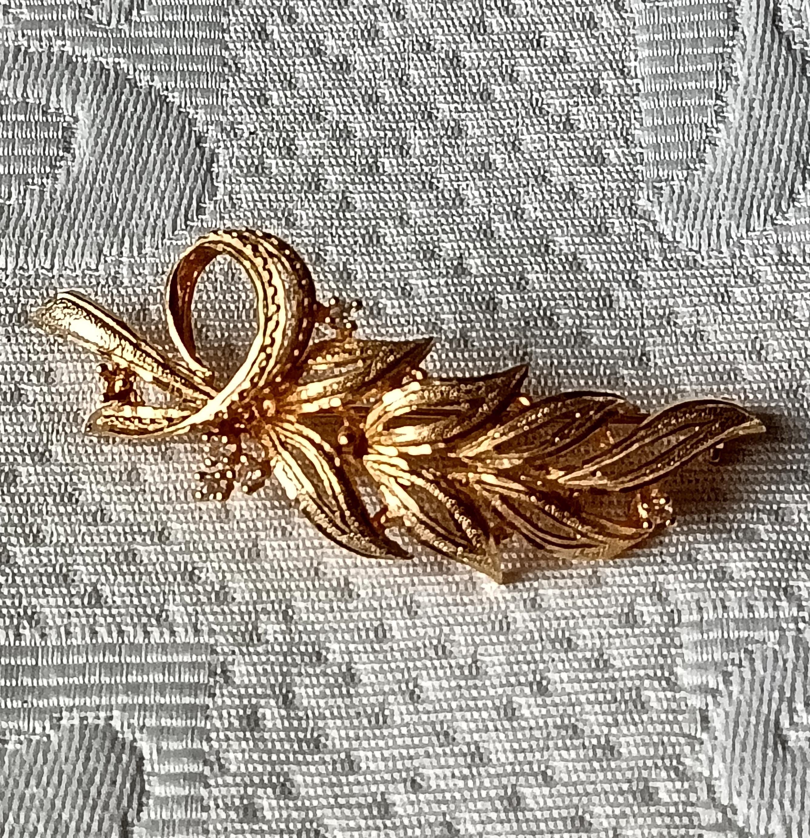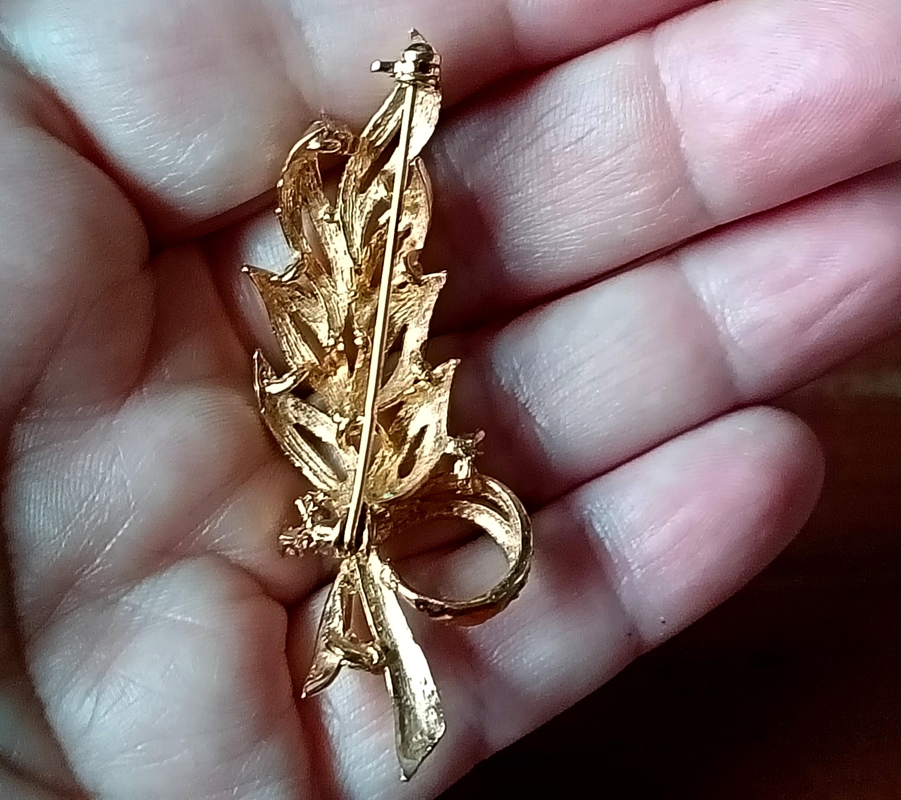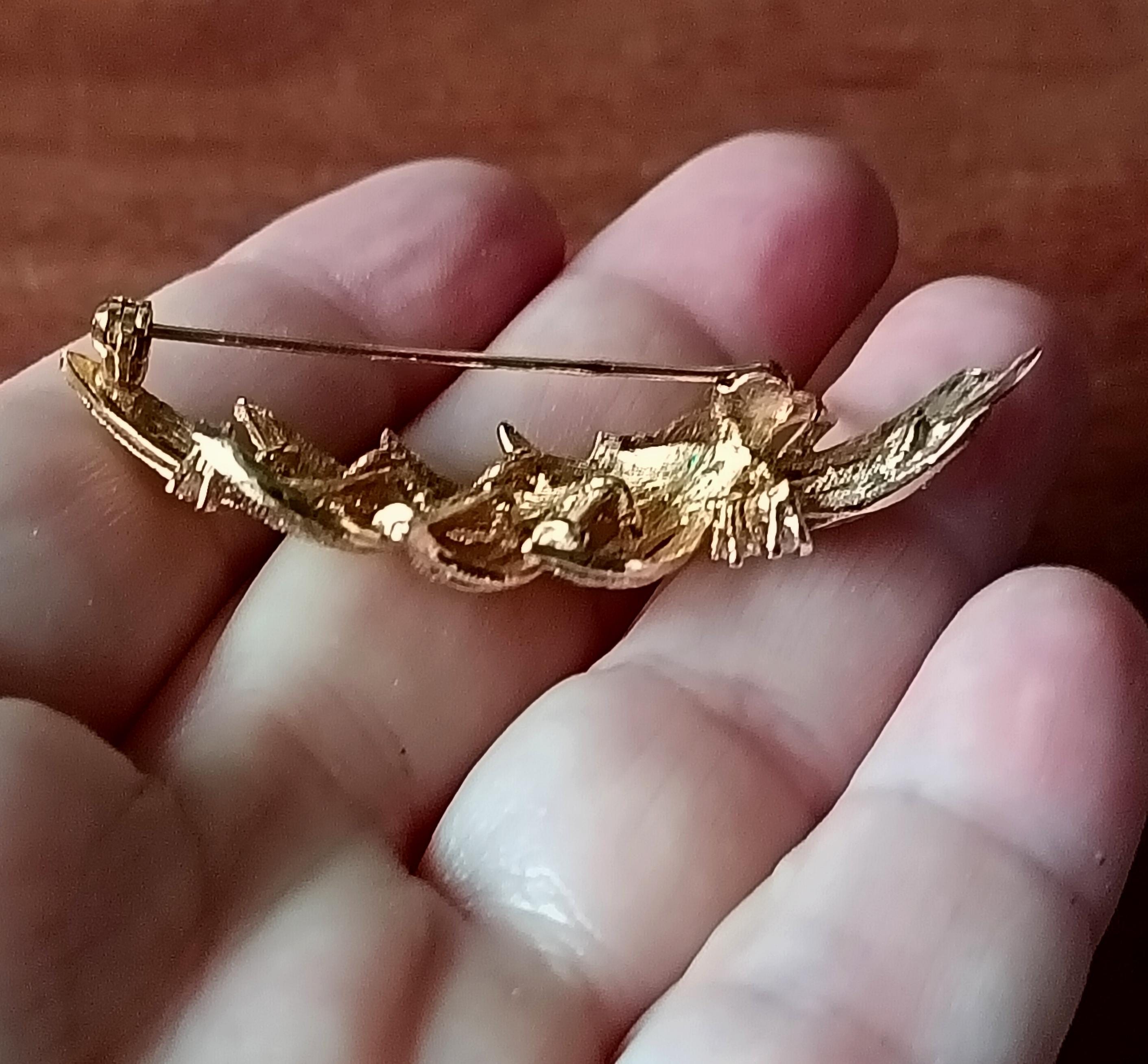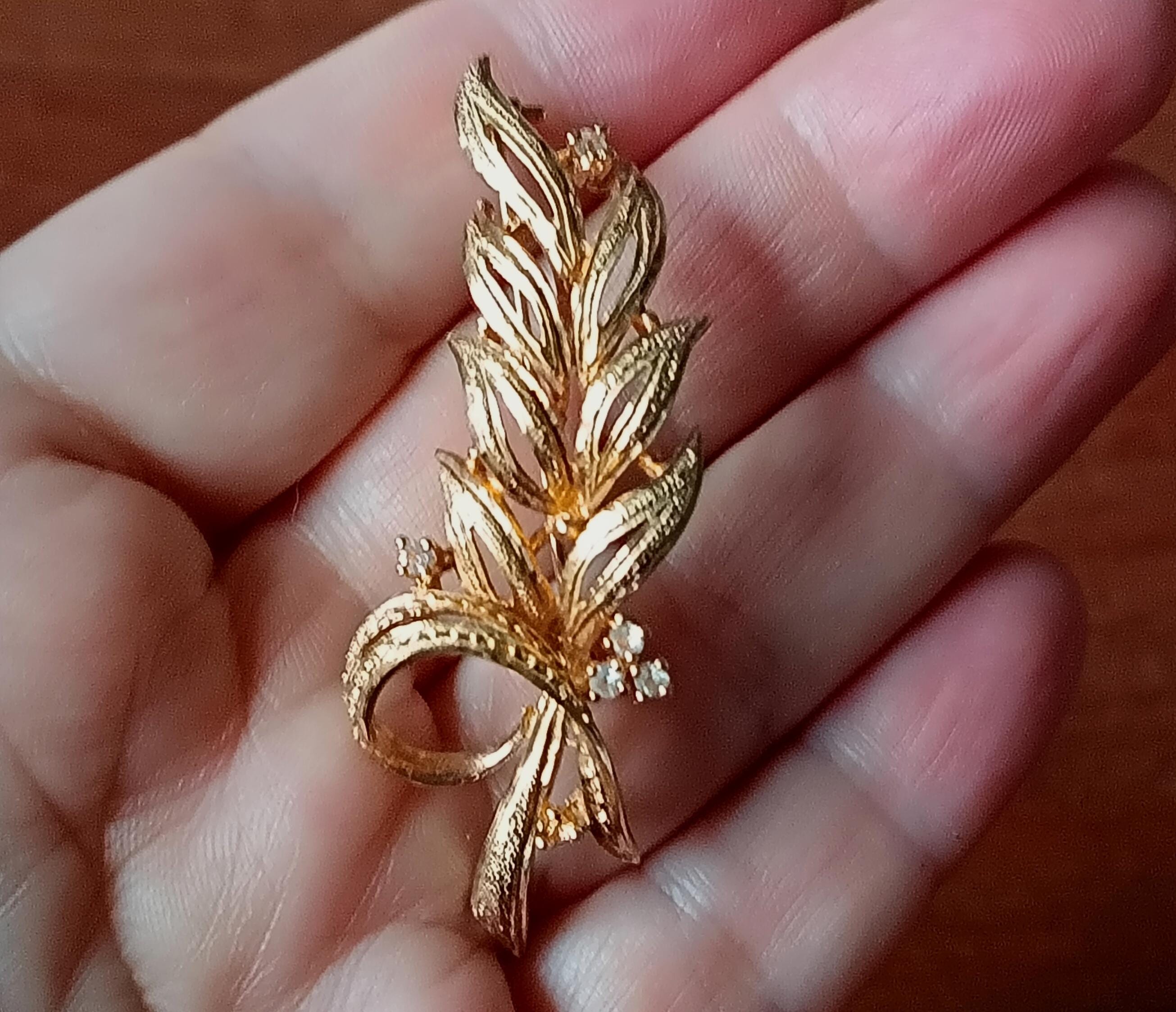 Beautiful vintage brooch, in gold-tone metal, in the shape of a long leaf with 6 small rhinestones.