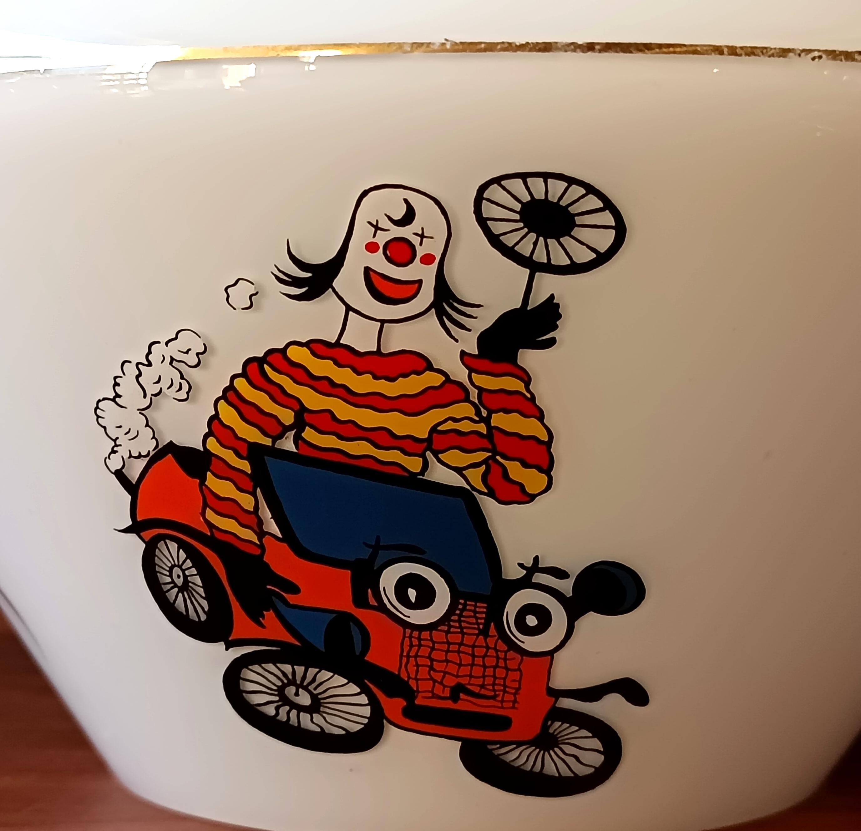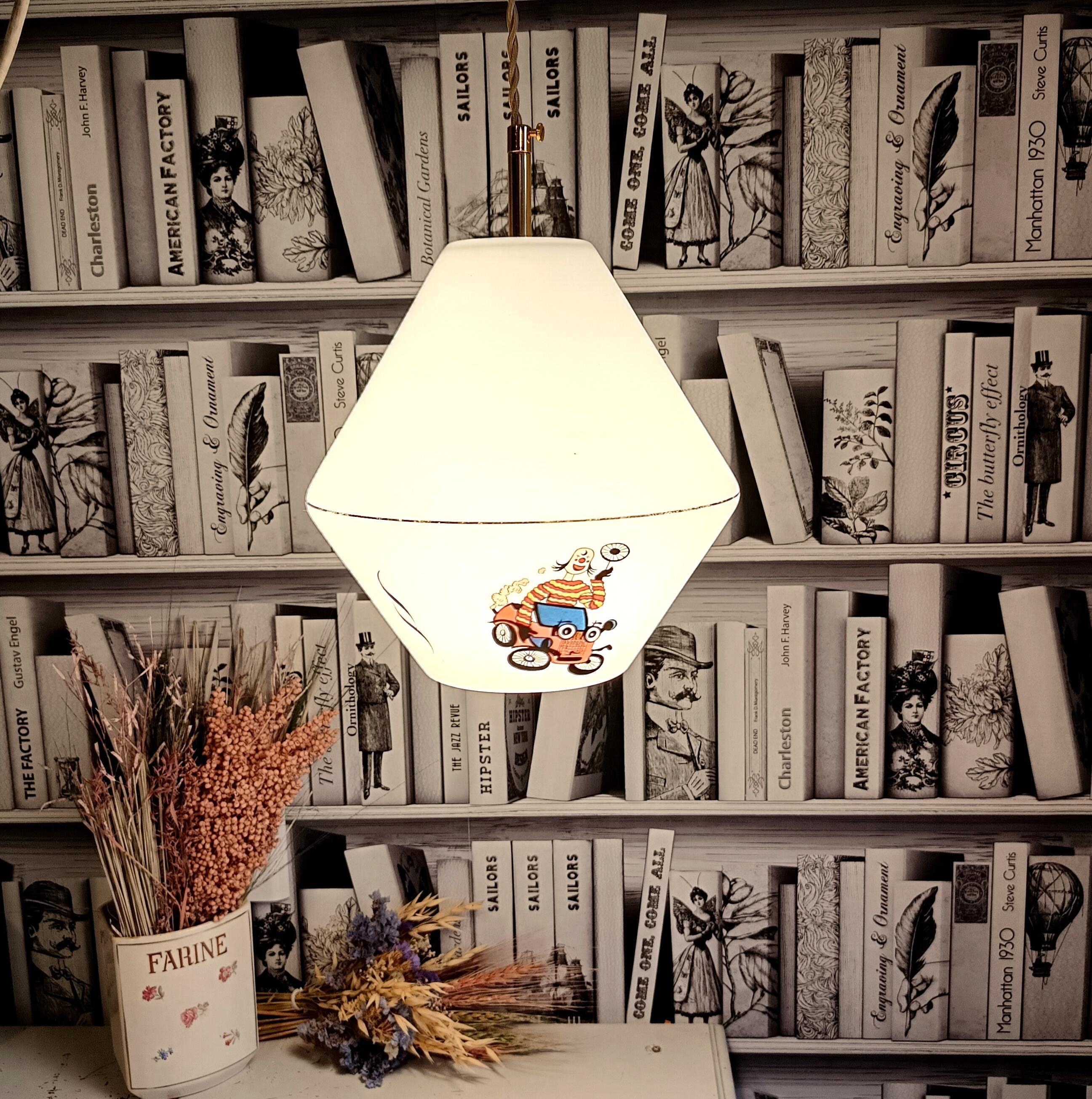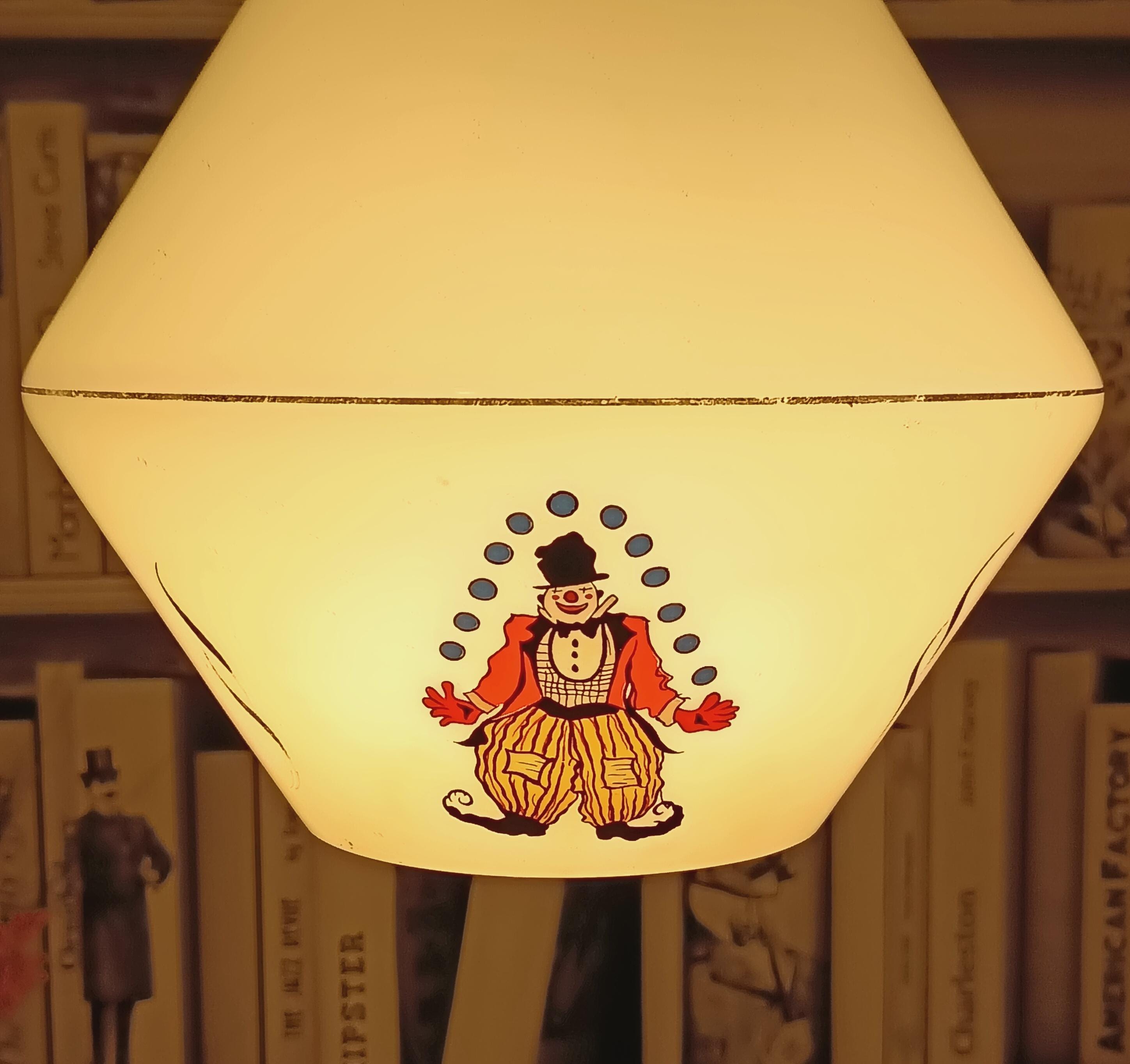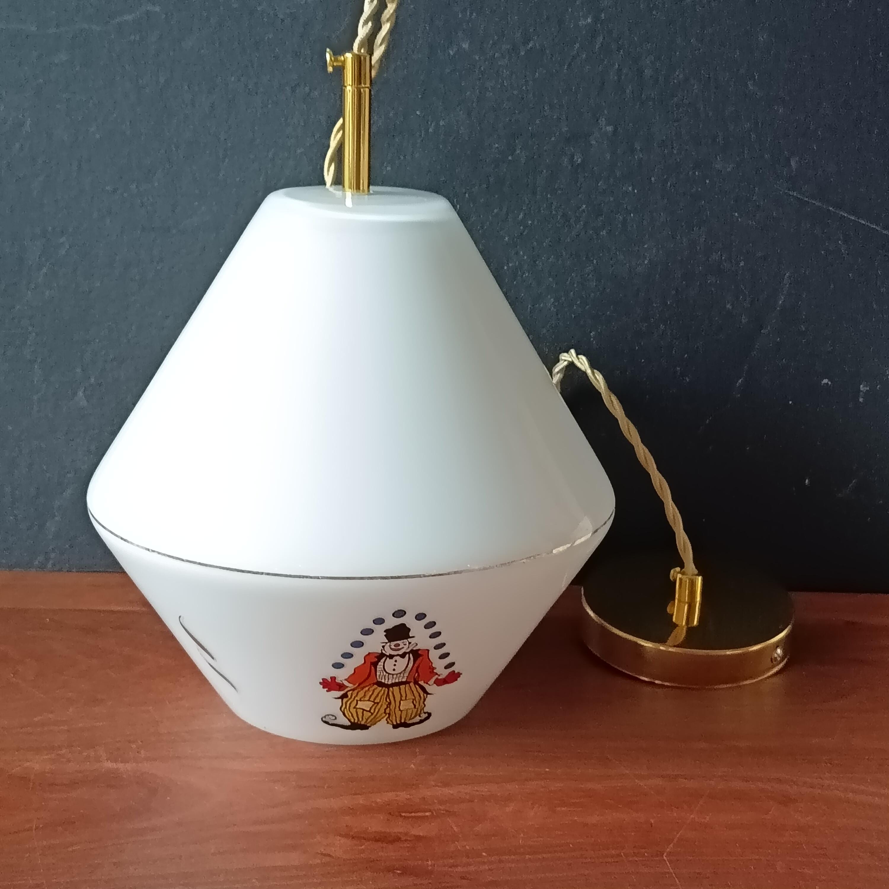 High-quality opaline glass pendant light, with a lovely shape of 2 superimposed cones with 3 motifs on the bottom of the globe. The motifs all represent a different clown, it dates from the 60s/70s.