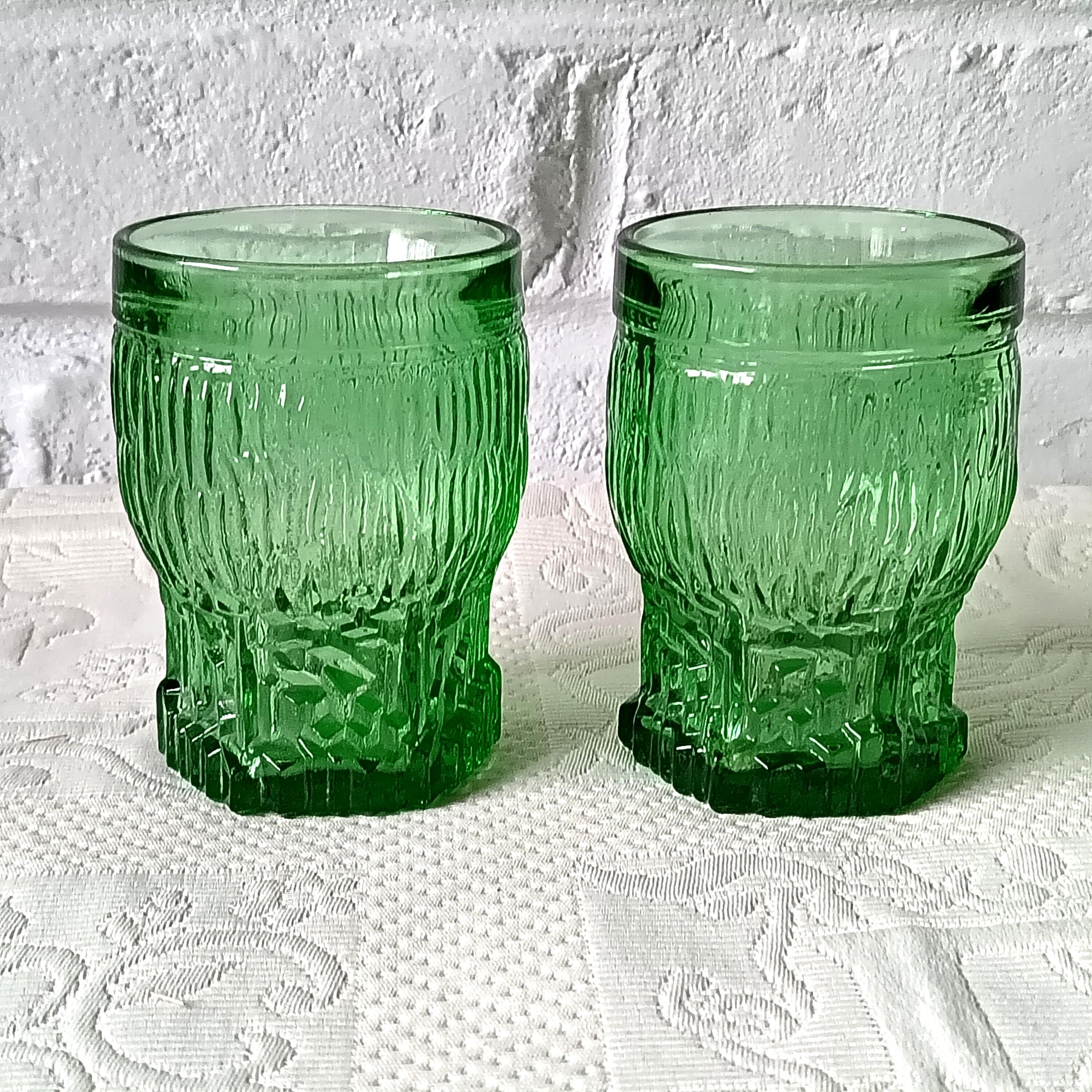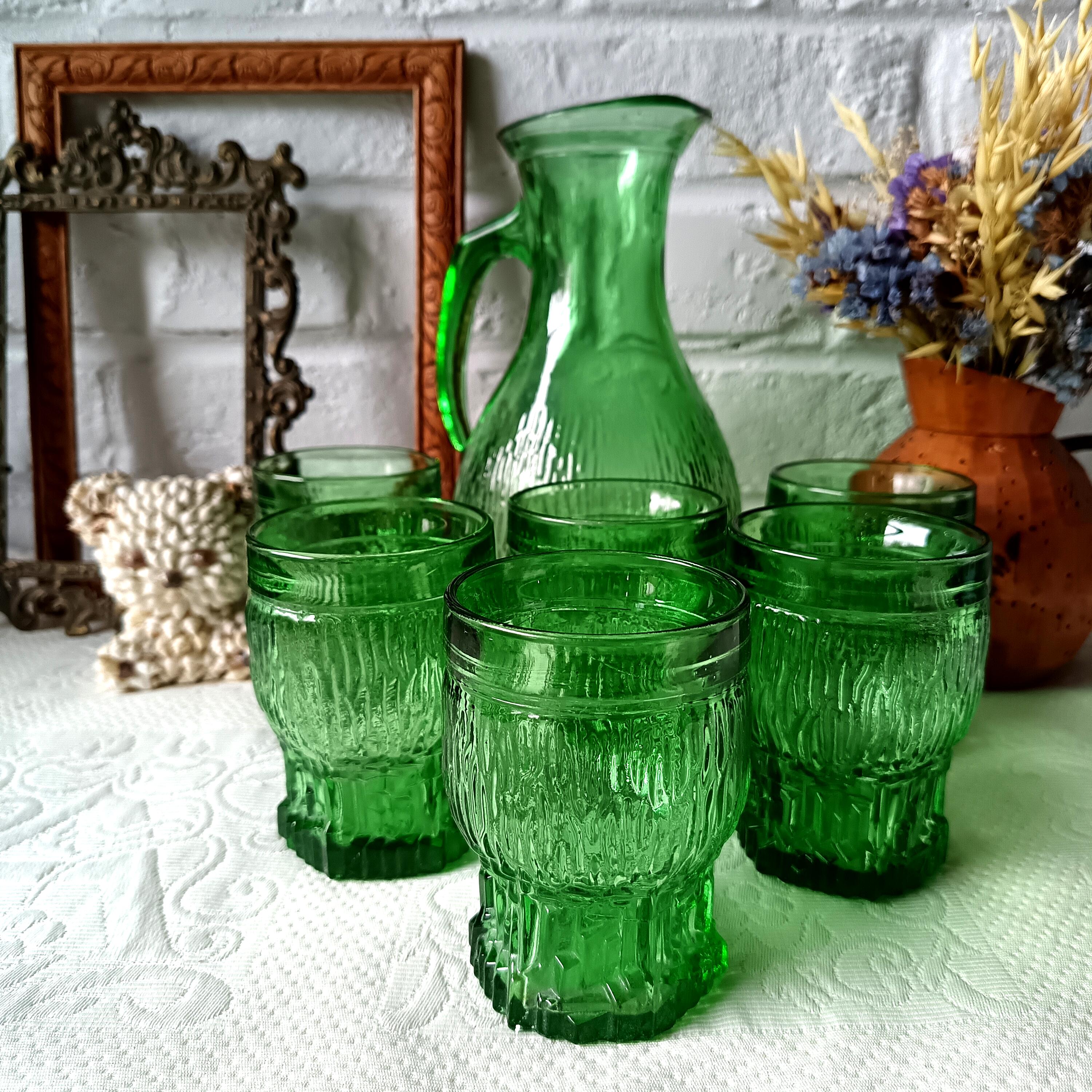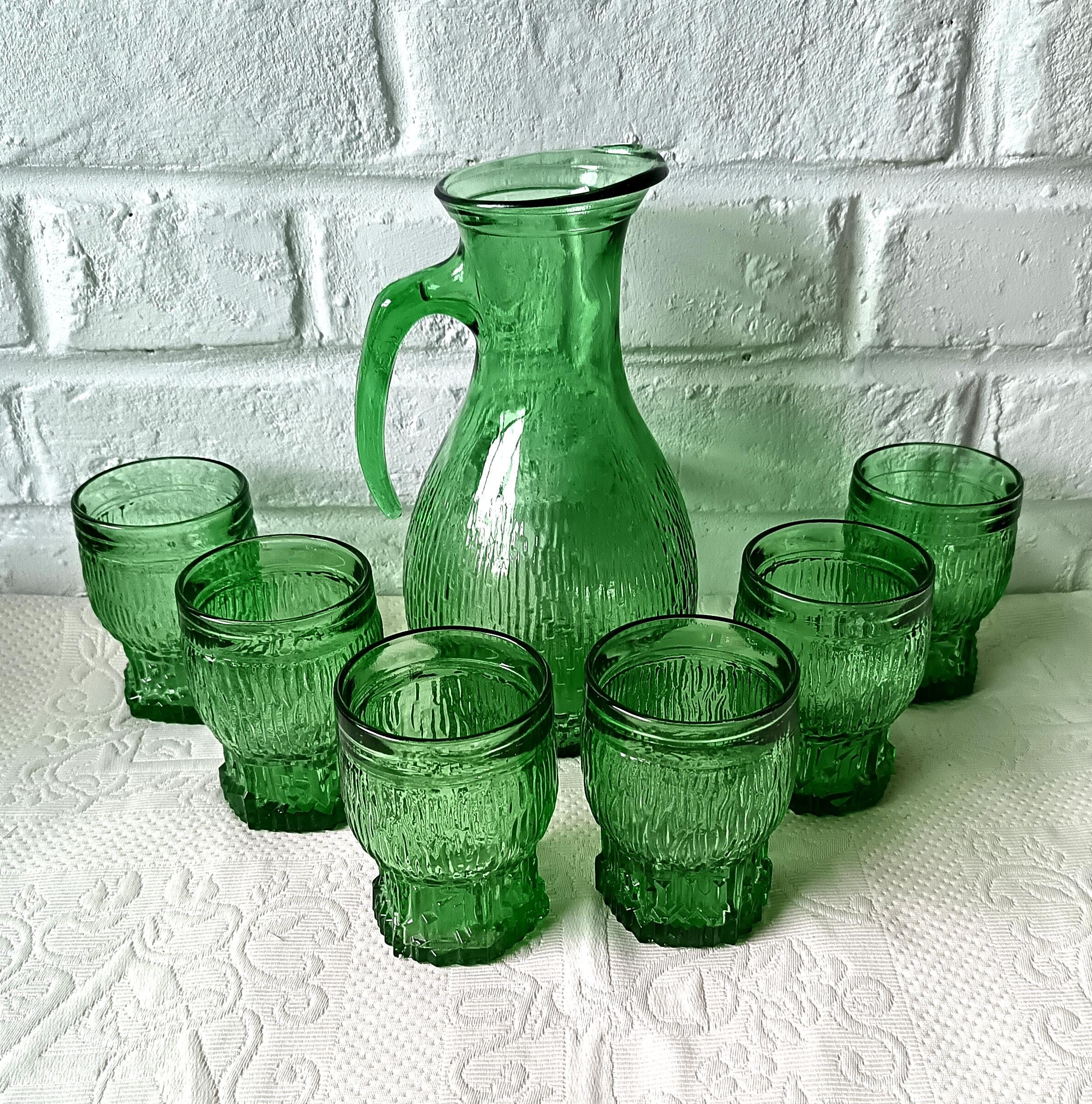 A beautiful green glass pitcher, easy to handle thanks to its small handle, with a lovely textured base. It comes with five attractive emerald green textured glass tumblers, perfect for water, orangeade, or lemonade. The glass is heavy and sturdy.