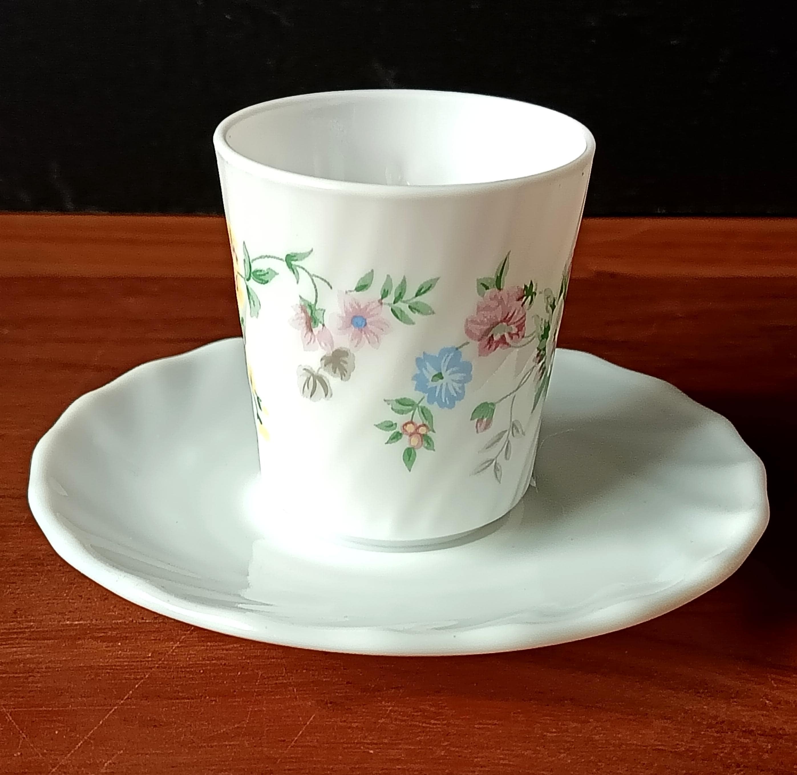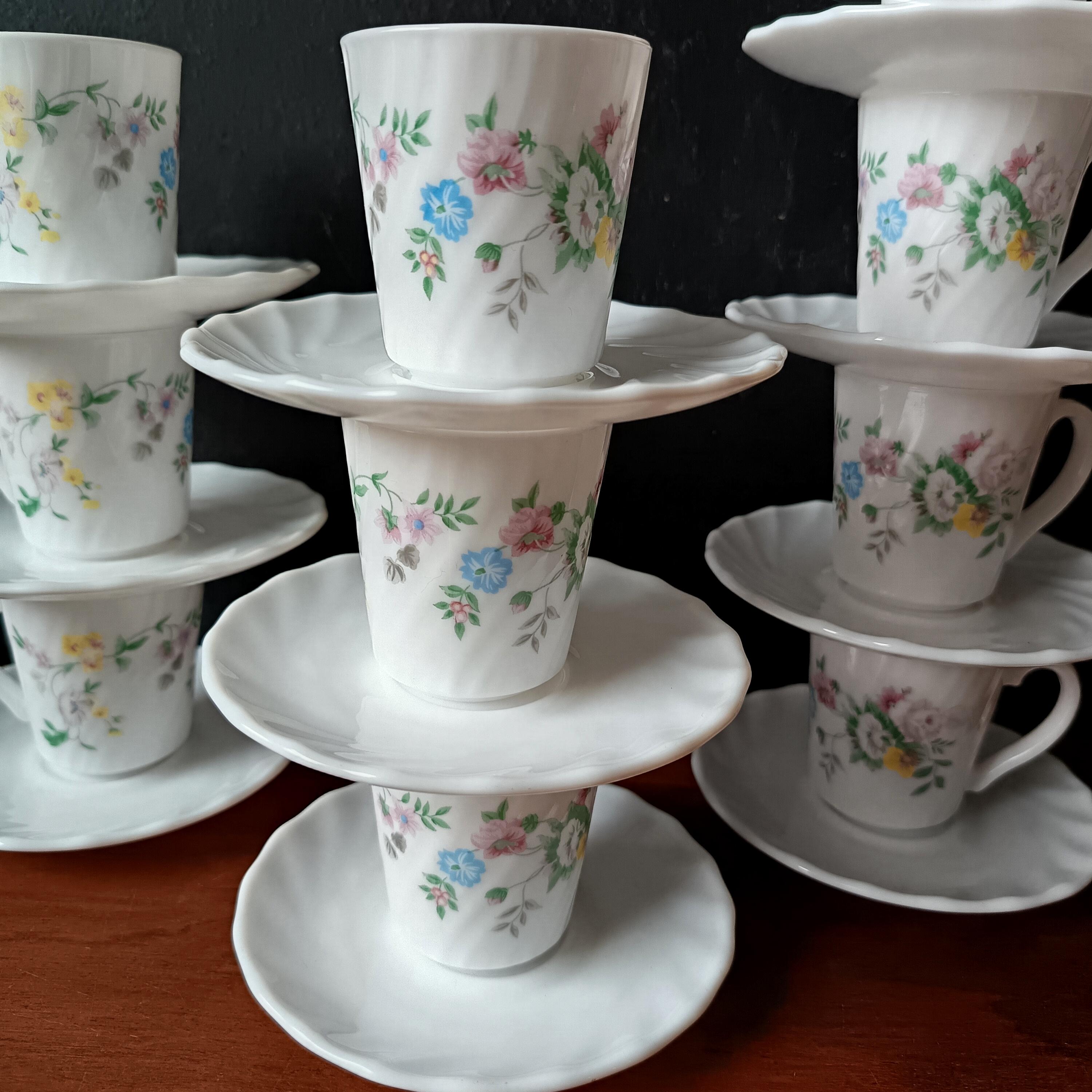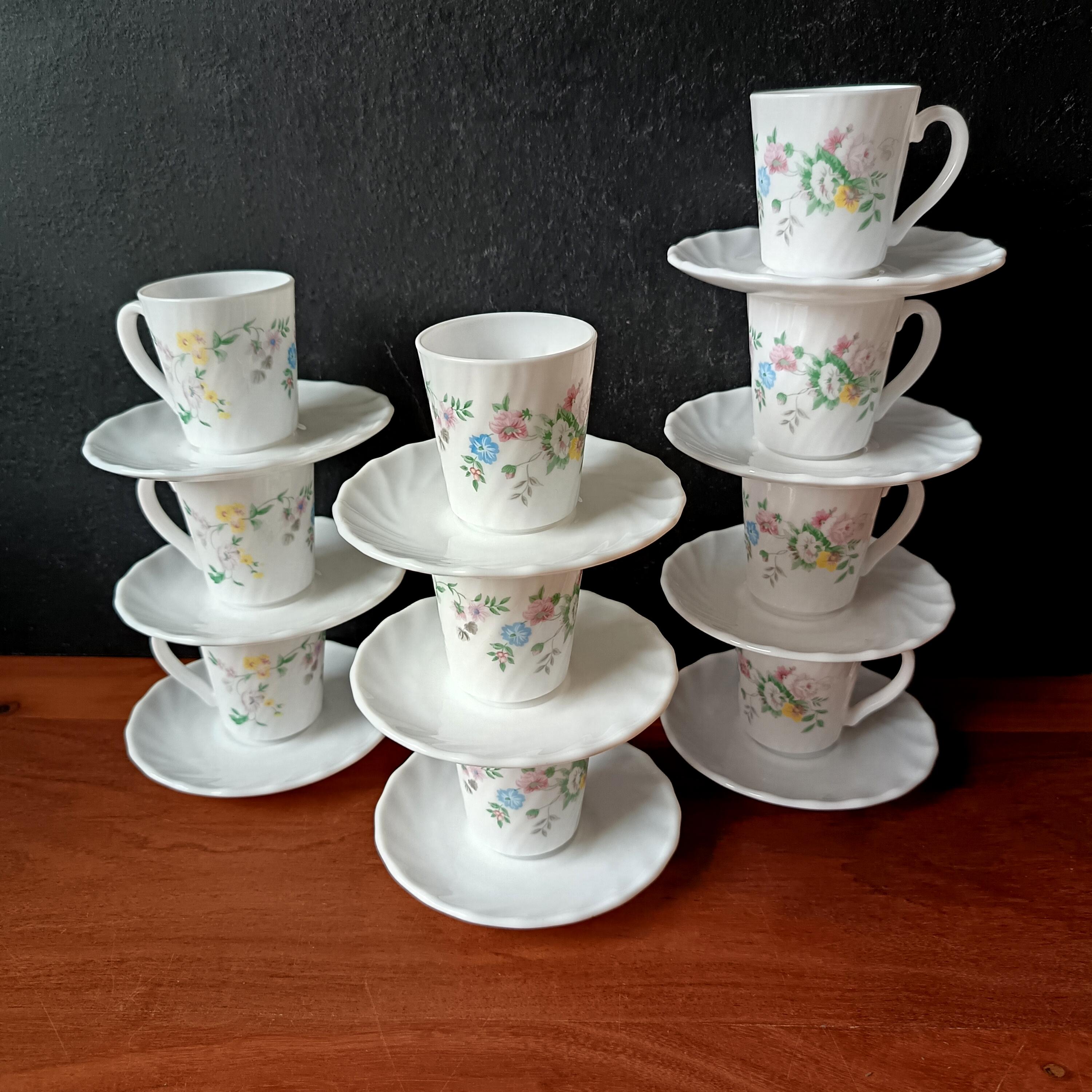 Set of 10 vintage Arcopal milk glass coffee cups and saucers with pretty multicoloured floral design, Hortense pattern Arcopal France.