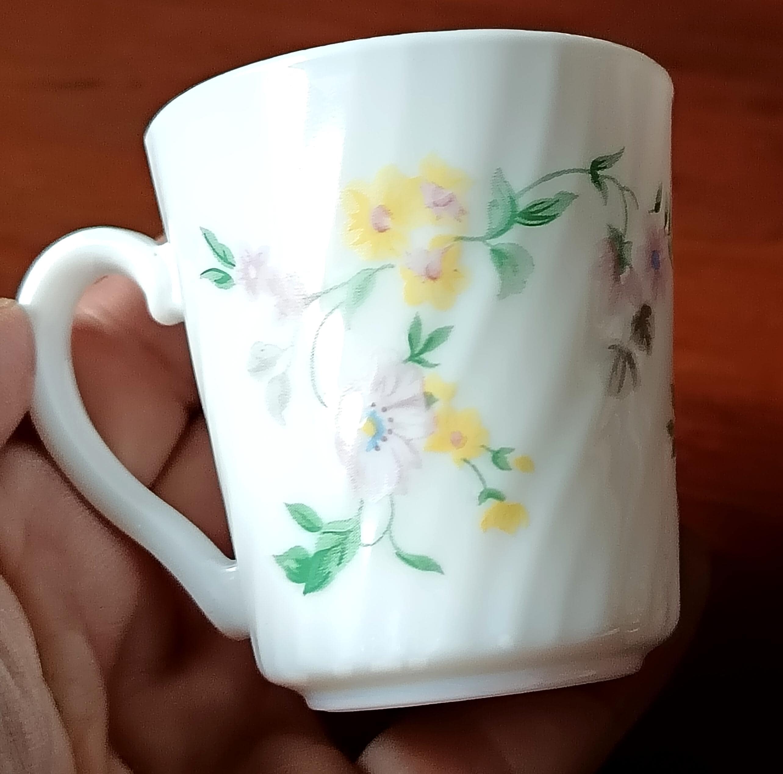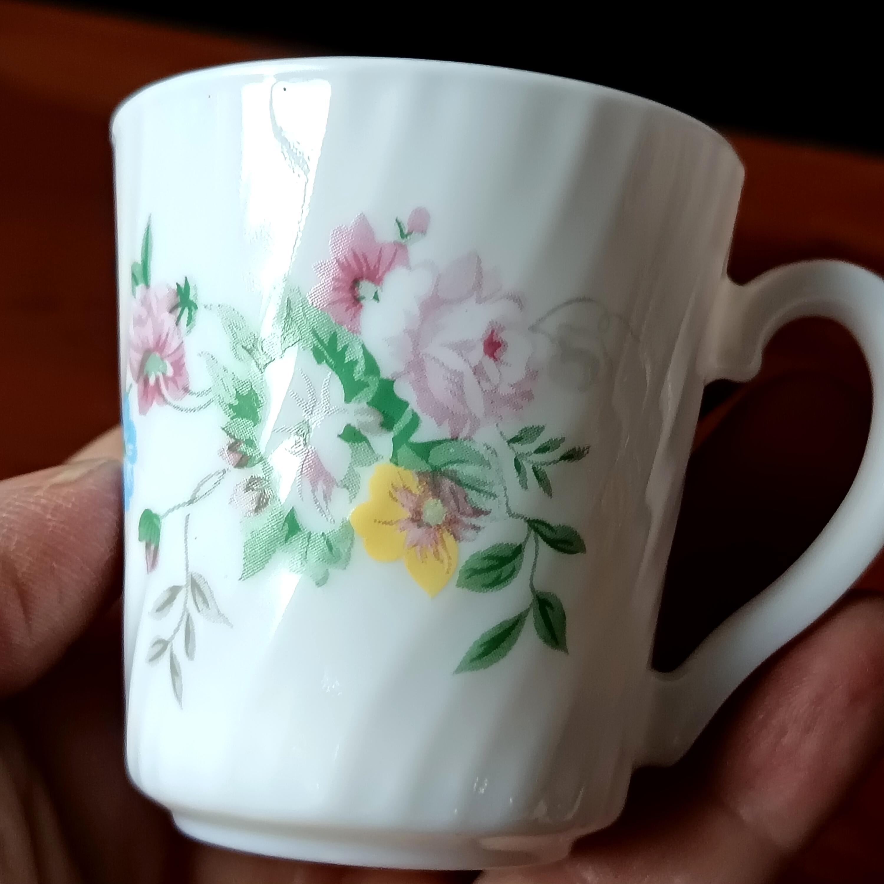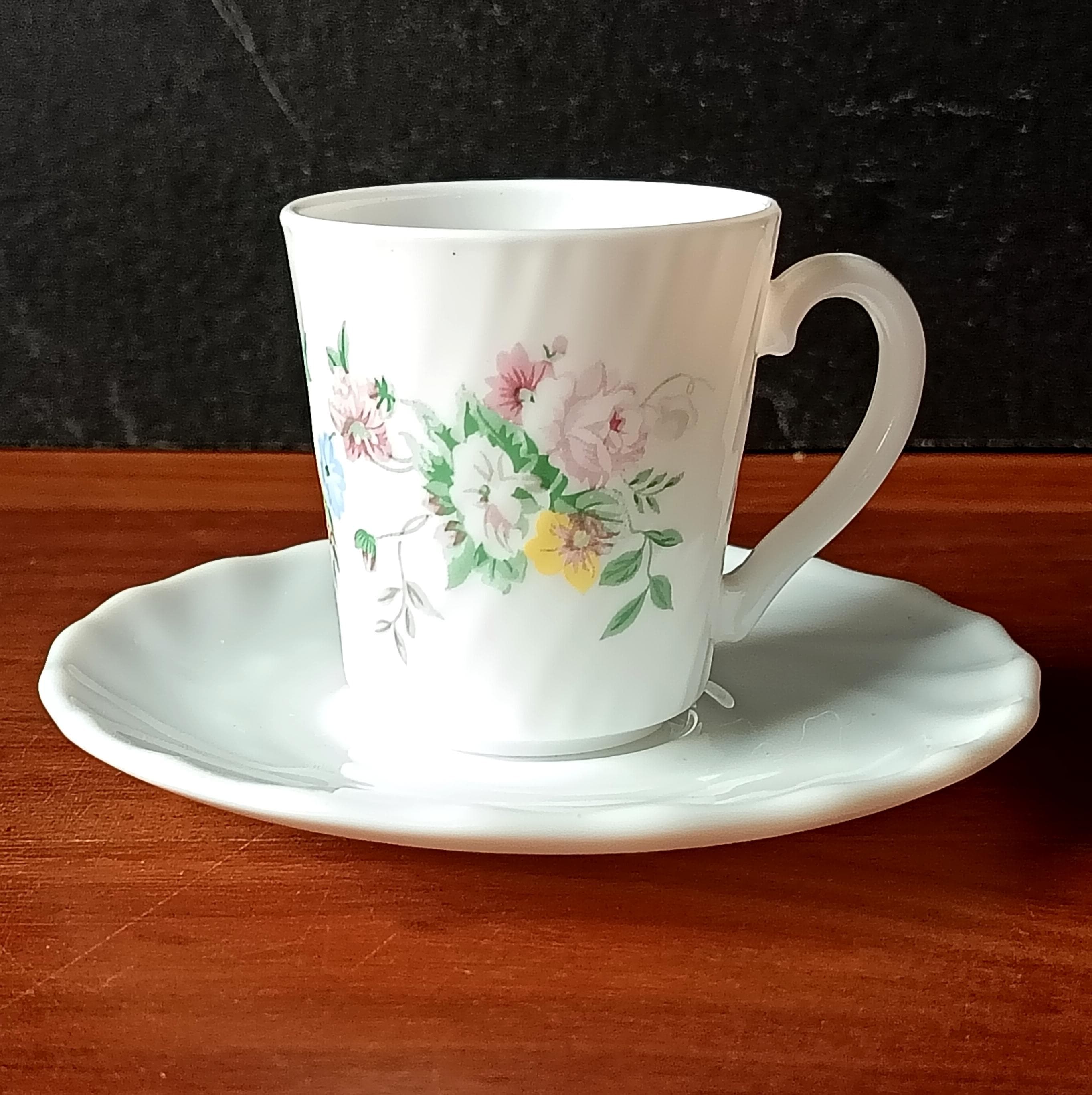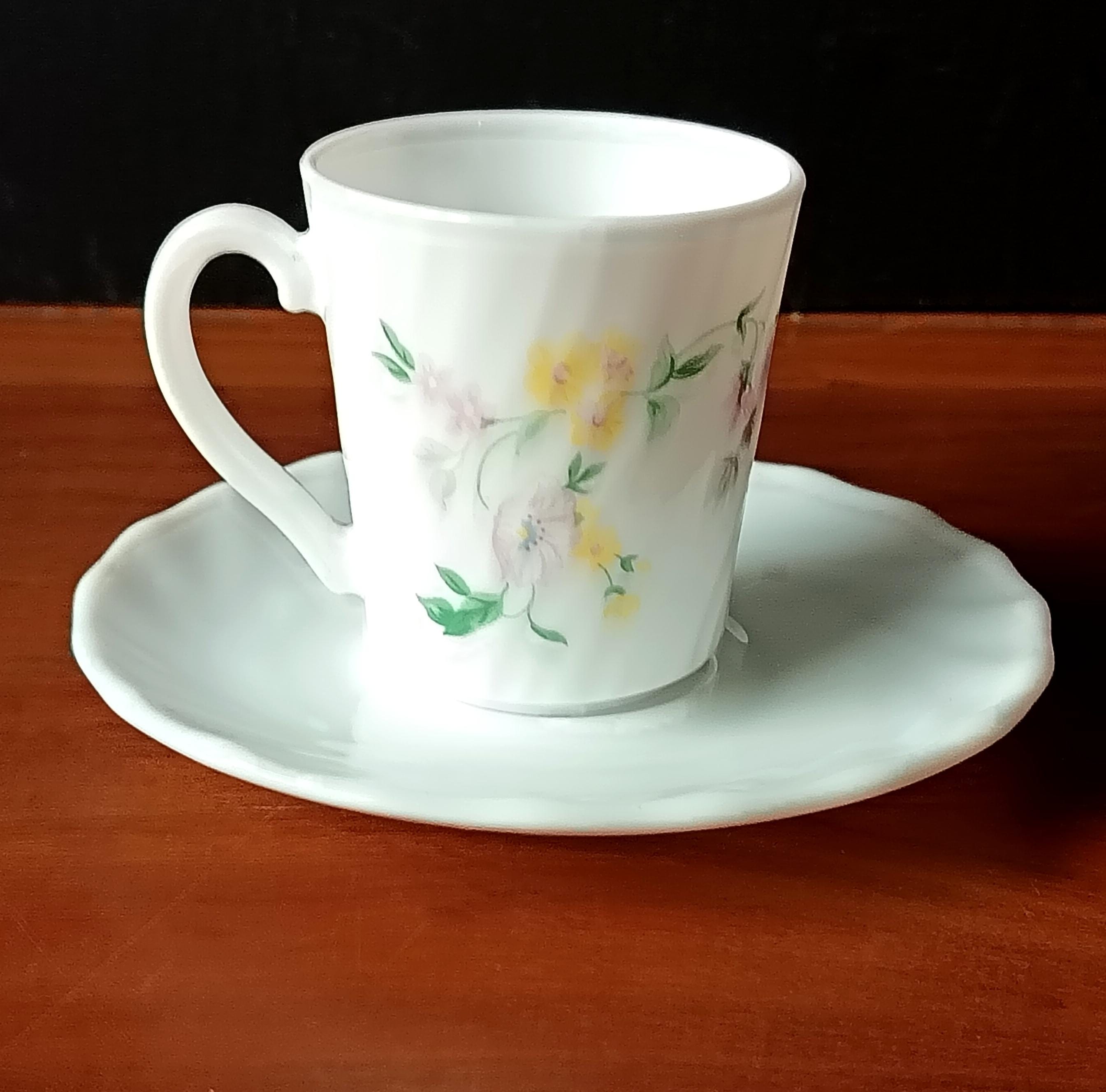 Set of 10 vintage Arcopal milk glass coffee cups and saucers with pretty multicoloured floral design, Hortense pattern Arcopal France.