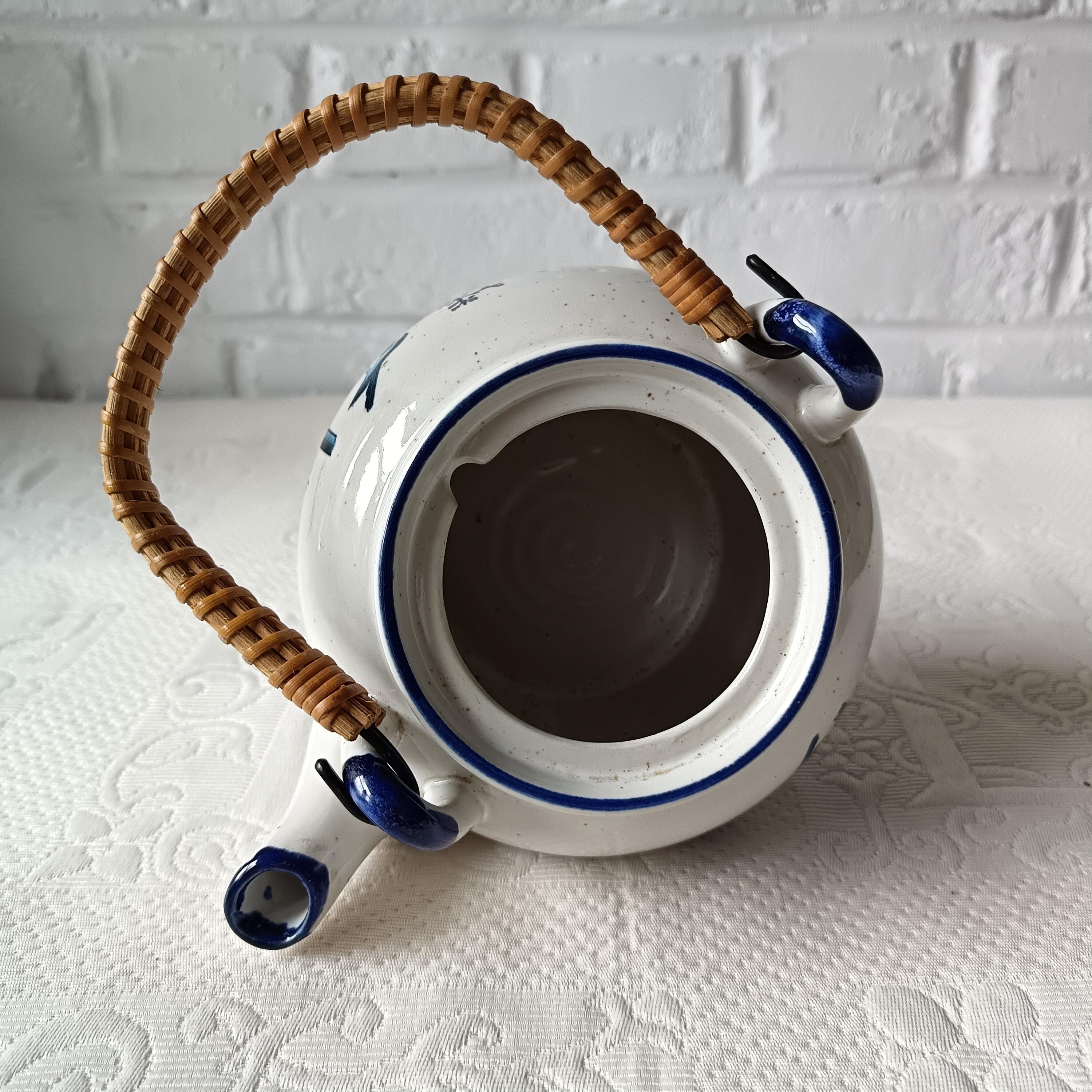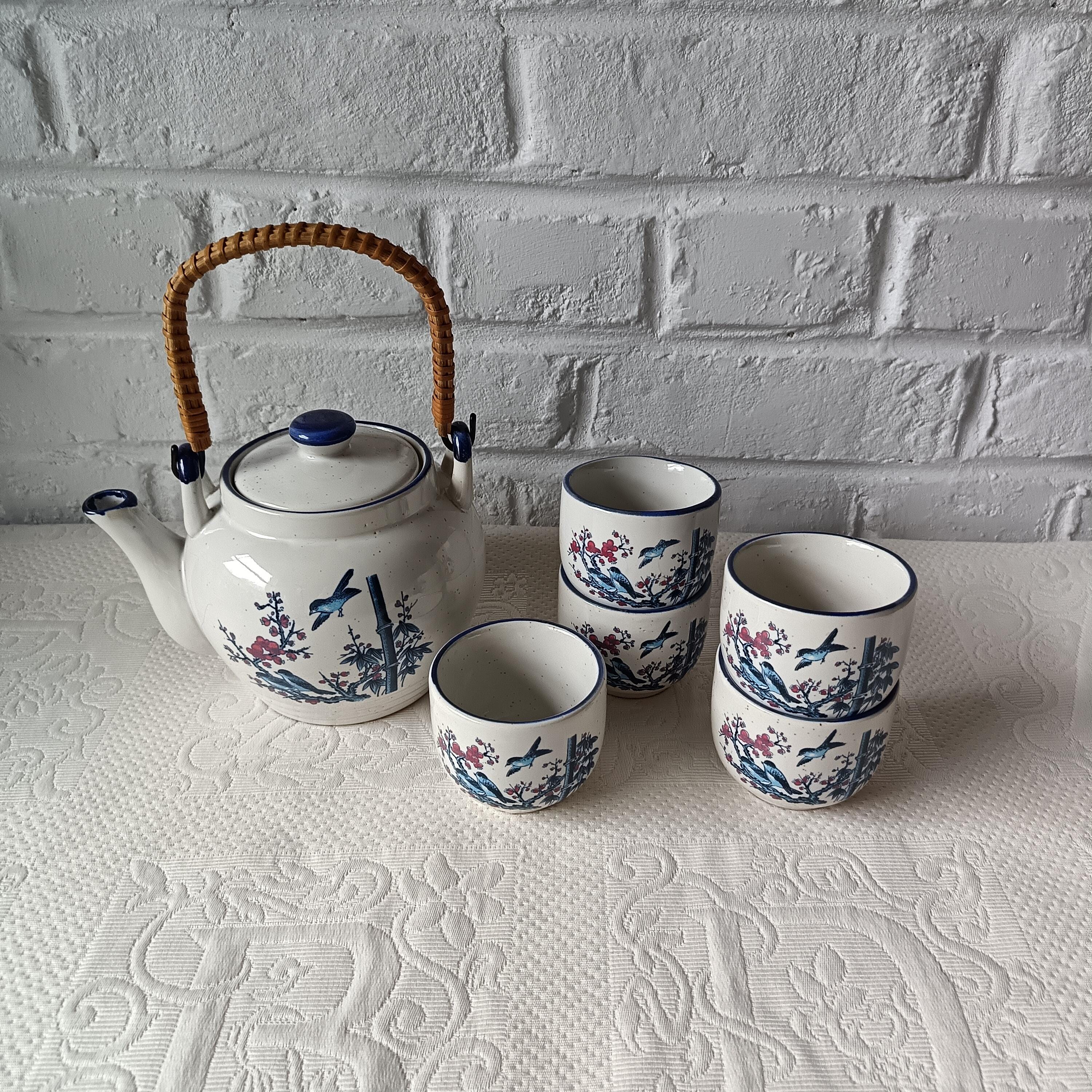 Beautiful tea service consisting of a ceramic teapot with rattan handle and 5 matching cups.