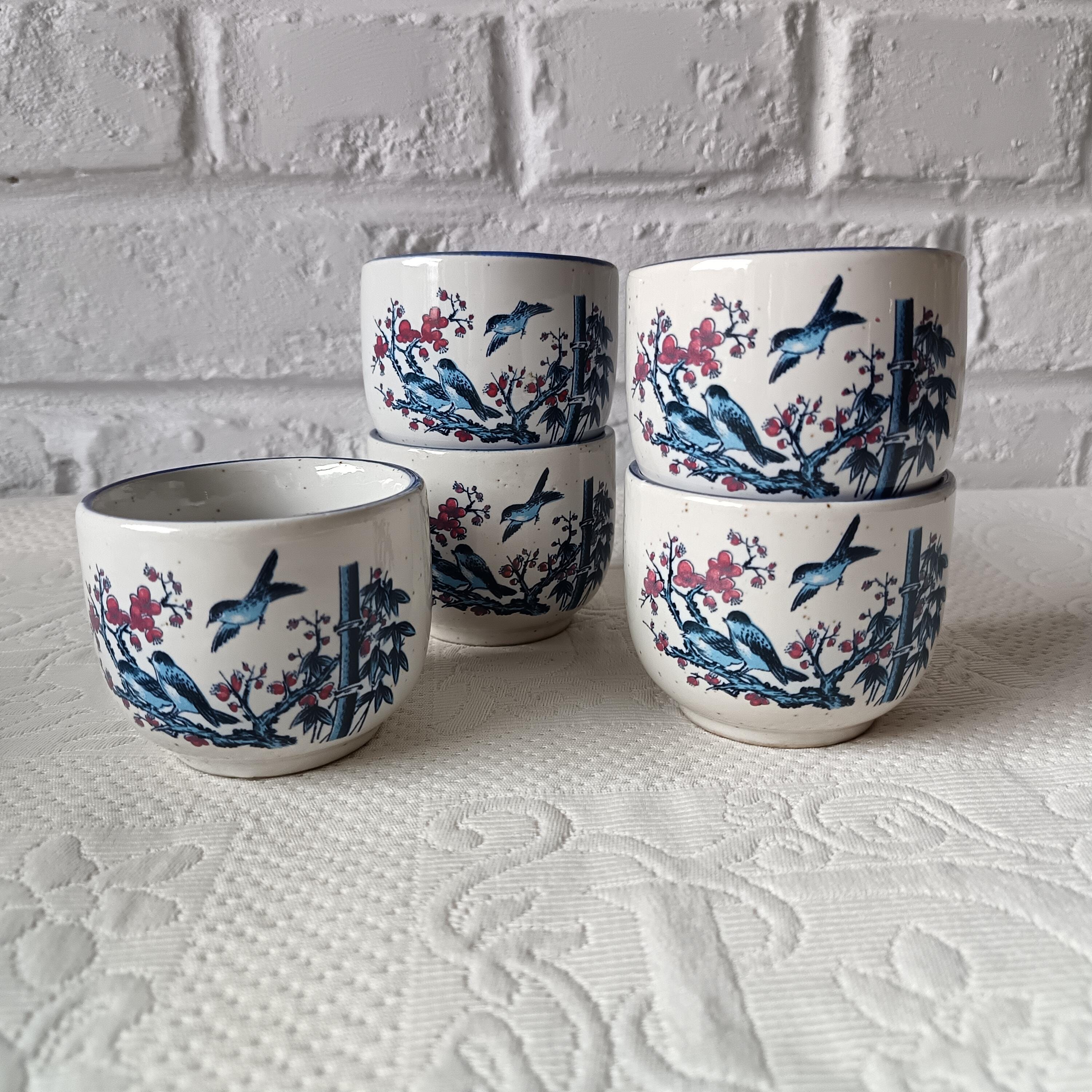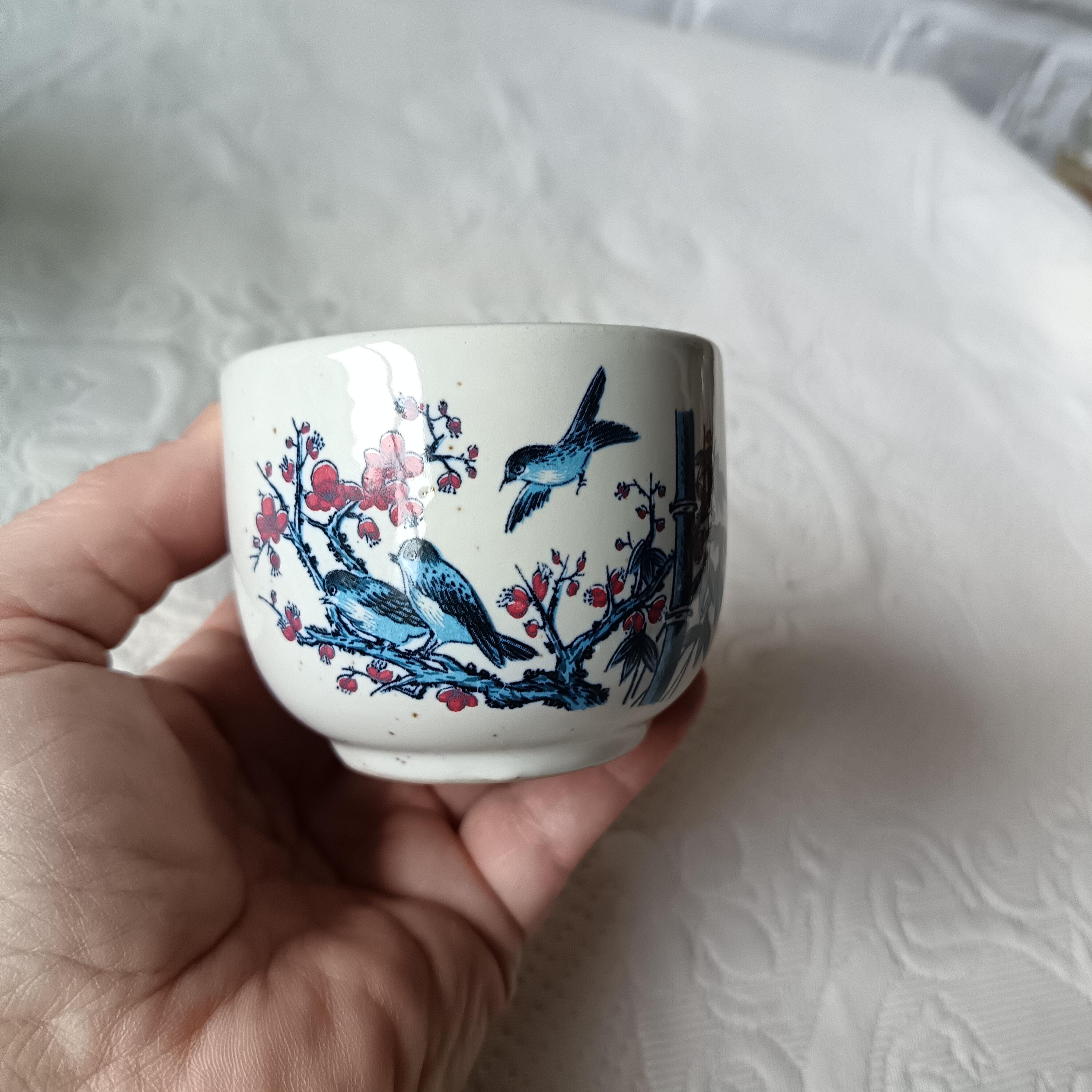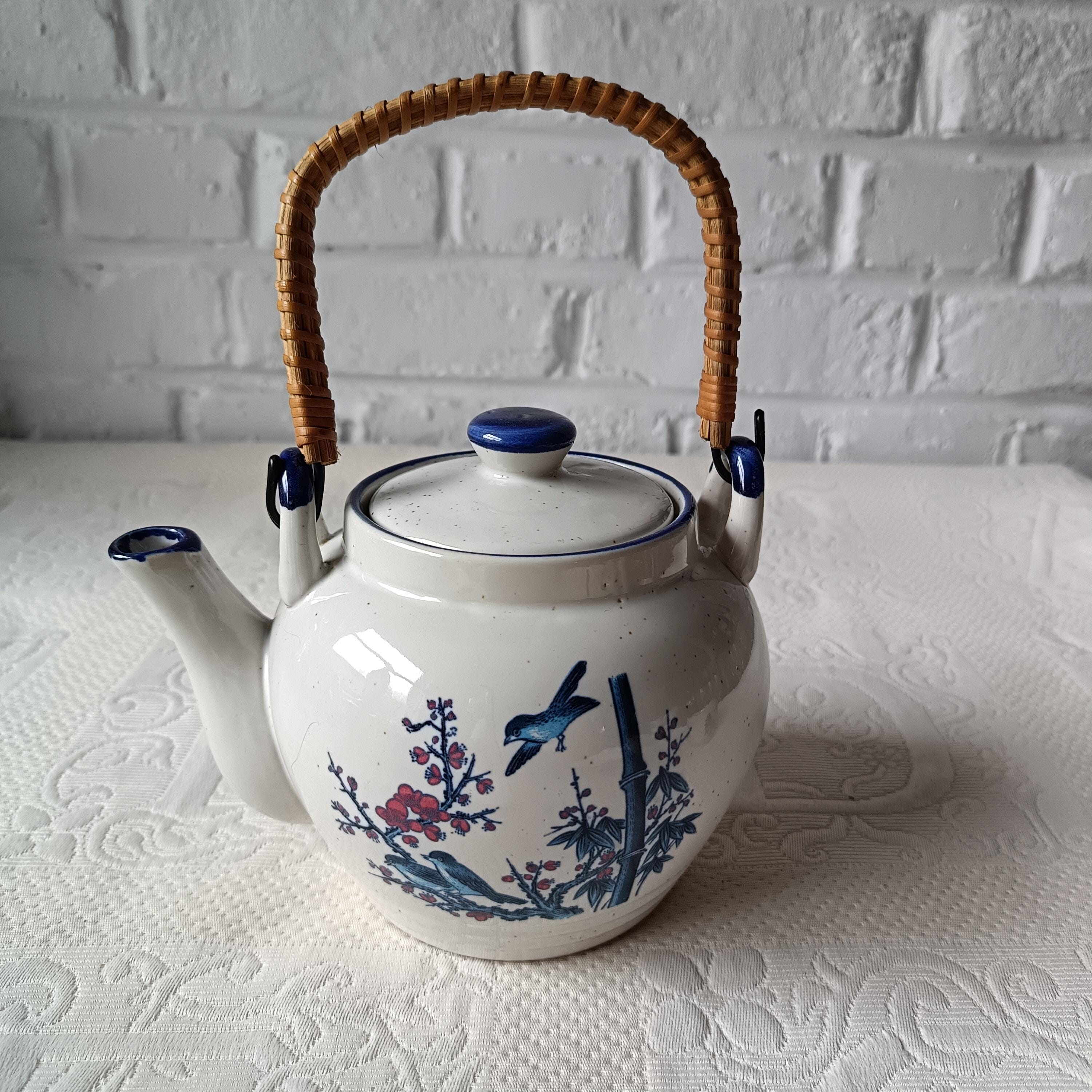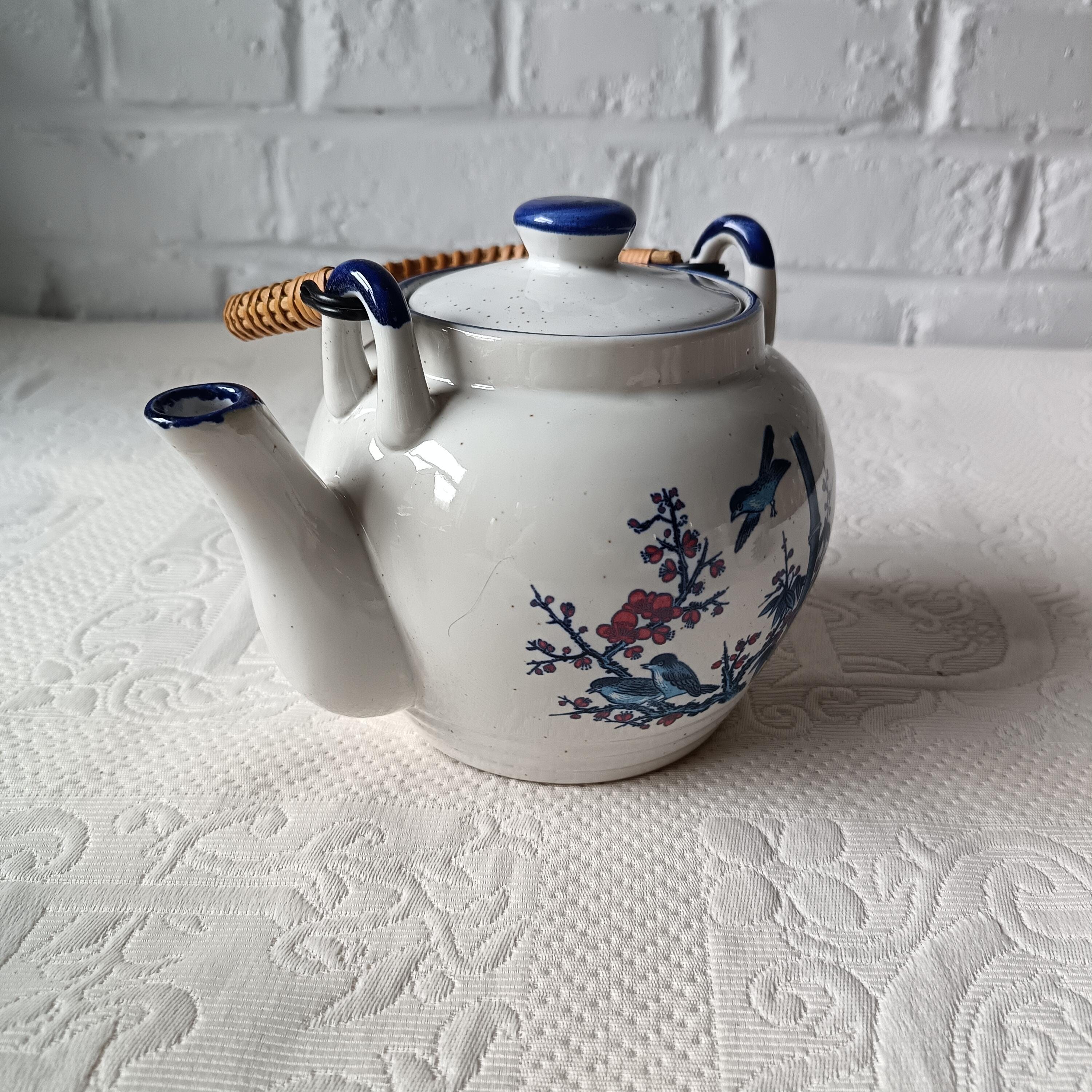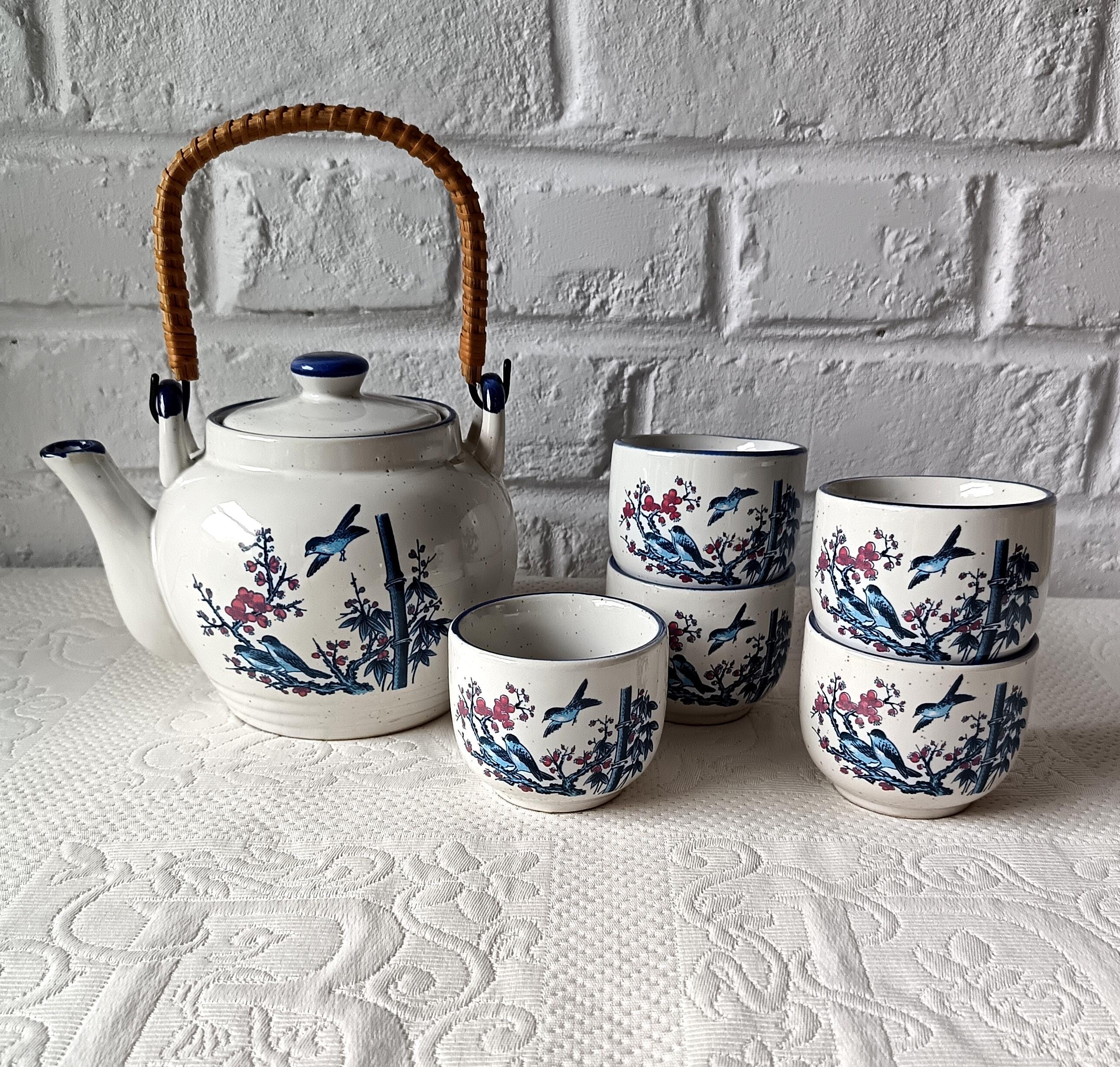 Exquisite Asian tea set in ceramic and rattan with a charming motif of small birds on flowering branches, 1980/90