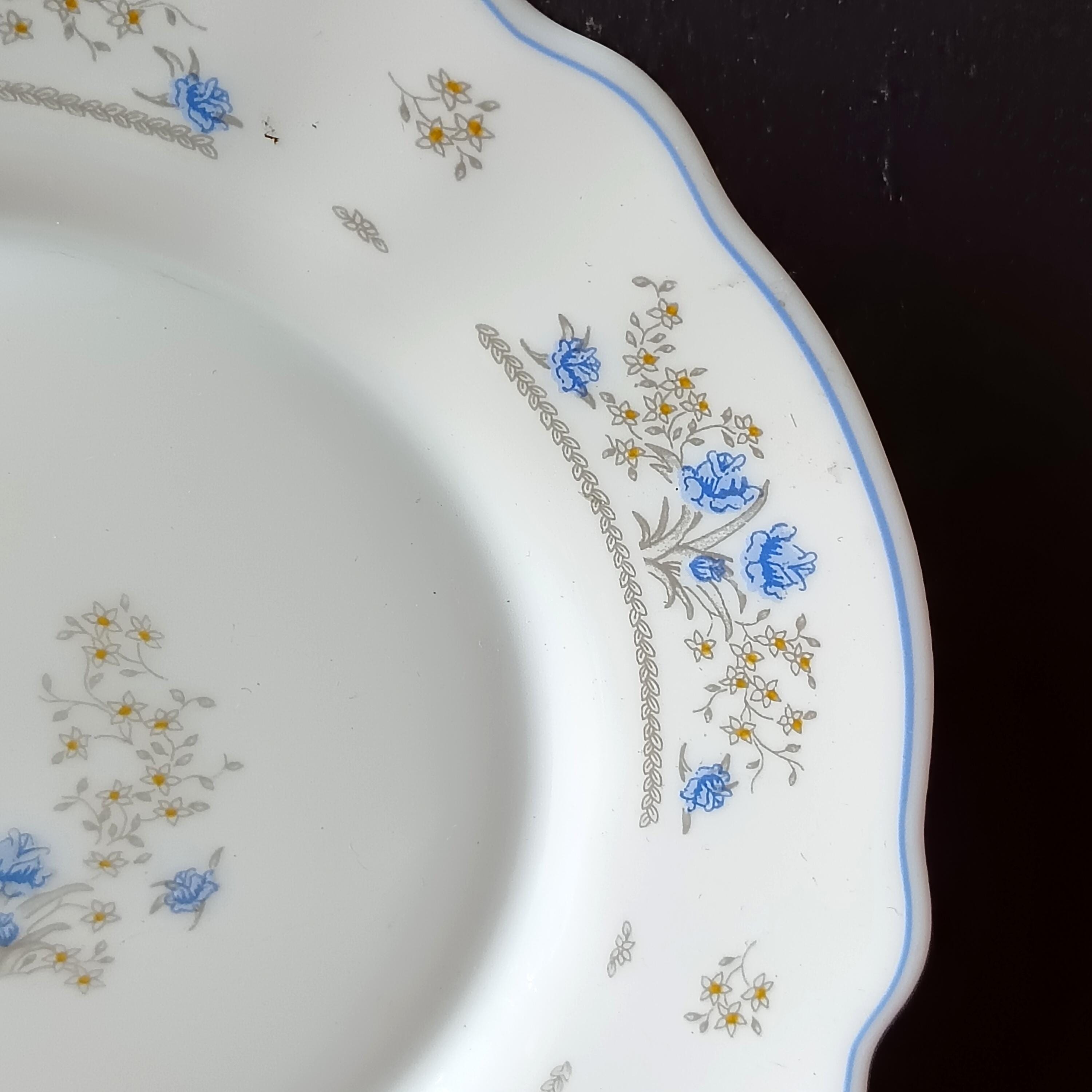 They are white in color with a delicate pattern of small flowers, this is the "Romantic" pattern from Arcopal France.