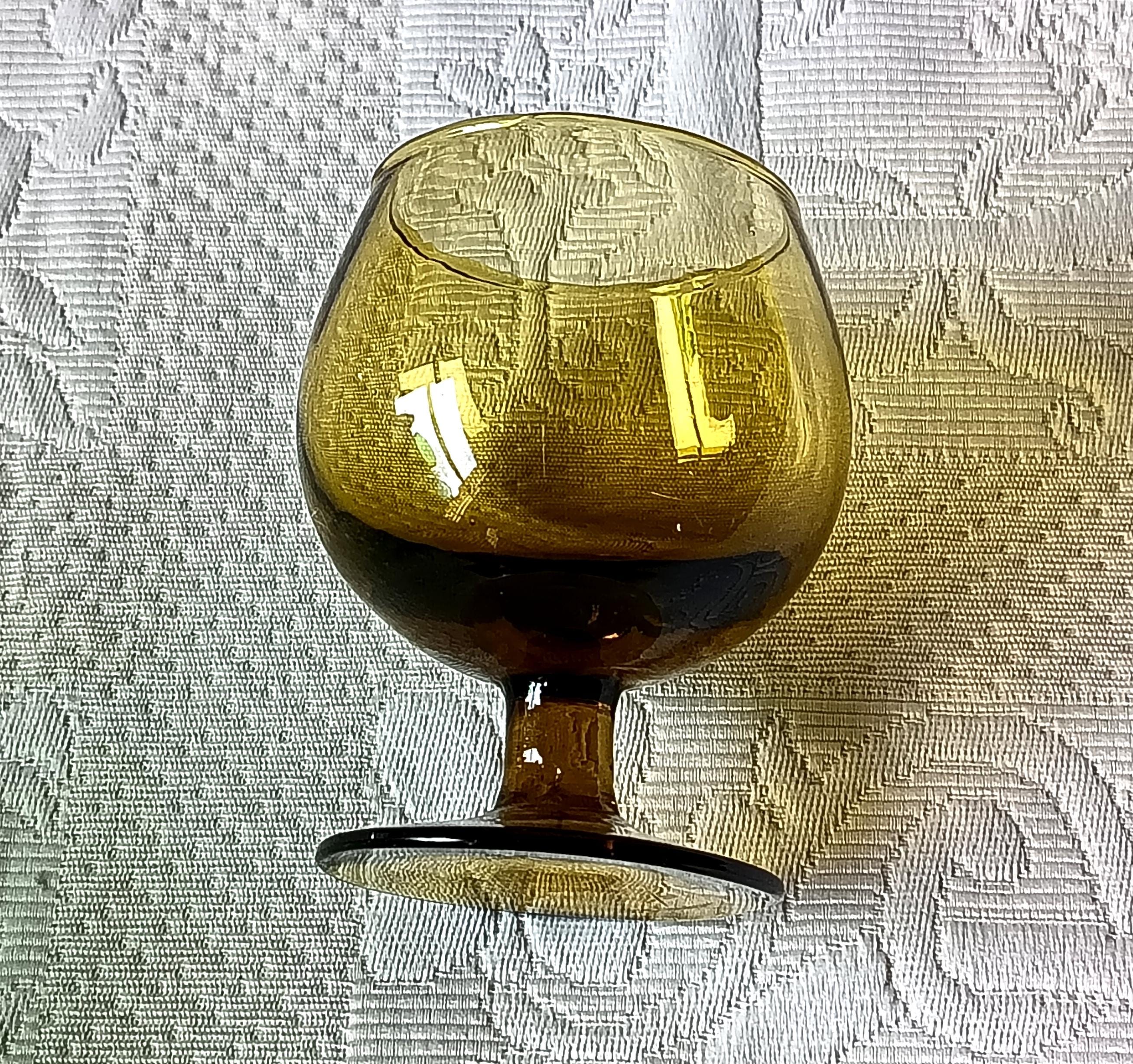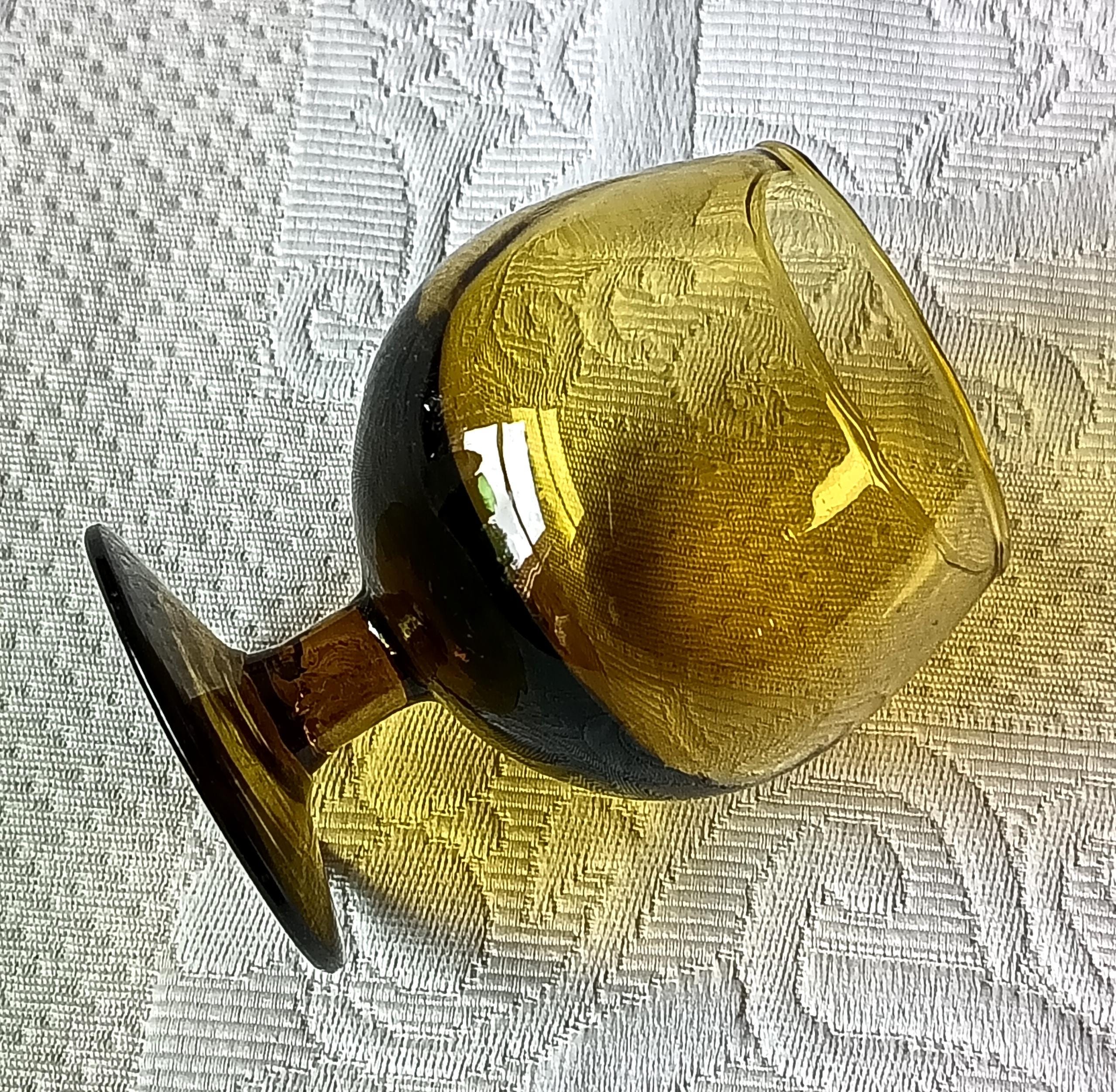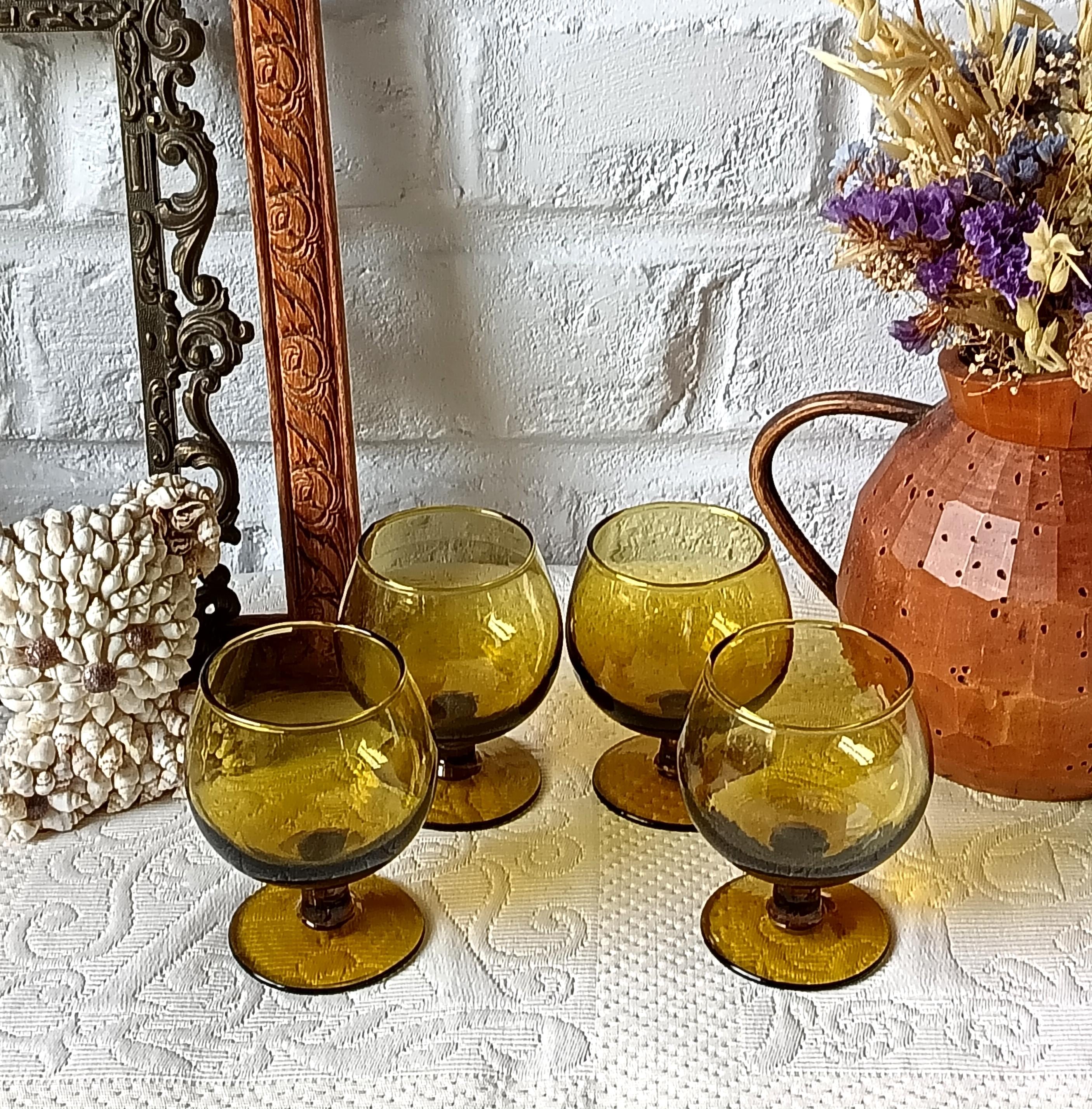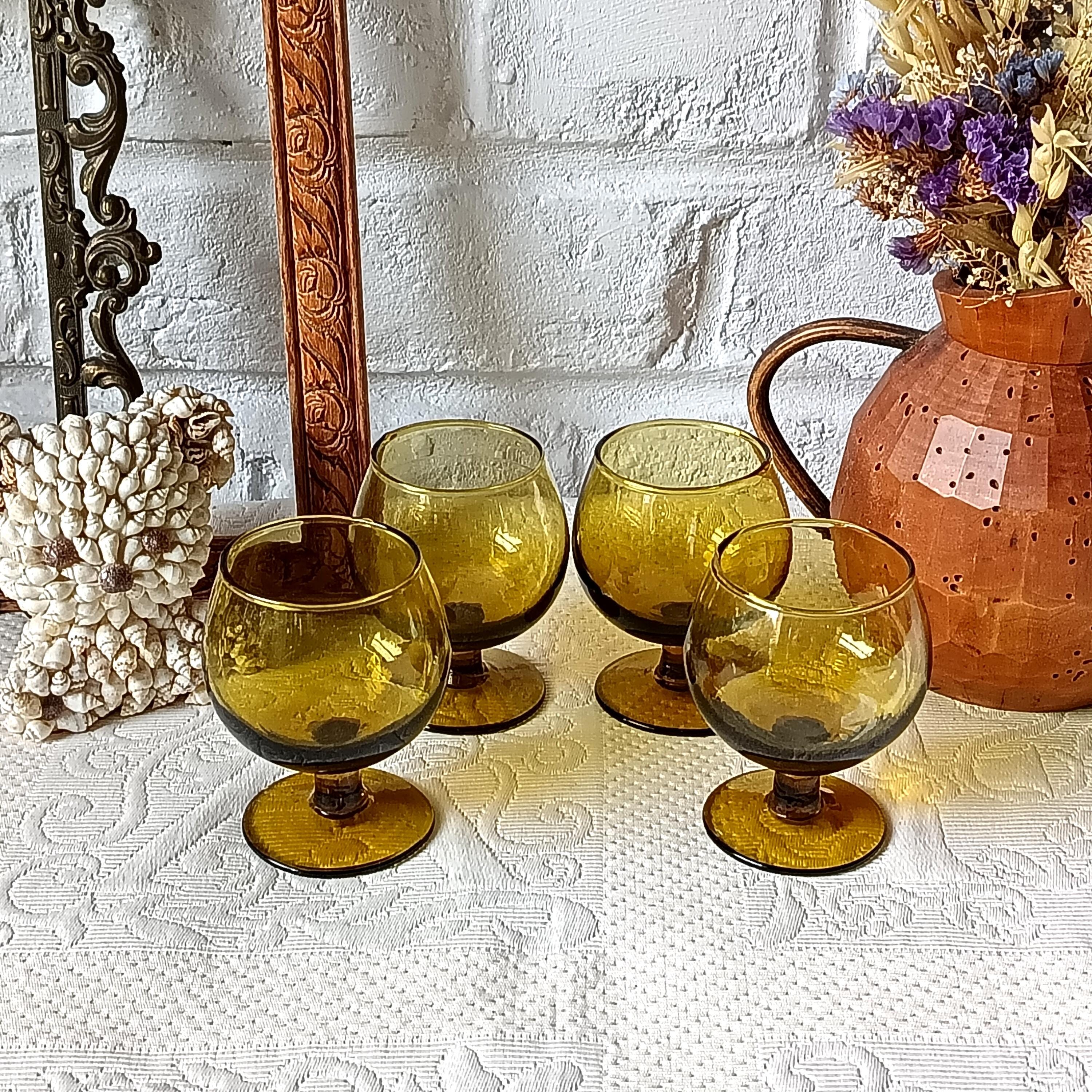 Four lovely vintage glasses from the 70s, perfect for aperitifs like port or liqueurs, in a beautiful amber-brown color. They will look magnificent on a white tablecloth.