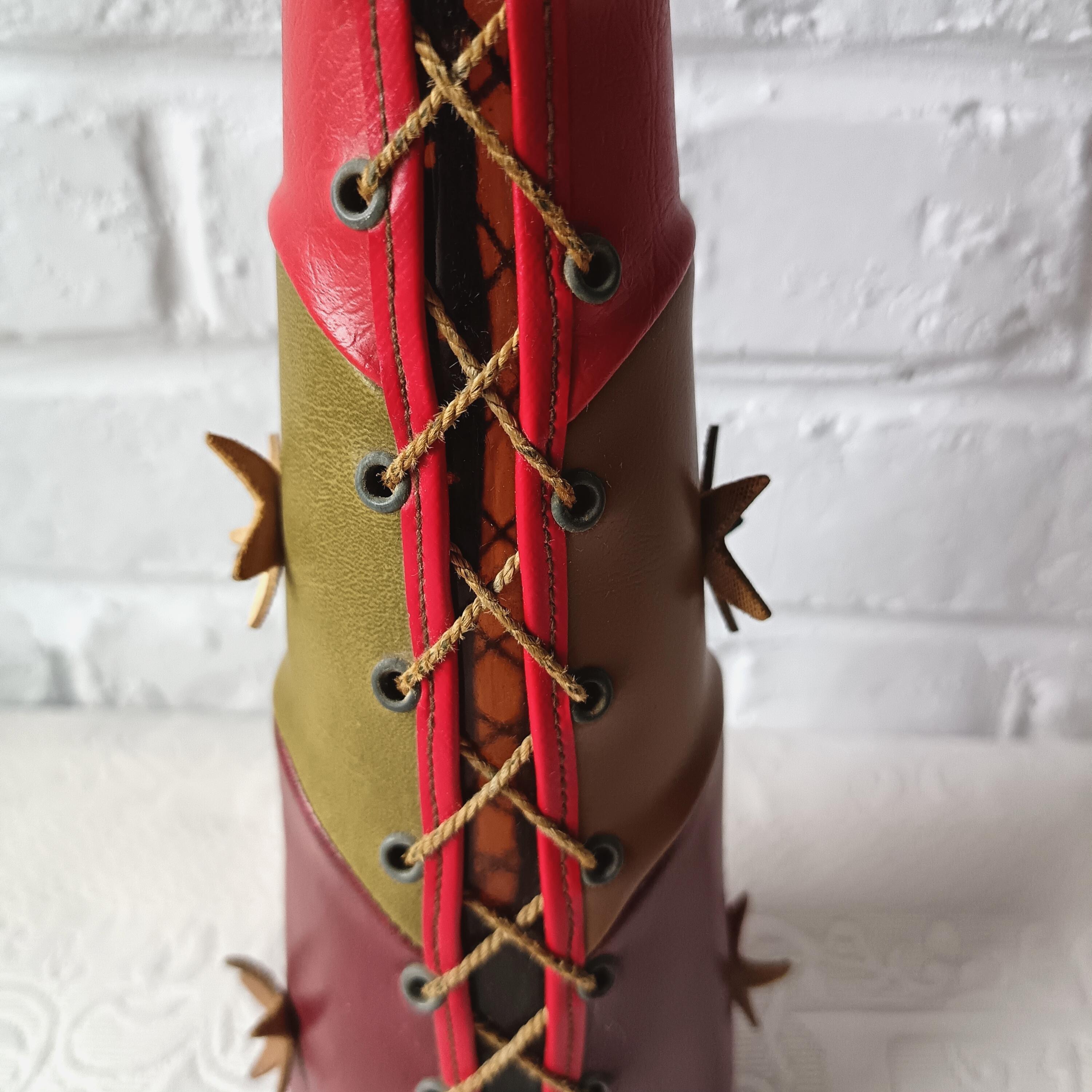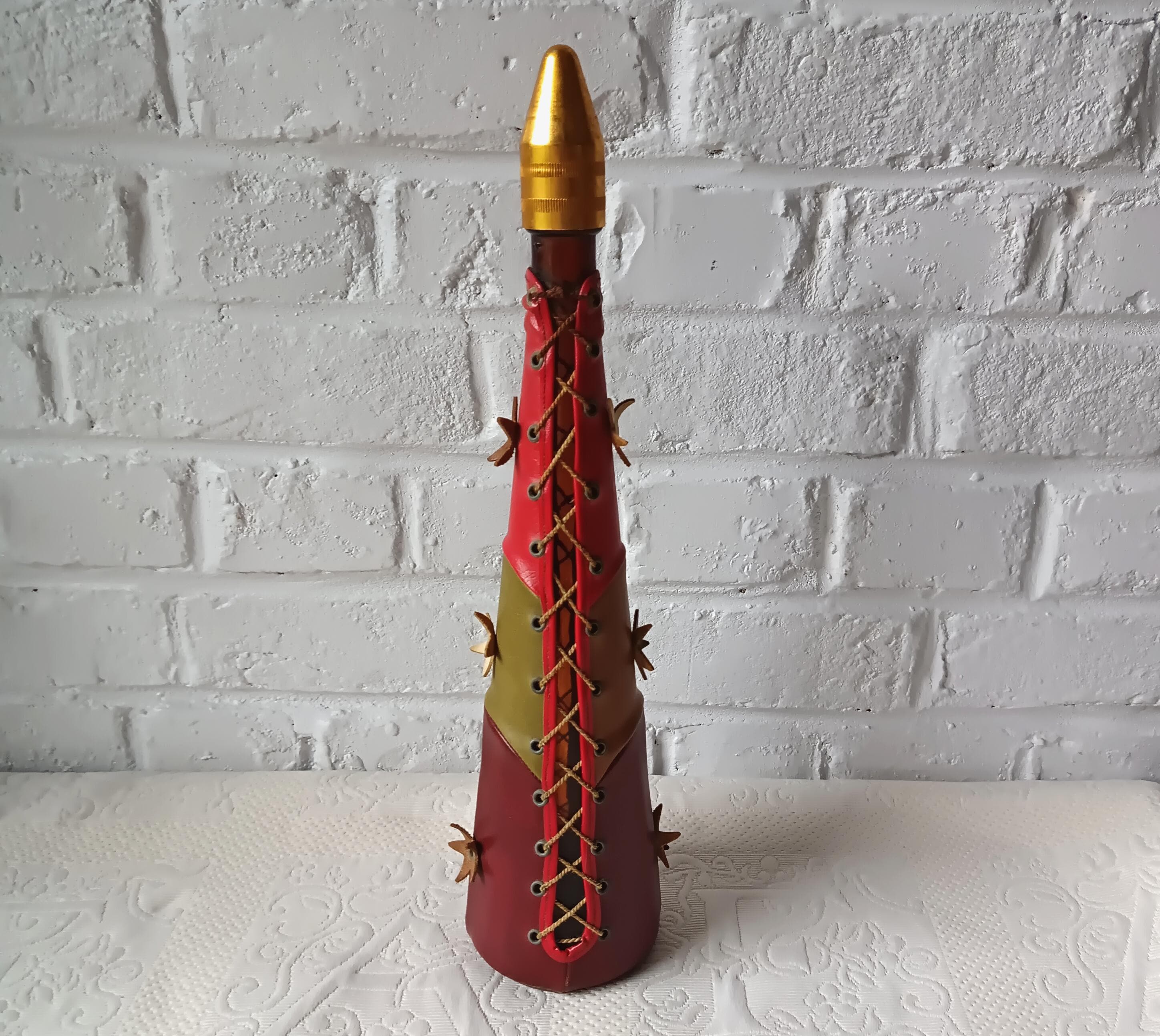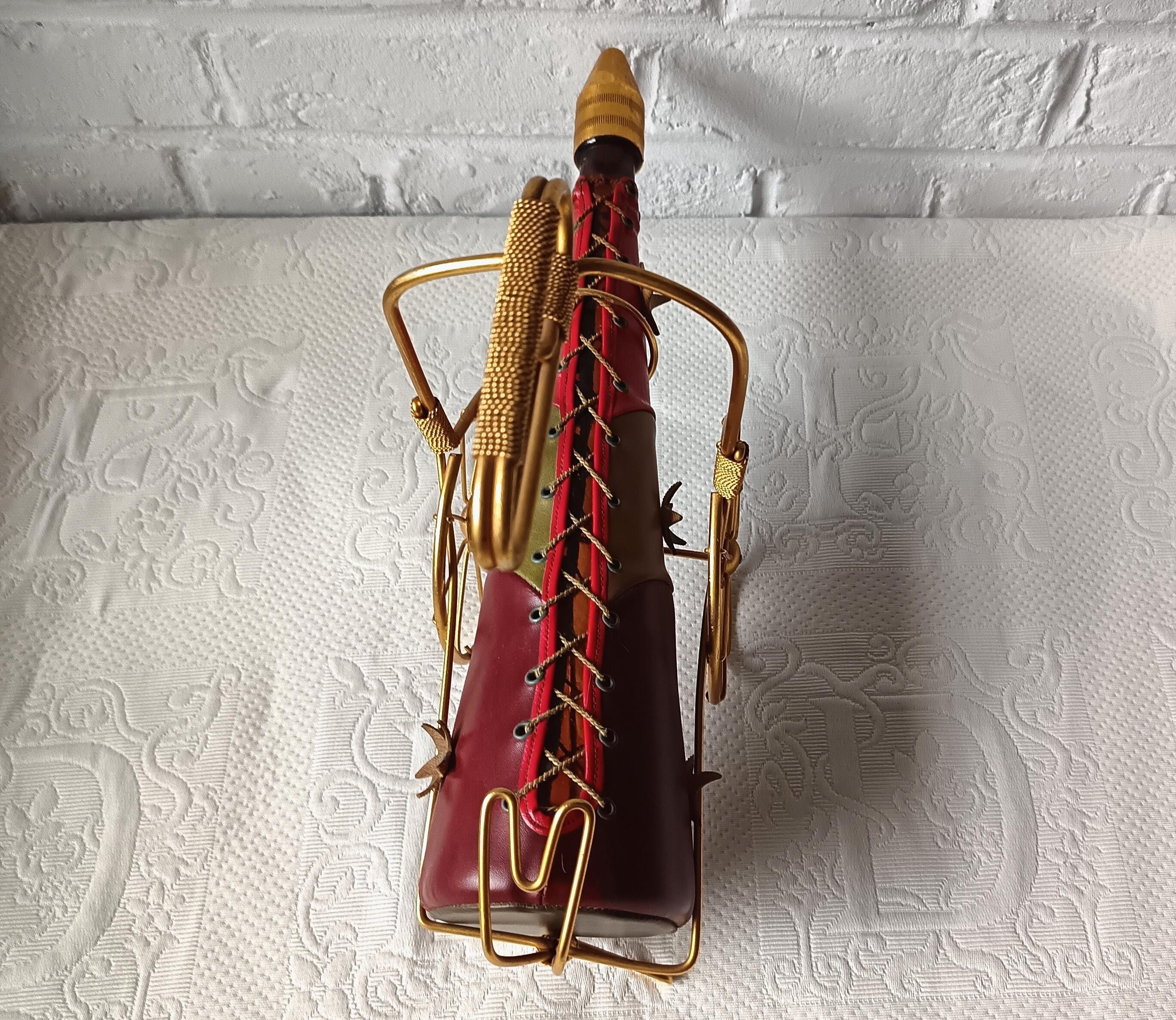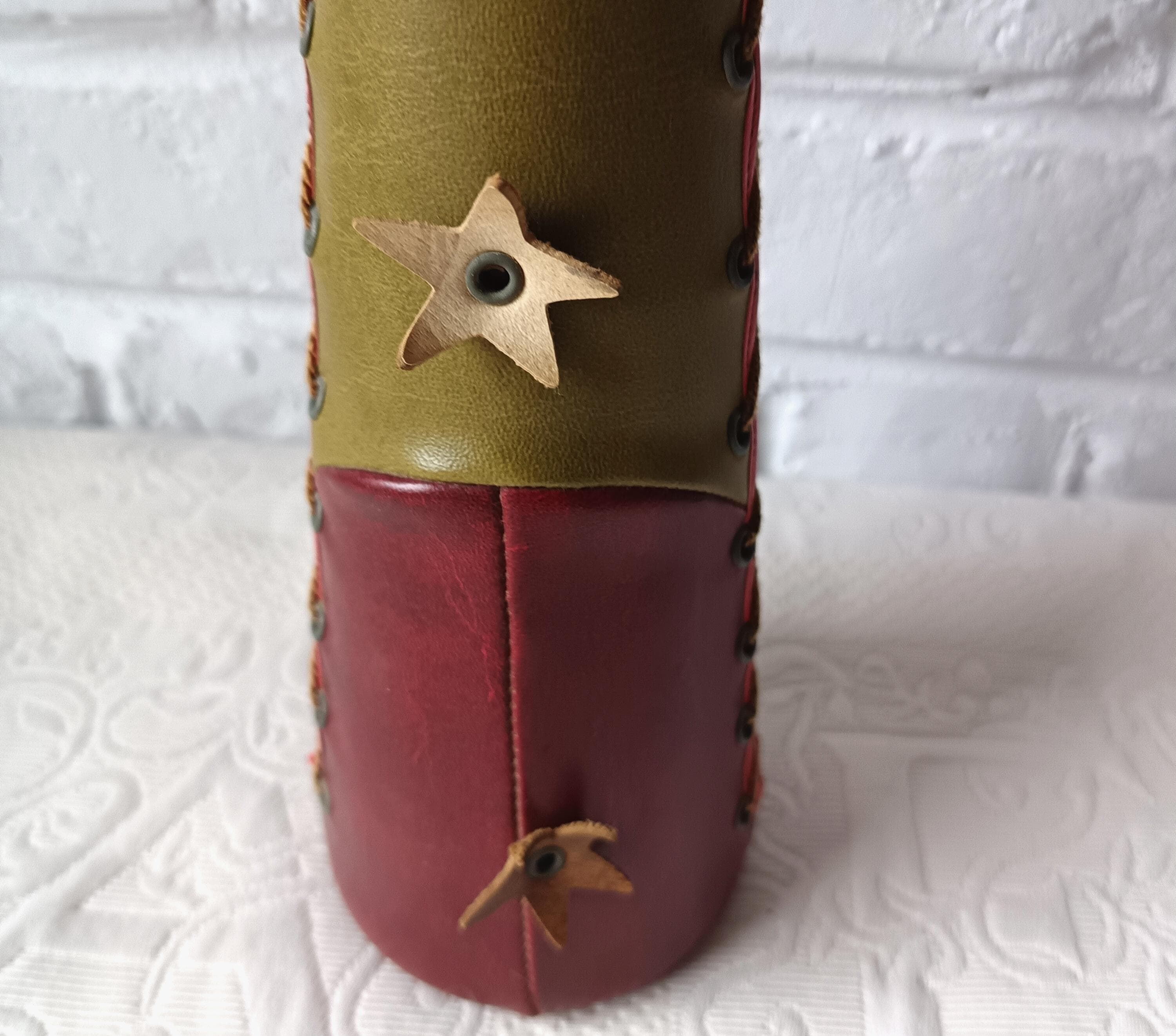 Large glass bottle, encased in vintage leather on a gold-tone metal trolley stand. Handmade, likely in Spain, the leather features three colors: red, brown, and burgundy, adorned with leather stars and lacing on each side. The bottle is sealed with a cork stopper topped with a gold-tone metal cap. The metal stand allows for direct pouring without removing the bottle from the stand.