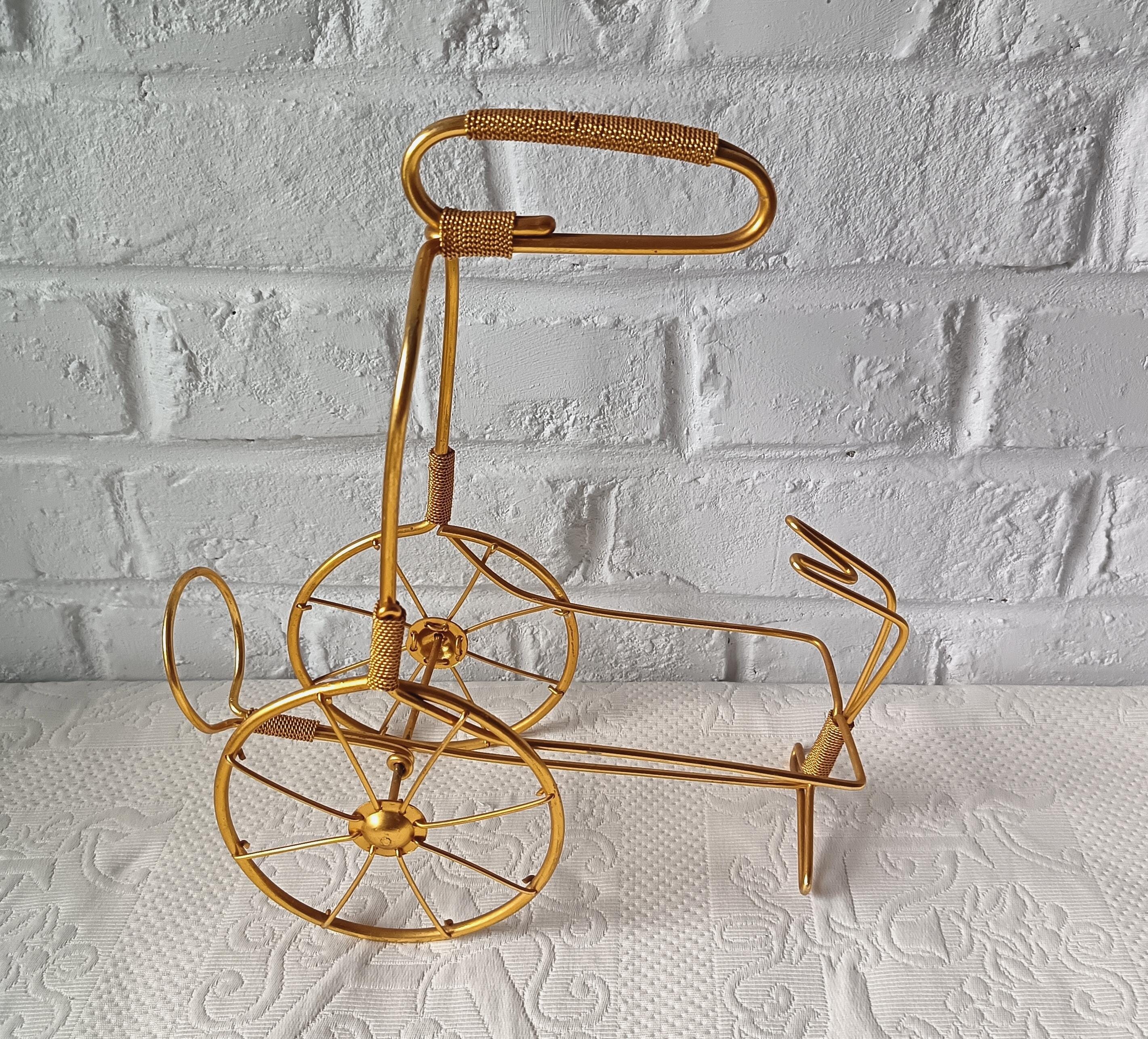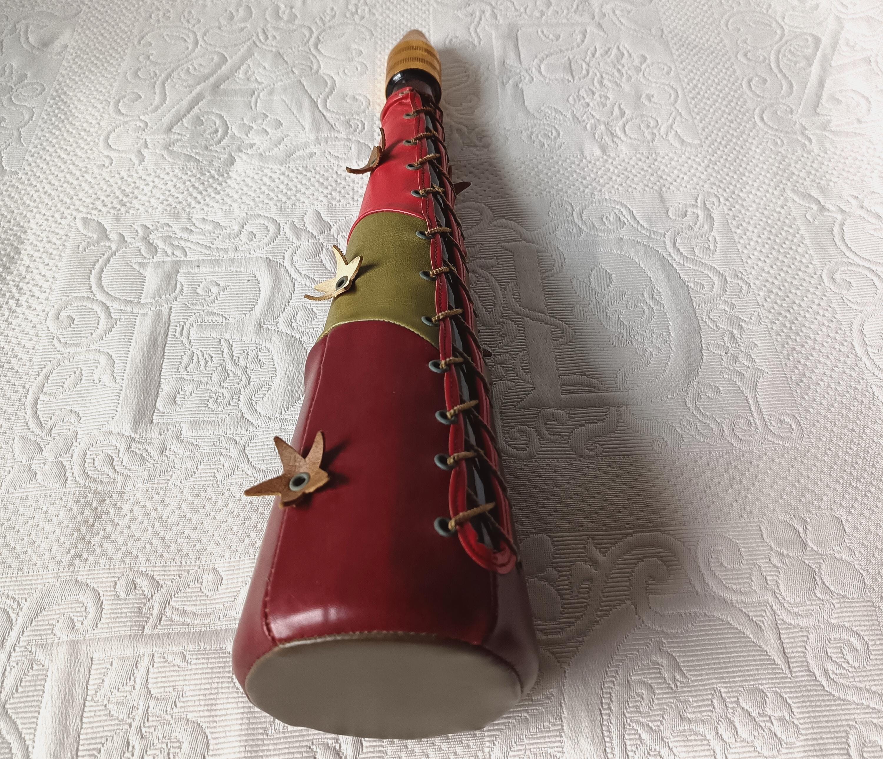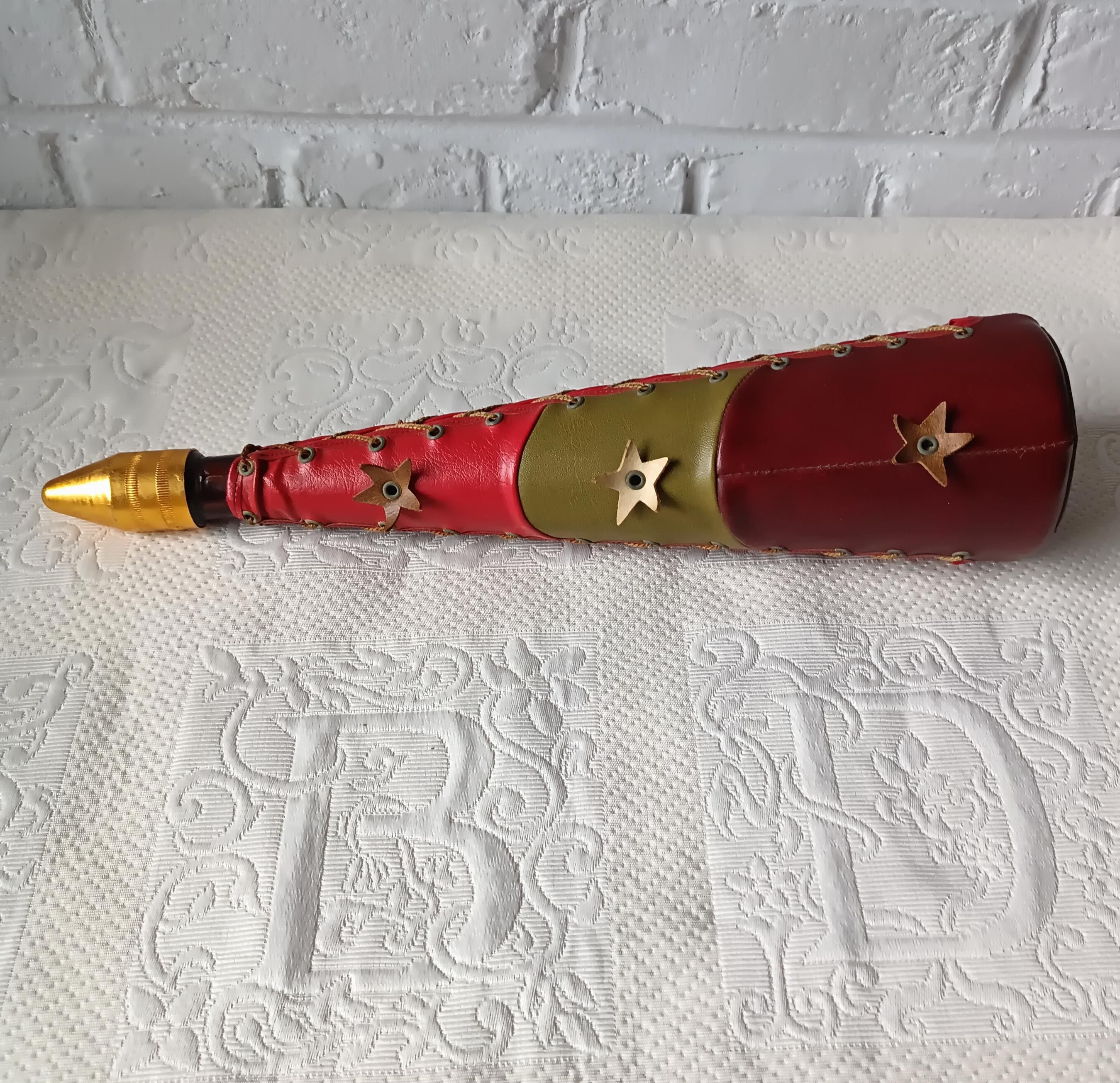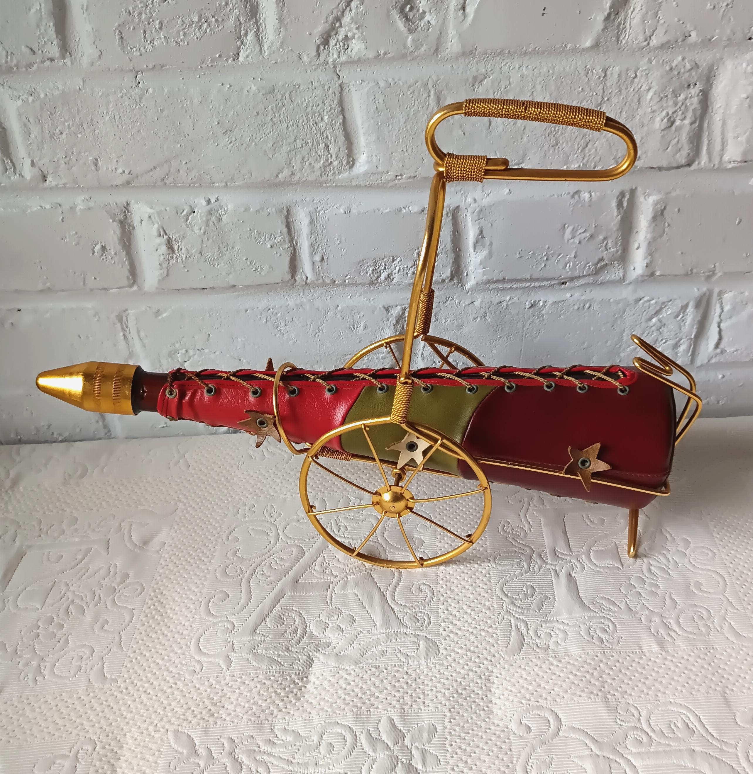 Large glass bottle, encased in vintage leather on a gold-tone metal trolley stand. Handmade, likely in Spain, the leather features three colors: red, brown, and burgundy, adorned with leather stars and lacing on each side. The bottle is sealed with a cork stopper topped with a gold-tone metal cap. The metal stand allows for direct pouring without removing the bottle from the stand.