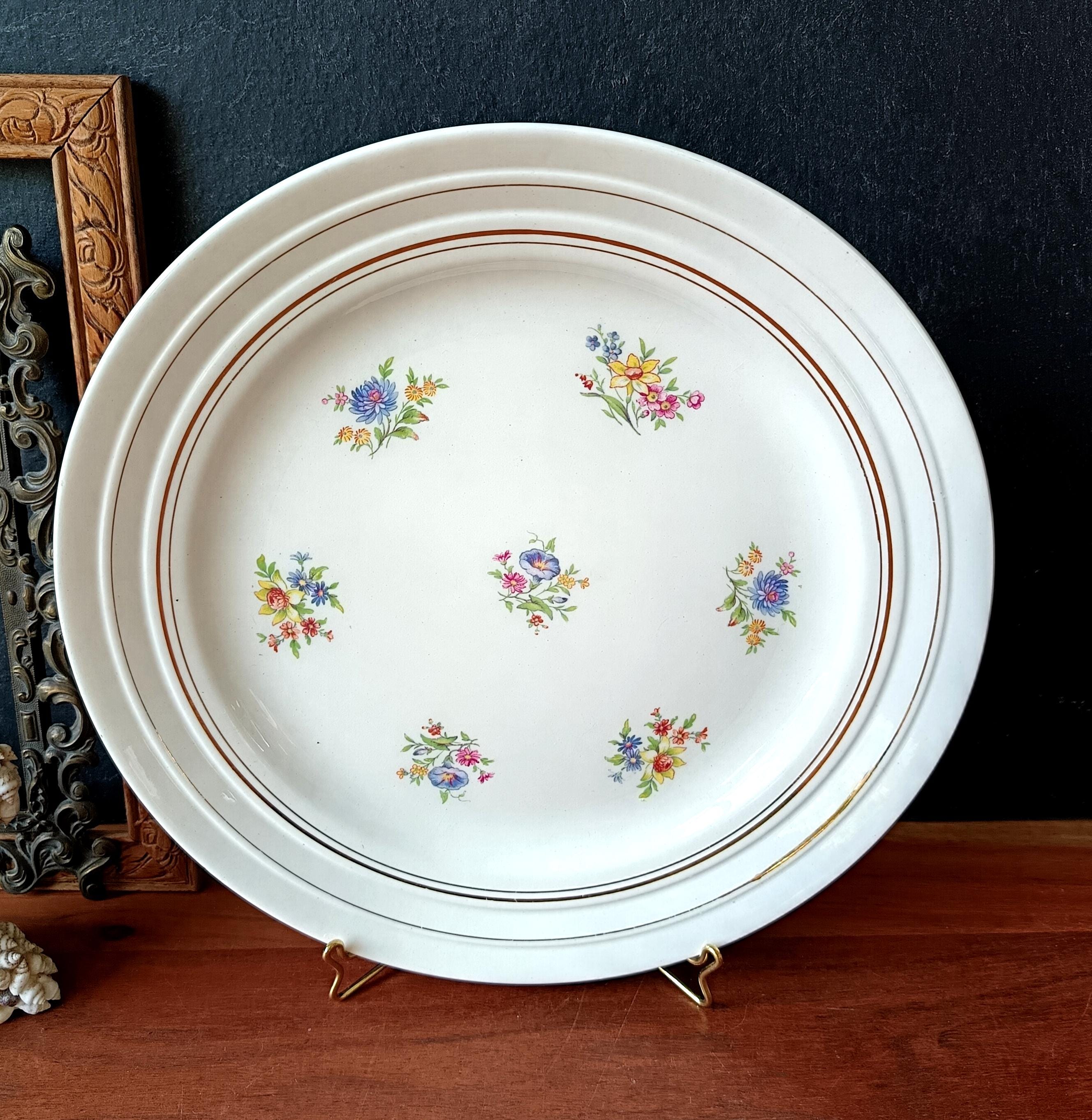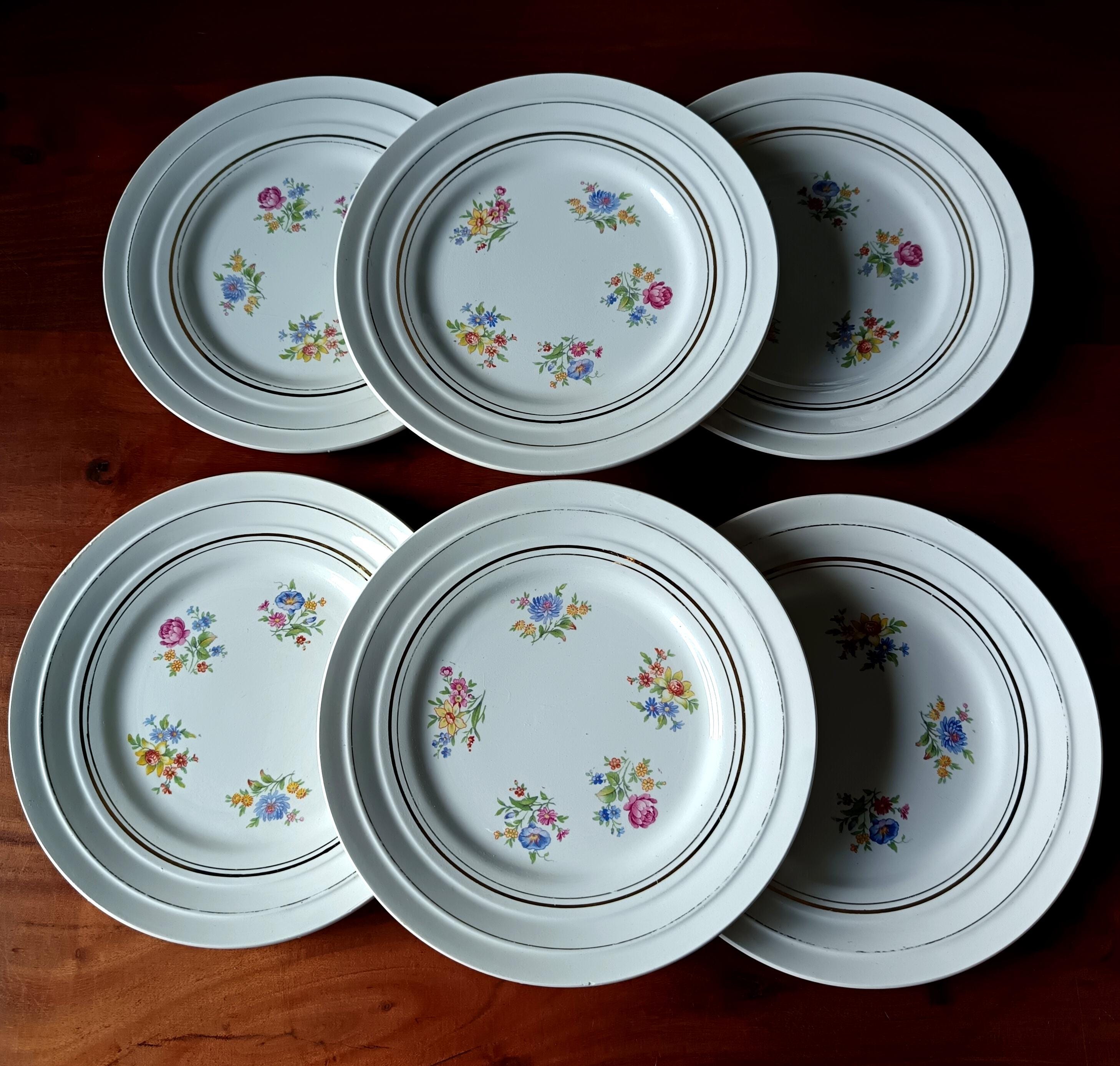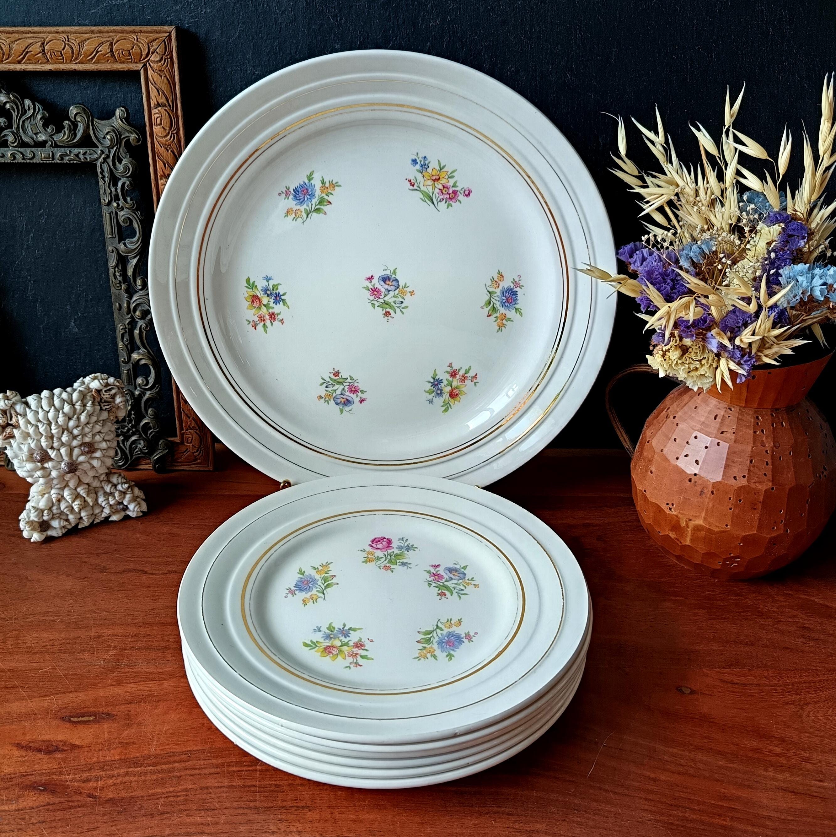 Joli service à dessert composé d'un plat rond et de 6 assiettes dessert en porcelaine vintage. Elles ont un décor multicolore, elles sont ornées de petits bouquets floraux.