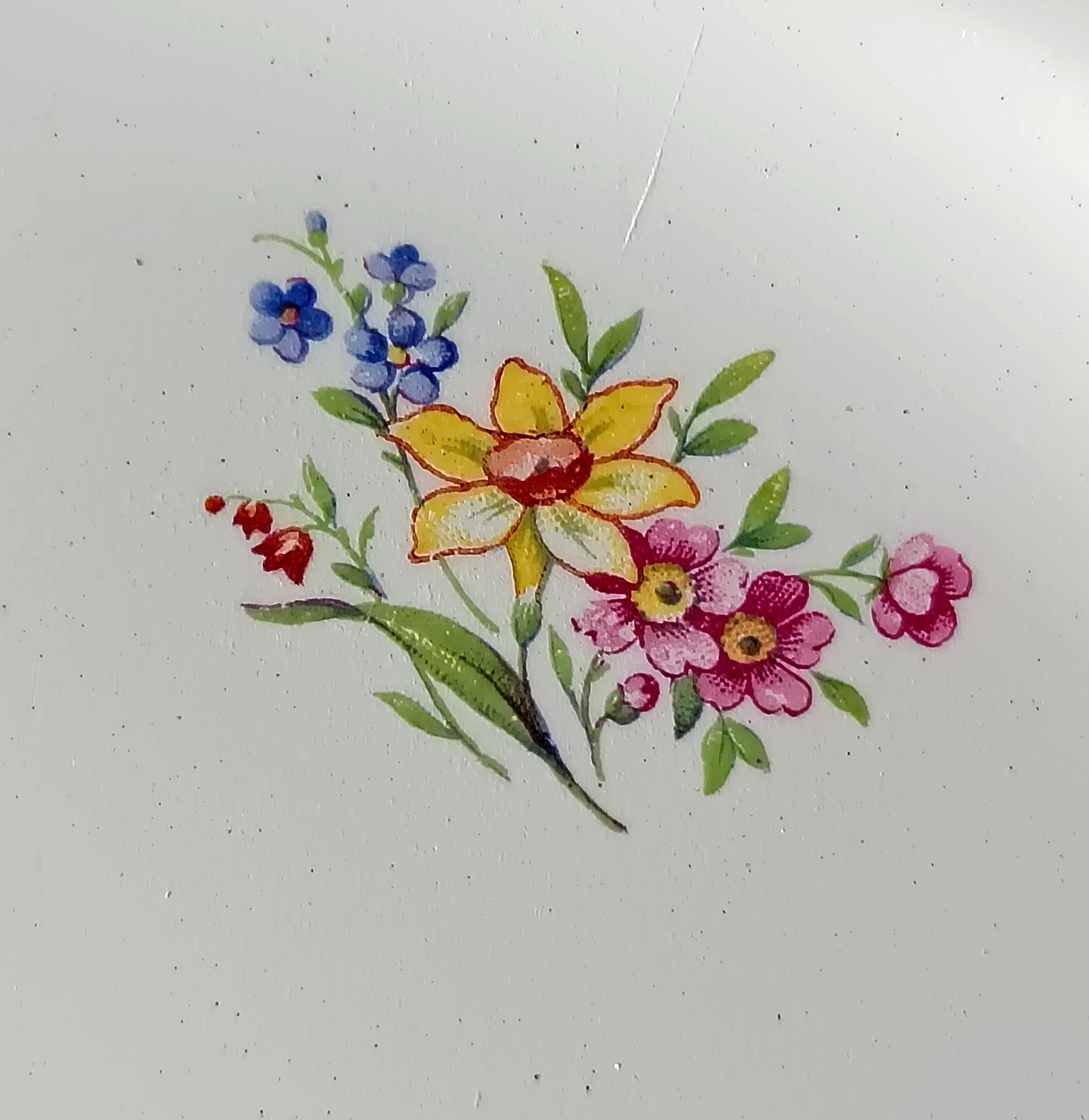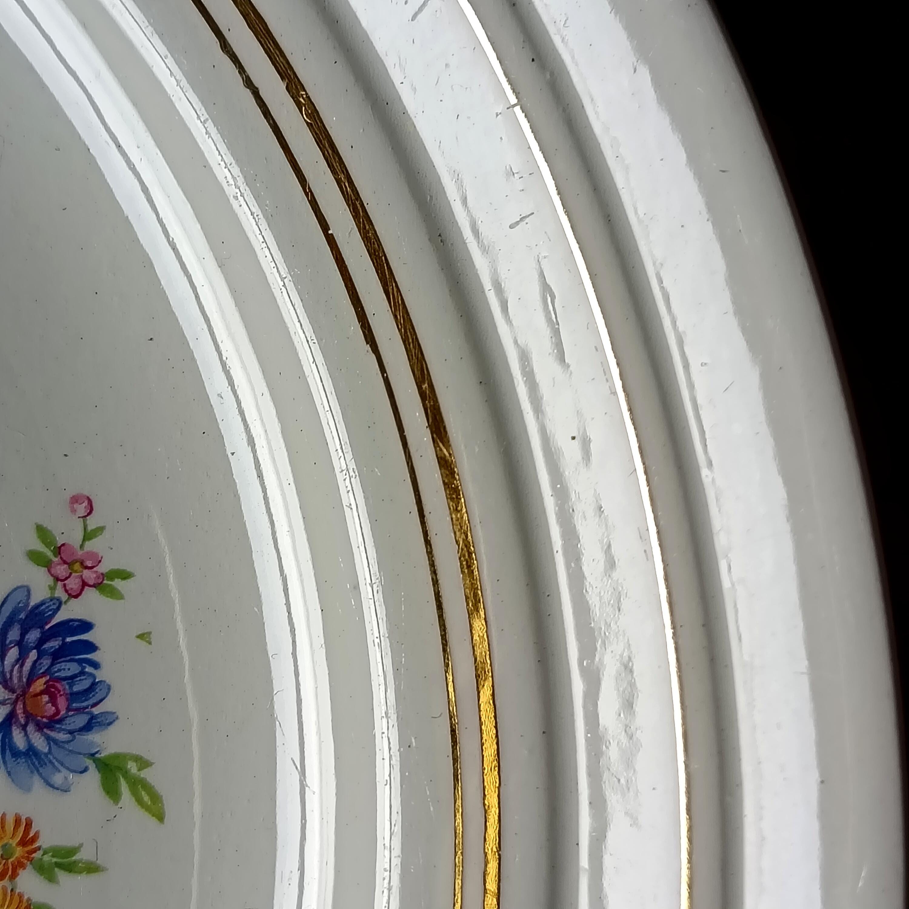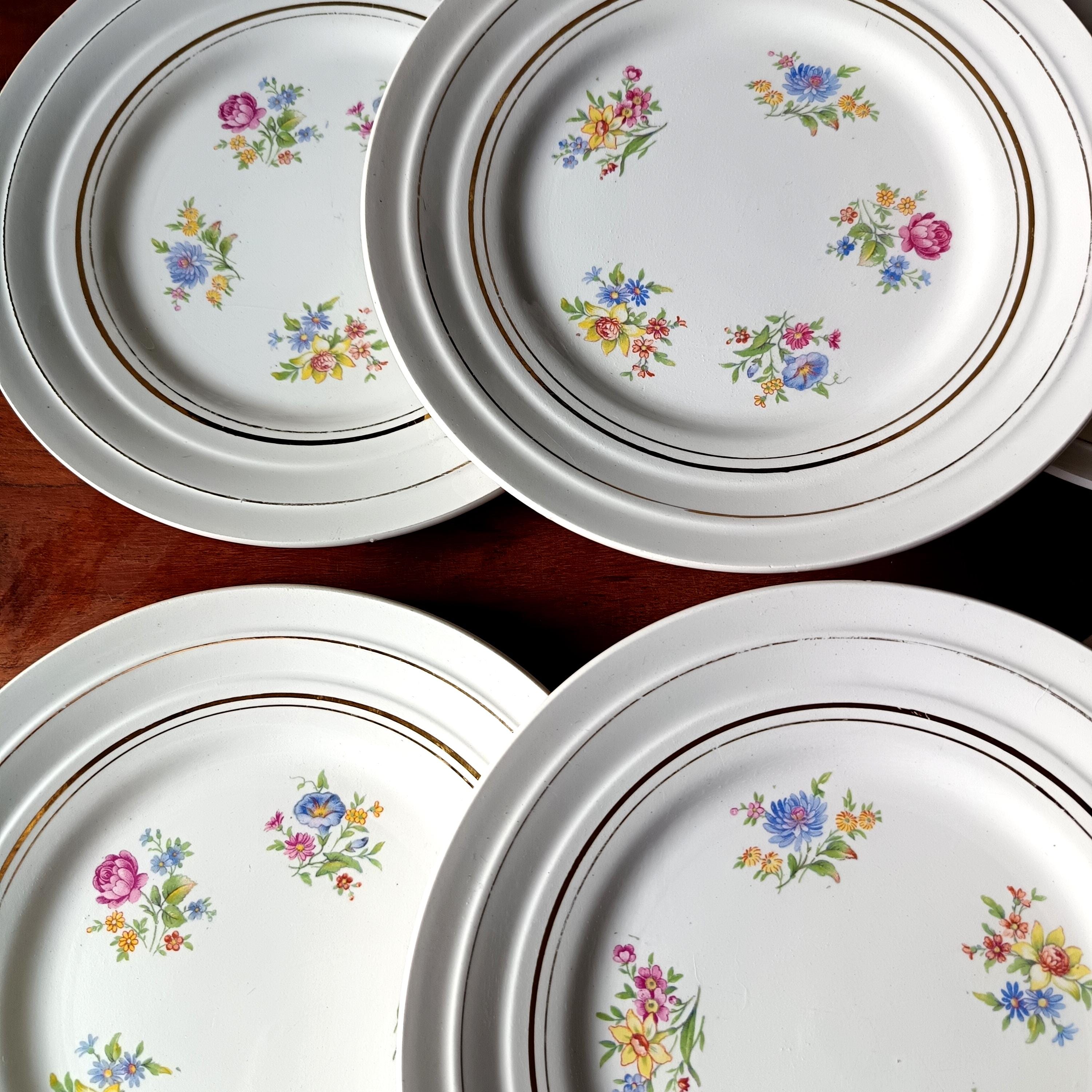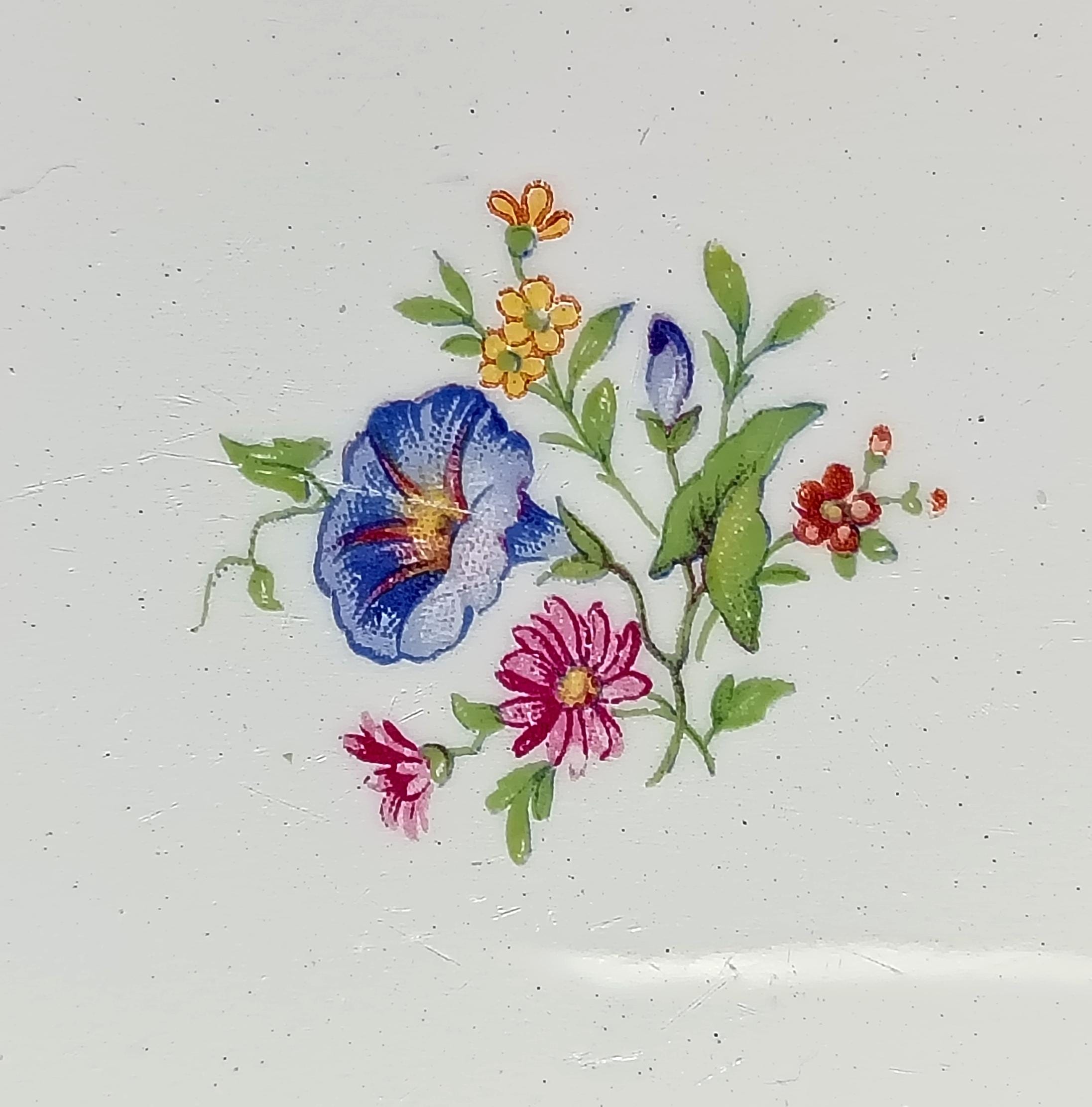 Joli service à dessert composé d'un plat rond et de 6 assiettes dessert en porcelaine vintage. Elles ont un décor multicolore, elles sont ornées de petits bouquets floraux.