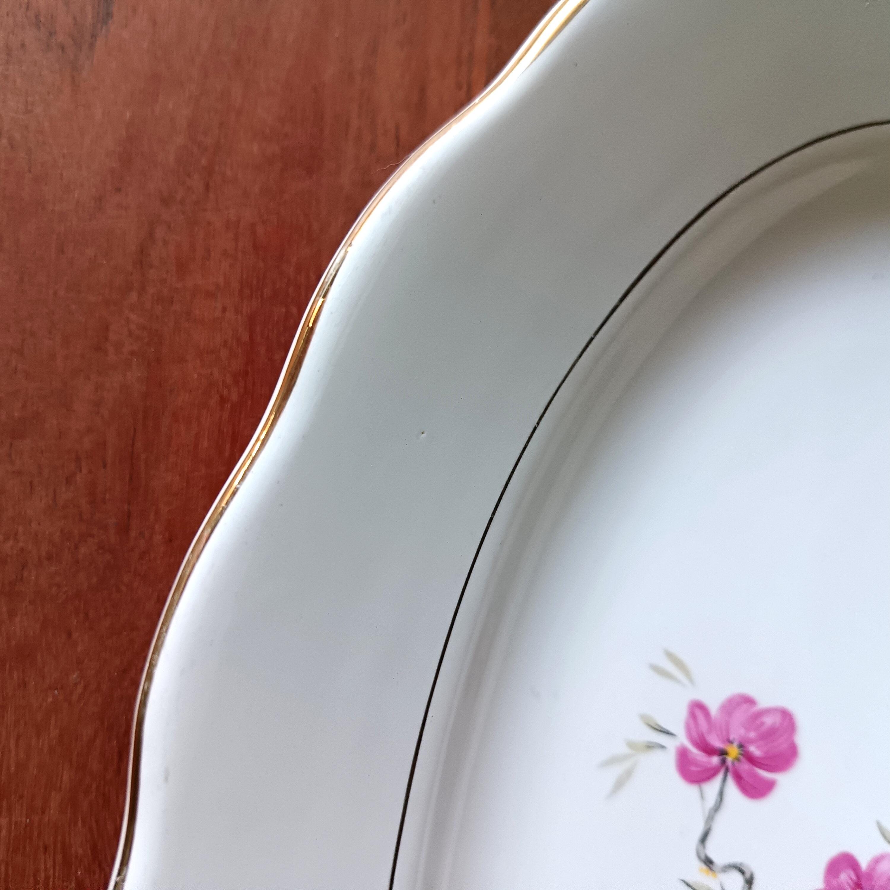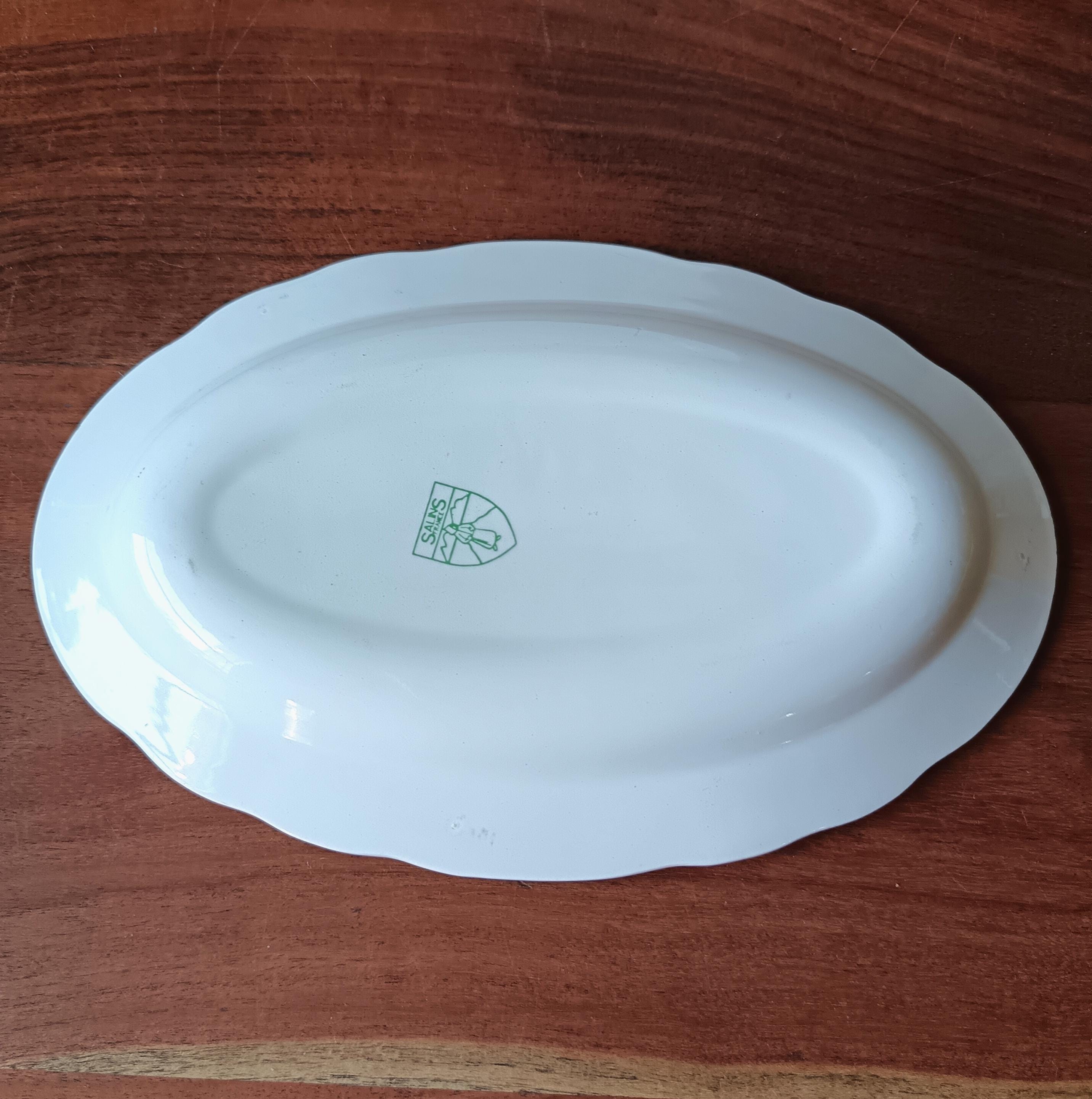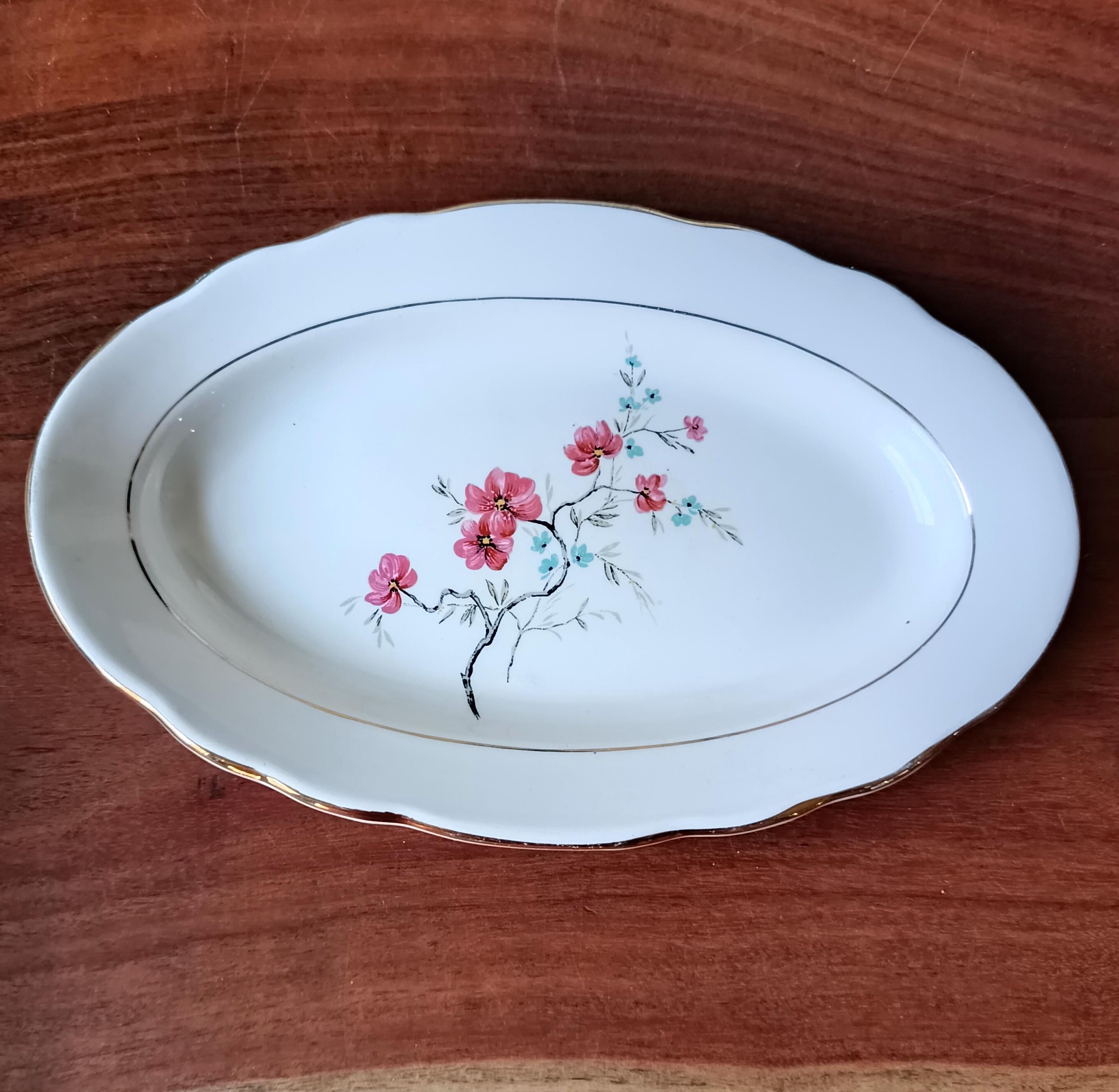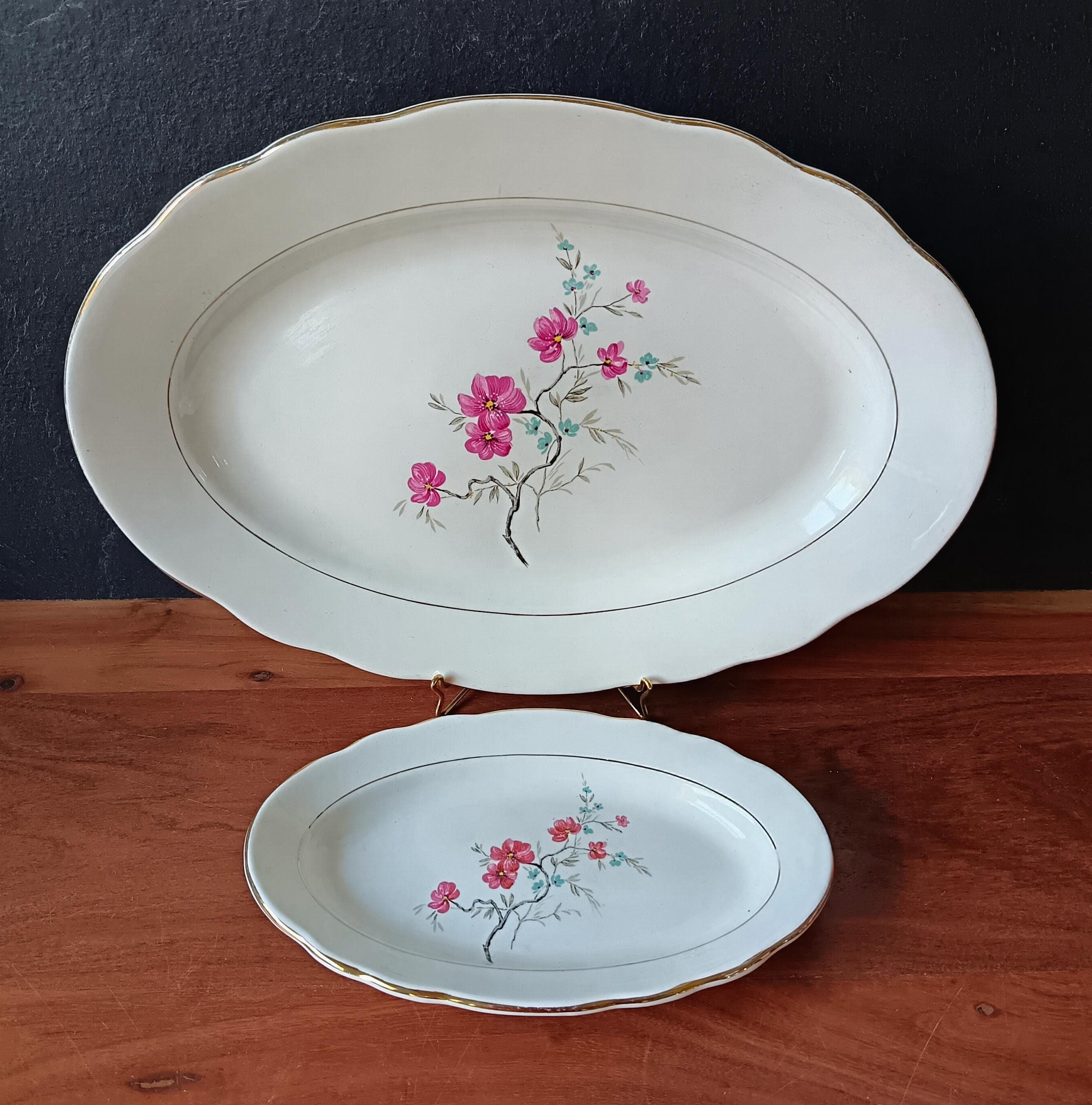 An oval serving platter and a small earthenware dish made by the French company Salins. They are decorated with two delicate branches, the first adorned with pink flowers and the second with small blue flowers.