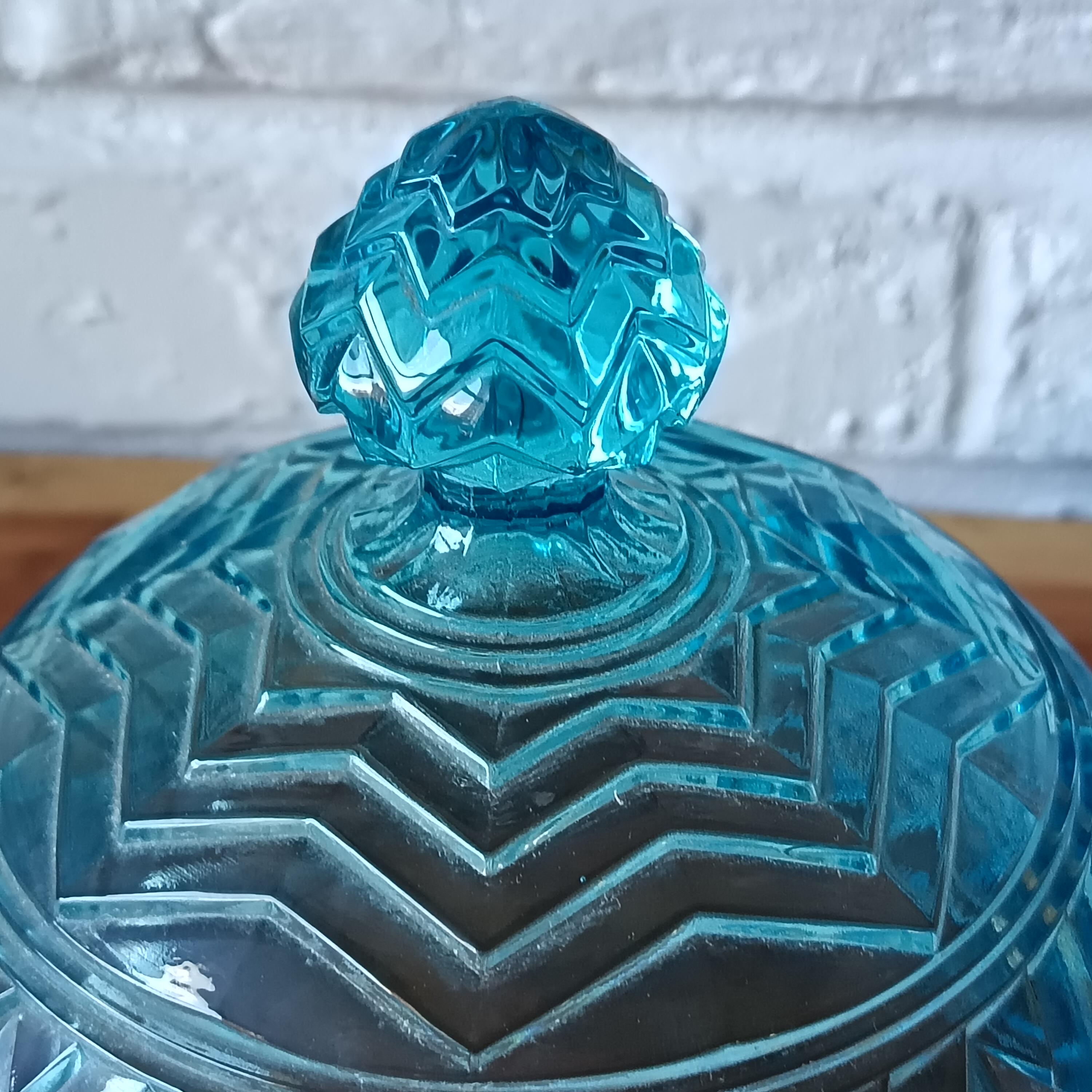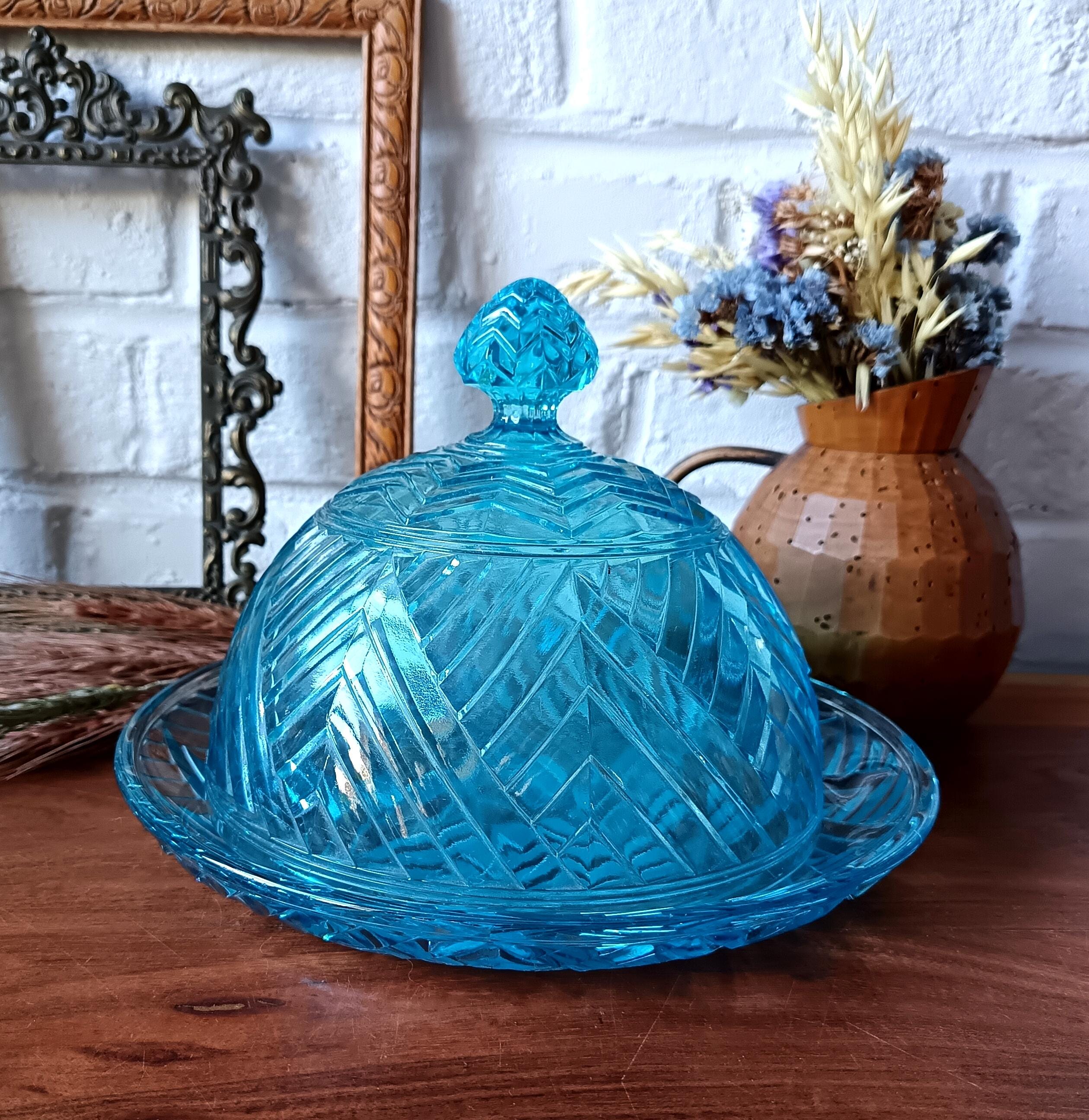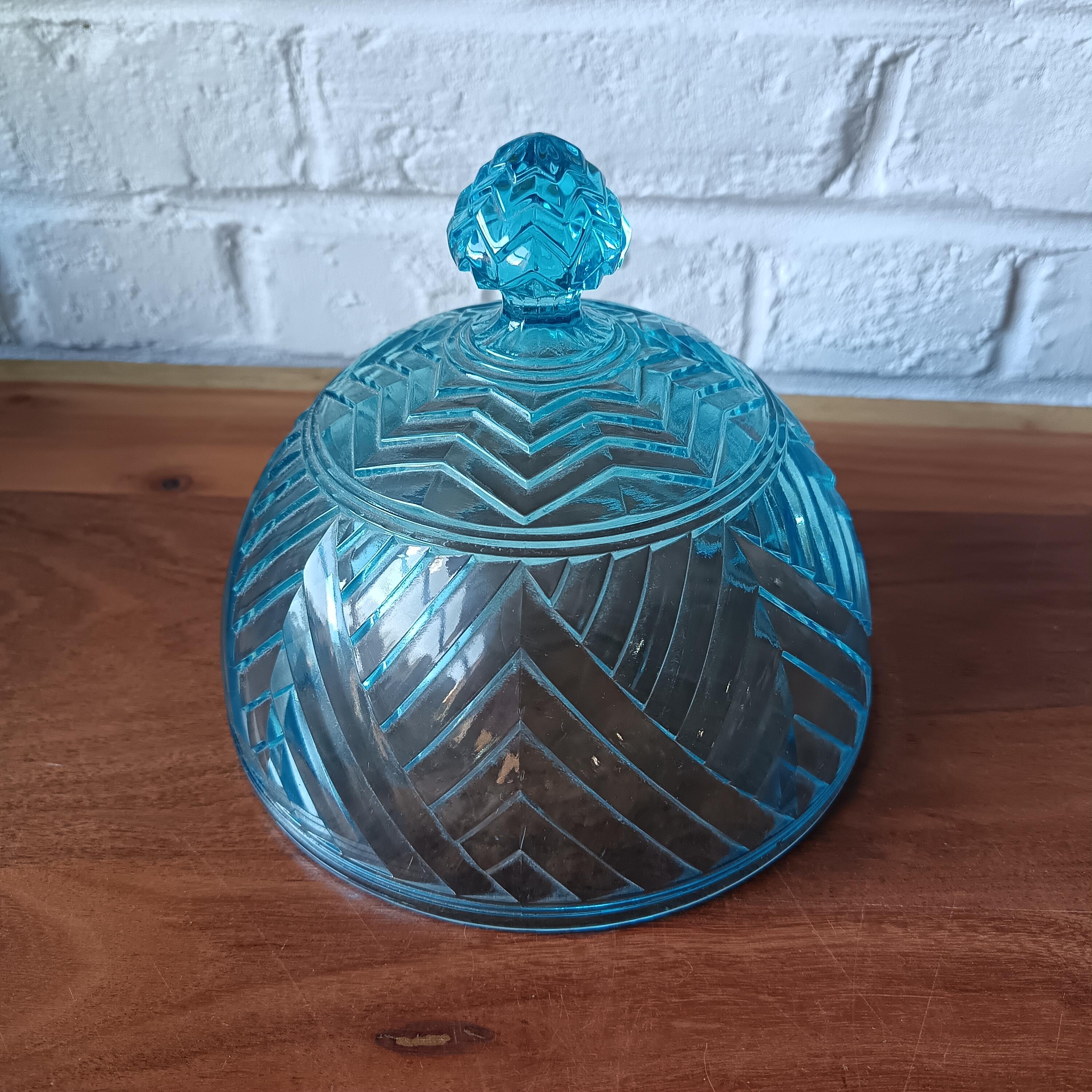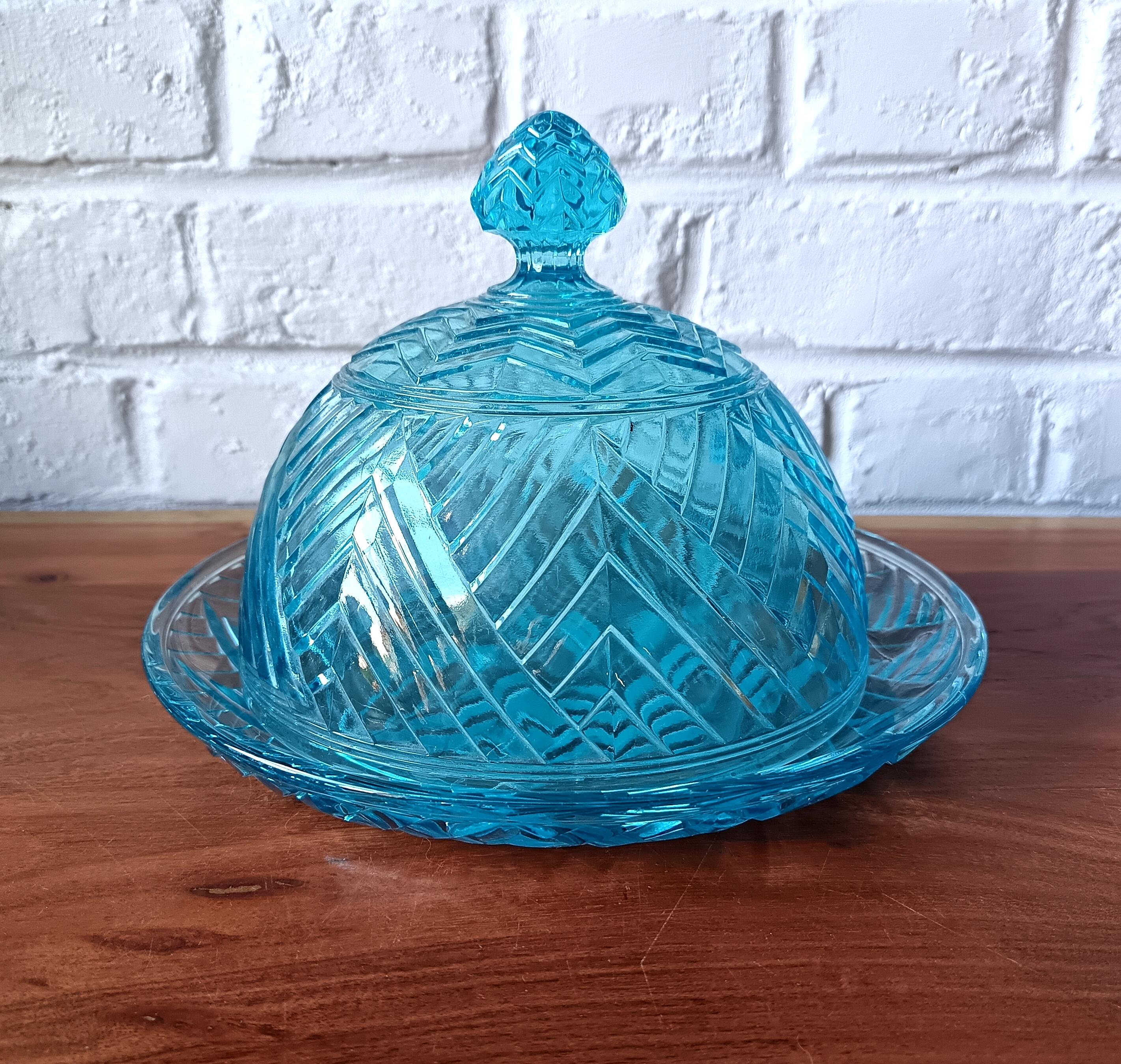 Turquoise glass dish with cloche from the 1940s/50s.