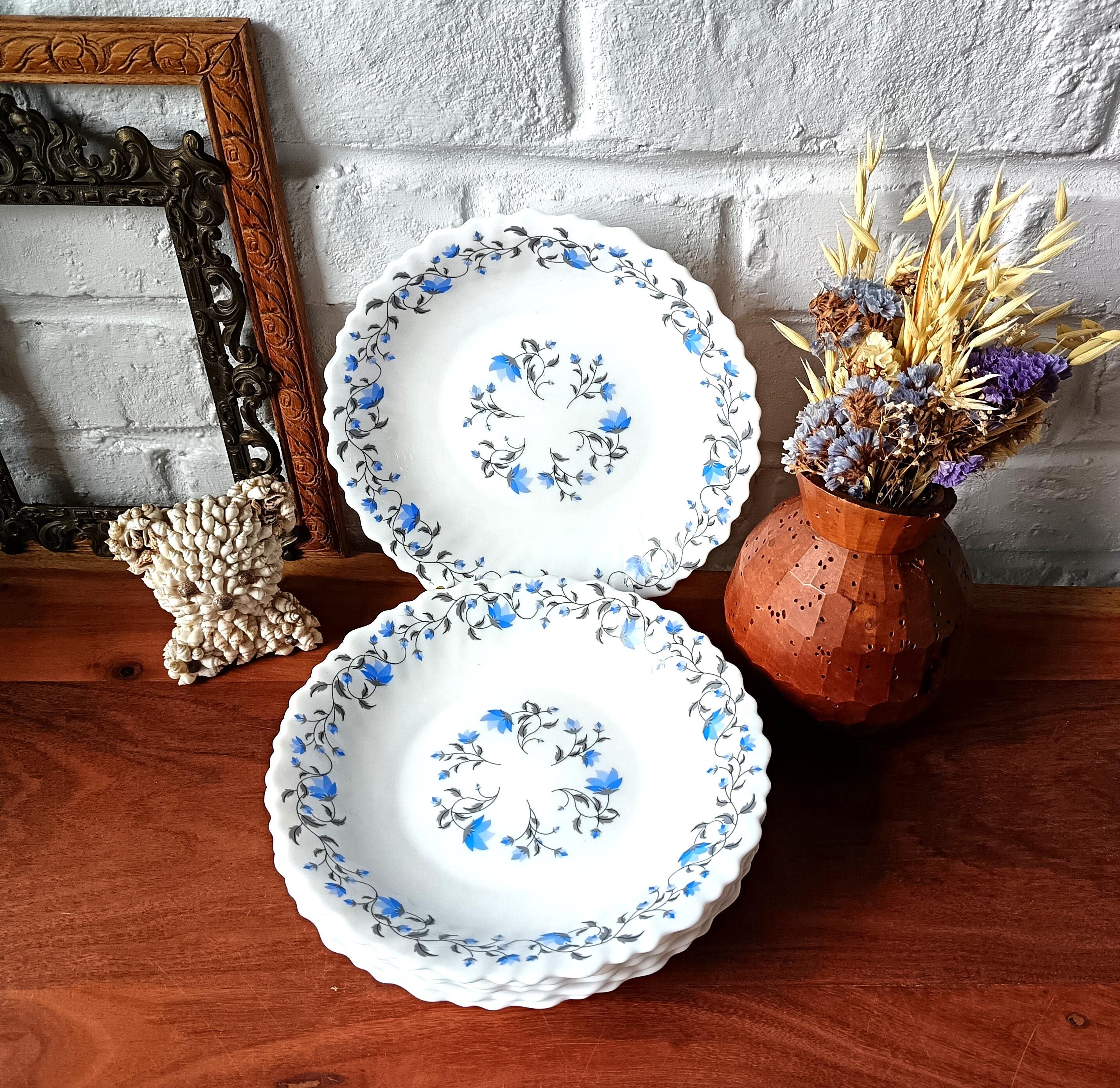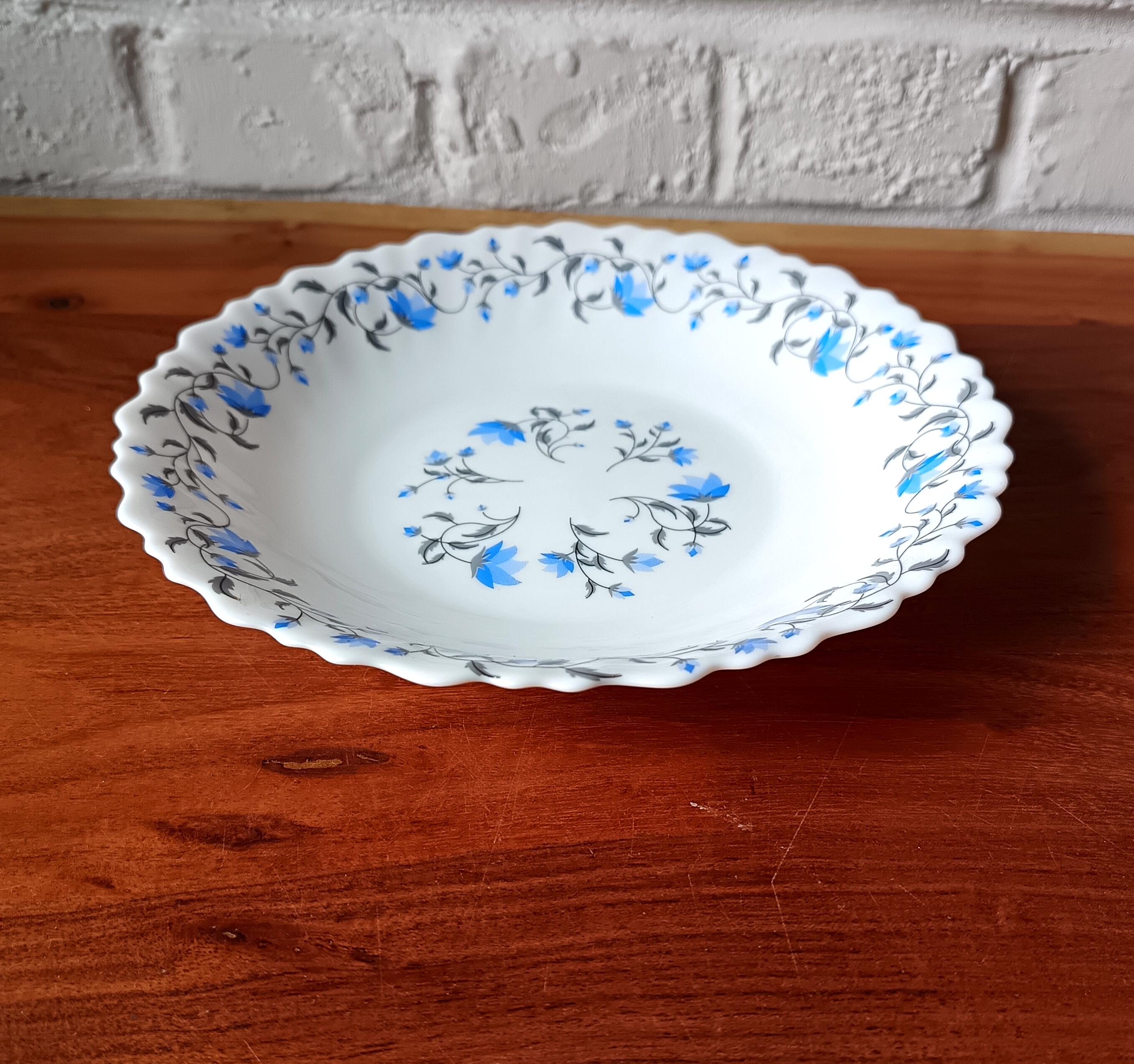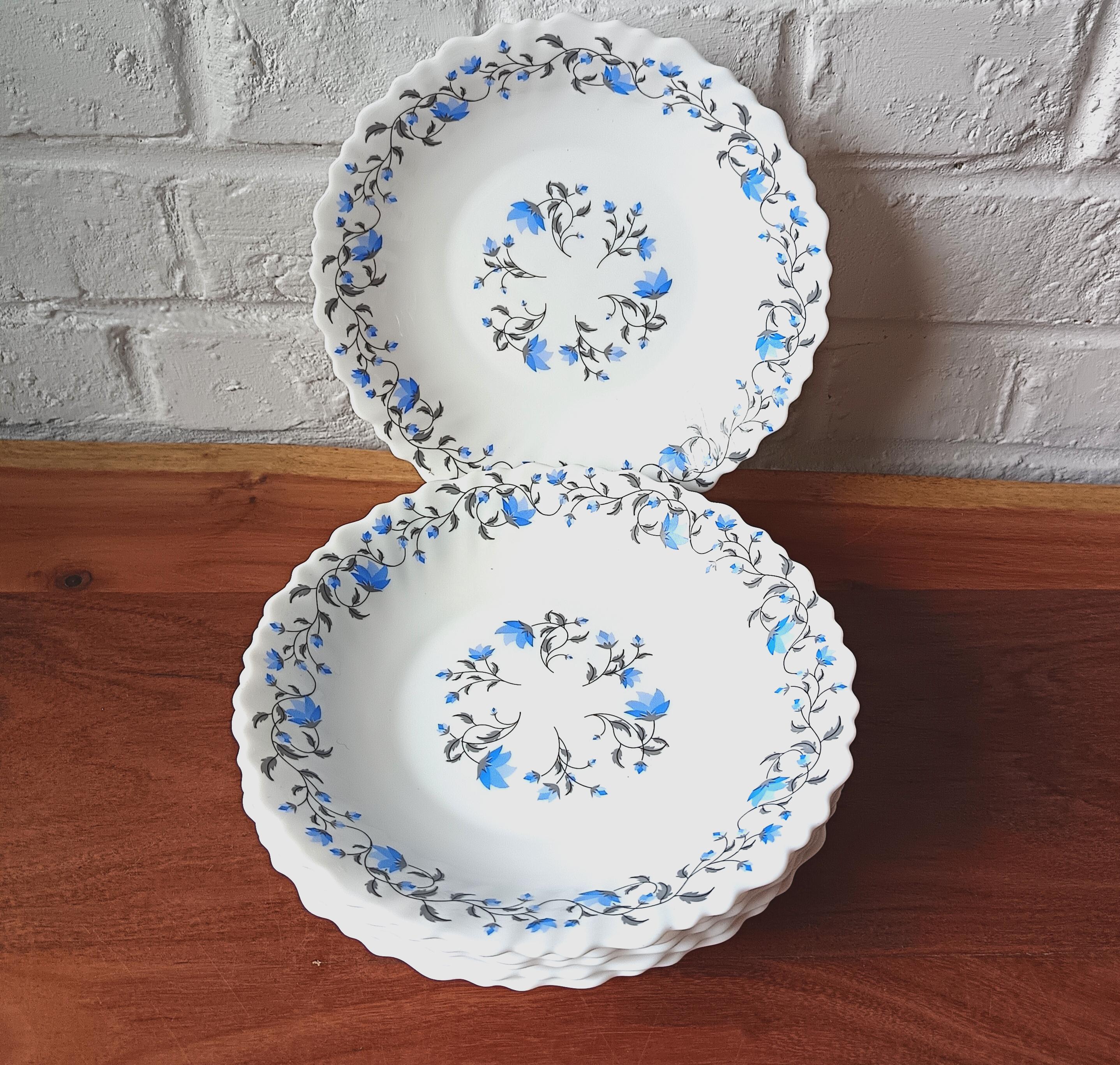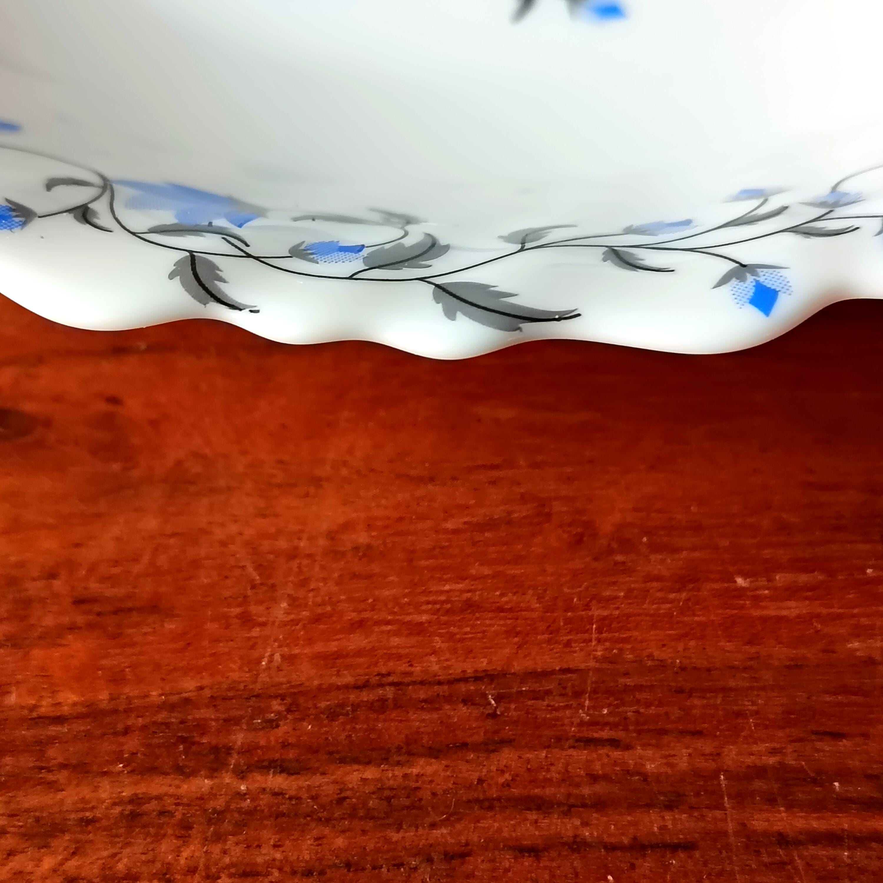 6 vintage milk glass soup plates, they combine the white of the glass with a pattern full of blue flowers and a beautiful swirling border.