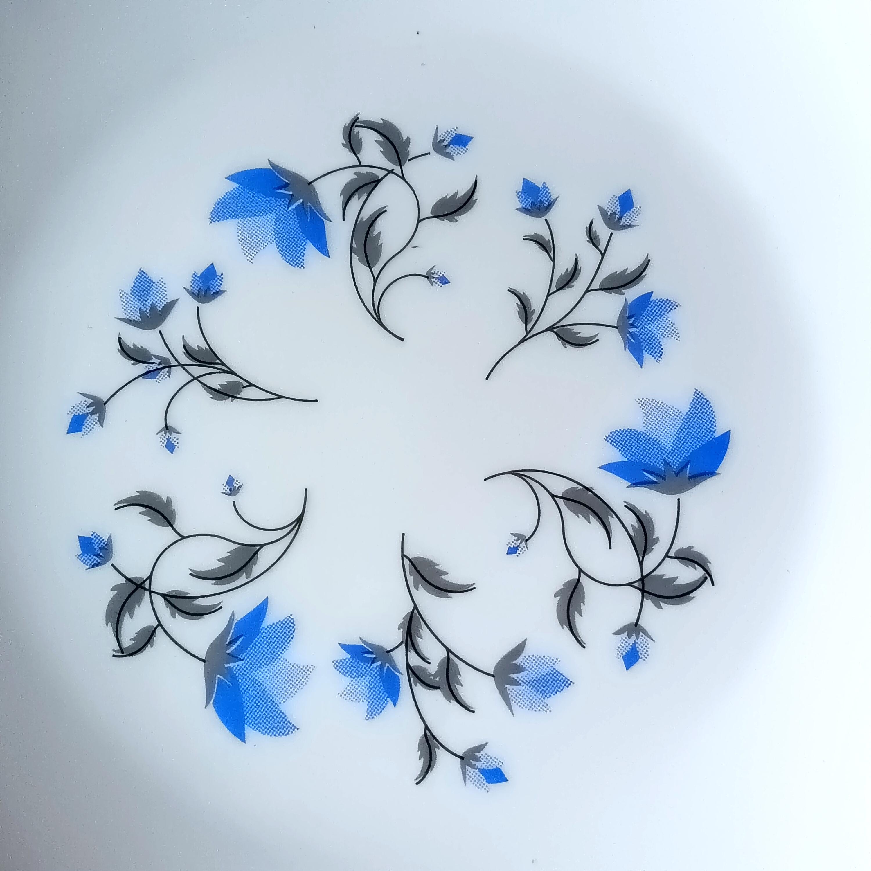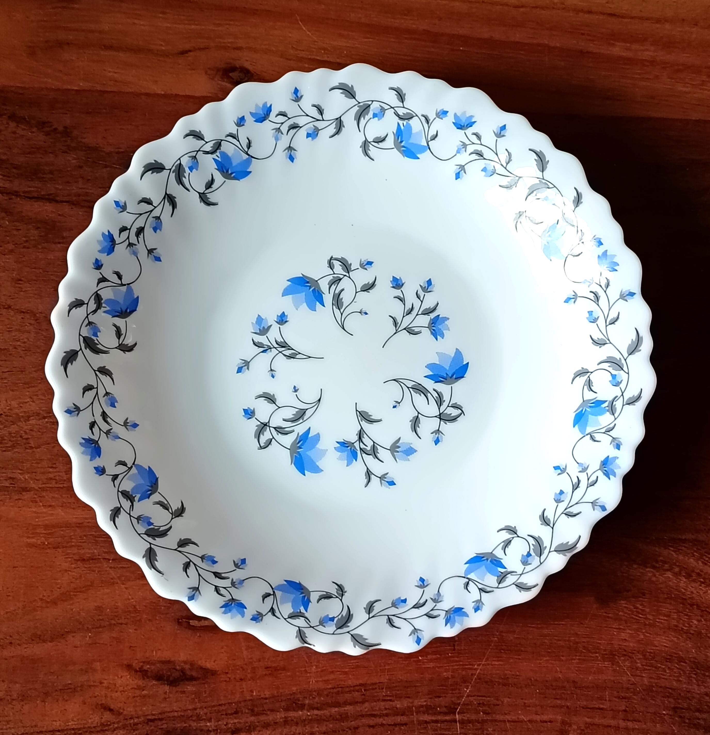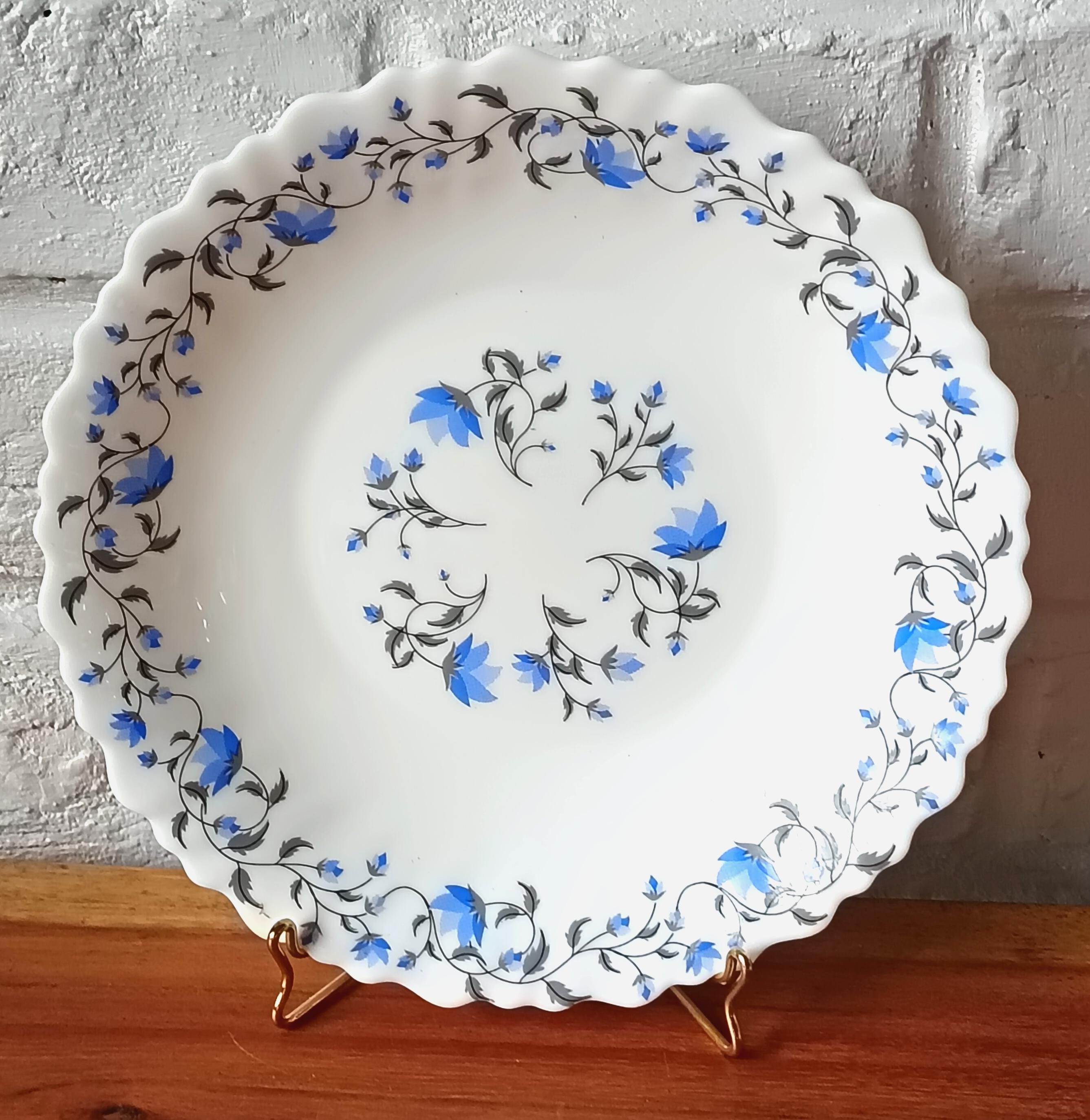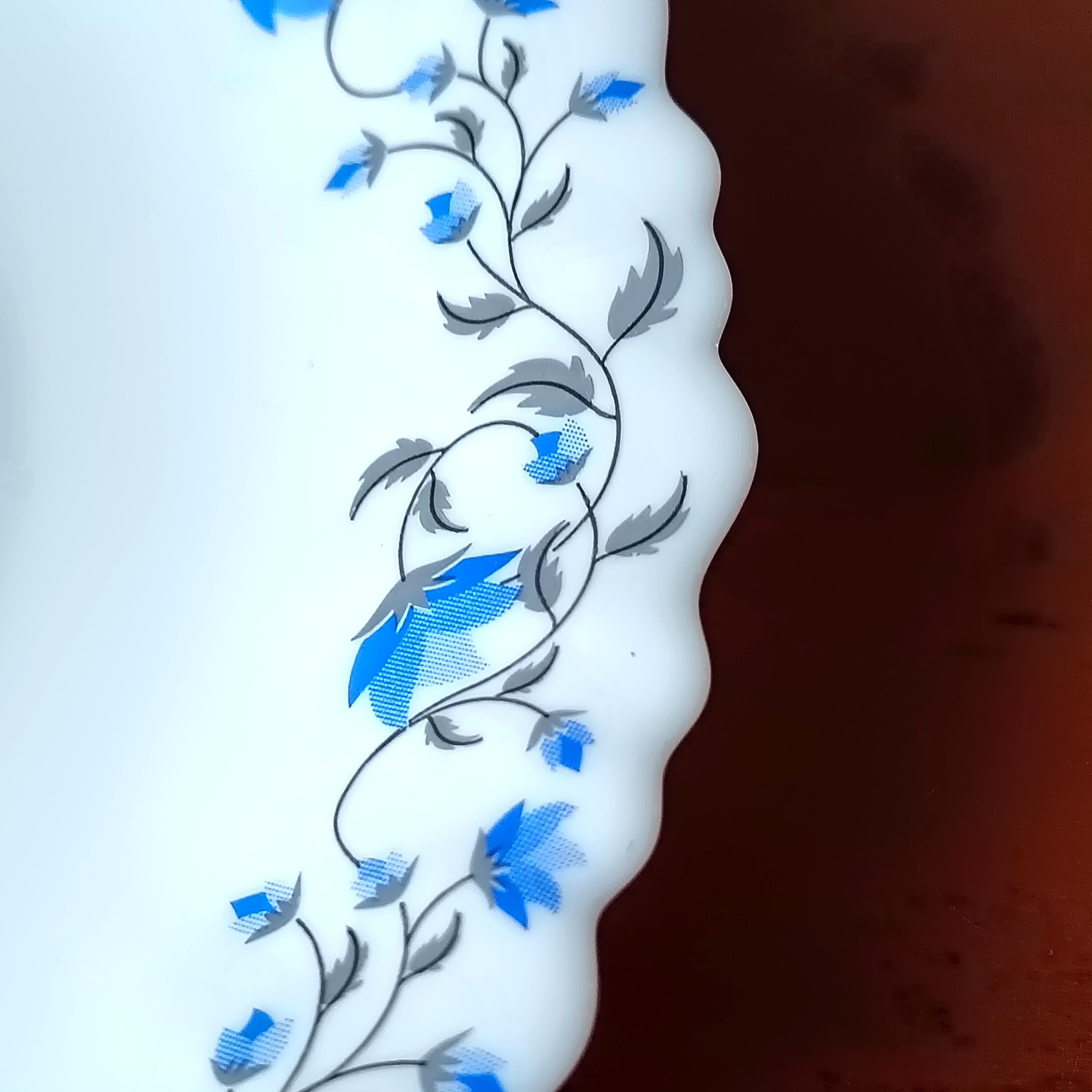 6 vintage milk glass soup plates, they combine the white of the glass with a pattern full of blue flowers and a beautiful swirling border.