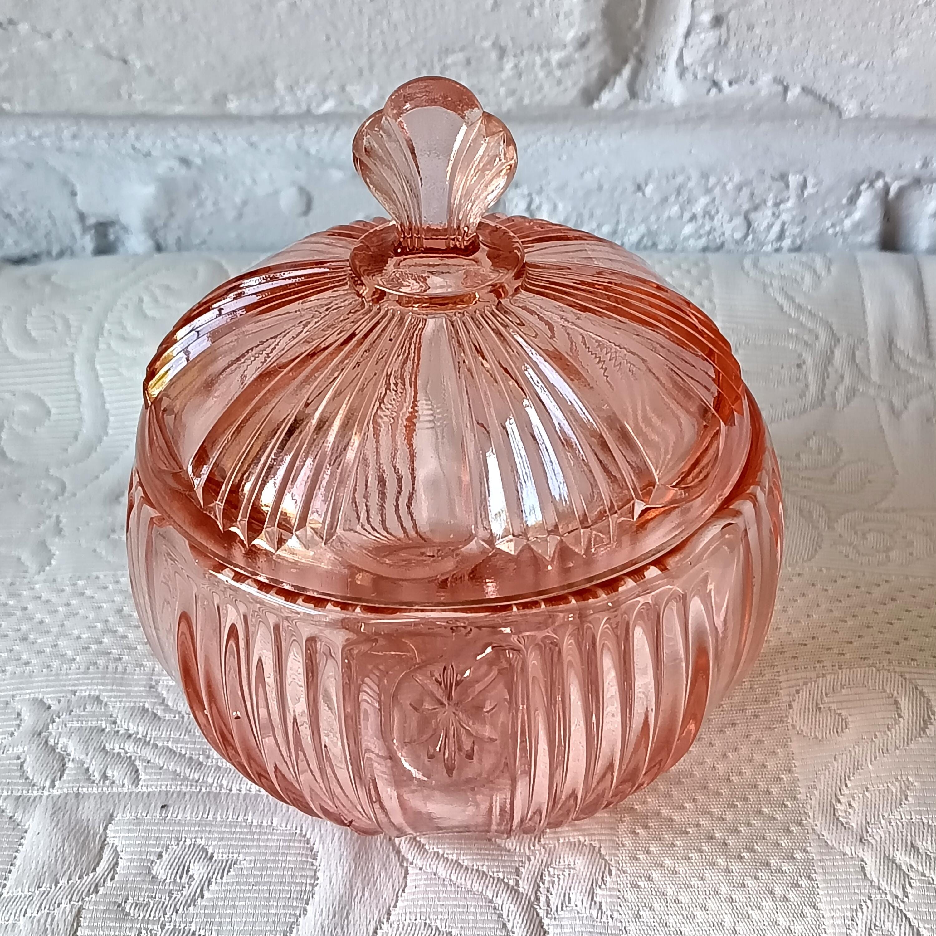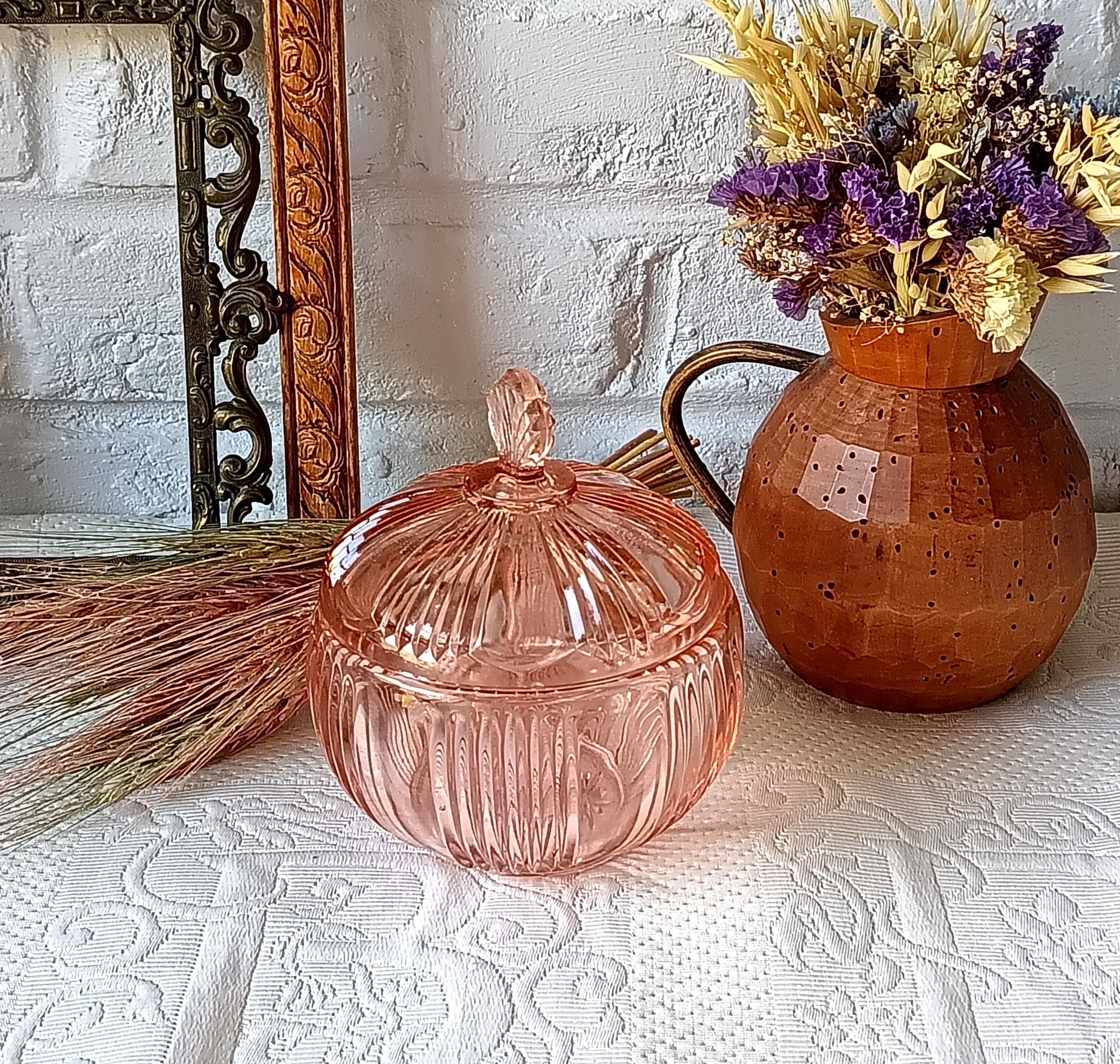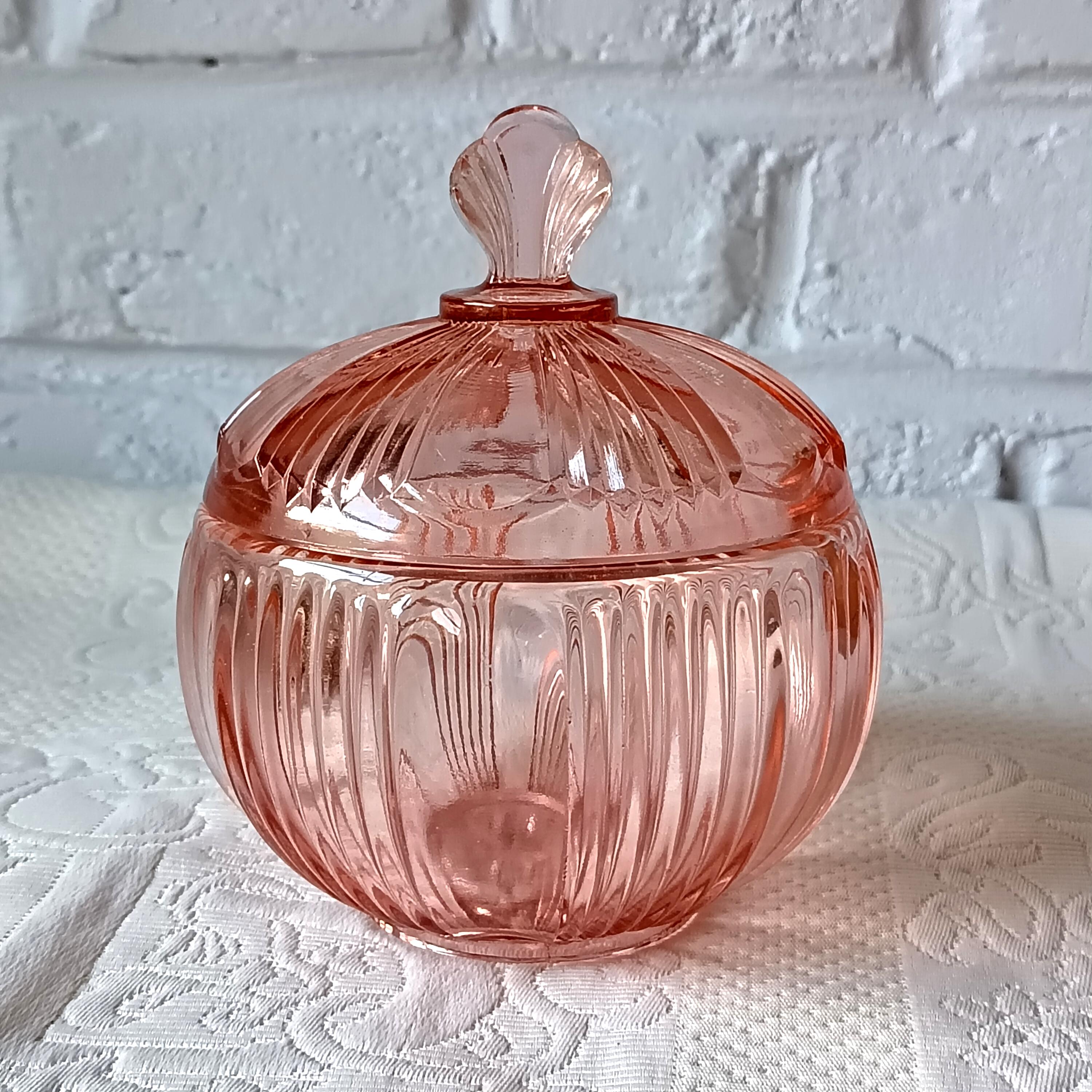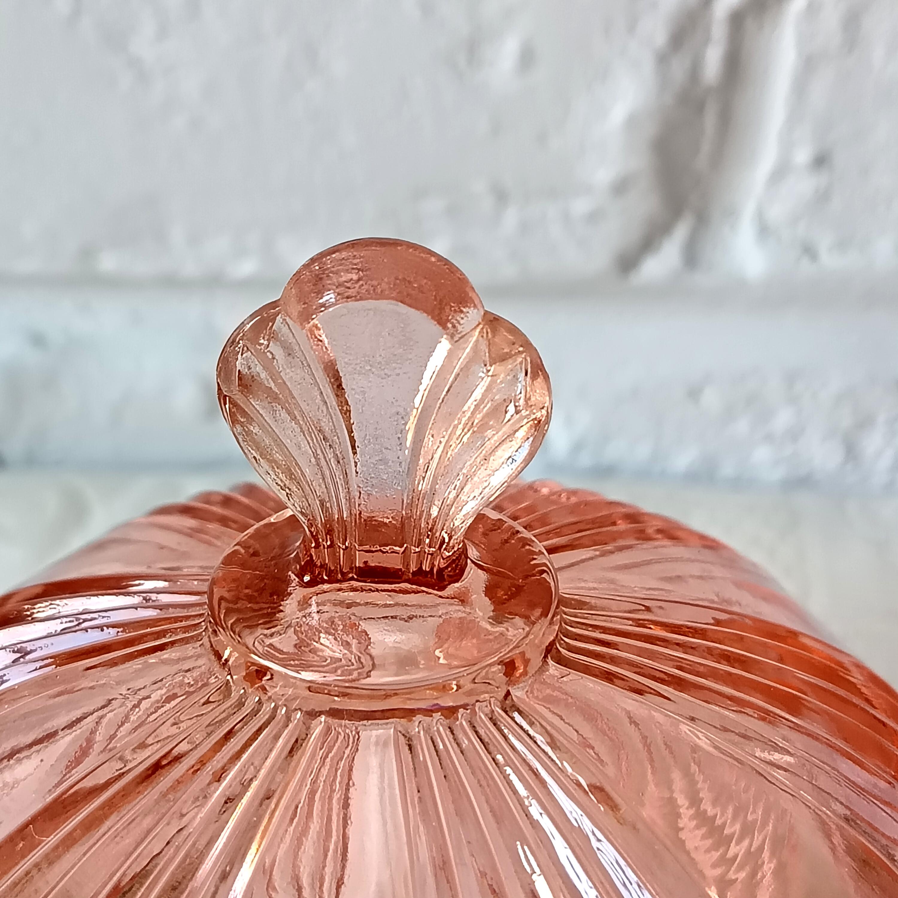 Adorable sugar bowl with a retro French look, made of colored pressed glass (salmon pink). In an Art Deco style, this pink pressed glass can be used as a sugar bowl, candy dish, or sweets container... It has a very pretty spherical shape.