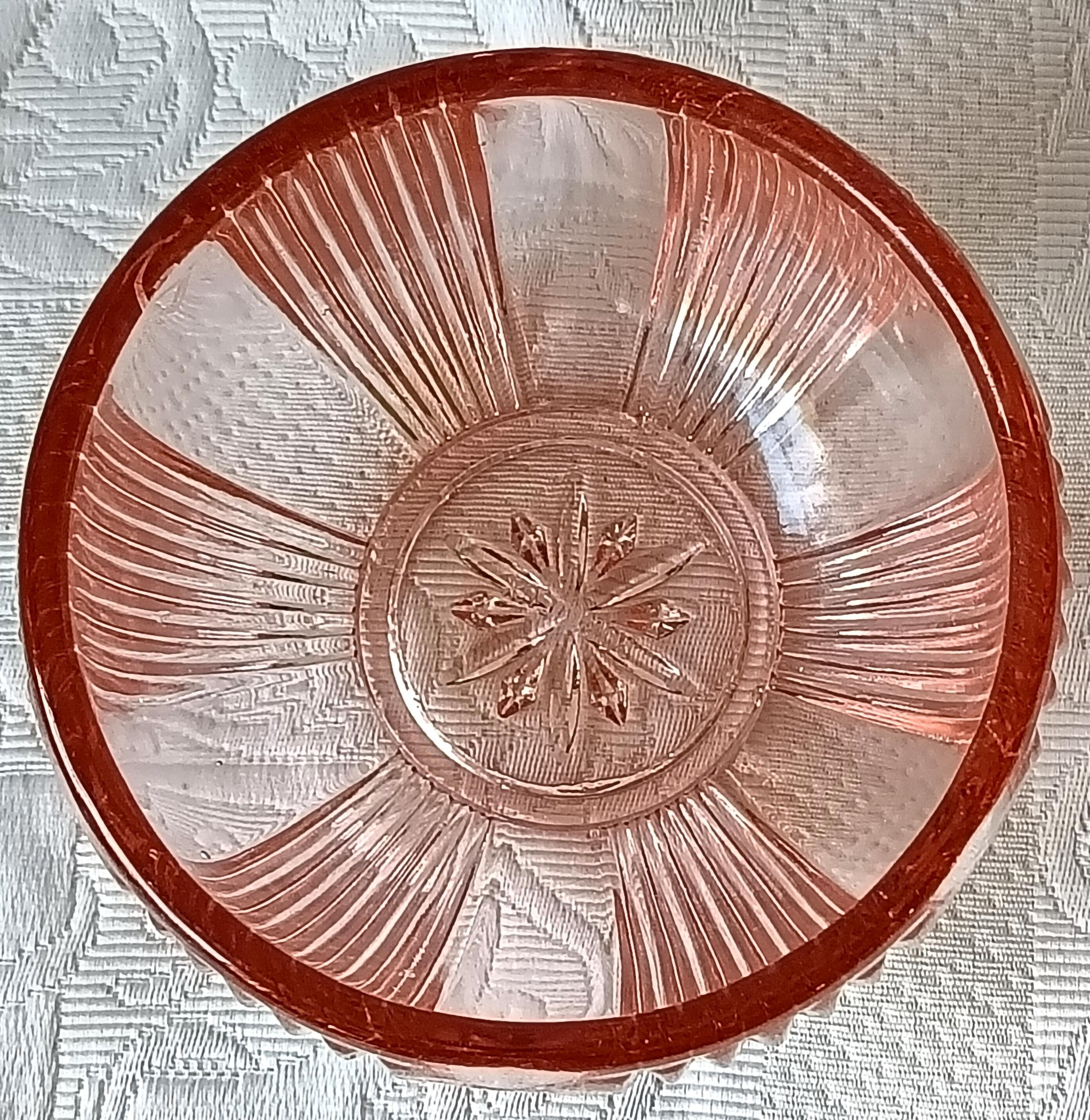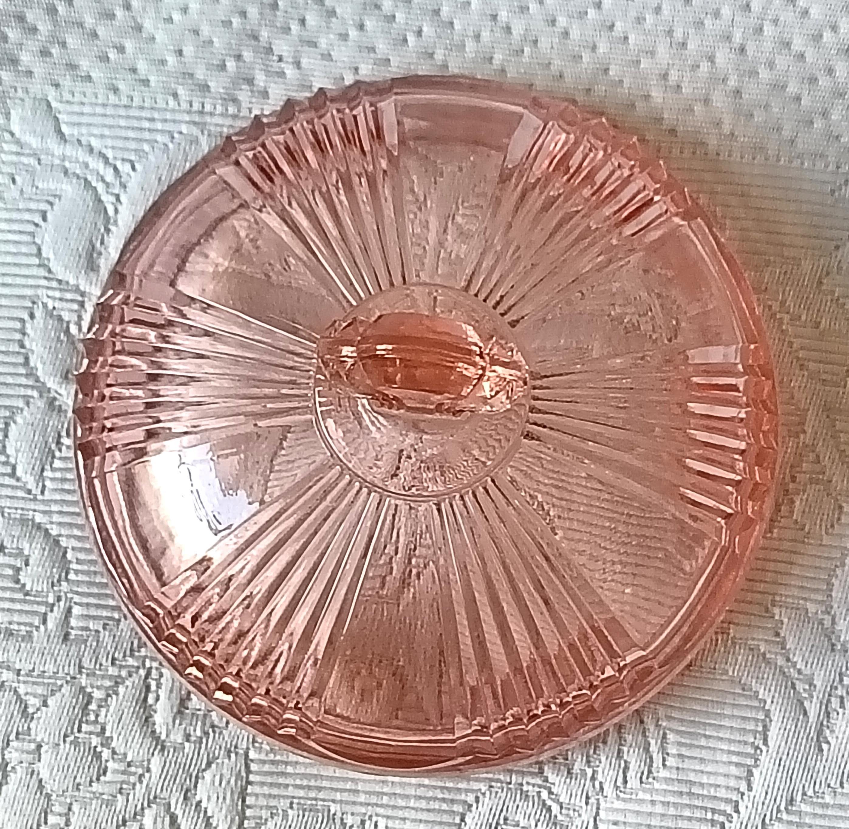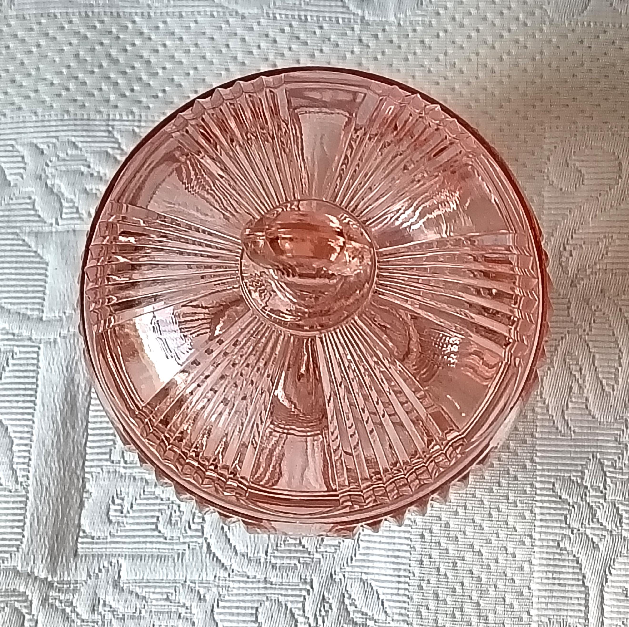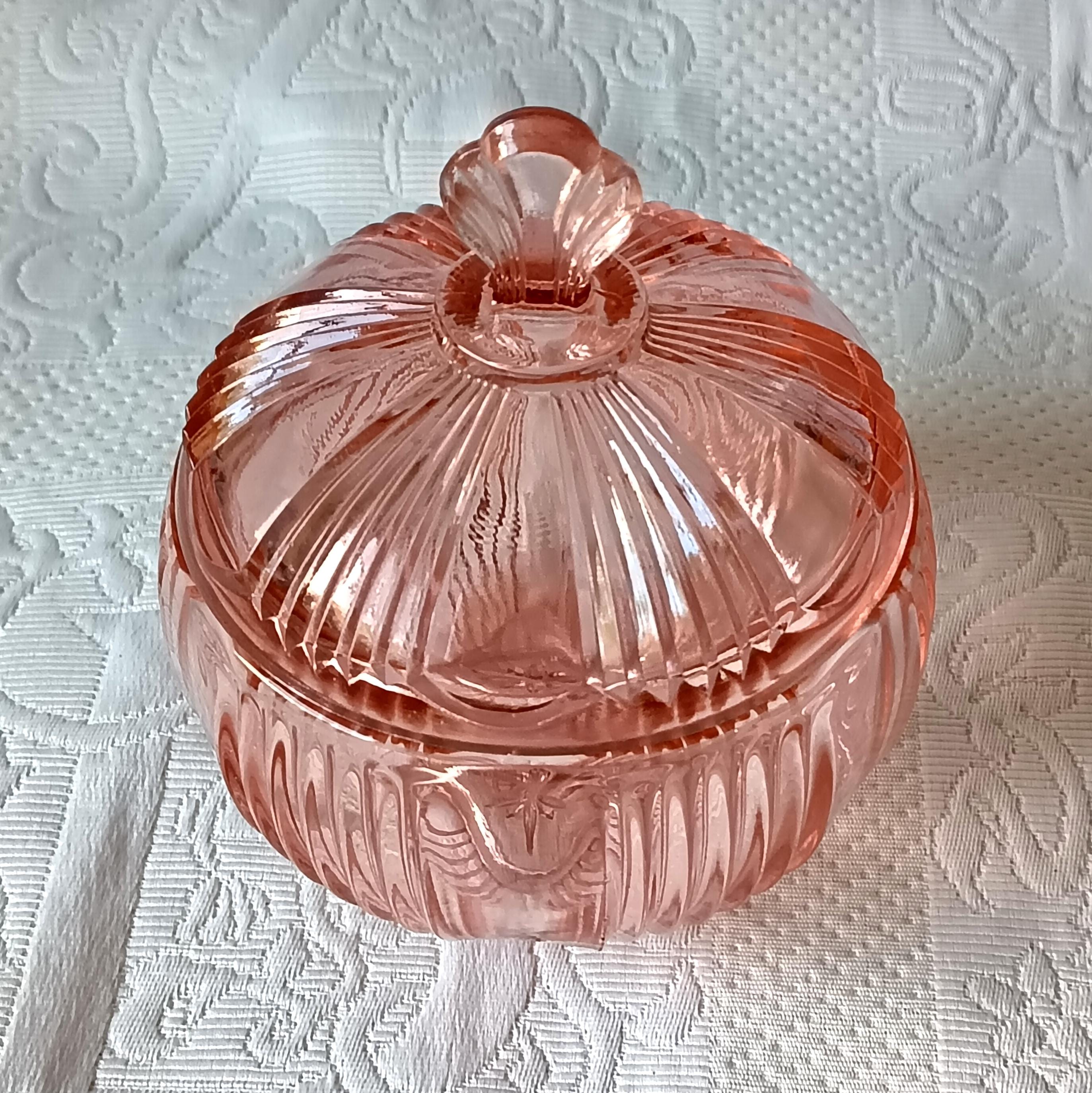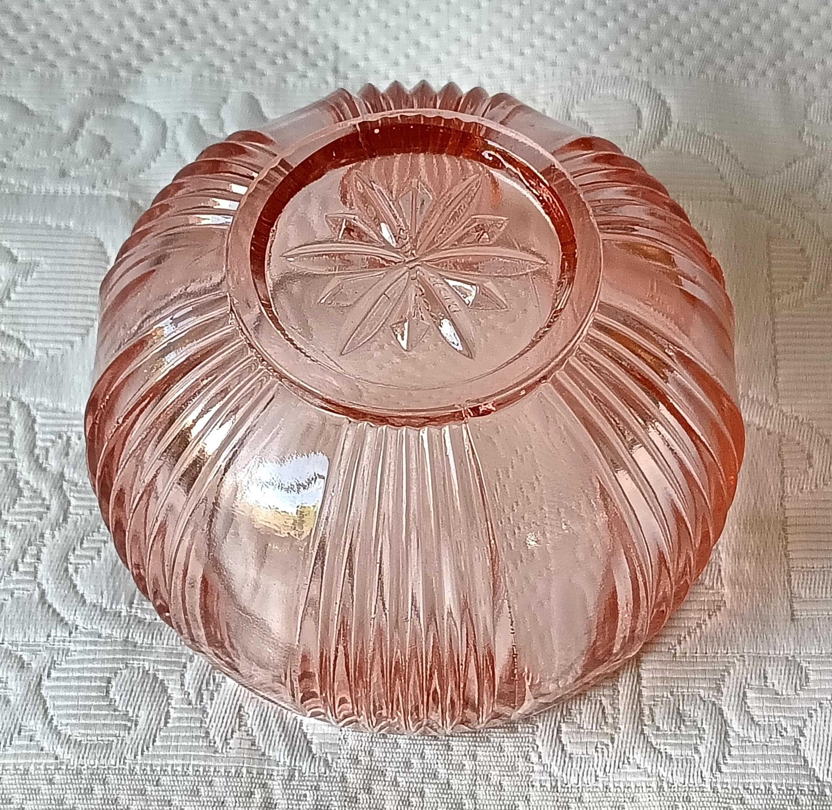 Adorable sugar bowl with a retro French look, made of colored pressed glass (salmon pink). In an Art Deco style, this pink pressed glass can be used as a sugar bowl, candy dish, or sweets container... It has a very pretty spherical shape.