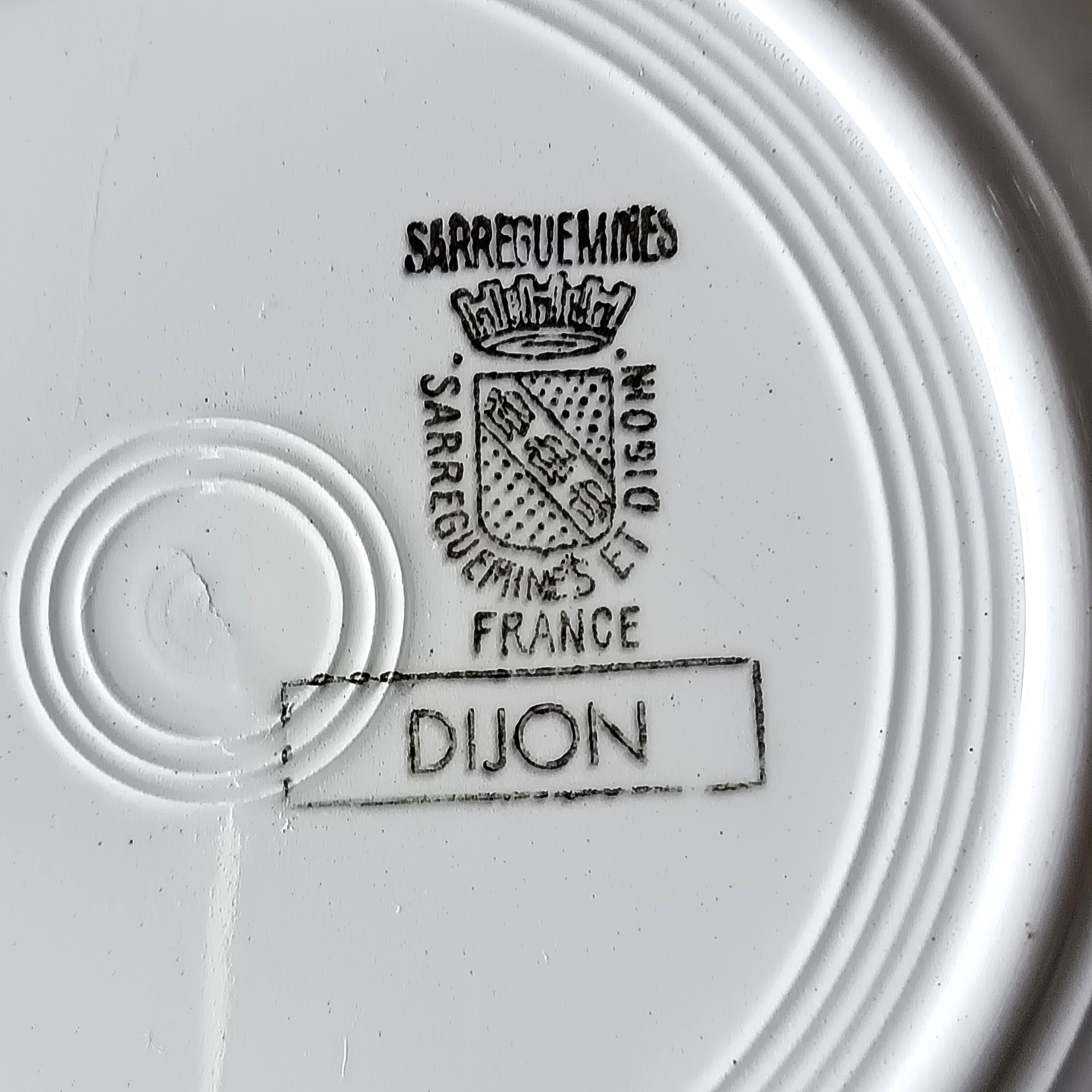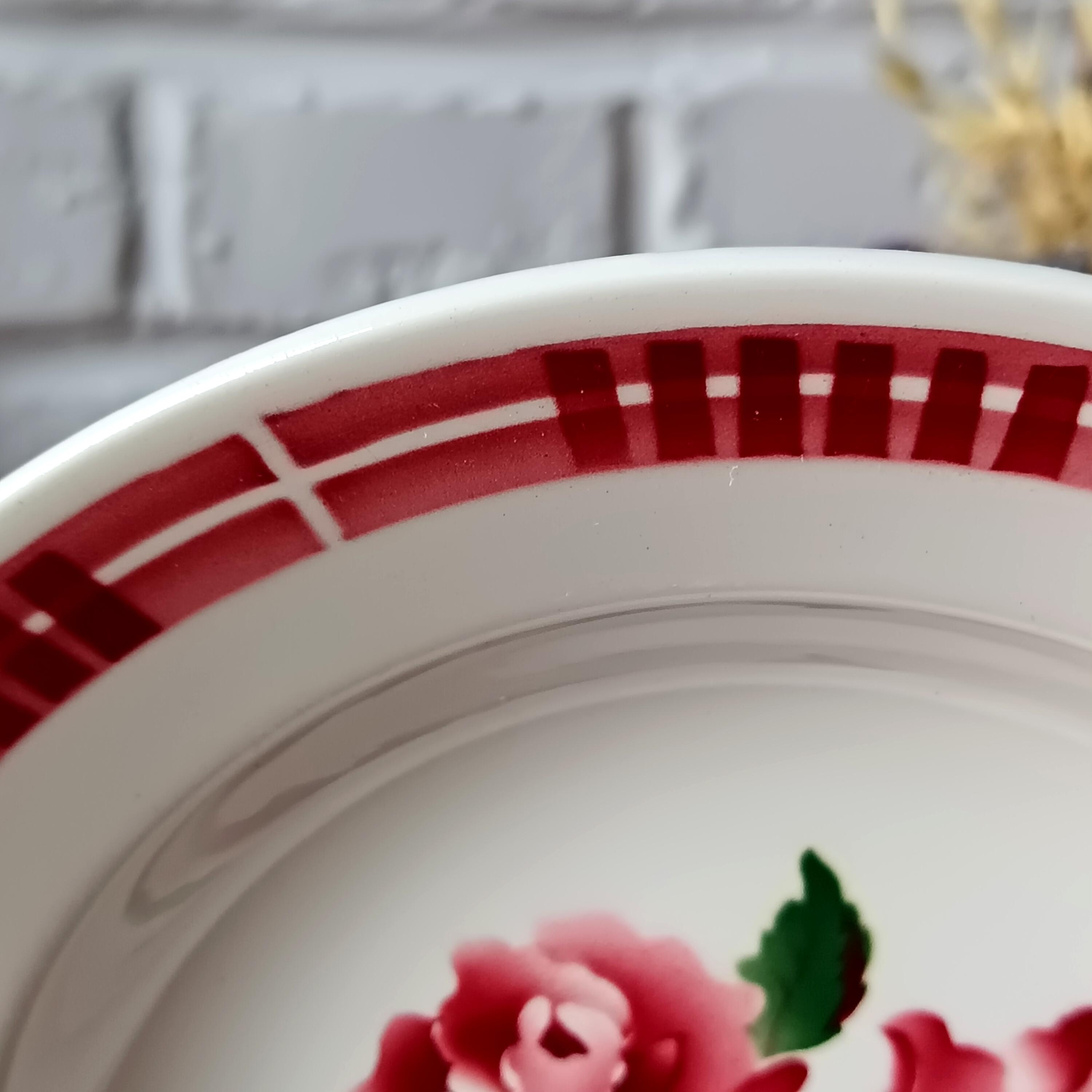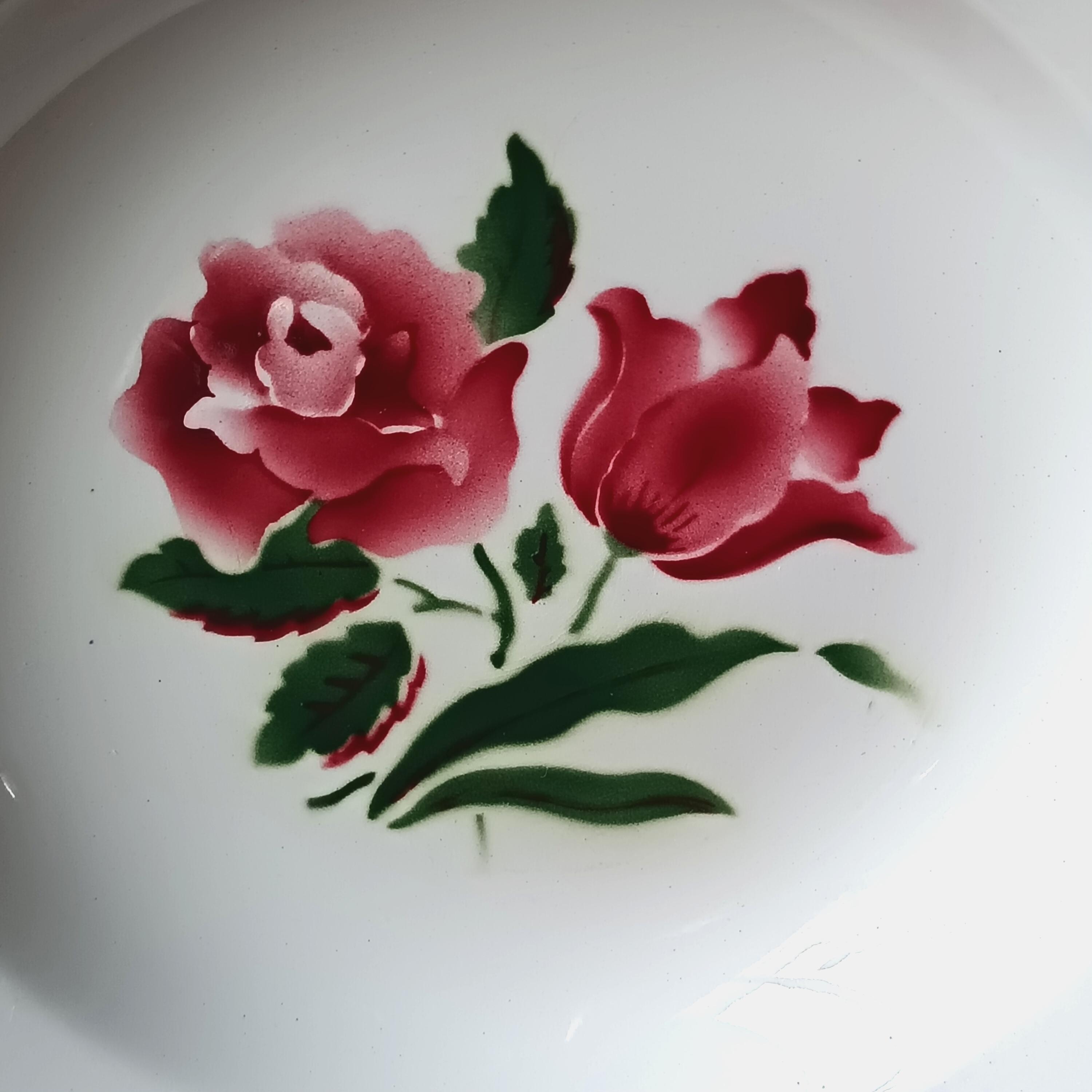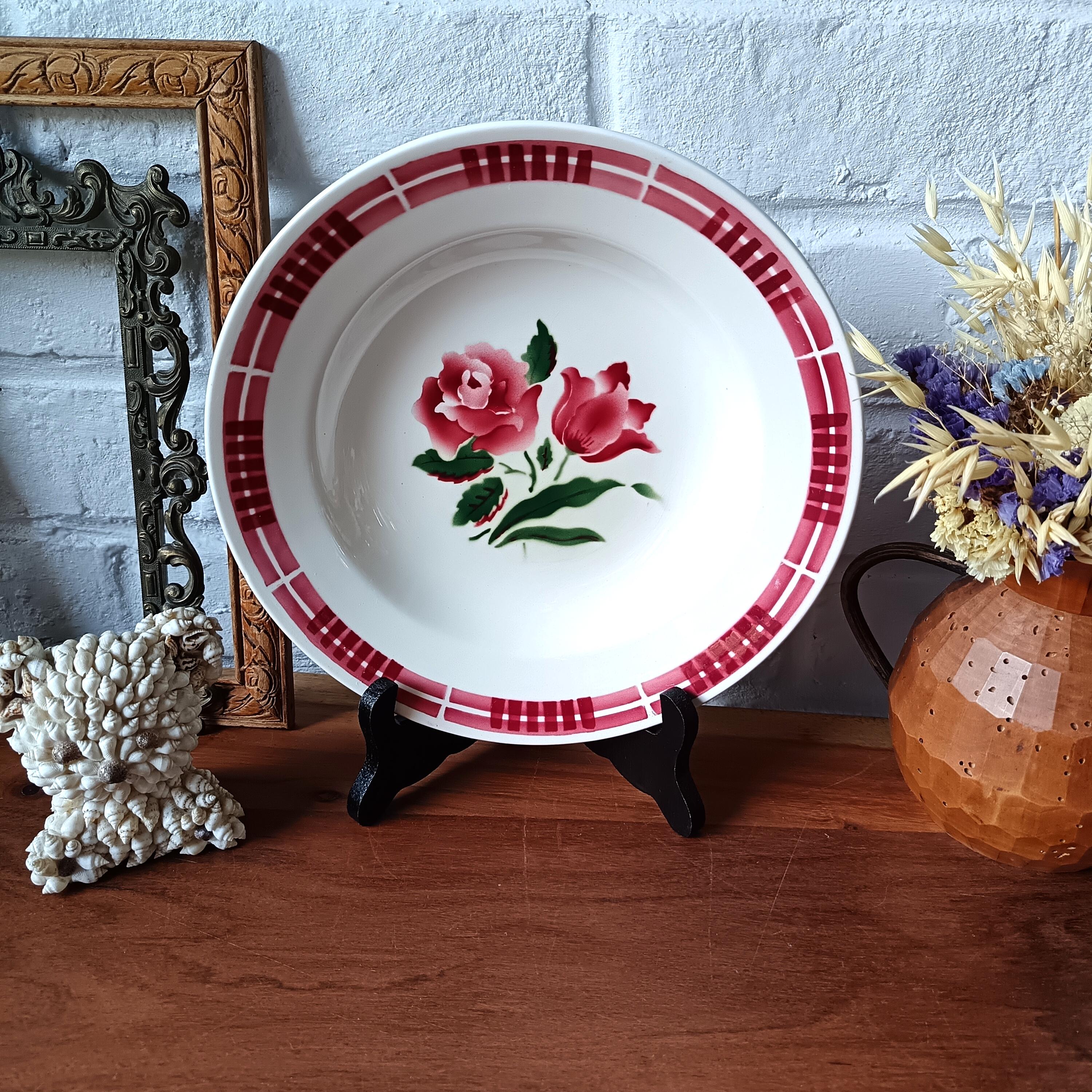 Seven adorable vintage French soup plates, with an elegant design; the motifs are a wonderful example of the subtle coloring of vintage French stencils. The pretty rose motif in the center is complemented by a burgundy red border.