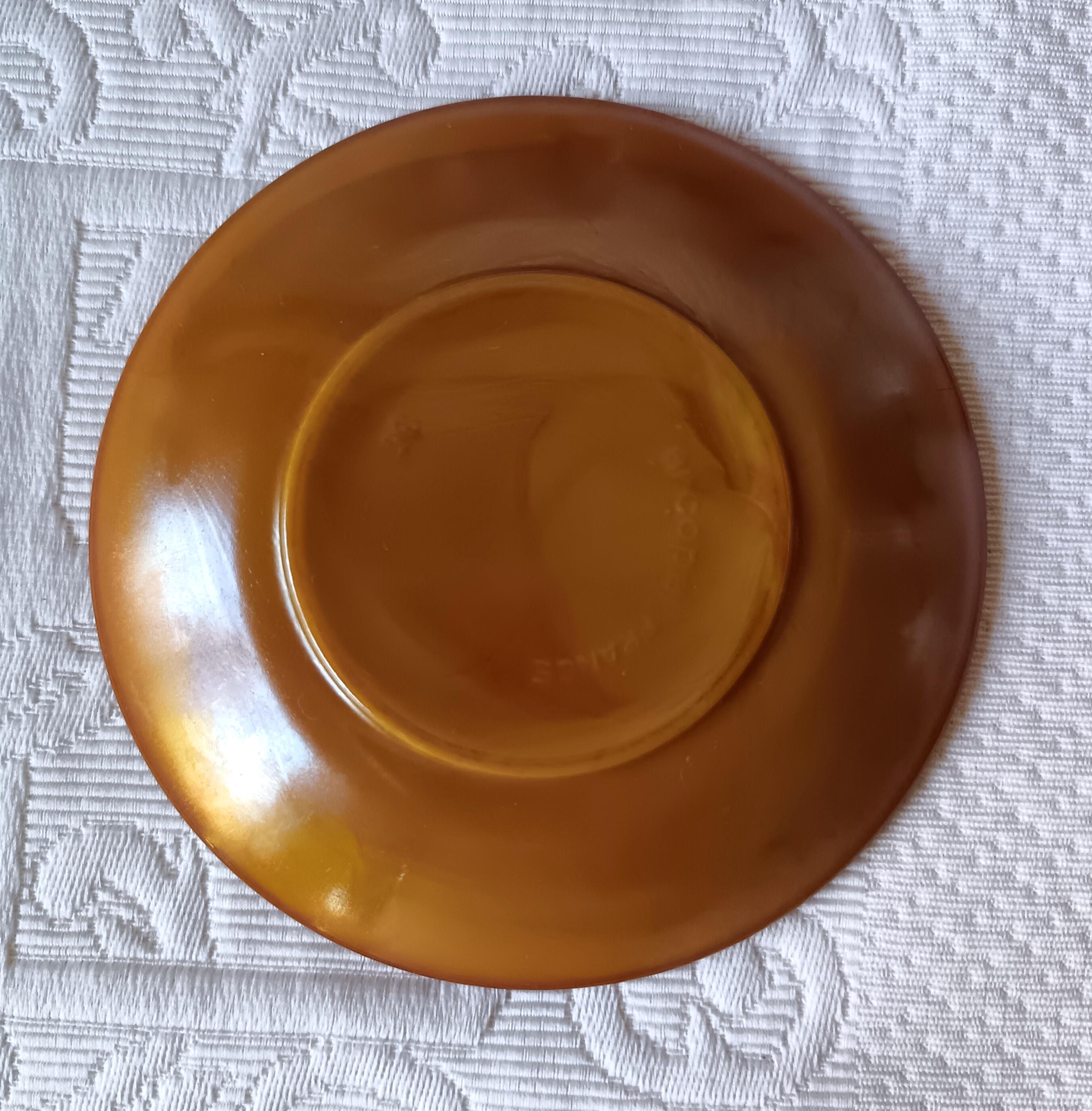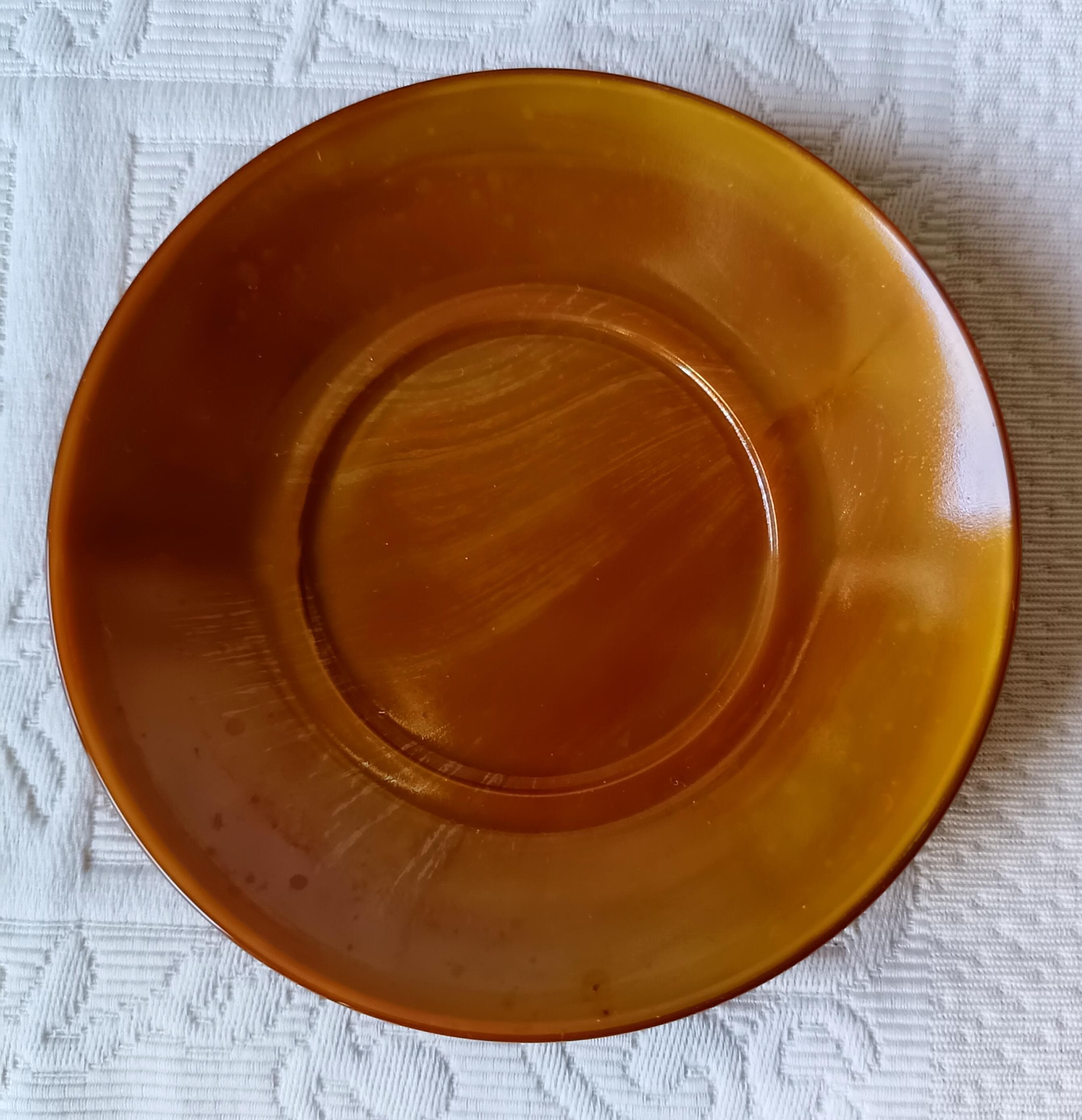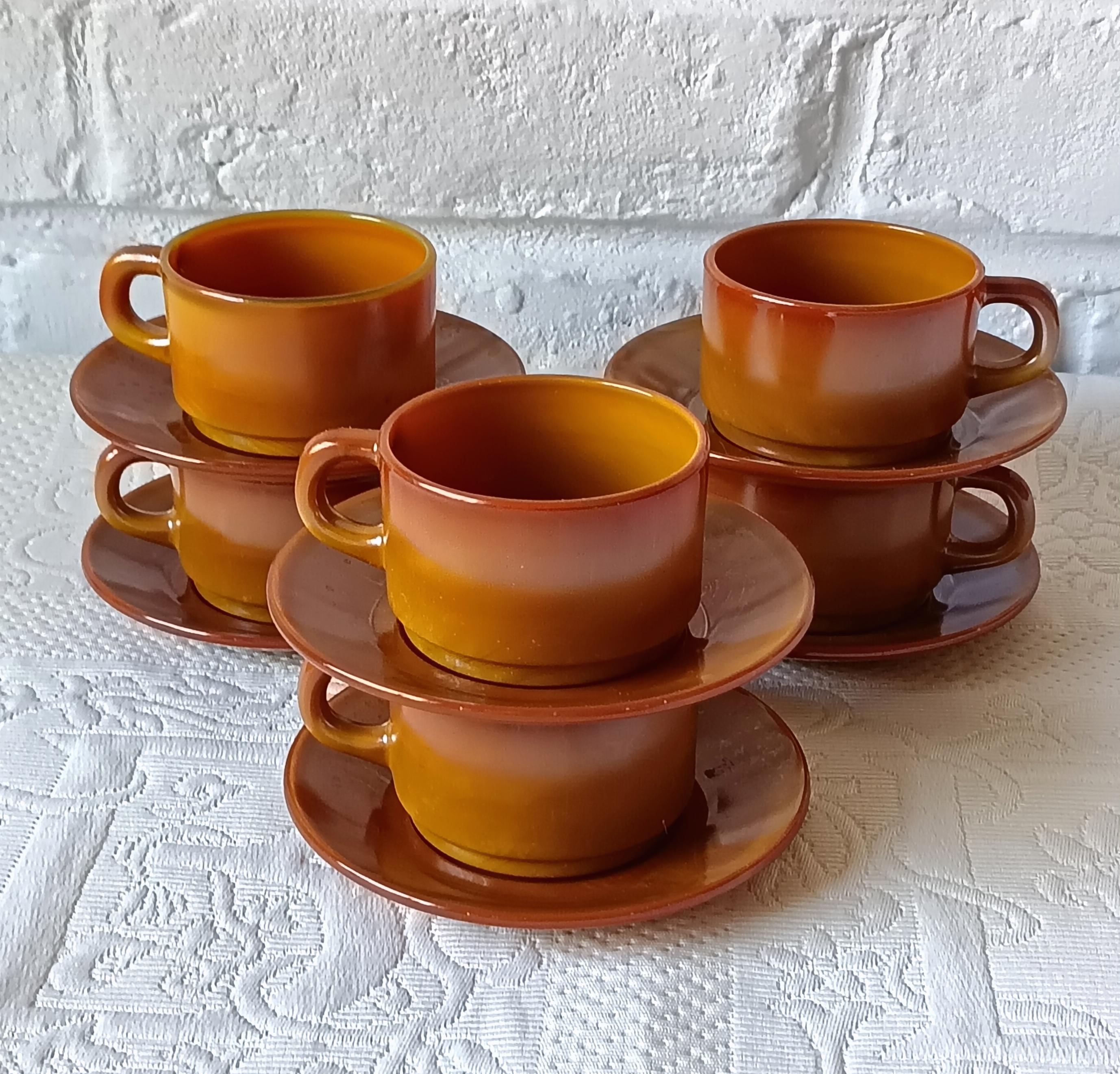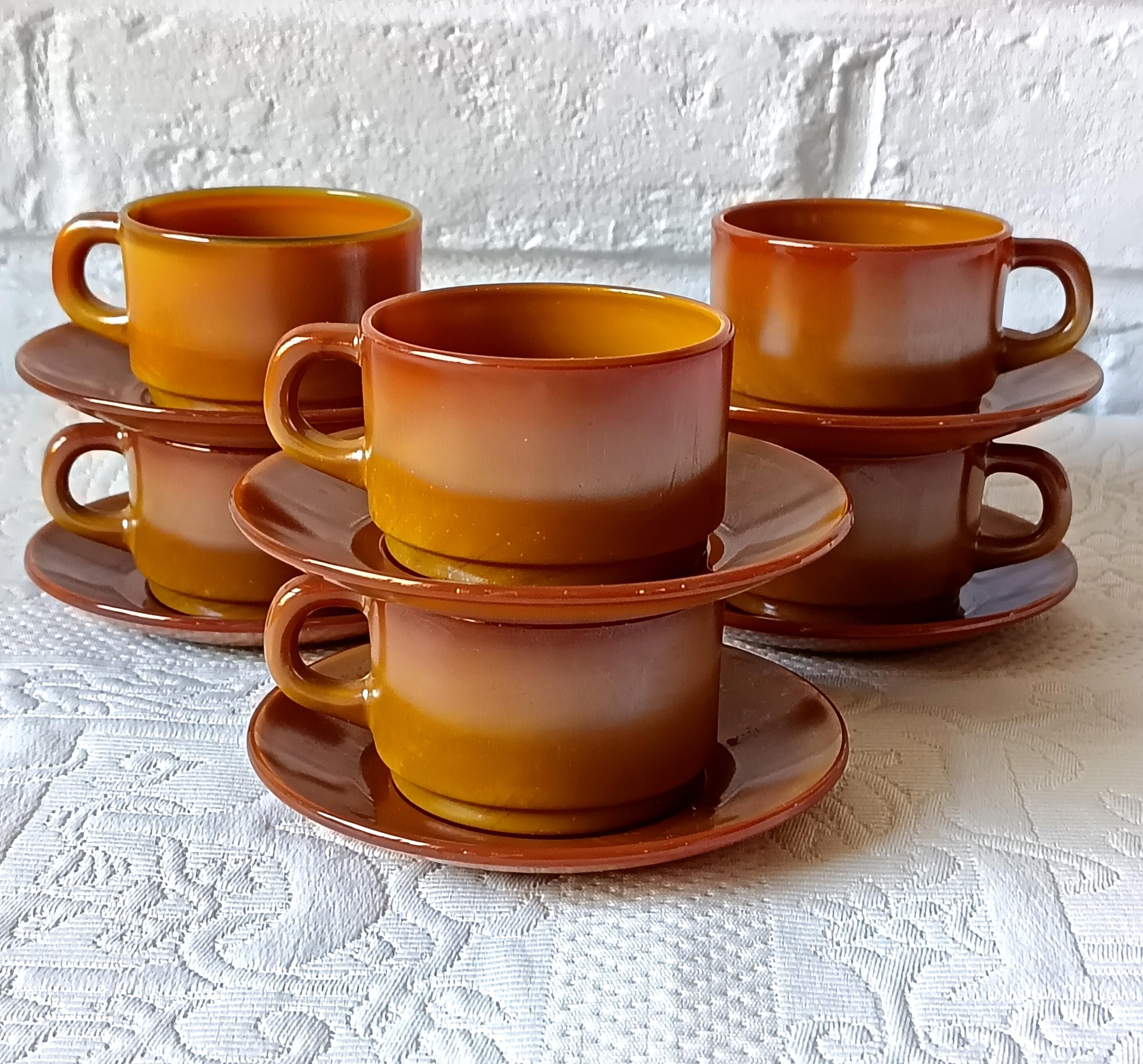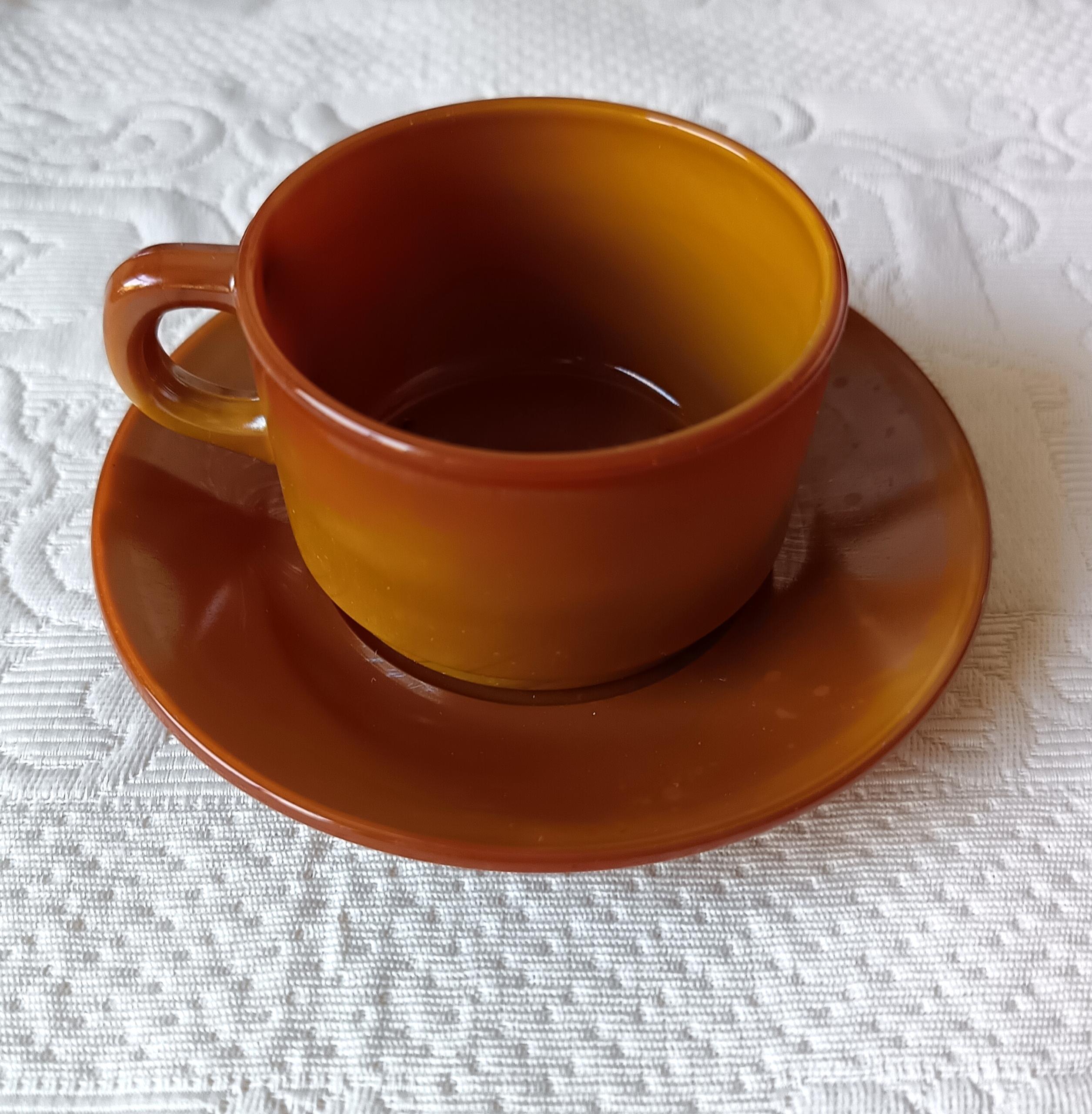 Beautiful cups and saucers from the French brand "ARCOPAL". They are made of tempered glass, making them very durable. They resemble pottery but are actually opaque glass with magnificent shades of caramel, amber, mustard, and orange. They were made in the 1970s, from the "VOLCAN" series.