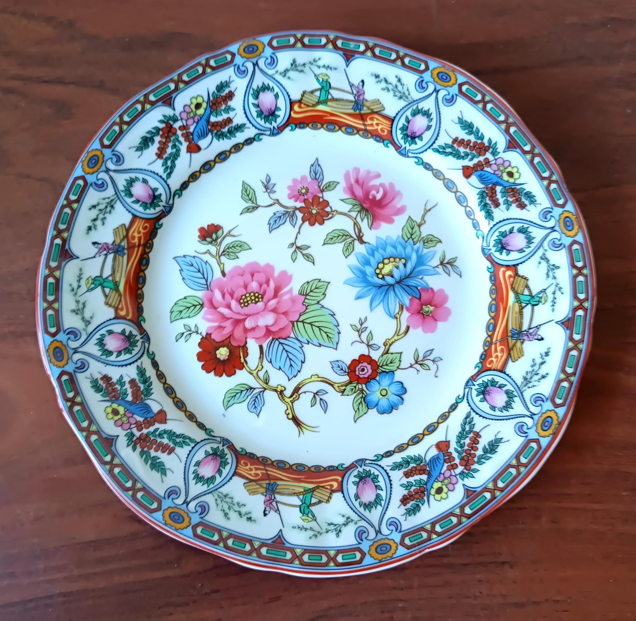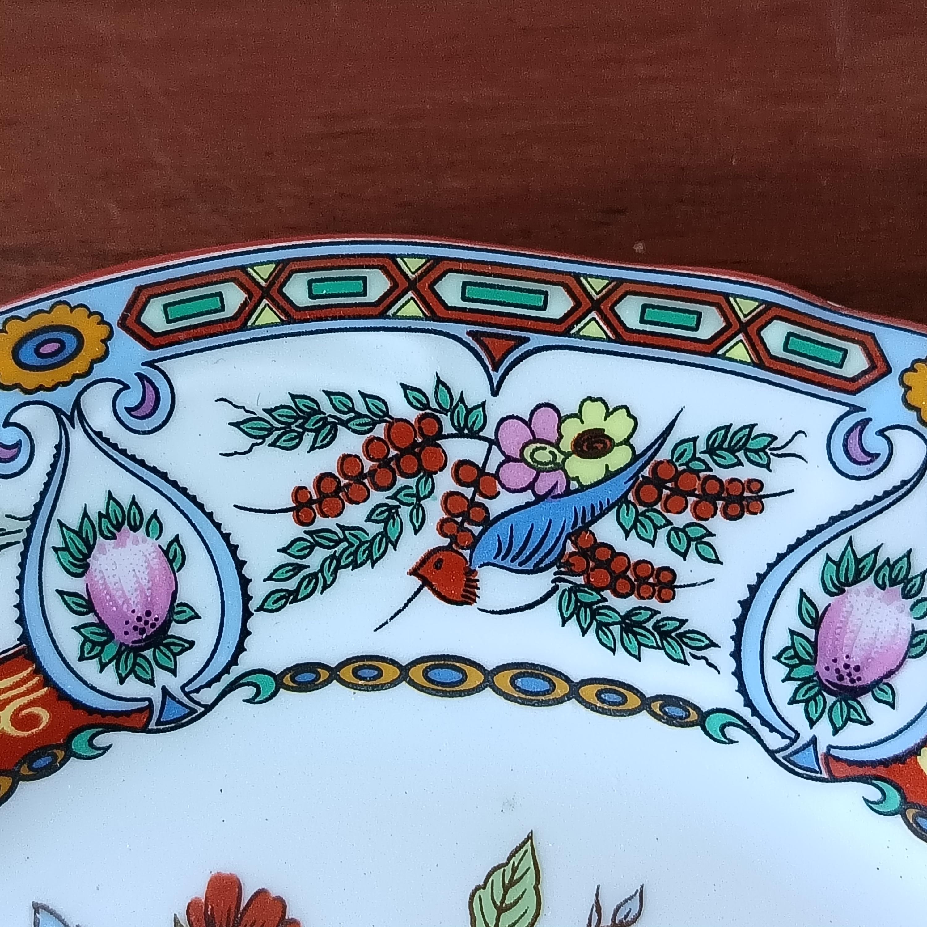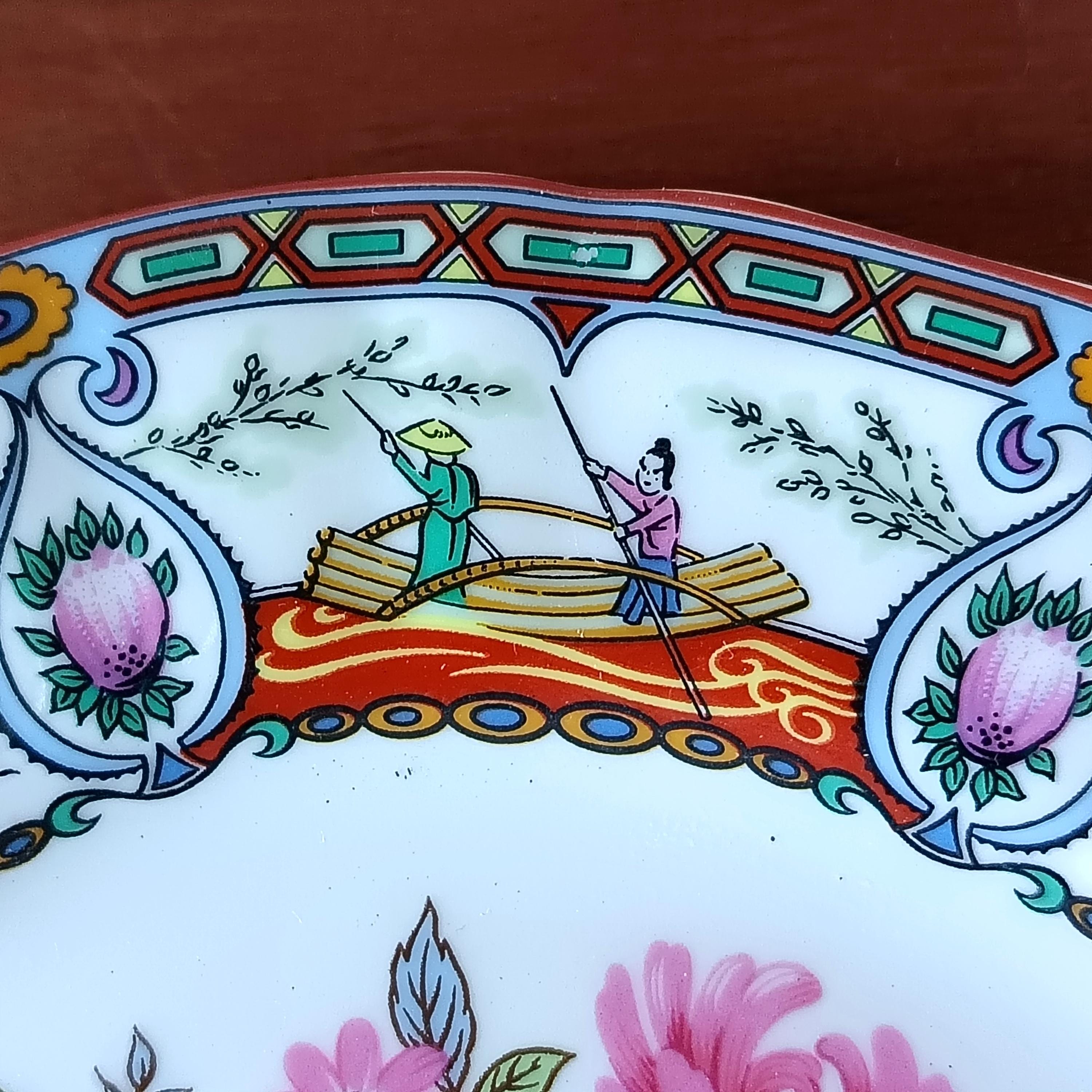 At the center of the plate is a charming floral motif in shades of pink and blue, the rim is decorated alternately with scenes of a boat with 2 characters and a small blue bird on a floral background.