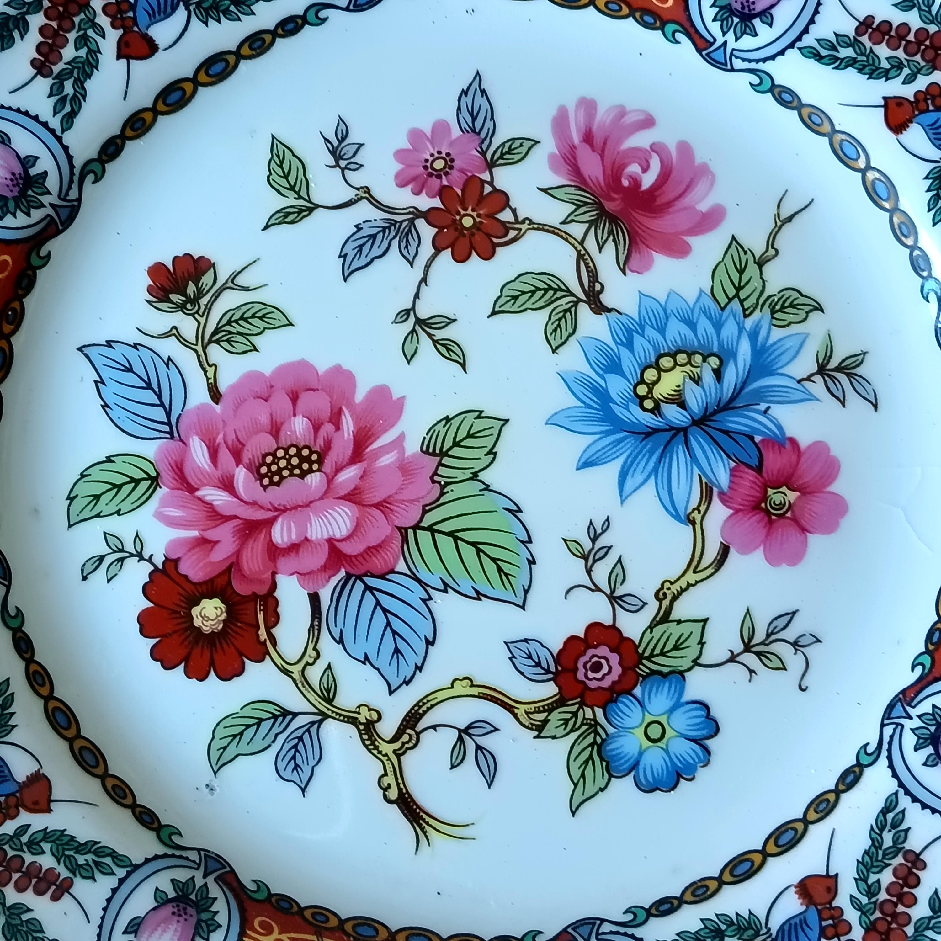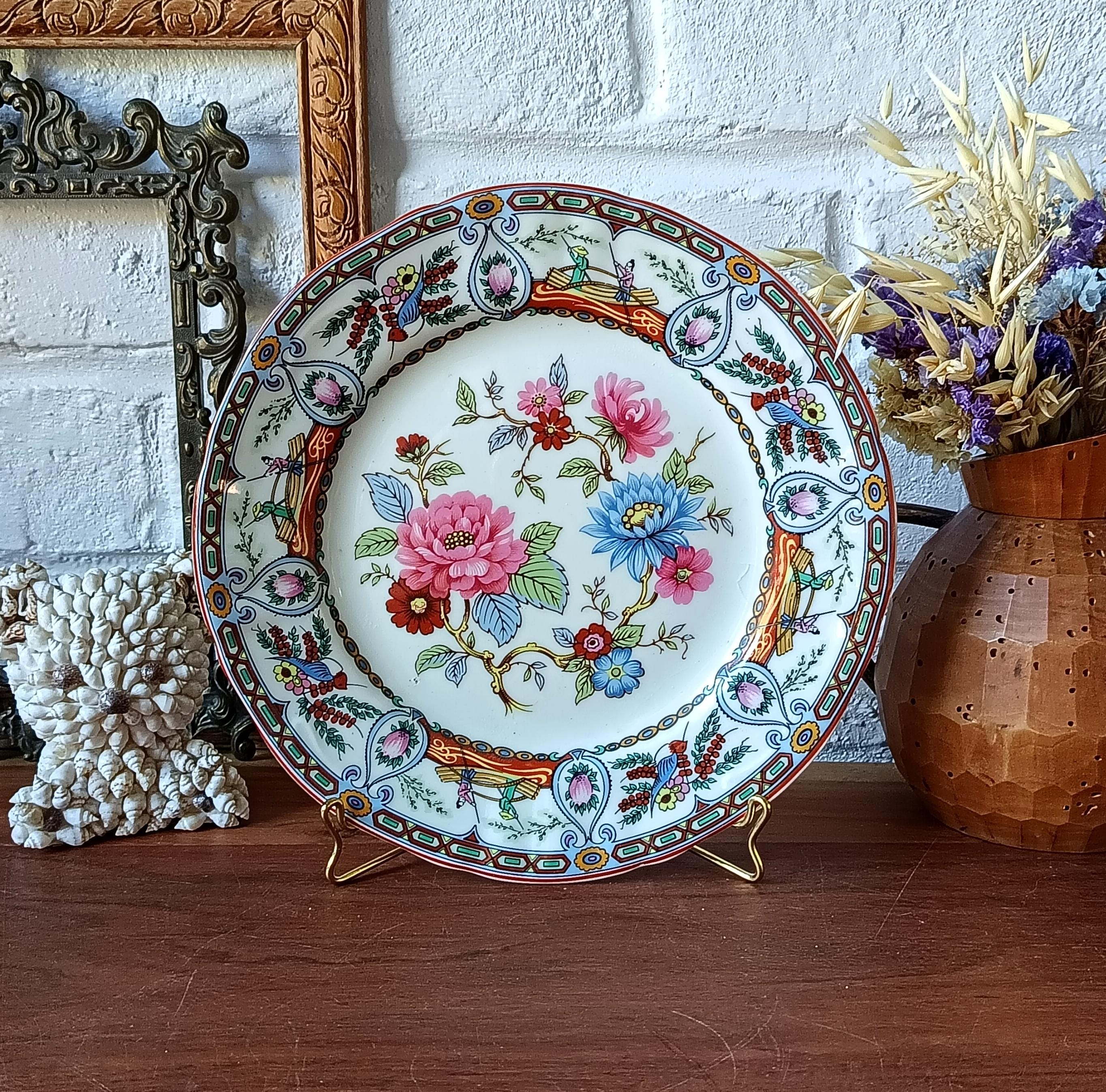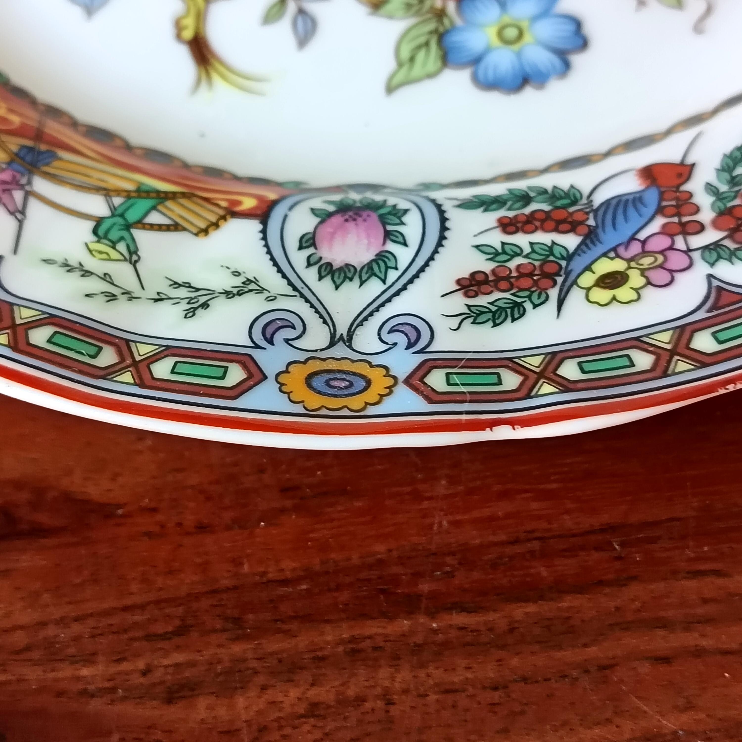 At the center of the plate is a charming floral motif in shades of pink and blue, the rim is decorated alternately with scenes of a boat with 2 characters and a small blue bird on a floral background.