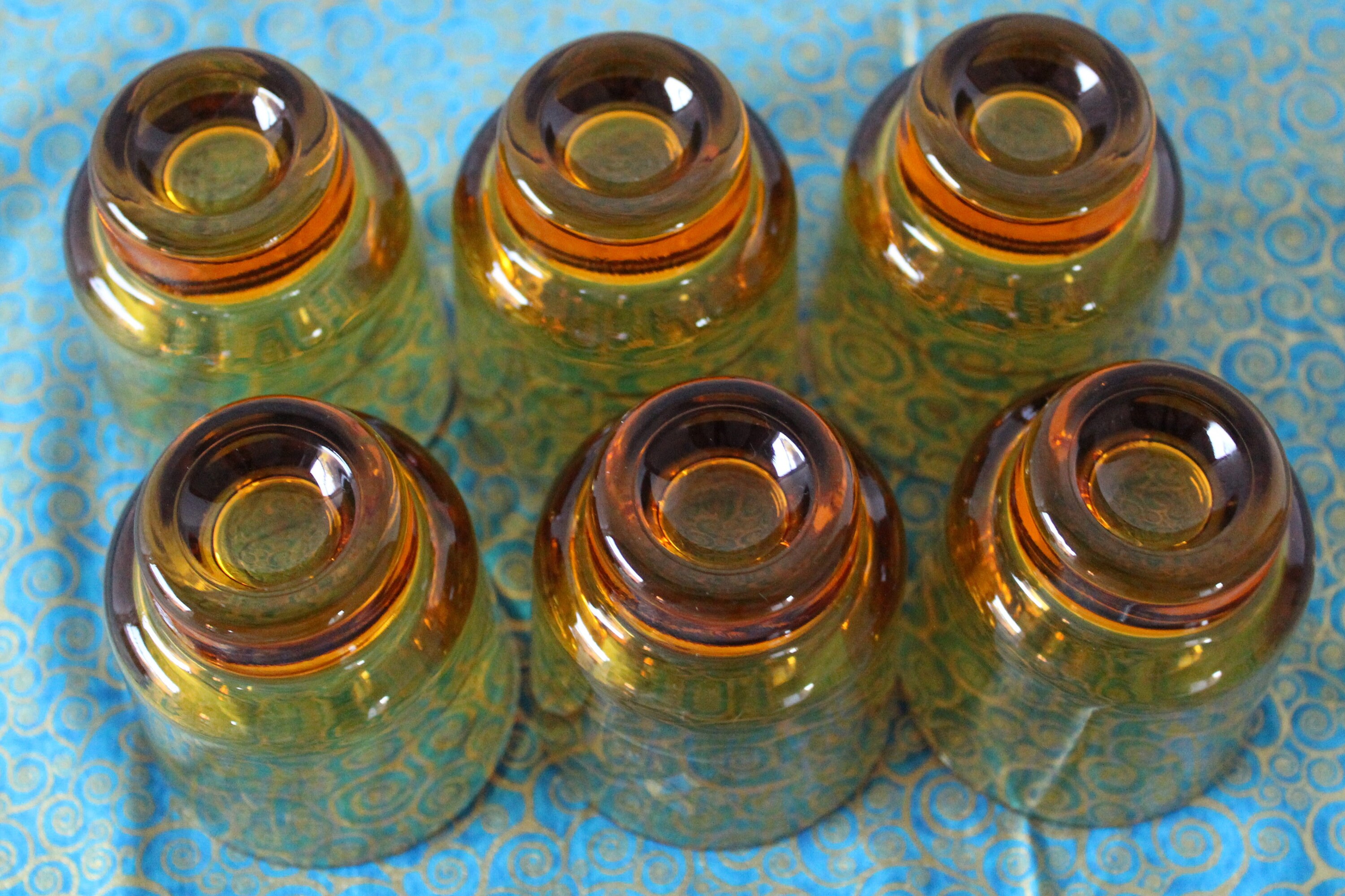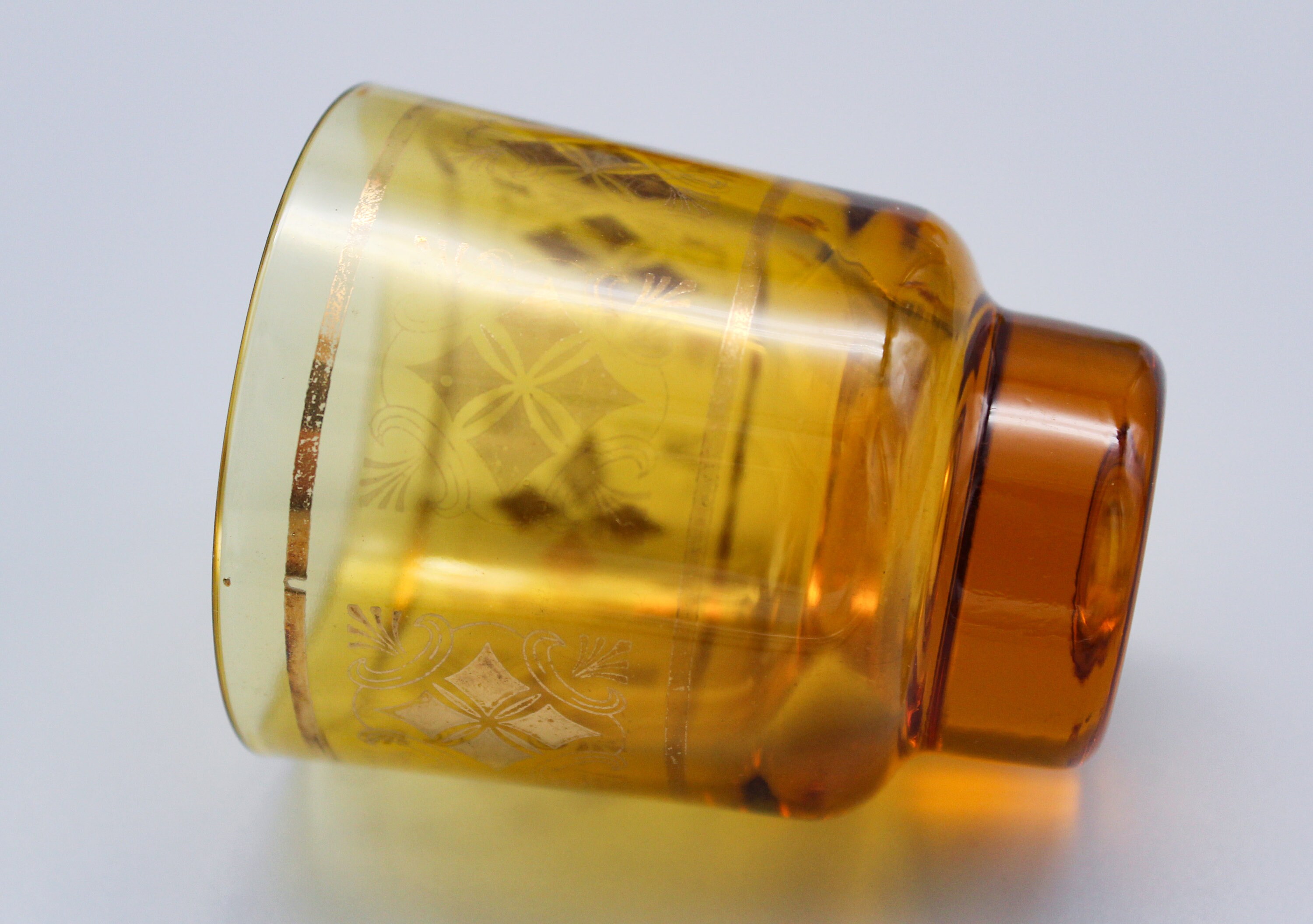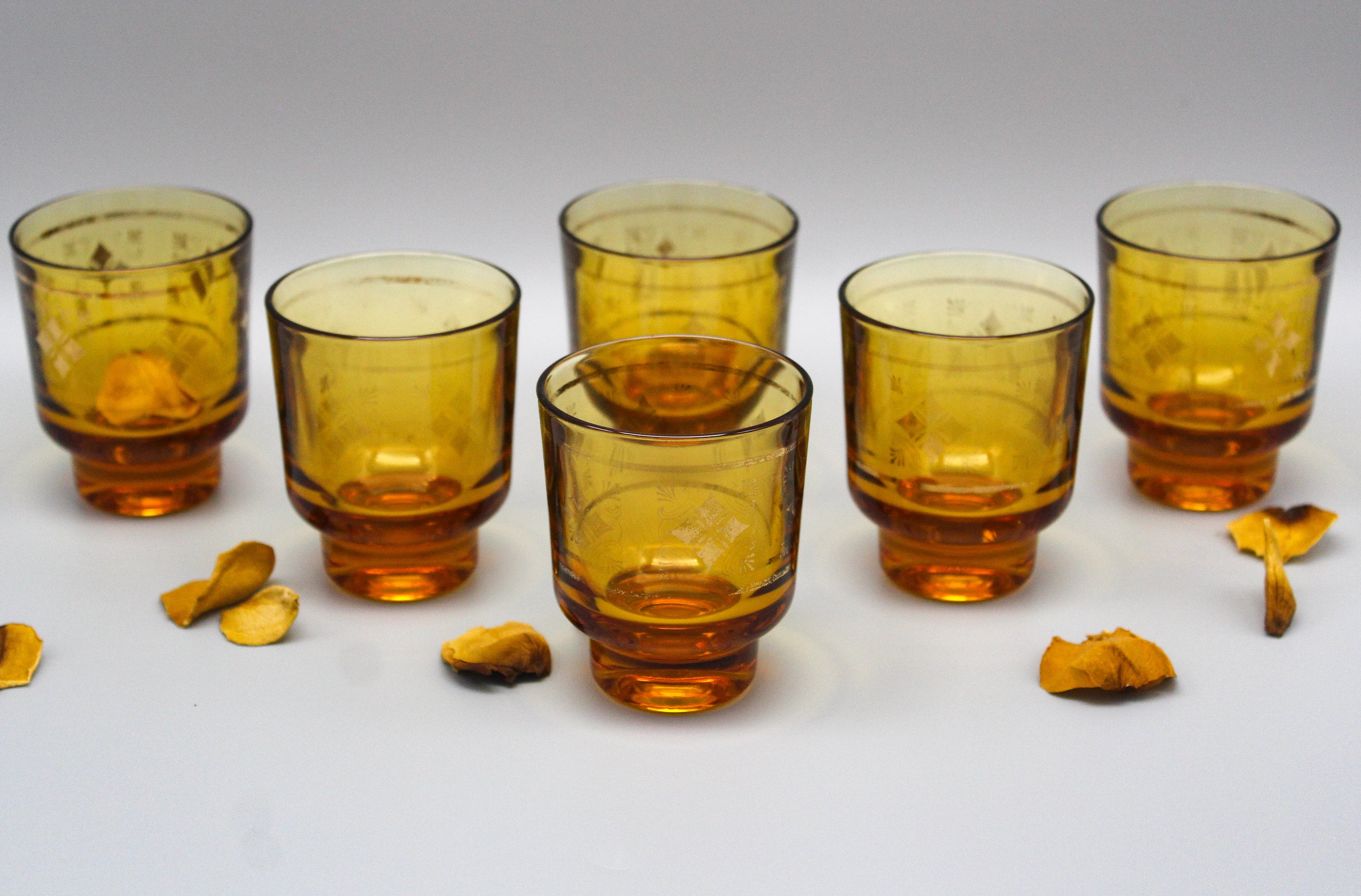 6 small glasses made of thick amber-yellow glass. They are decorated with gold patterns which are partially worn on some glasses, enhancing the vintage look of the set.