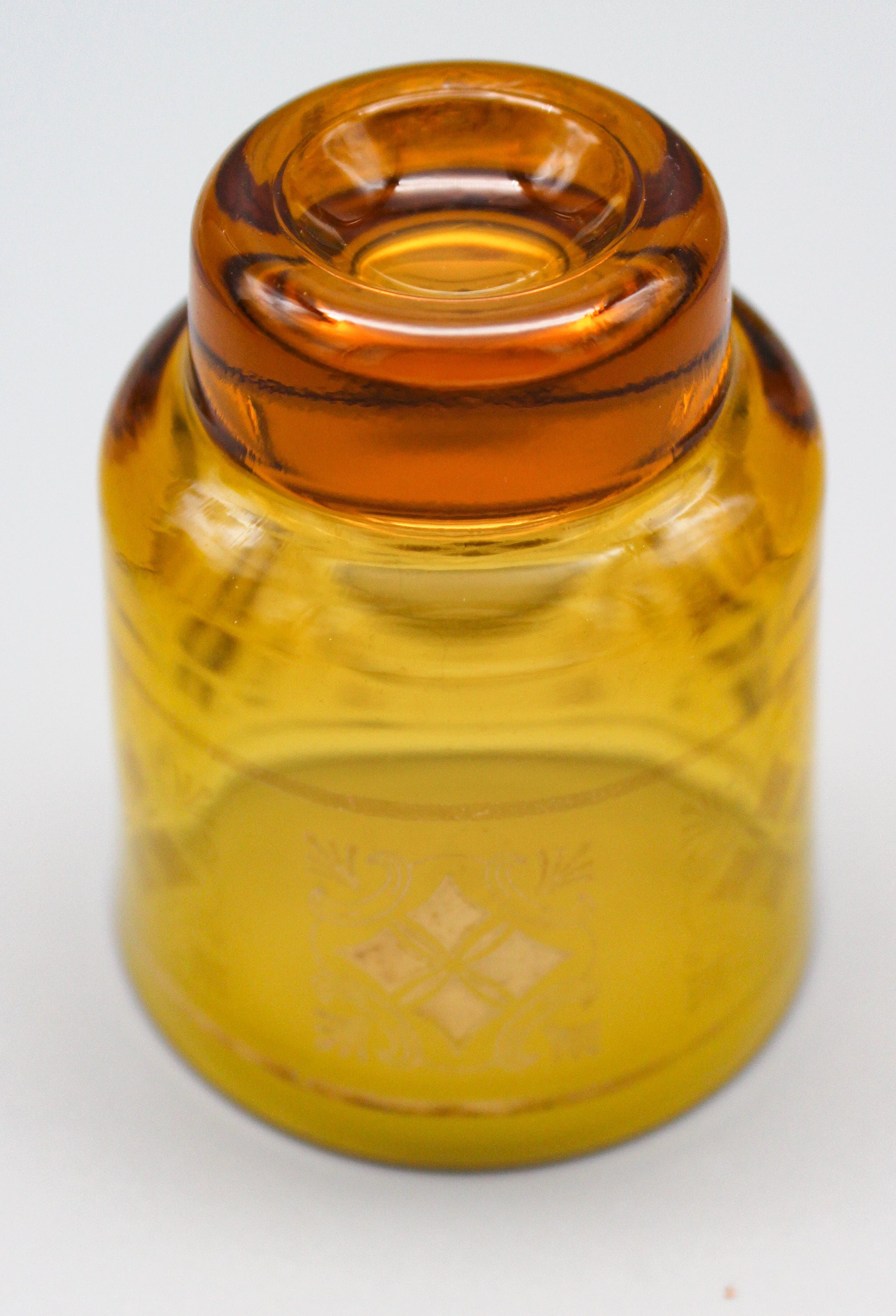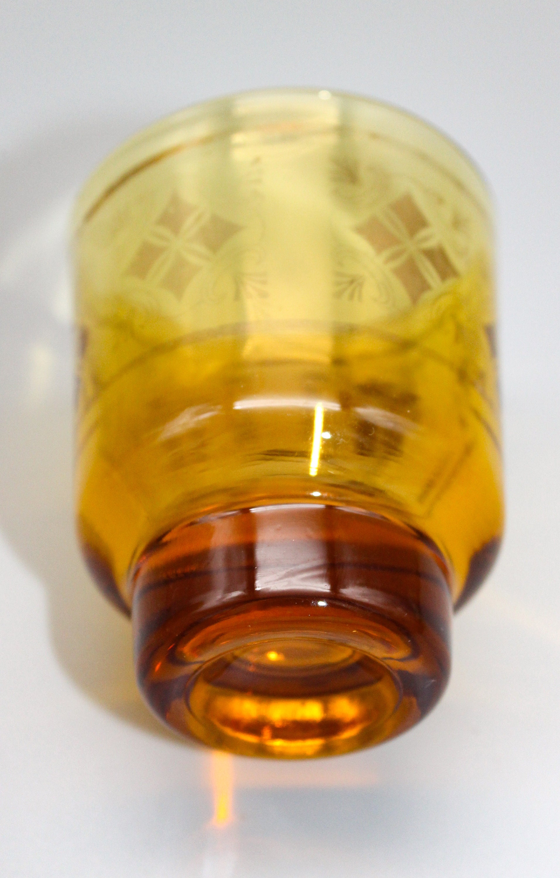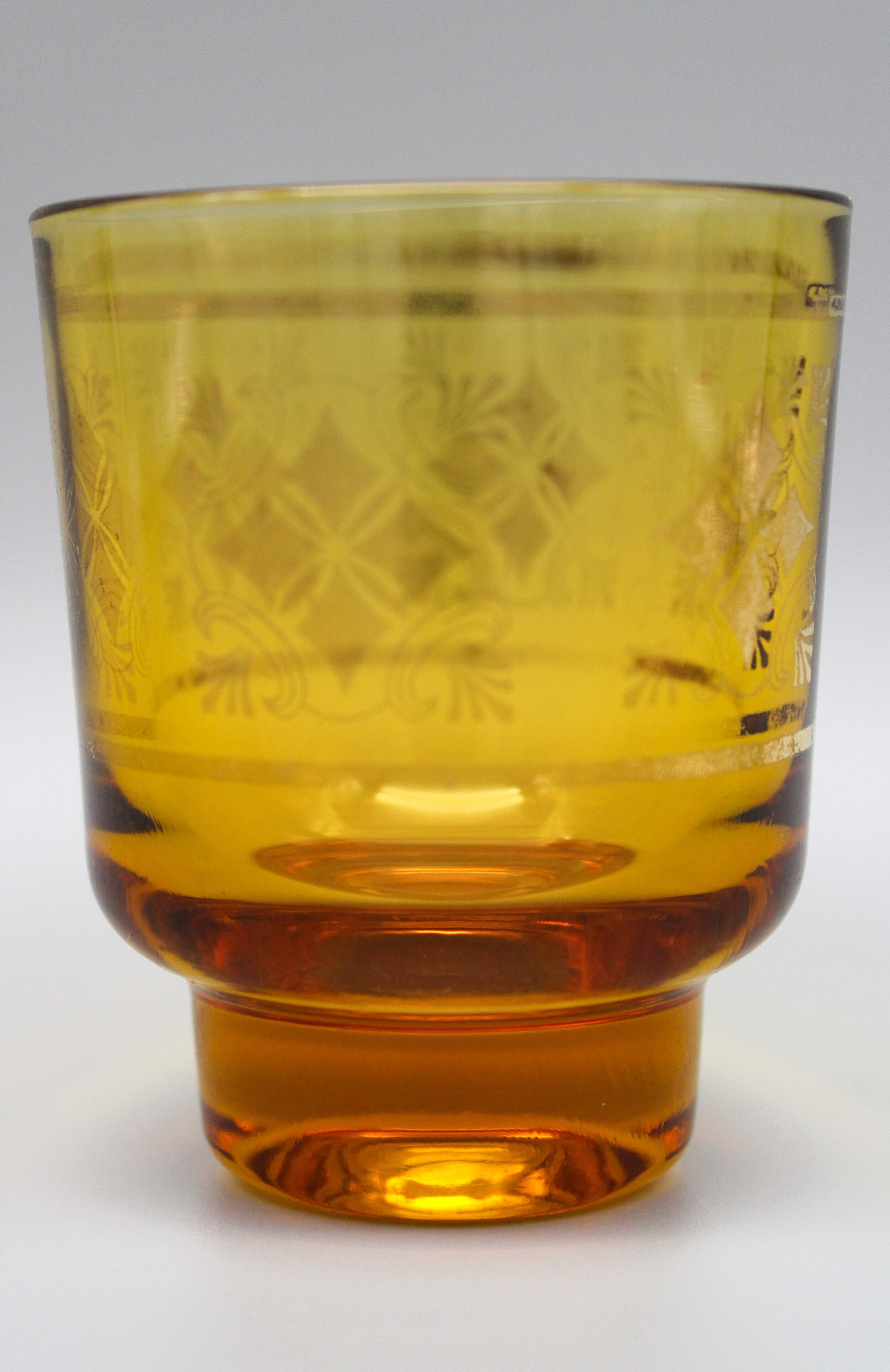 6 small glasses made of thick amber-yellow glass. They are decorated with gold patterns which are partially worn on some glasses, enhancing the vintage look of the set.