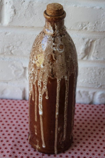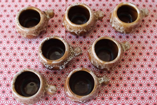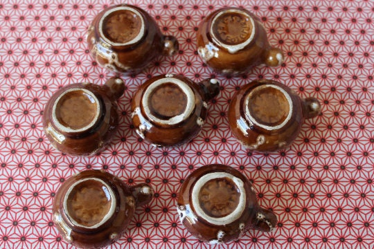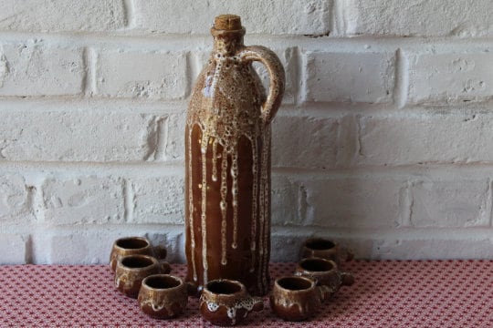 Sars poteries maine liqueur service consisting of 7 cups, a bottle with a cork stopper.