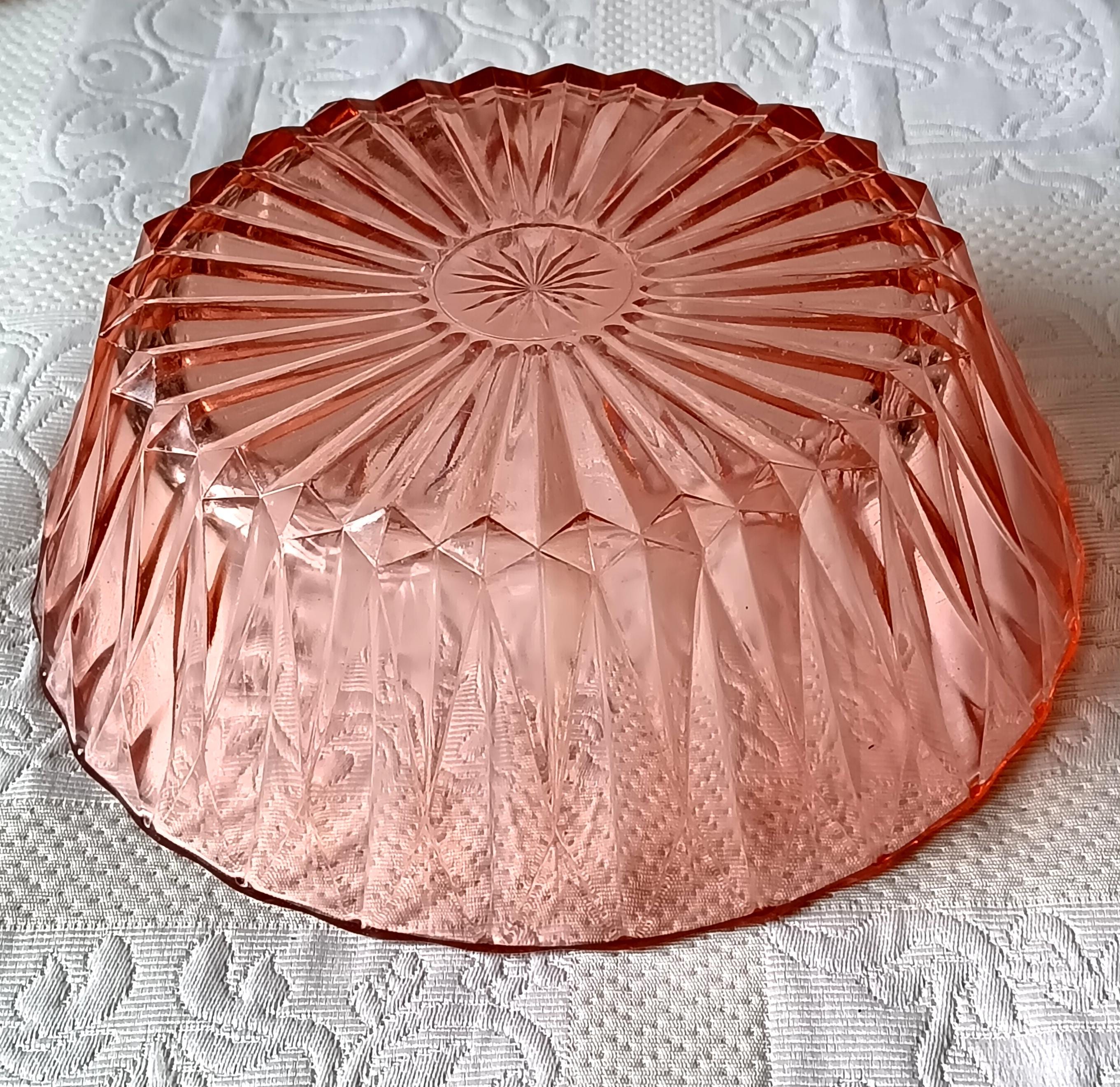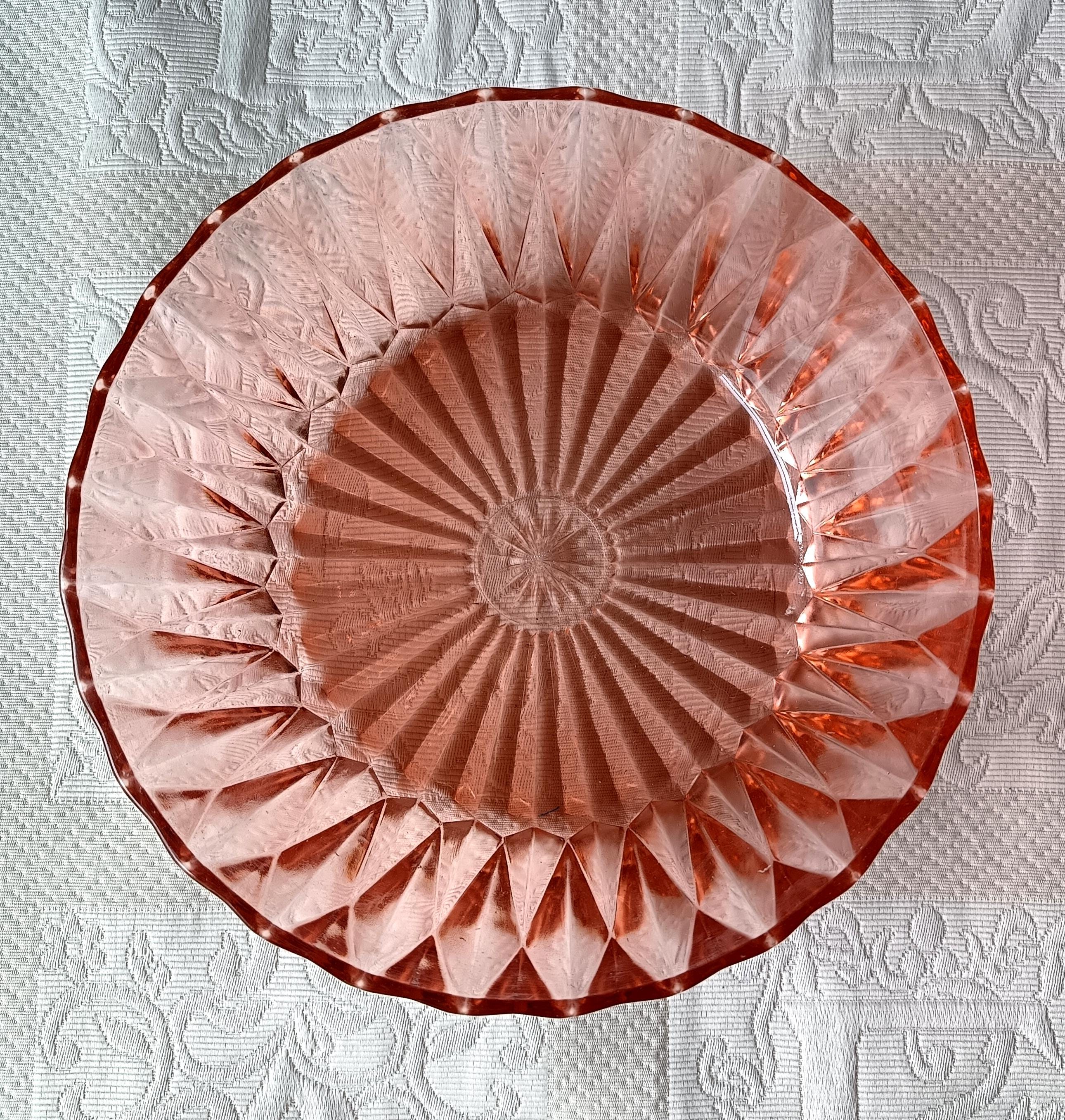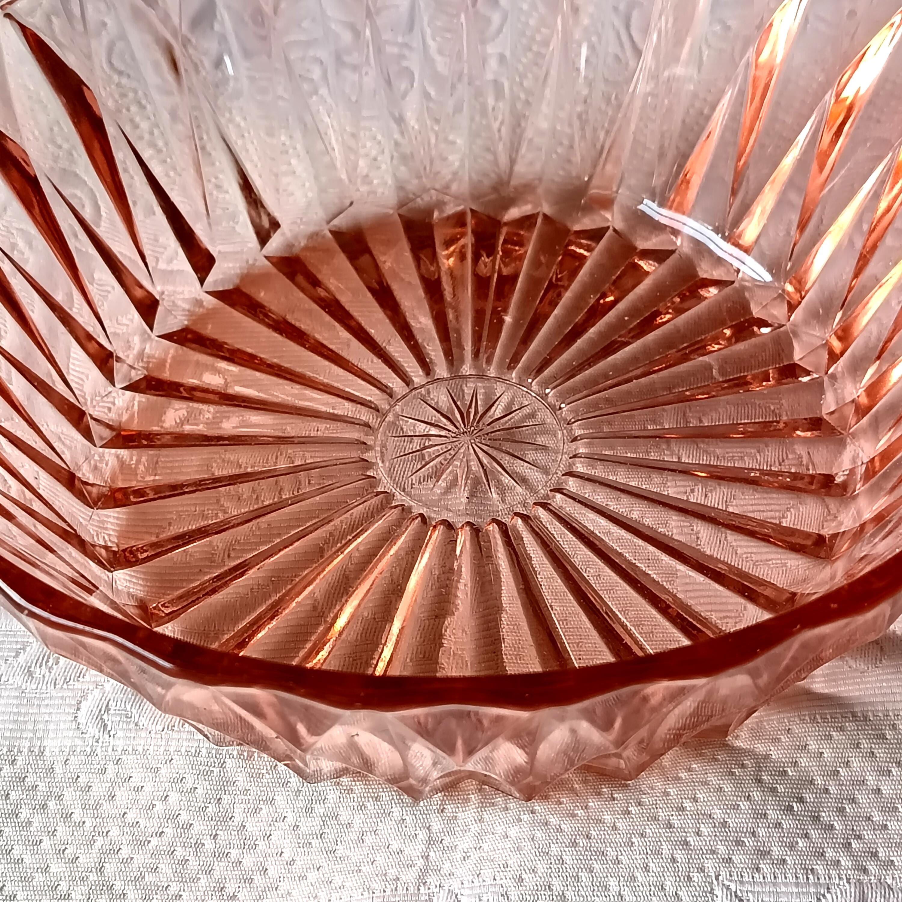 Salad bowl in a pretty pink pressed glass for serving or to use as a fruit basket for example.