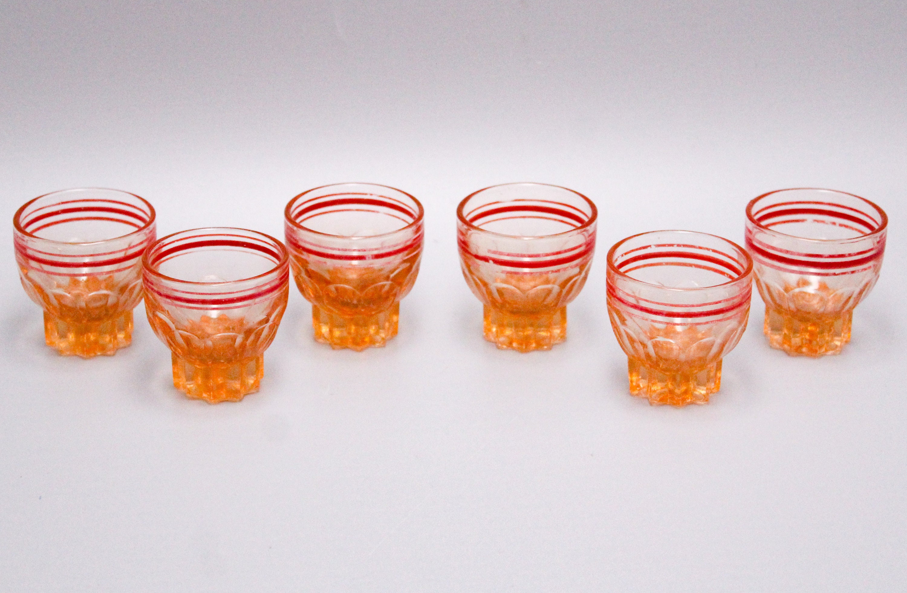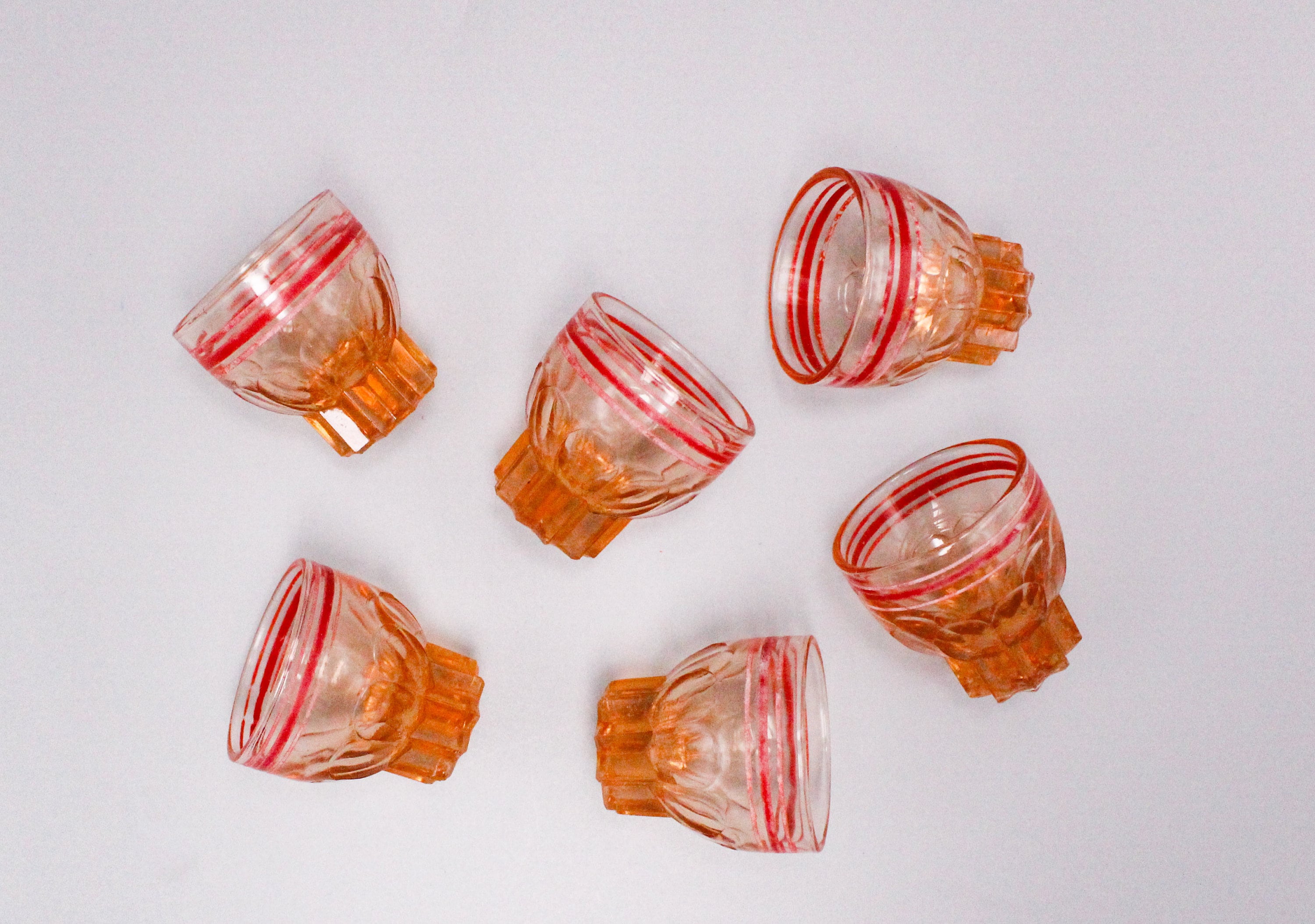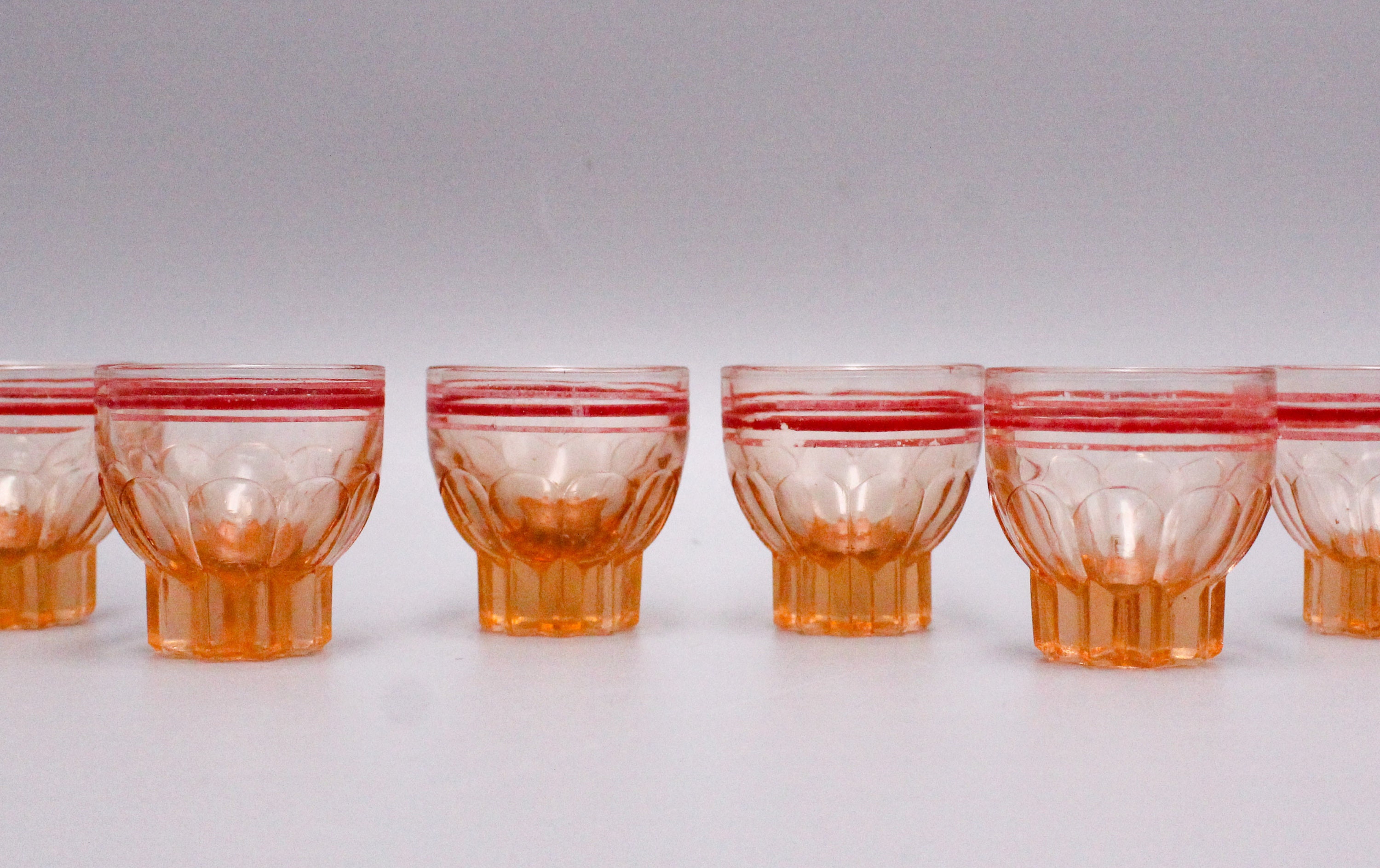 Set of 6 retro pink glass glasses with red rim, 1950s liqueur glasses, molded pink glass.